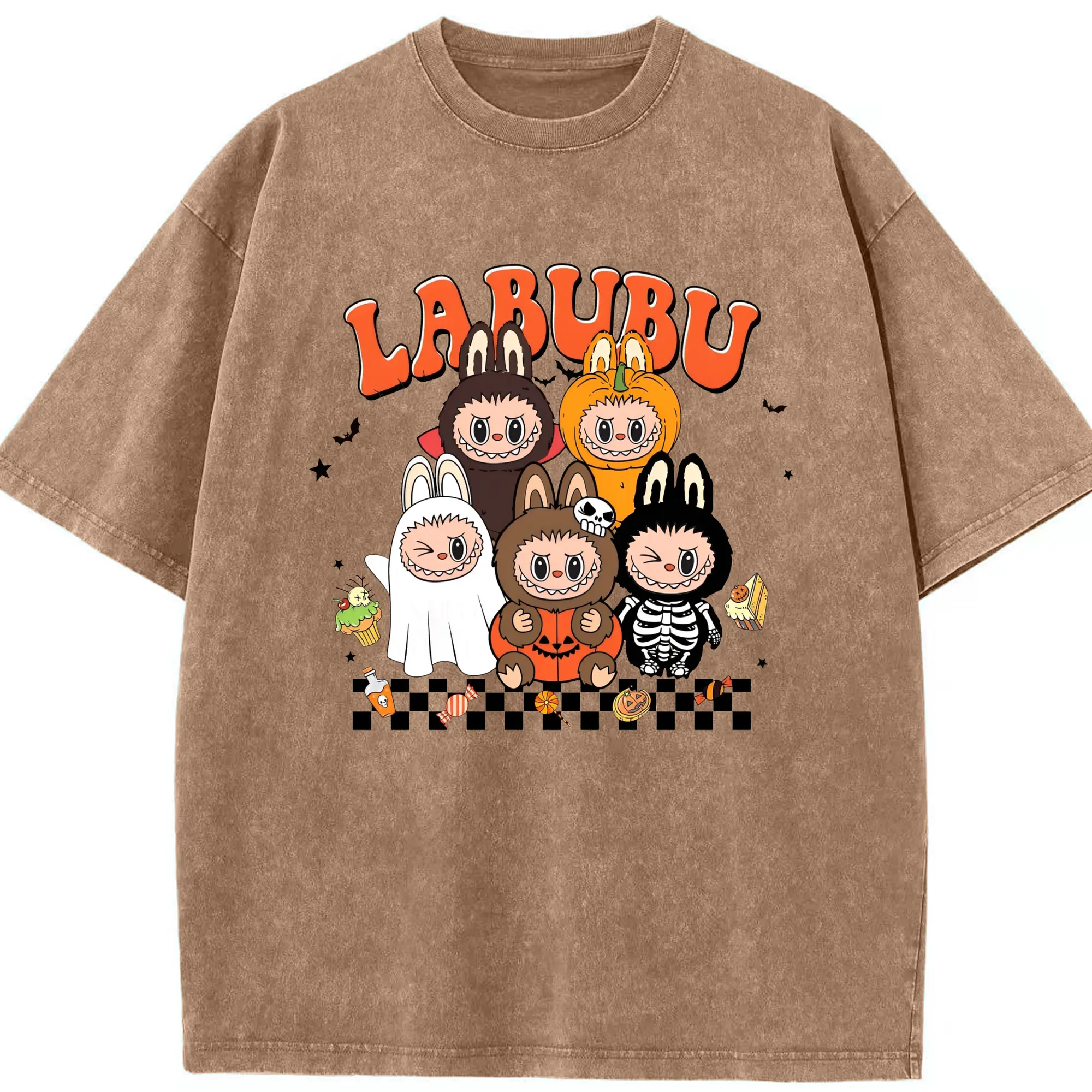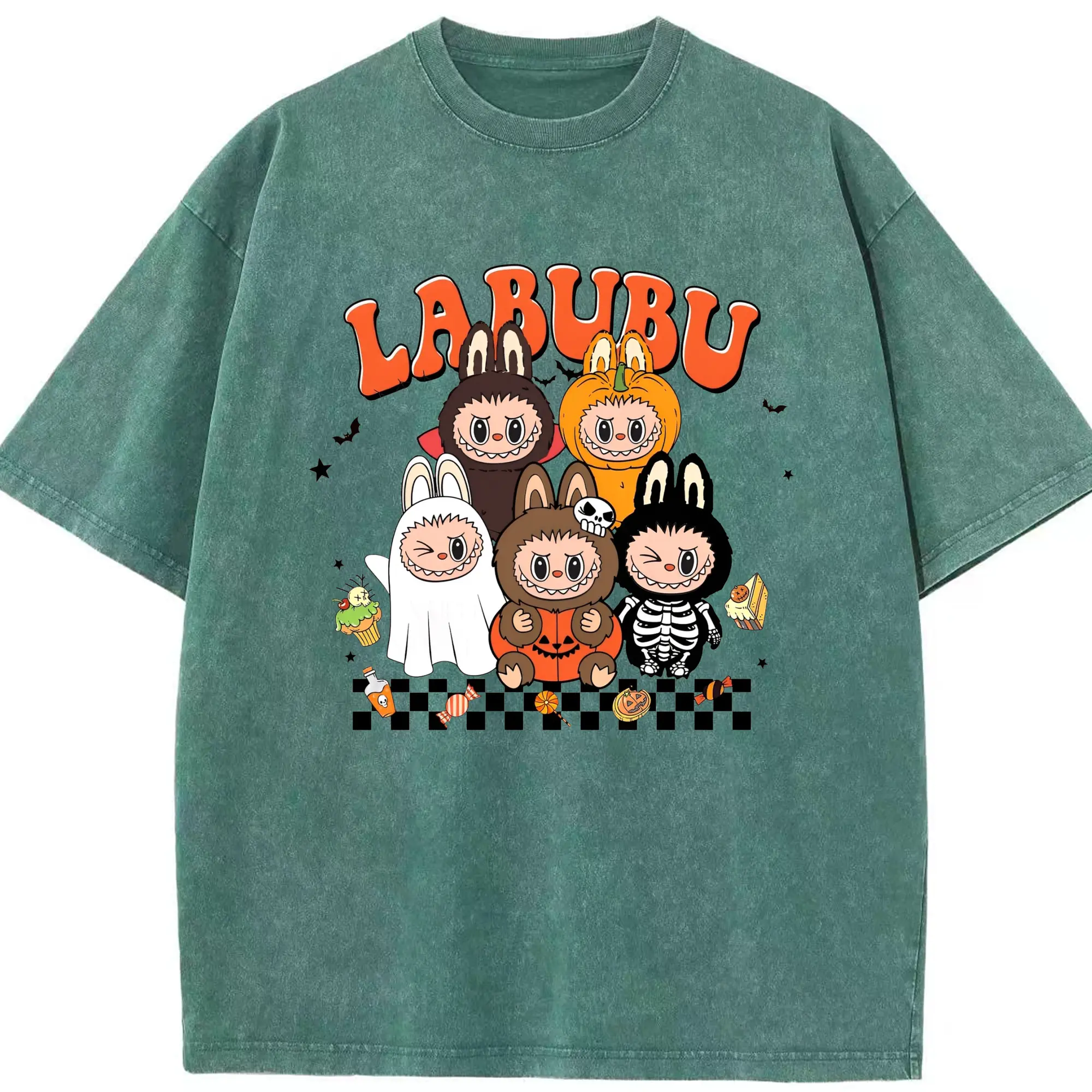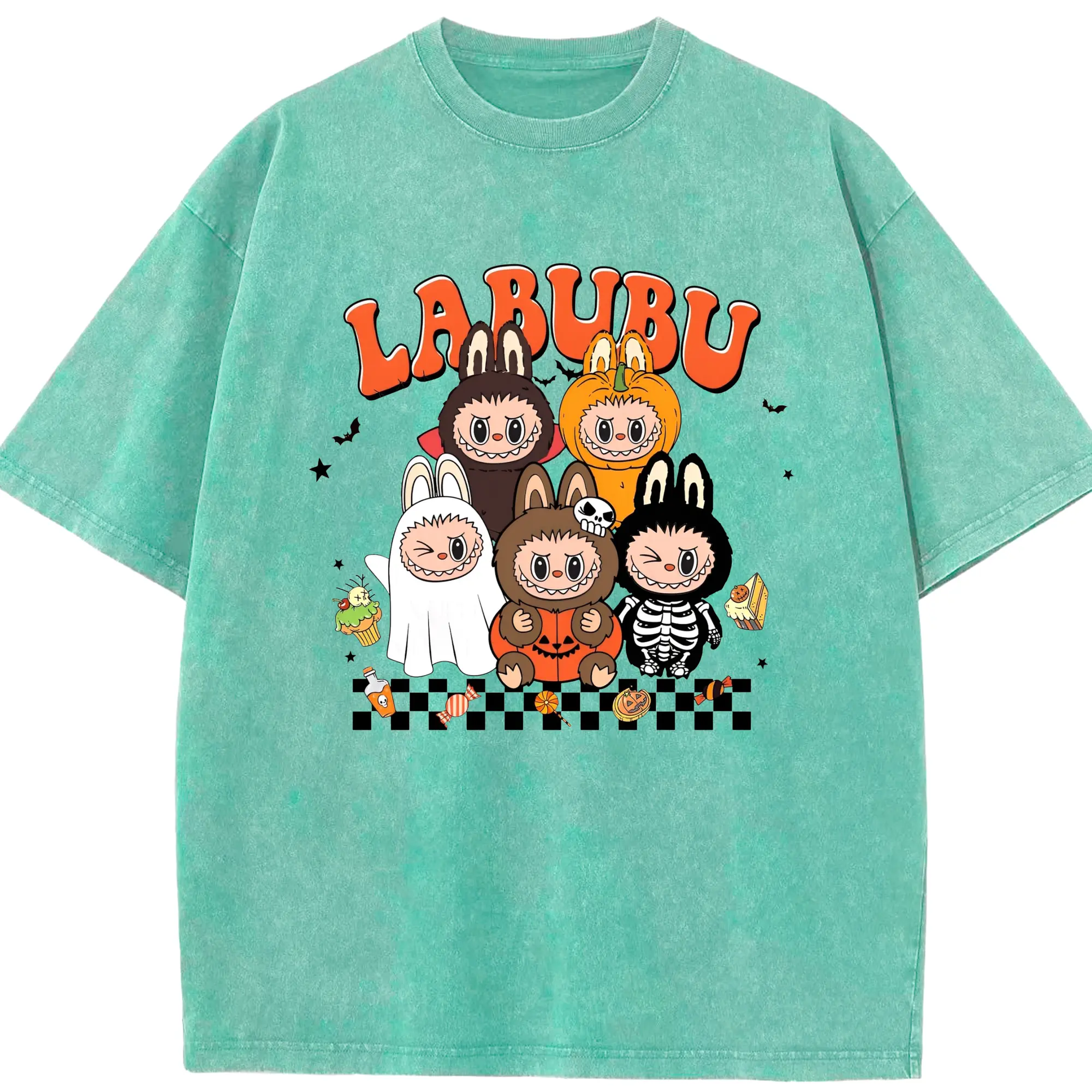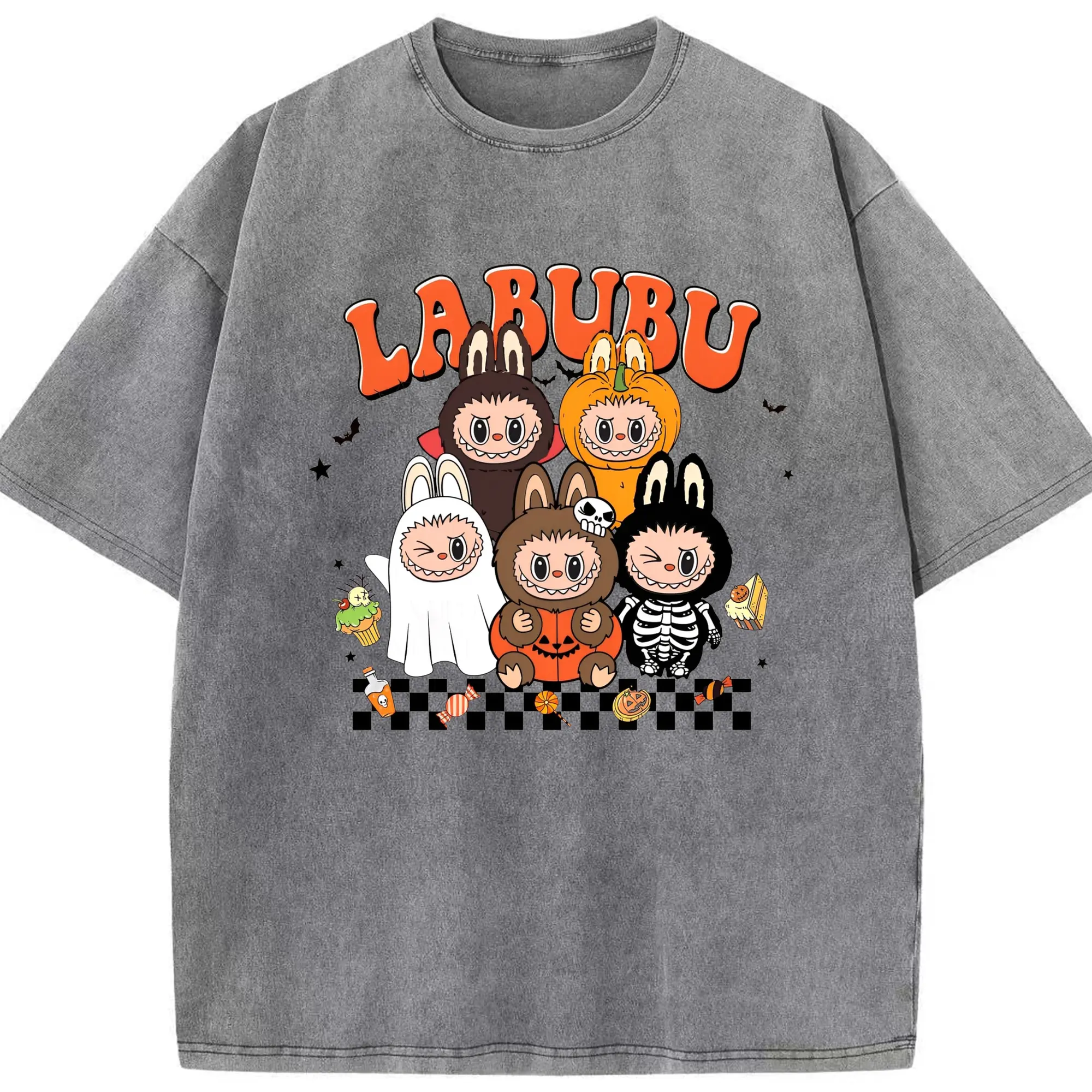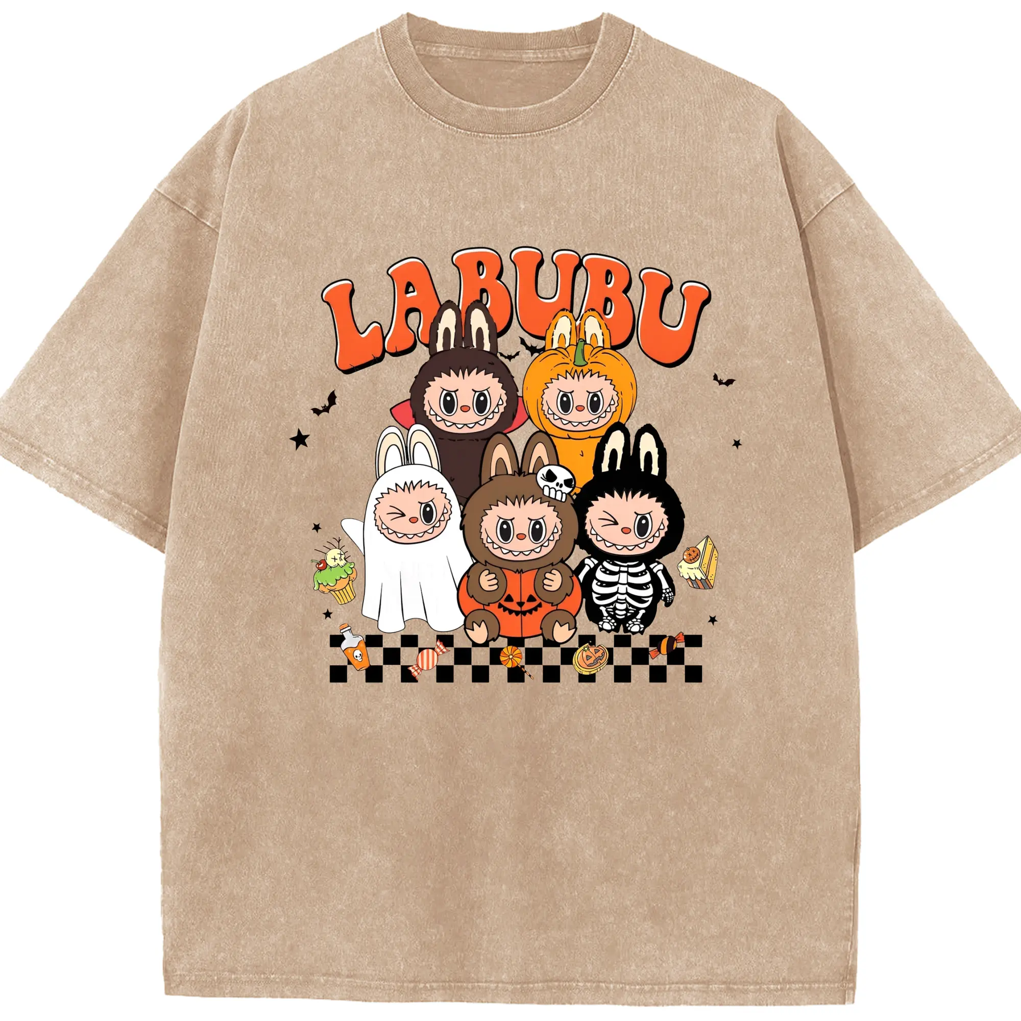 Labubu Halloween Cute Cartoon Group DIY - Washed Vintage Look 230g Cotton Oversized T-Shirt With Front Heat Transfer Print – Soft, Lightweight, Stylish Fit – Comfortable Casual Wear For Sports & Everyday Use