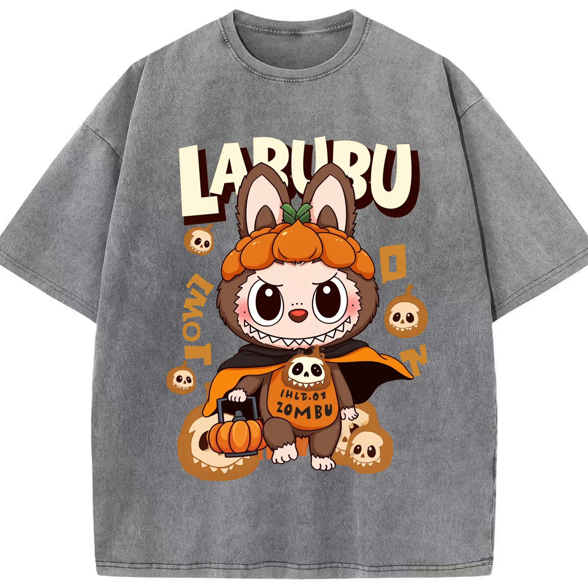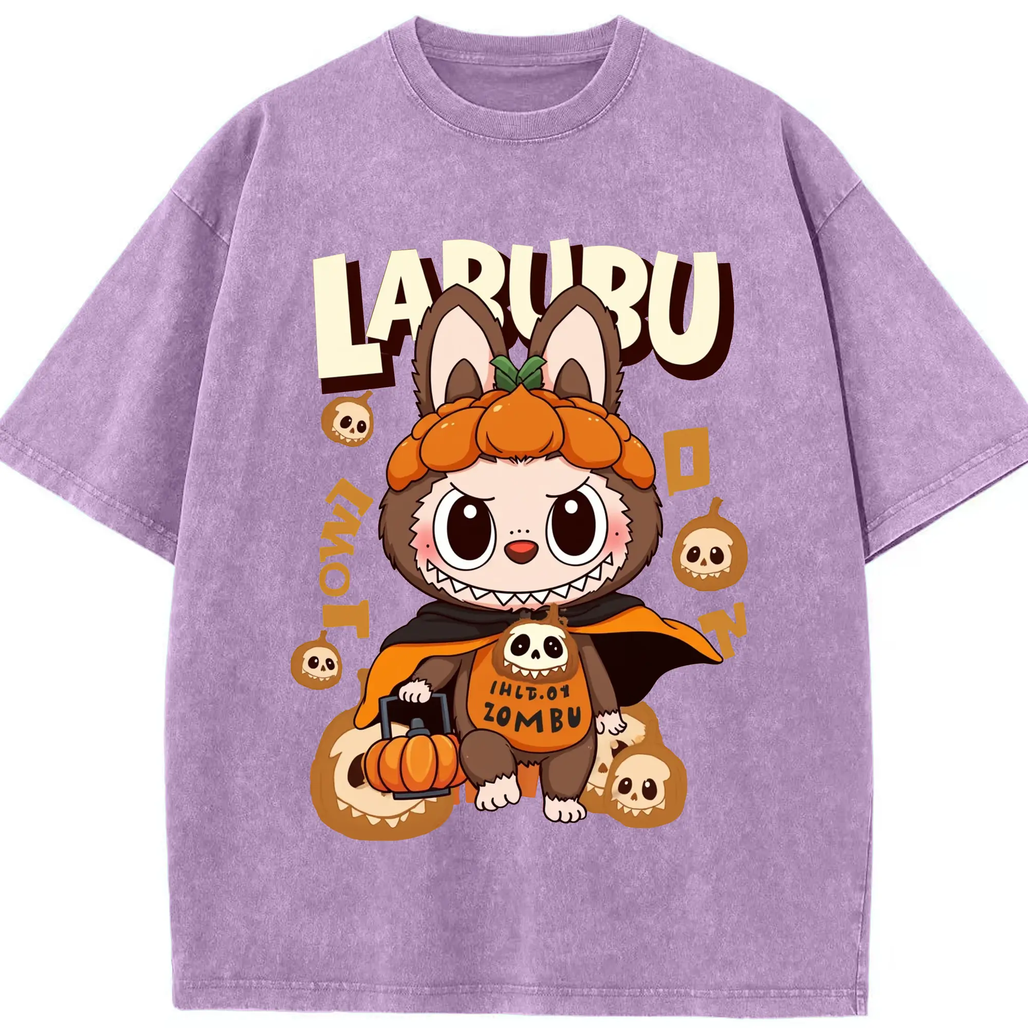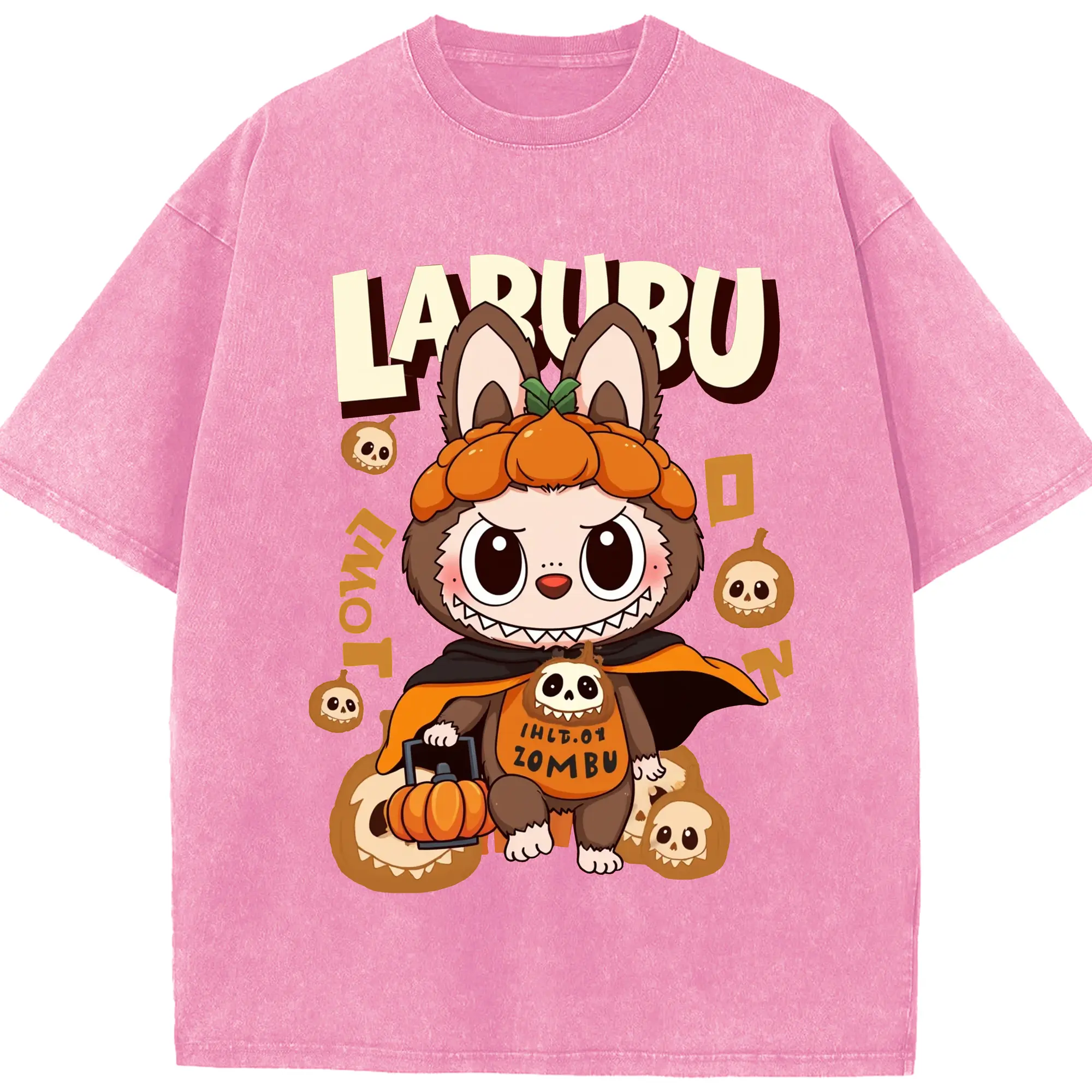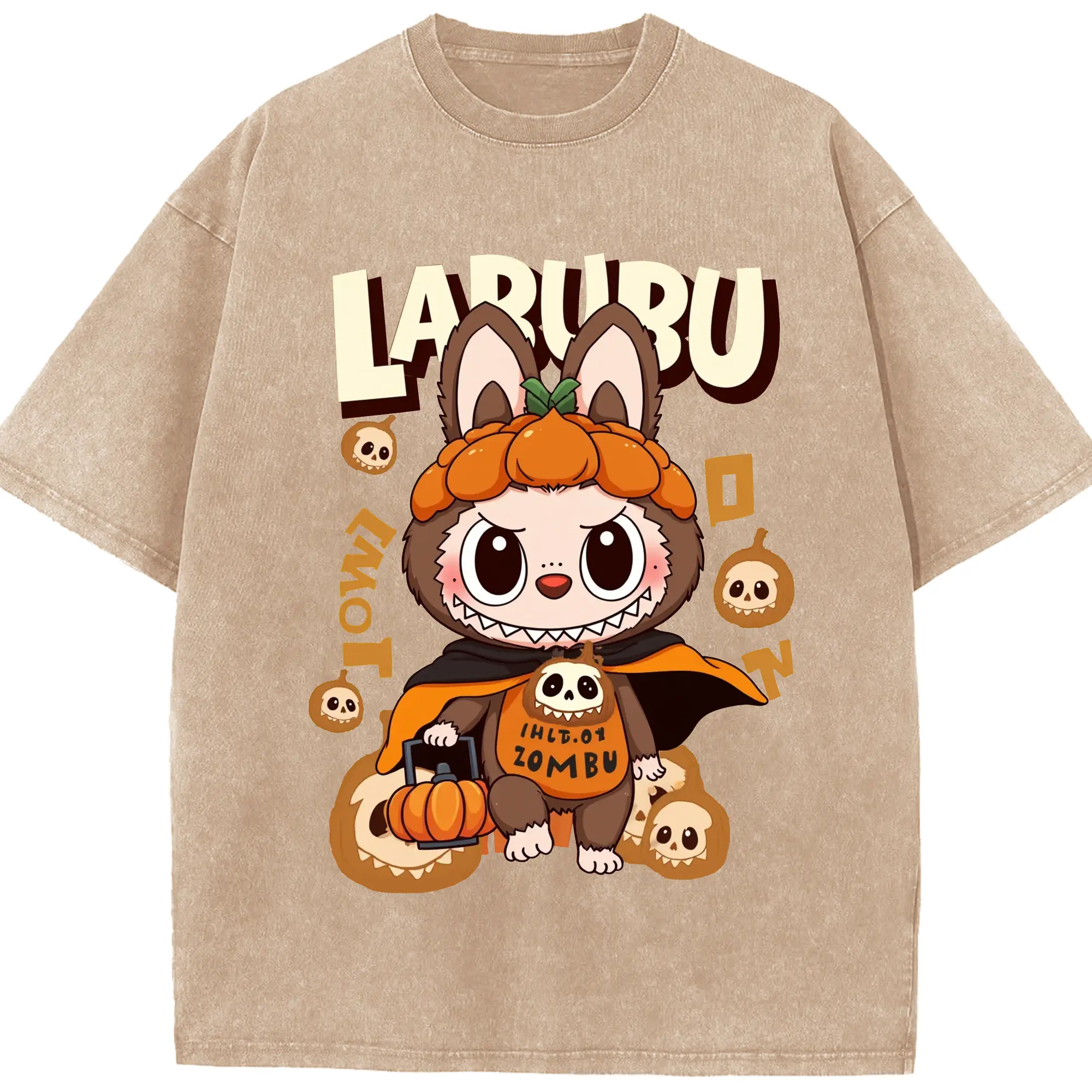 Labubu Halloween Cute Dark Cartoon DIY - Washed Vintage Look 230g Cotton Oversized T-Shirt With Front Heat Transfer Print – Soft, Lightweight, Stylish Fit – Comfortable Casual Wear For Sports & Everyday Use
