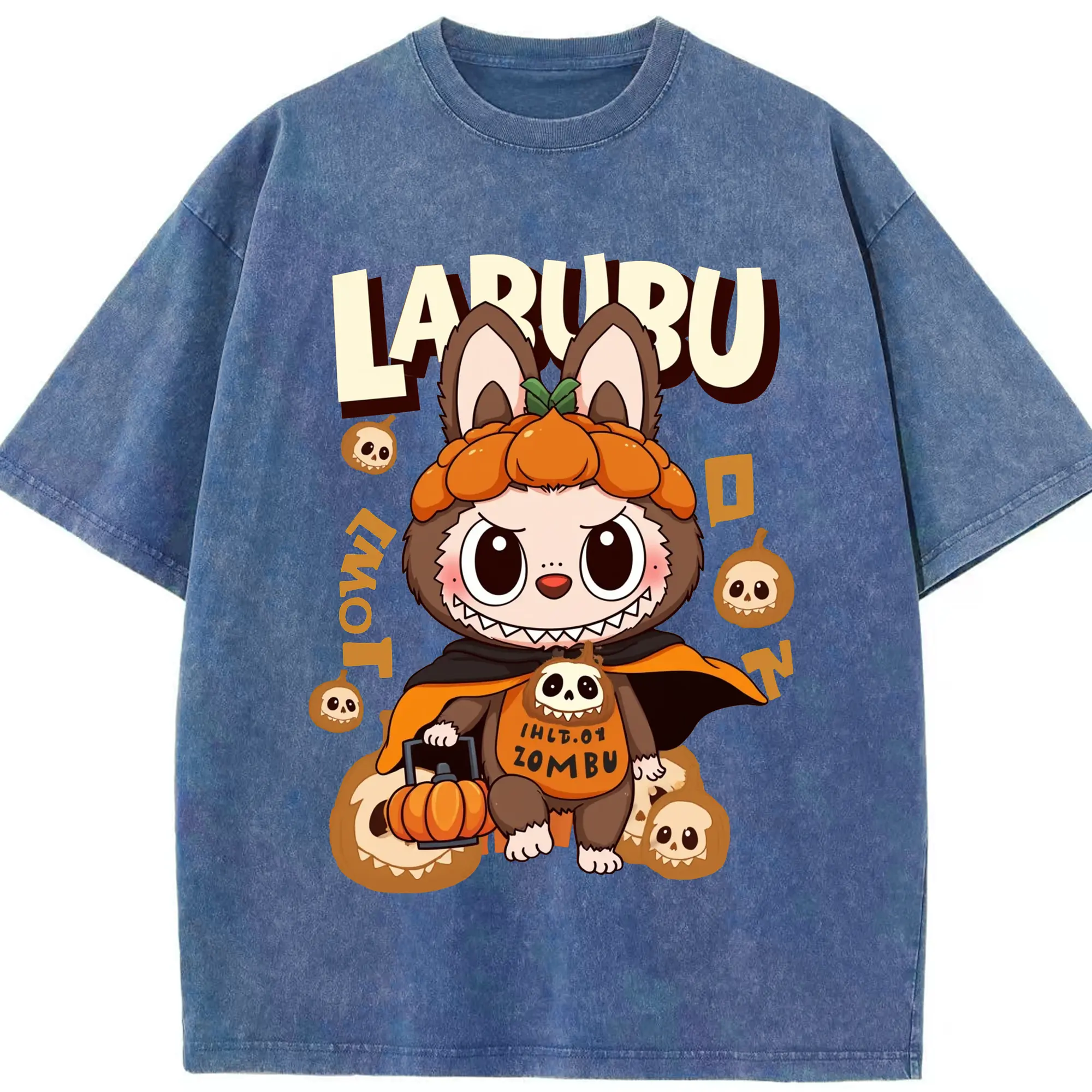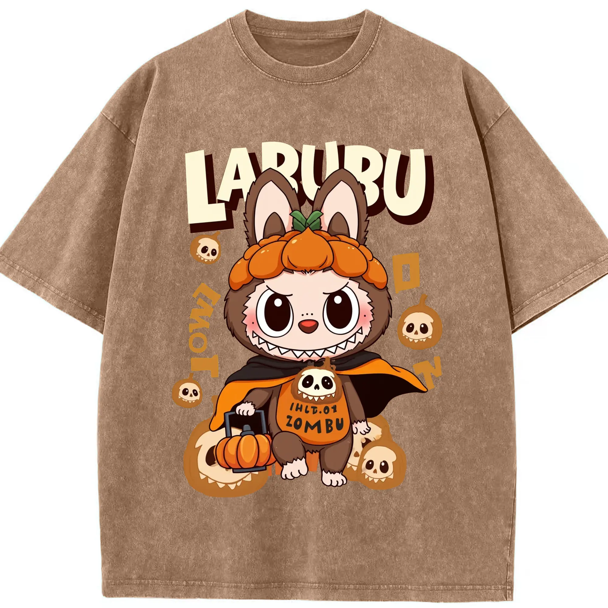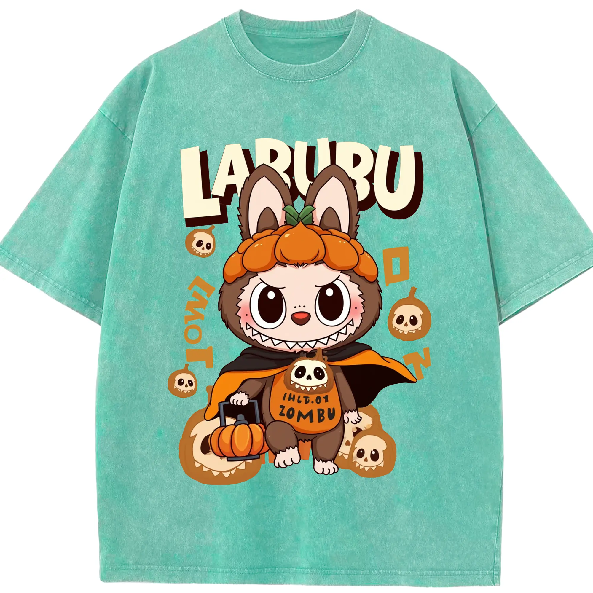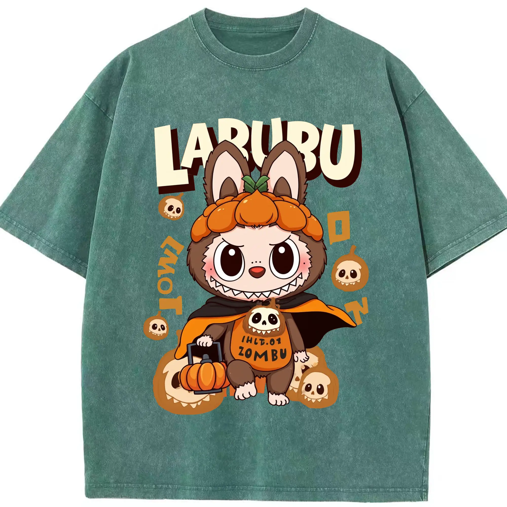 Labubu Halloween Cute Dark Cartoon DIY - Washed Vintage Look 230g Cotton Oversized T-Shirt With Front Heat Transfer Print – Soft, Lightweight, Stylish Fit – Comfortable Casual Wear For Sports & Everyday Use
