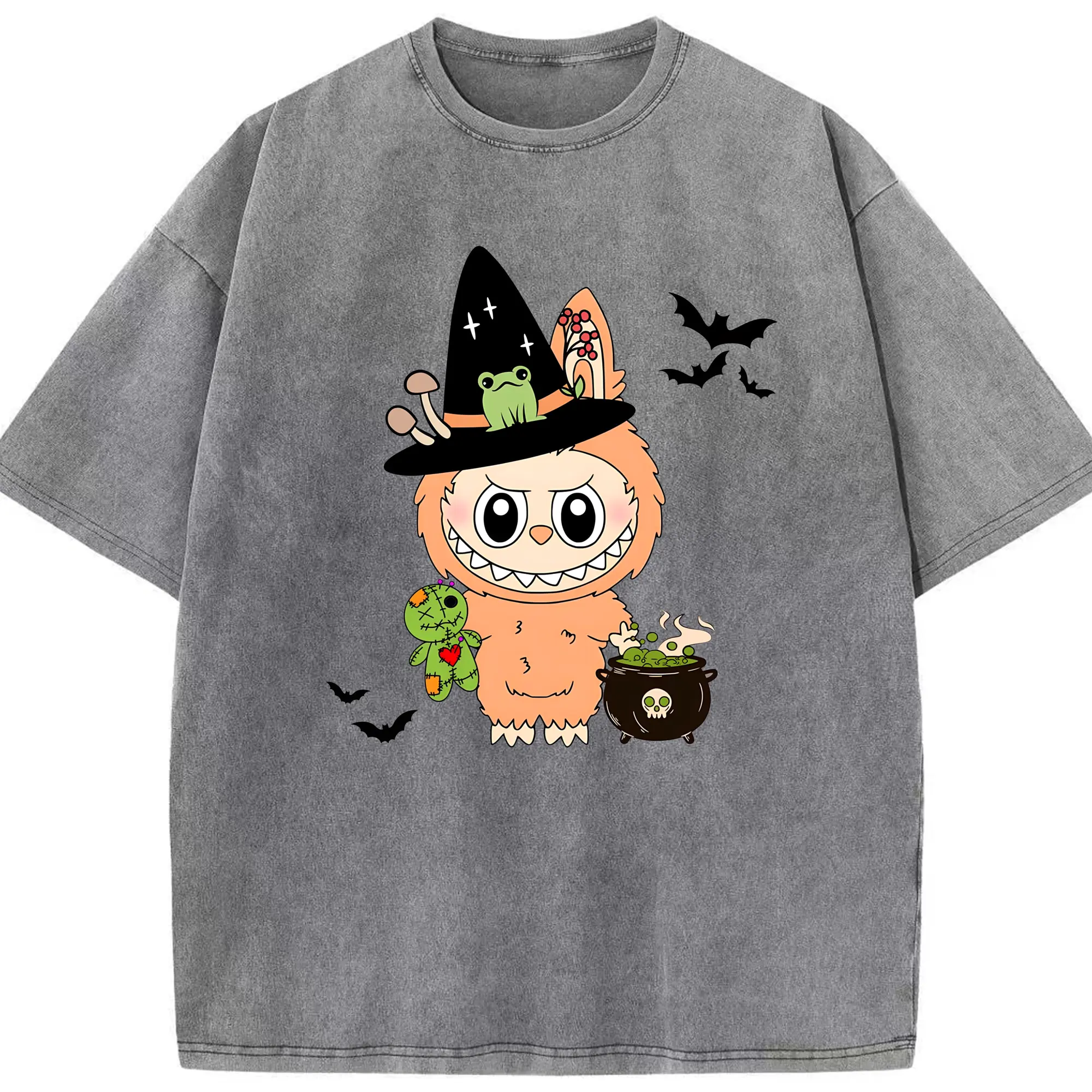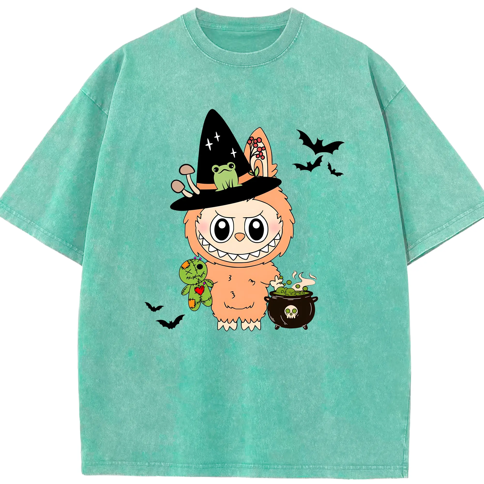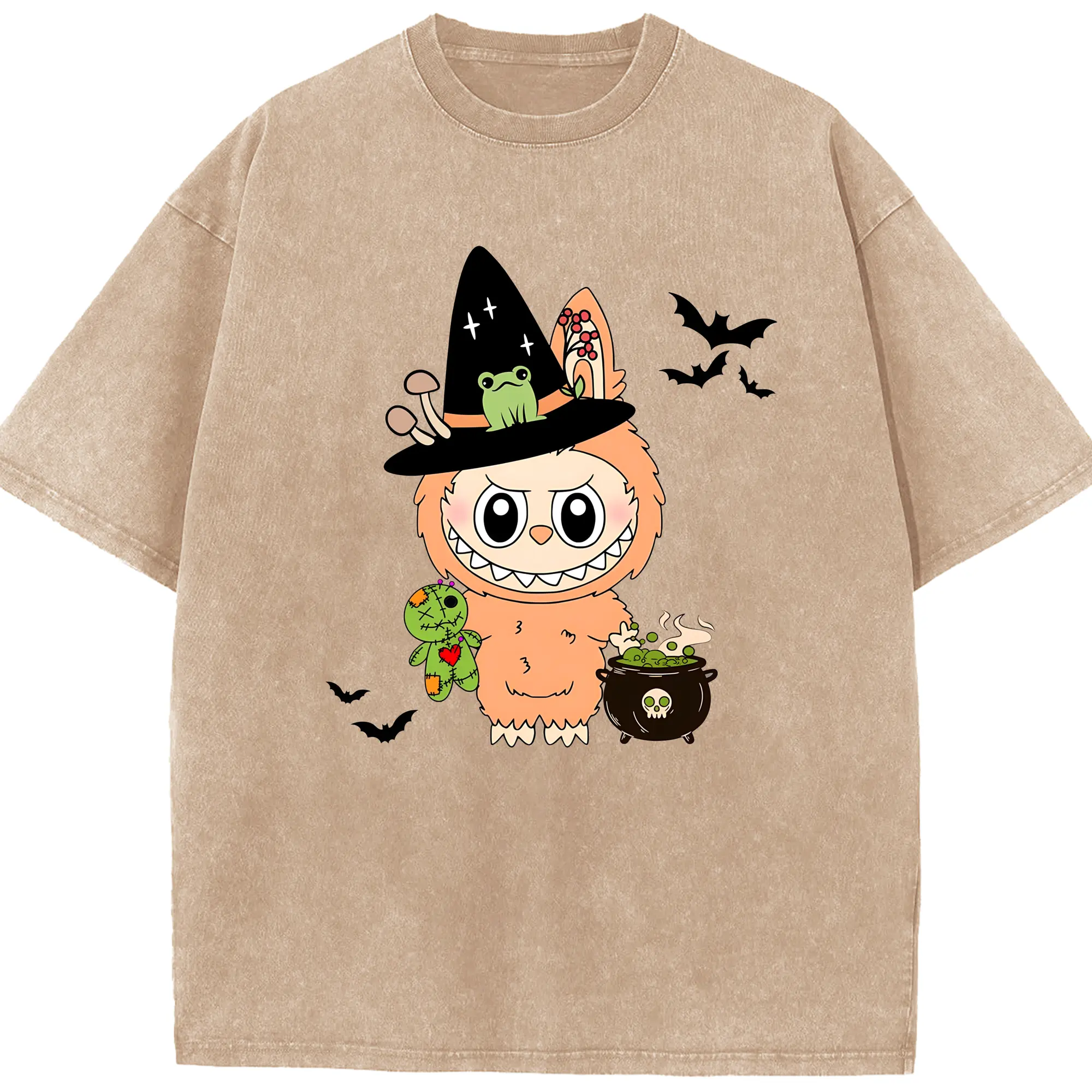 Labubu Halloween Cute Gothic Witch Cartoon DIY - Washed Vintage Look 230g Cotton Oversized T-Shirt With Front Heat Transfer Print – Soft, Lightweight, Stylish Fit – Comfortable Casual Wear For Sports & Everyday Use