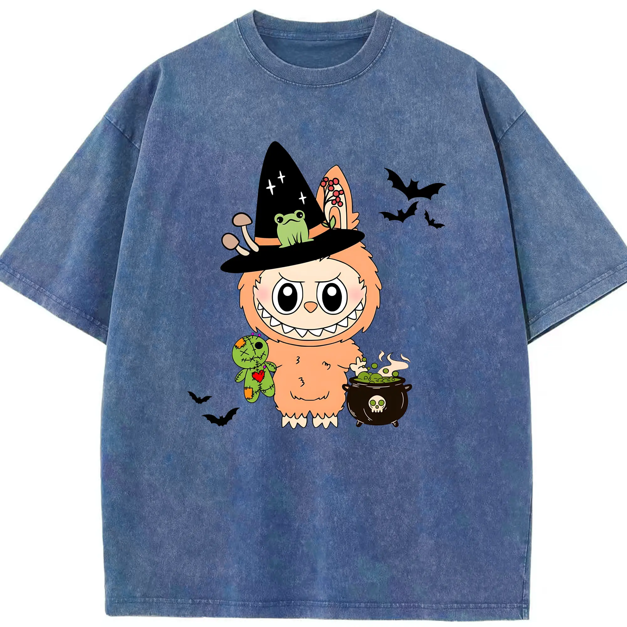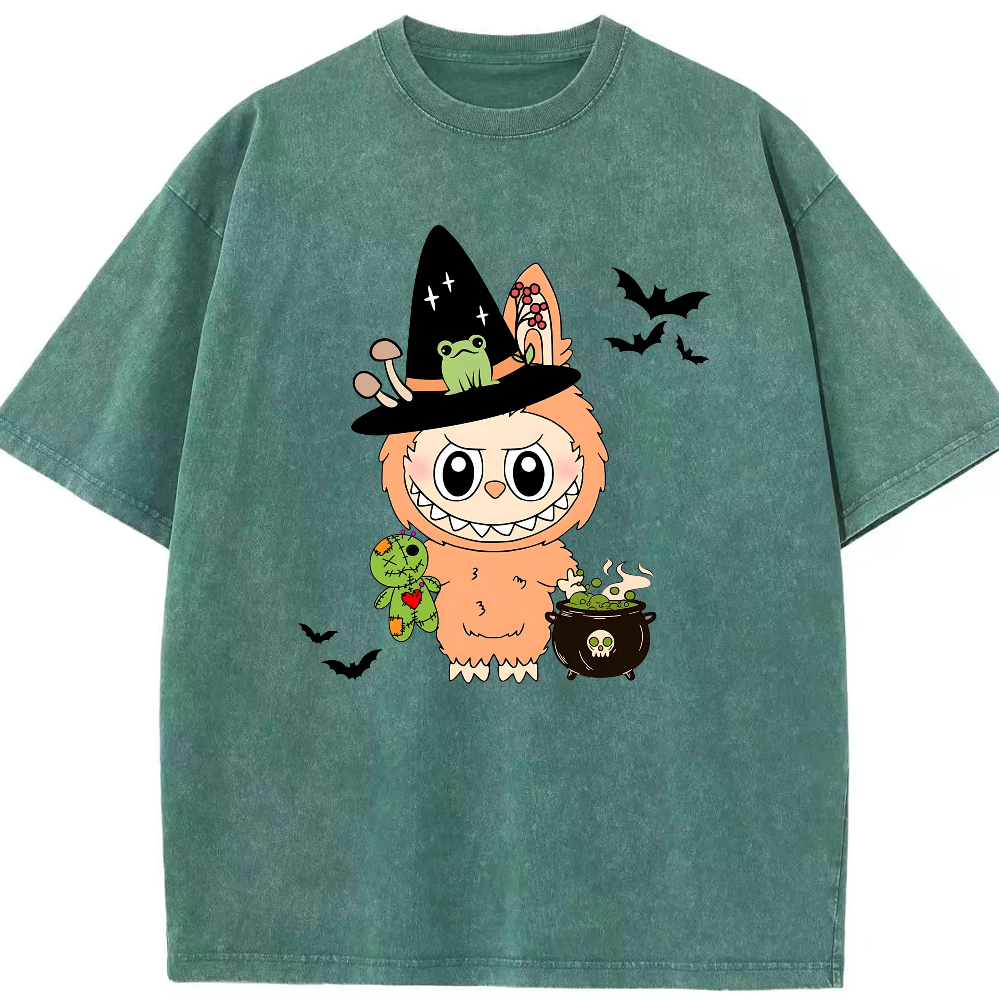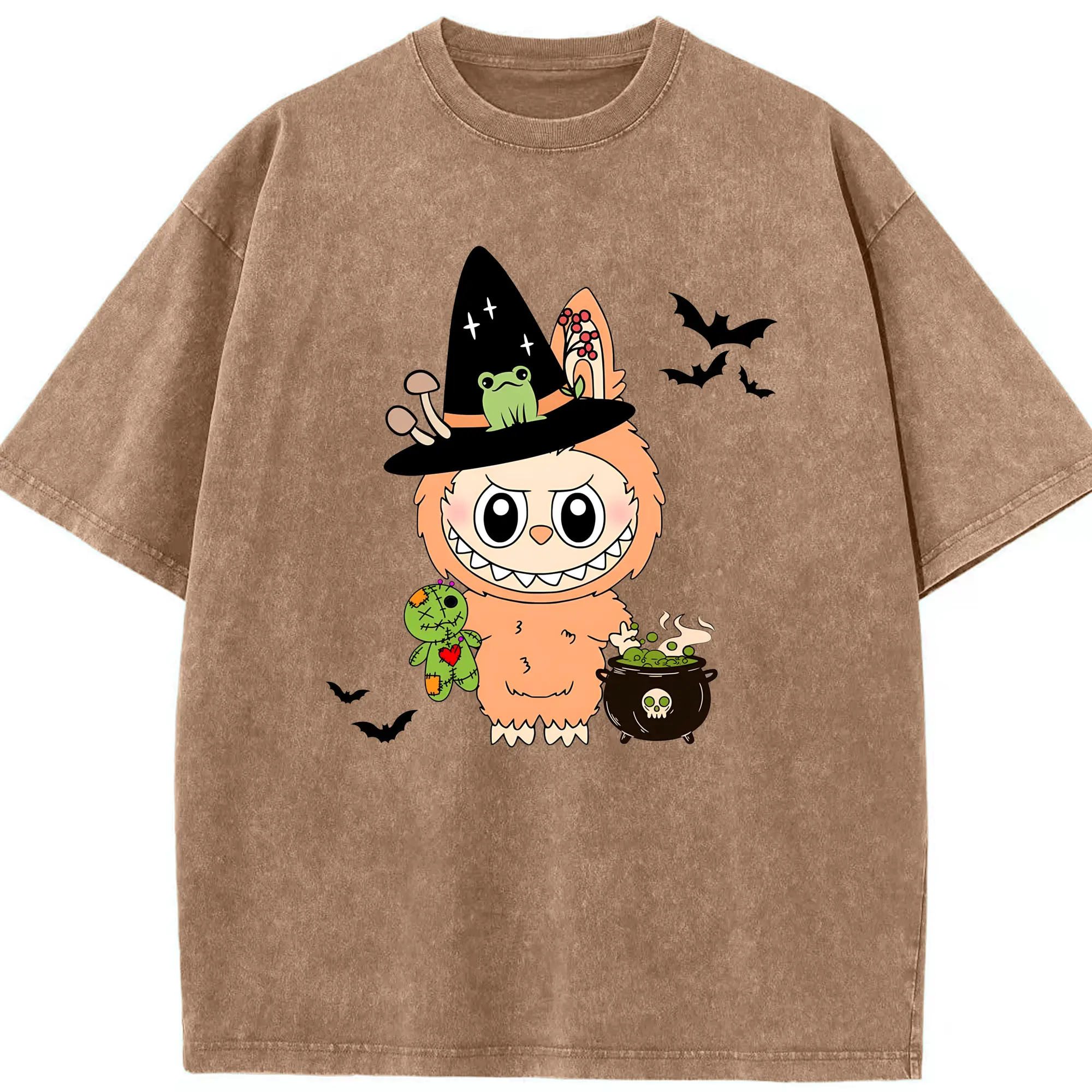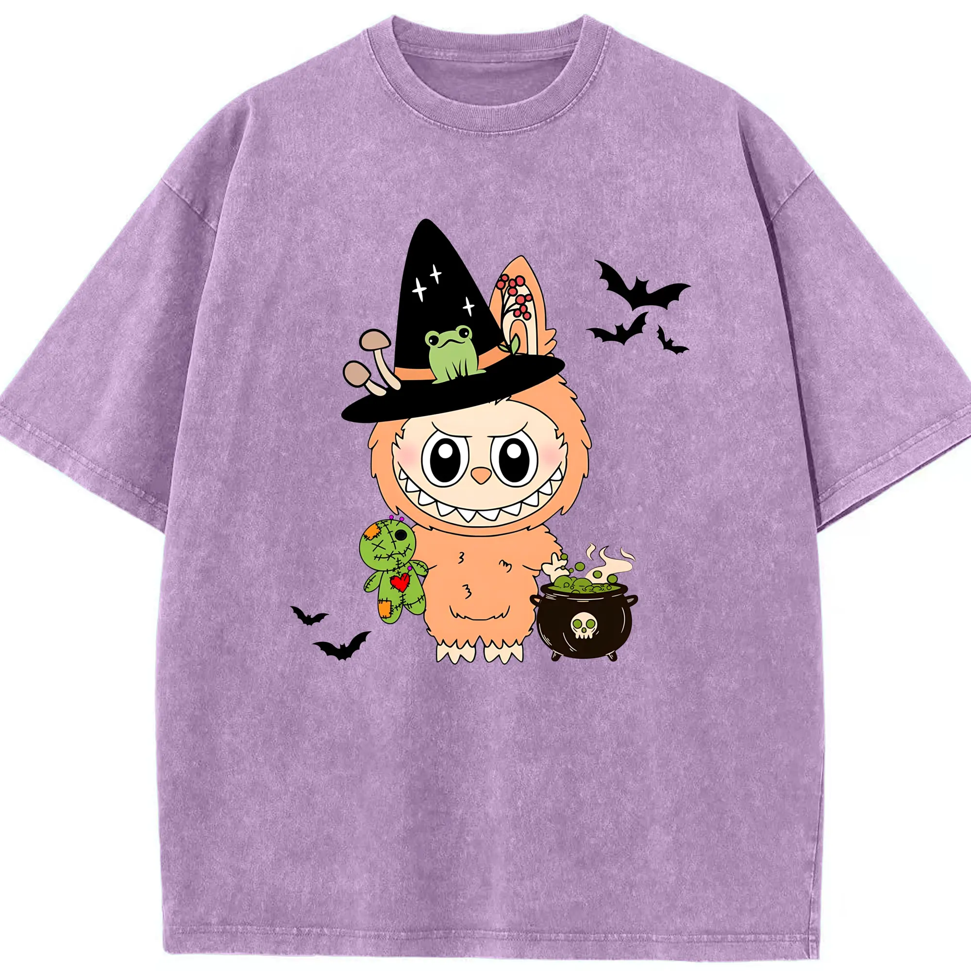 Labubu Halloween Cute Gothic Witch Cartoon DIY - Washed Vintage Look 230g Cotton Oversized T-Shirt With Front Heat Transfer Print – Soft, Lightweight, Stylish Fit – Comfortable Casual Wear For Sports & Everyday Use