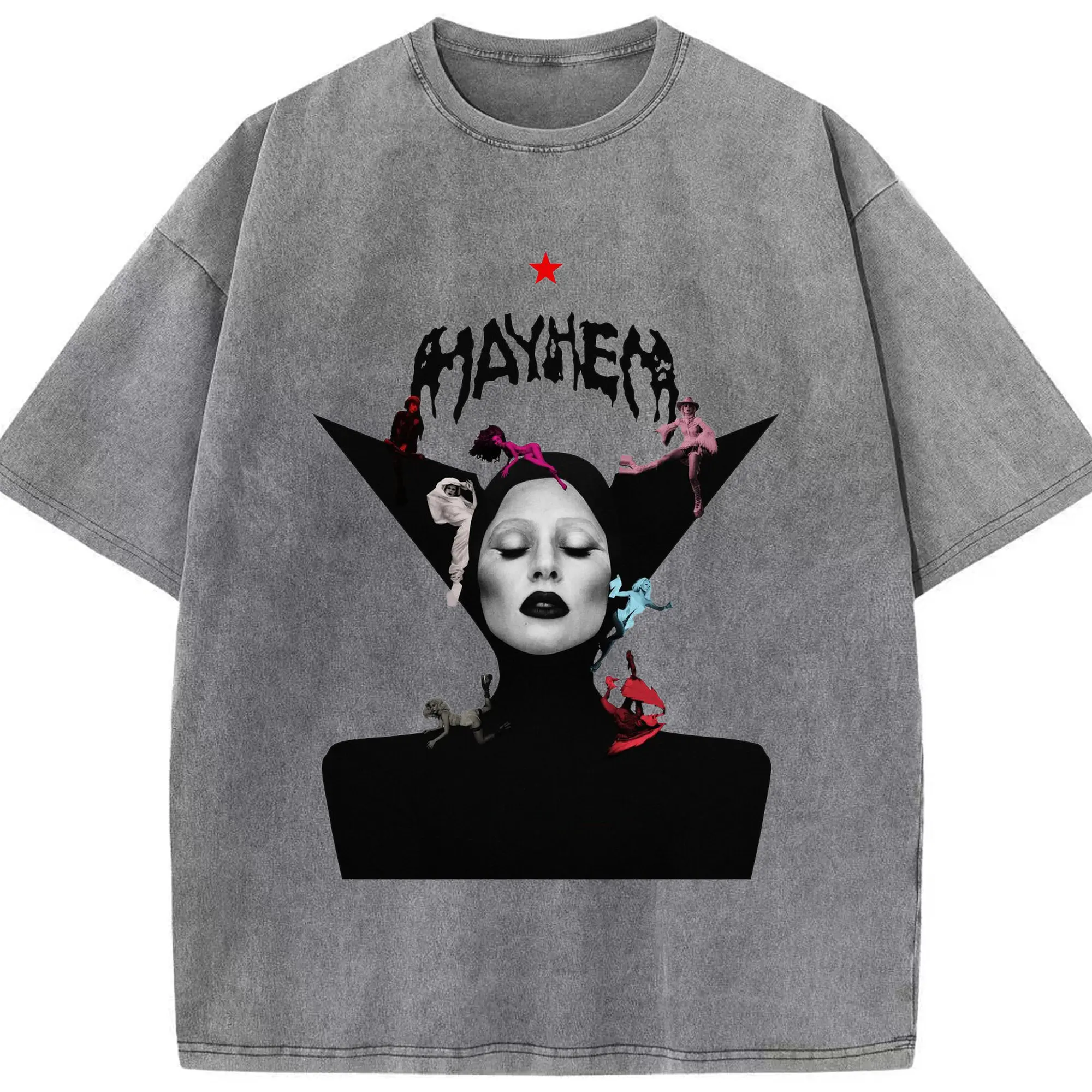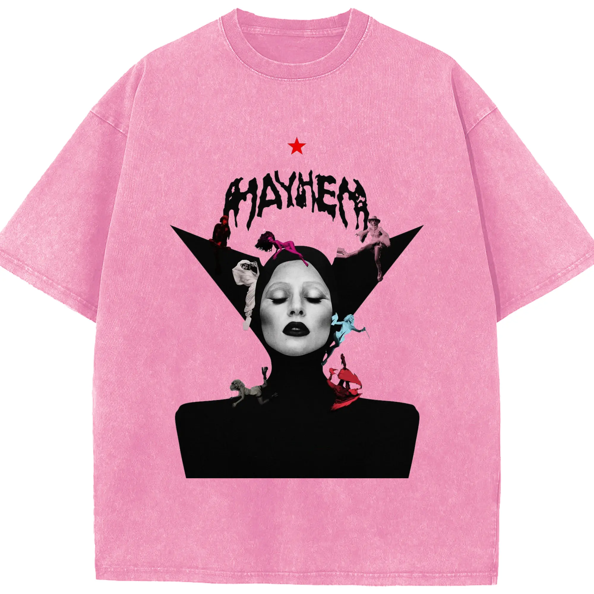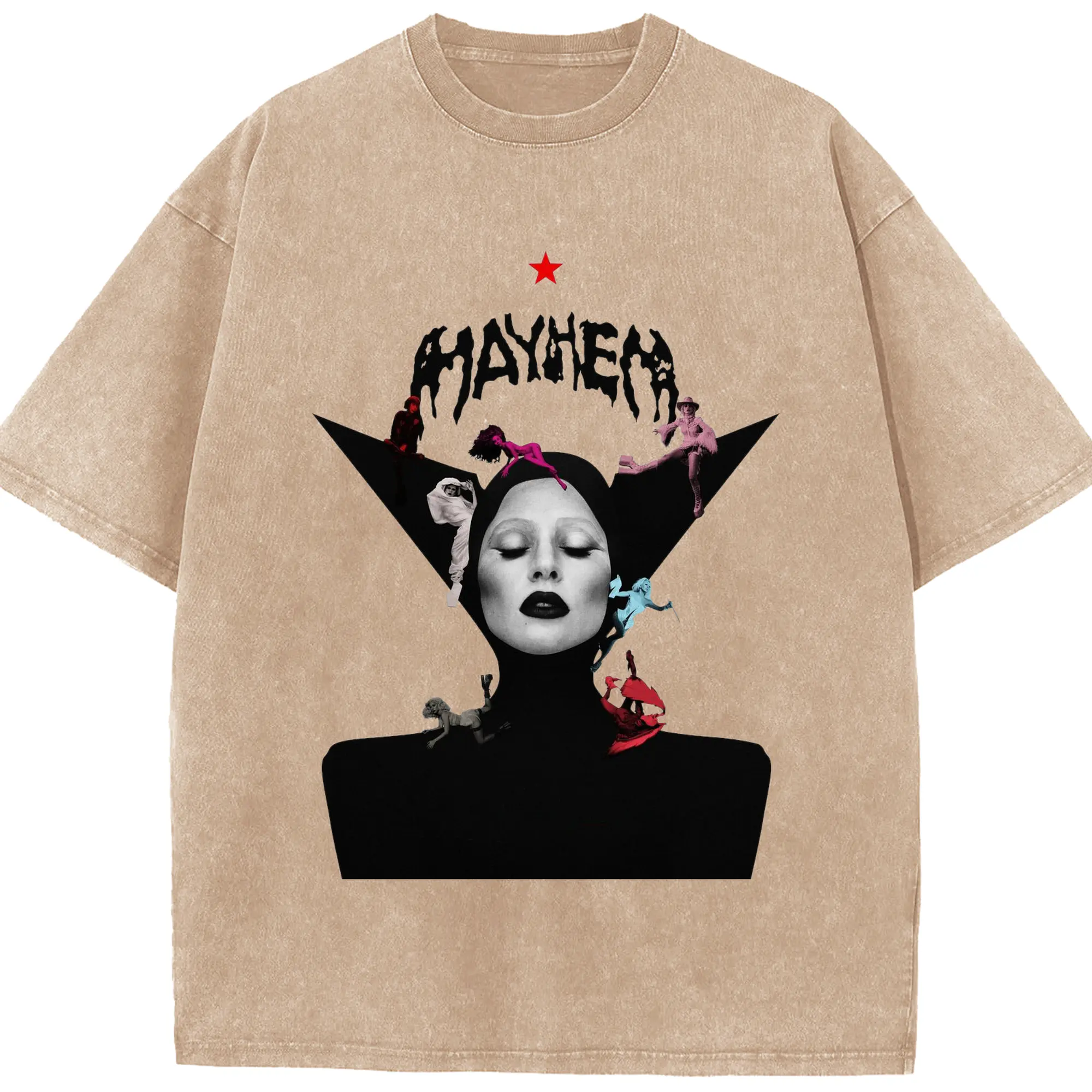 Lady Gaga “MAYHEM” Avant-Garde Collage DIY - Washed Vintage Look 230g Cotton Oversized T-Shirt With Front Heat Transfer Print – Soft, Lightweight, Stylish Fit – Comfortable Casual Wear For Sports & Everyday Use