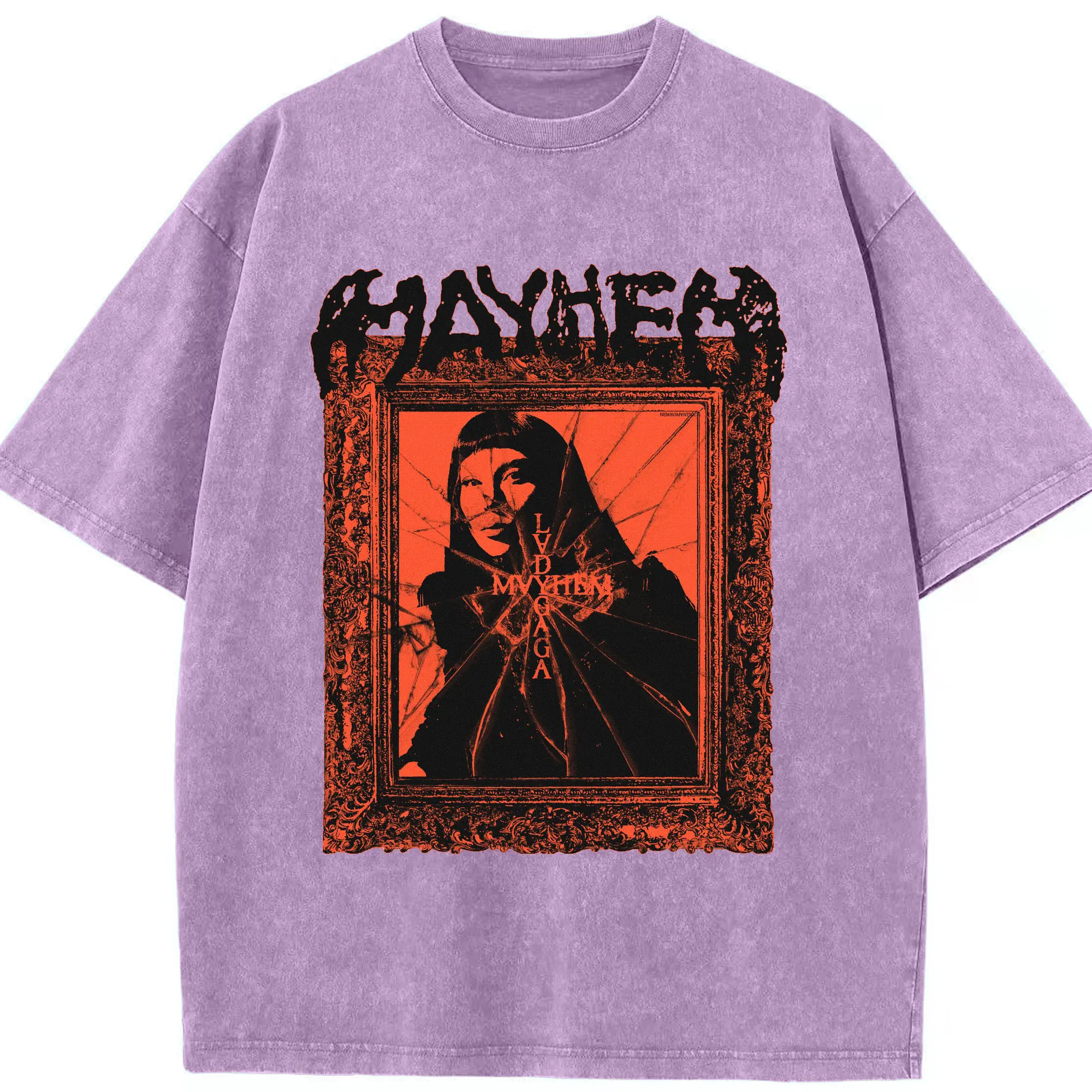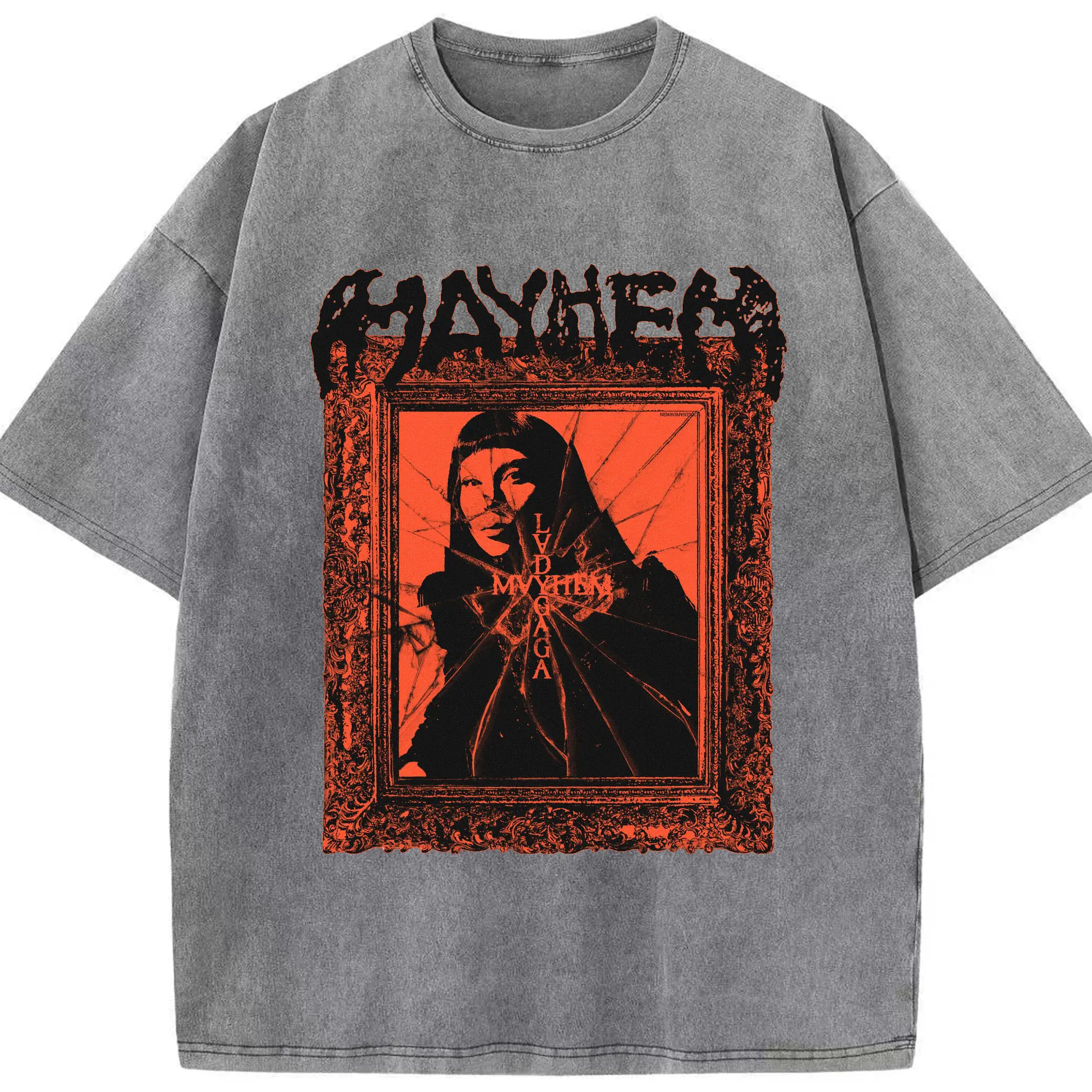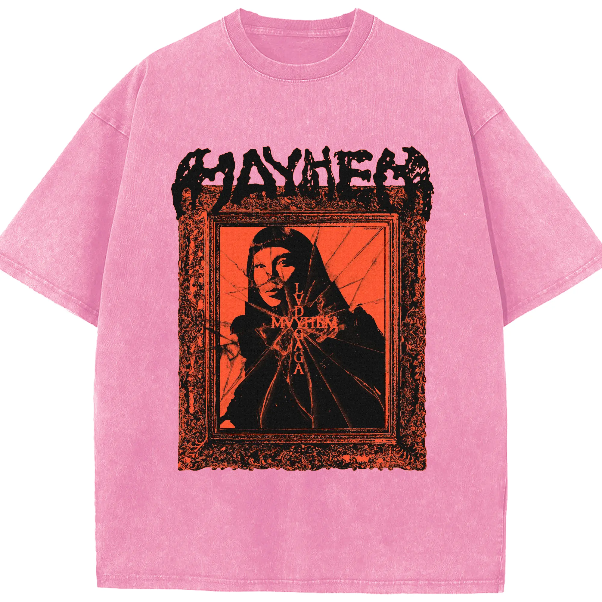 Lady Gaga Mayhem Retro Art Broken Frame DIY - Washed Vintage Look 230g Cotton Oversized T-Shirt With Front Heat Transfer Print – Soft, Lightweight, Stylish Fit – Comfortable Casual Wear For Sports & Everyday Use