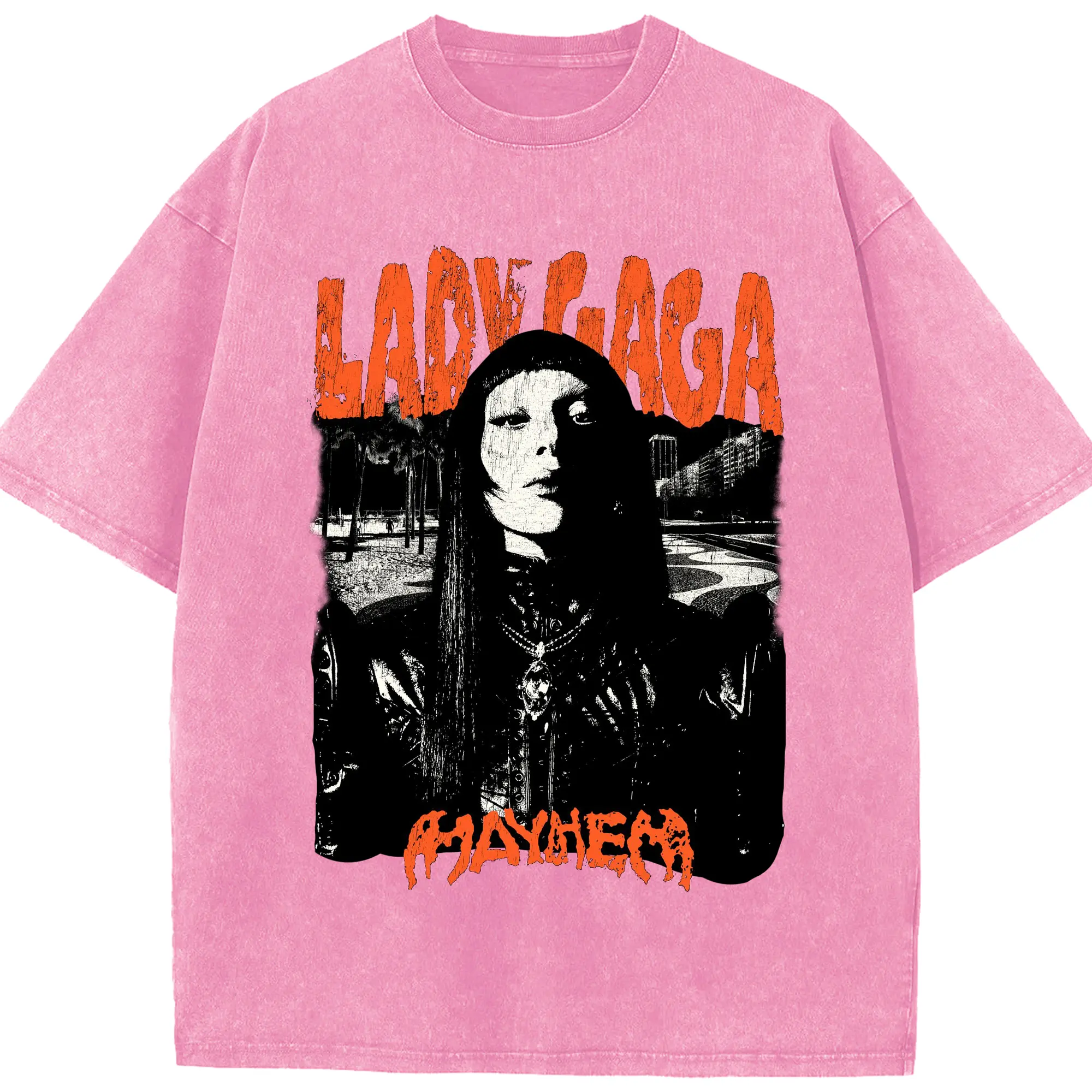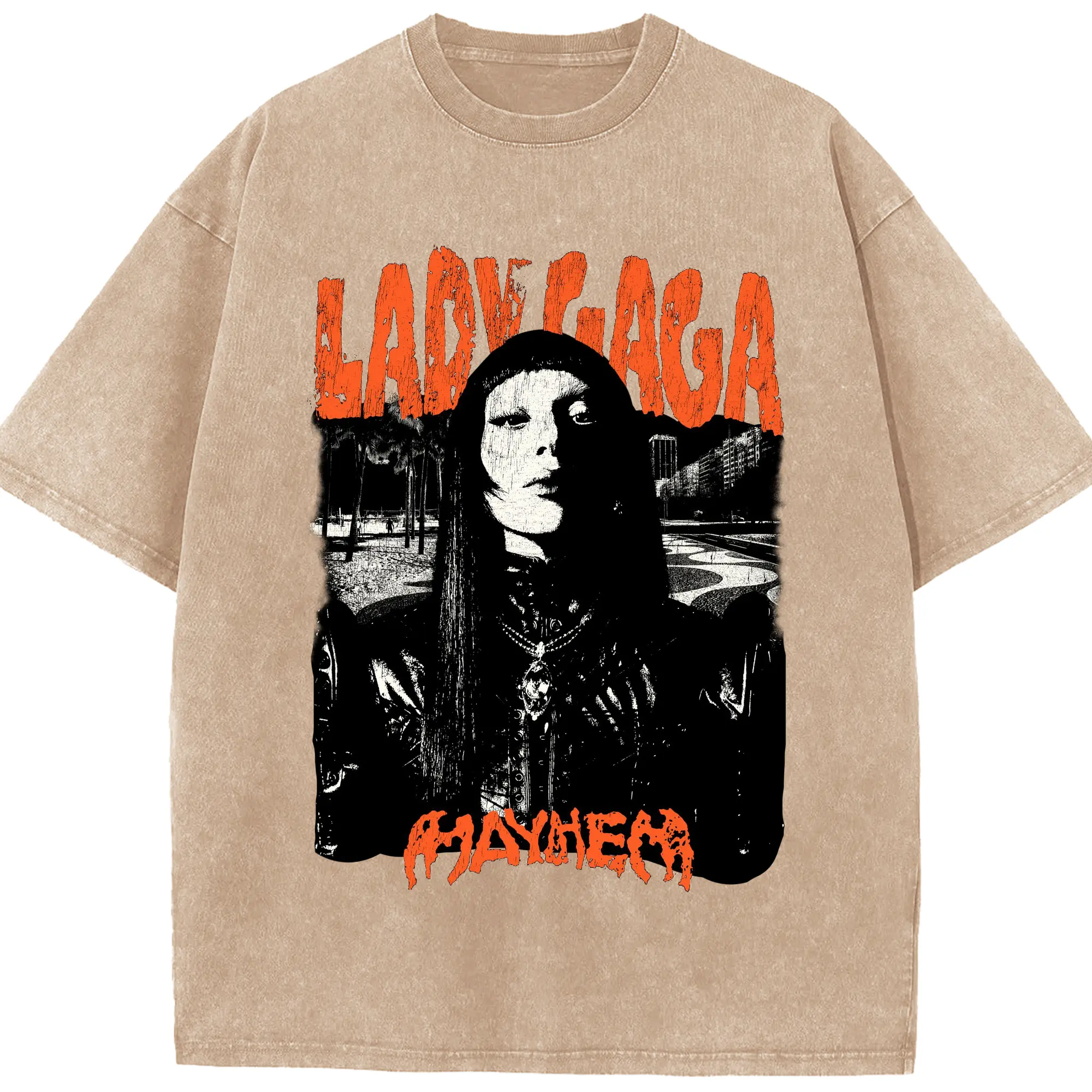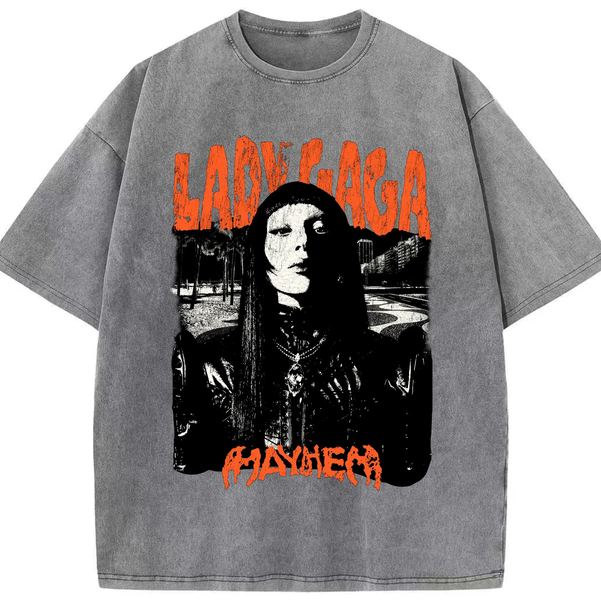 Lady Gaga“MAYHEM” Avant-Garde DIY - Washed Vintage Look 230g Cotton Oversized T-Shirt With Front Heat Transfer Print – Soft, Lightweight, Stylish Fit – Comfortable Casual Wear For Sports & Everyday Use