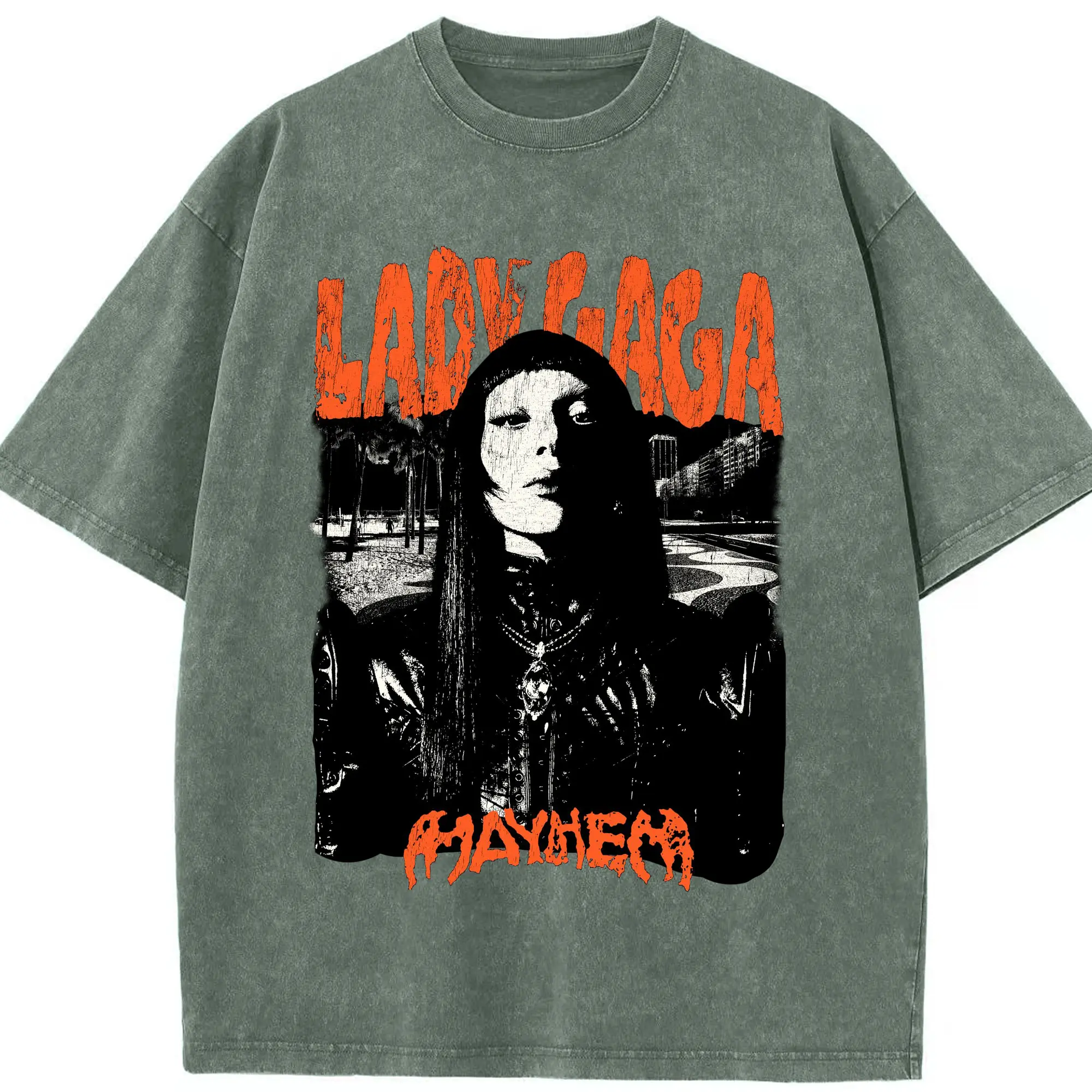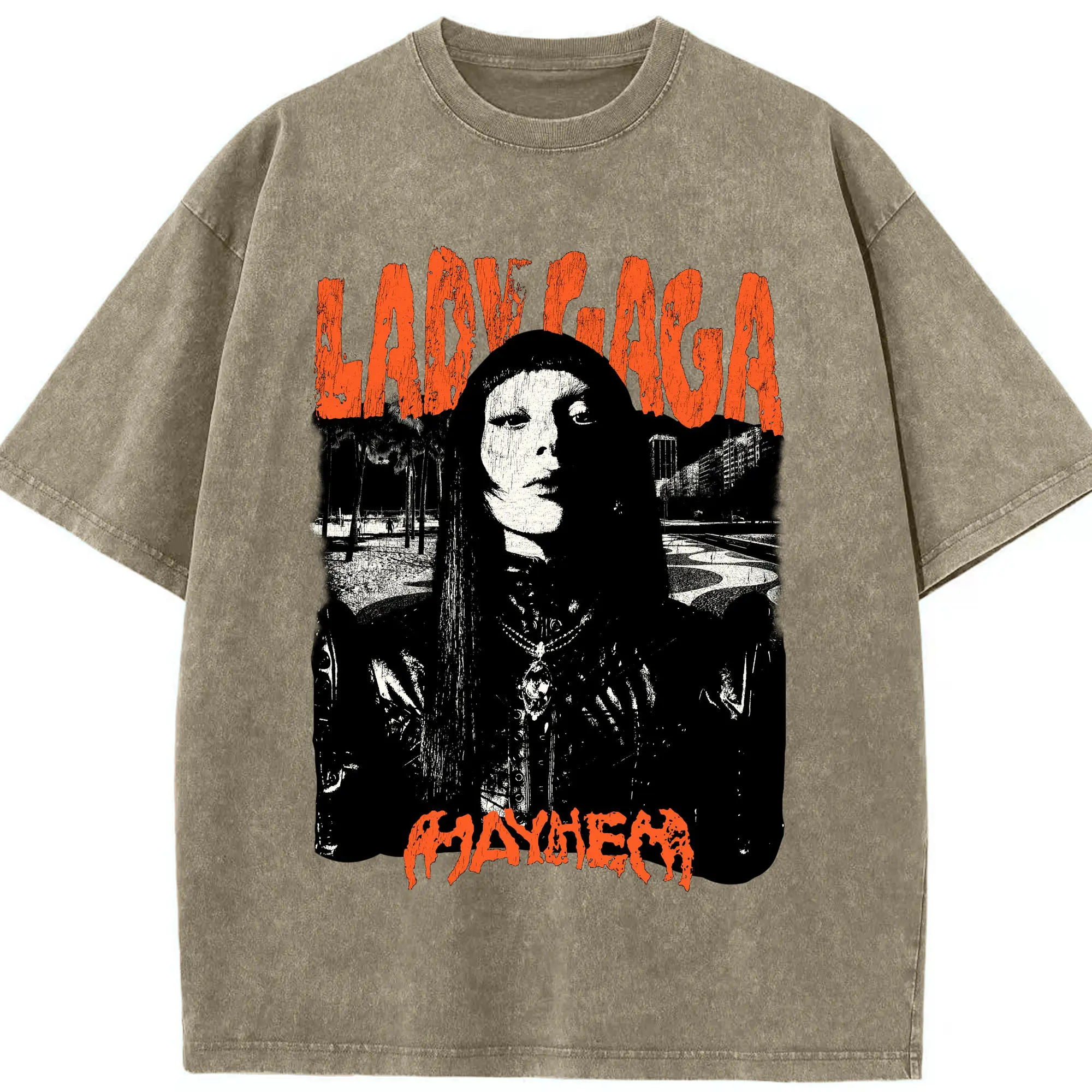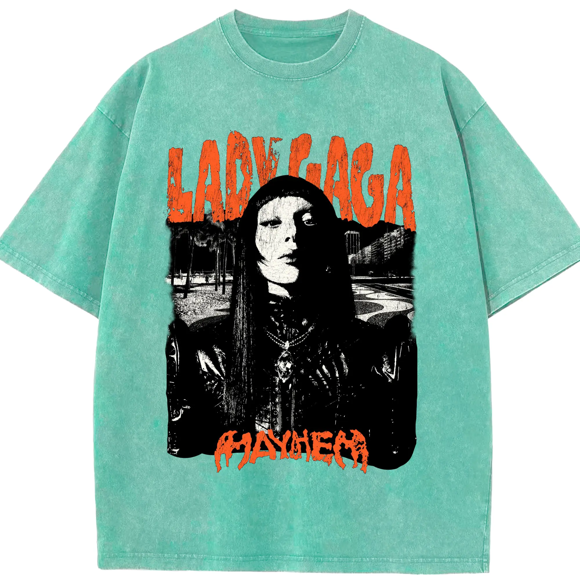 Lady Gaga“MAYHEM” Avant-Garde DIY - Washed Vintage Look 230g Cotton Oversized T-Shirt With Front Heat Transfer Print – Soft, Lightweight, Stylish Fit – Comfortable Casual Wear For Sports & Everyday Use