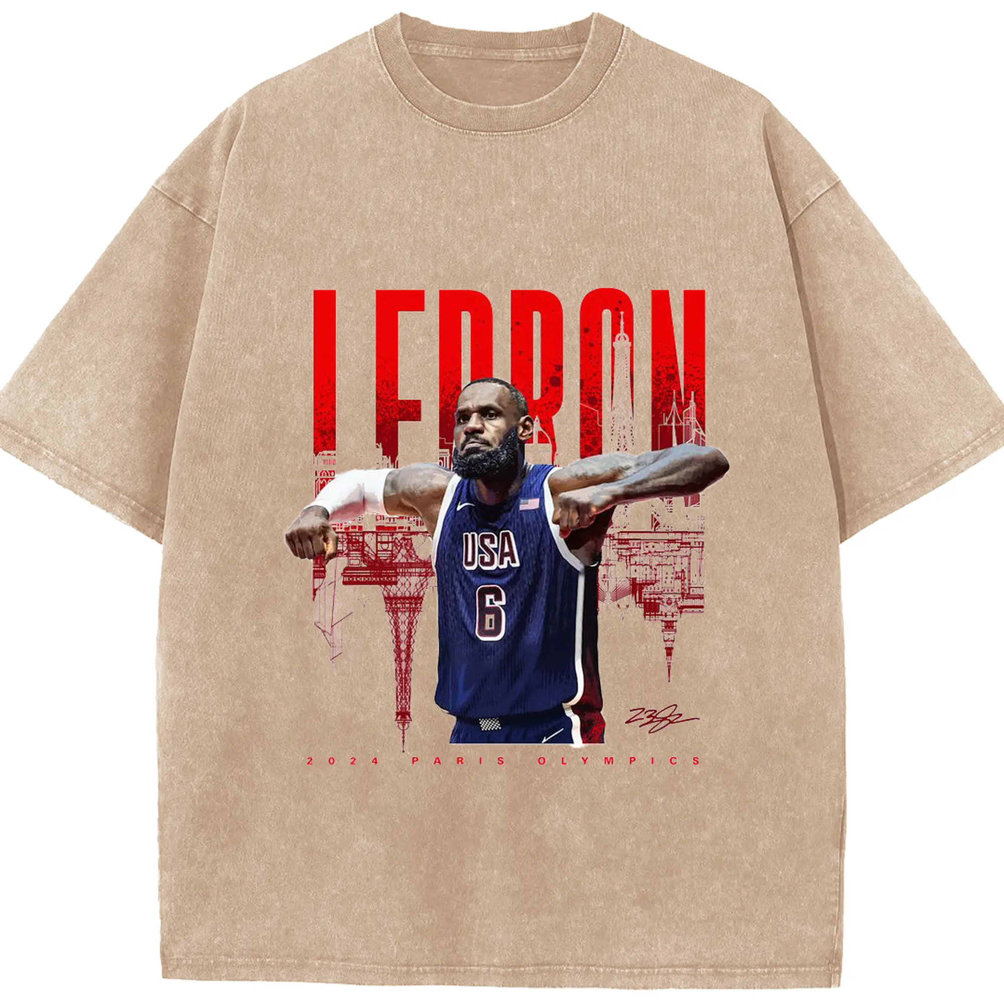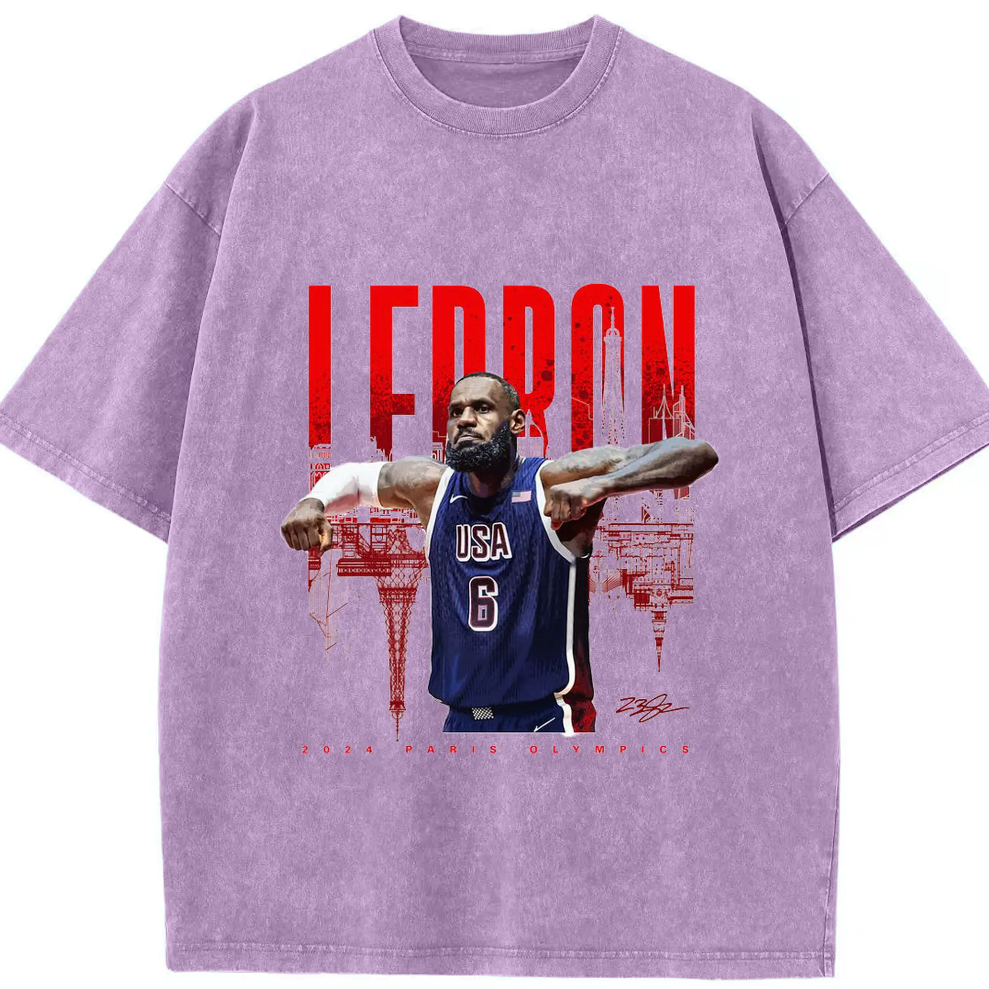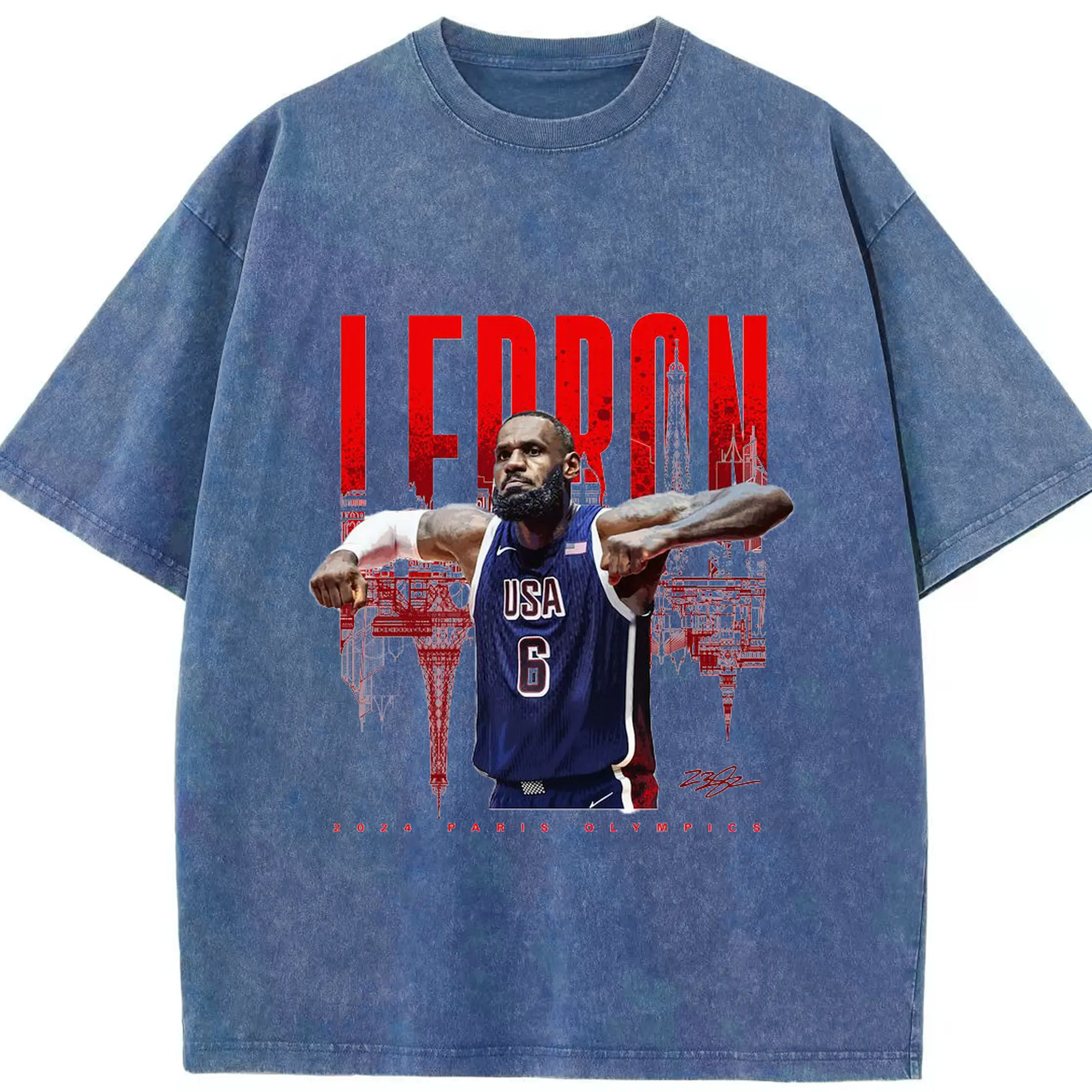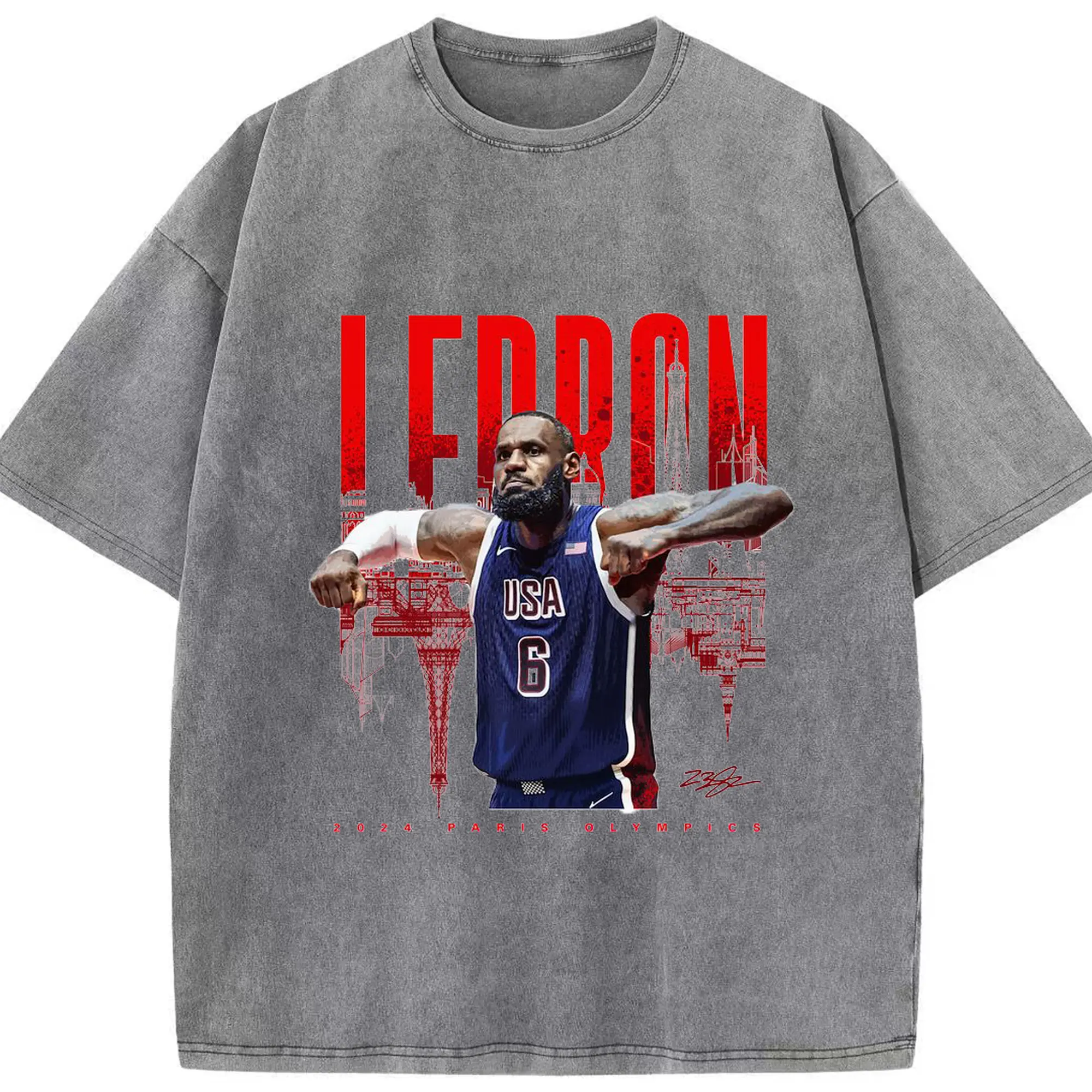 LeBron James 2024 Paris Olympics USA Jersey Shirt - Washed Vintage Look 230g Cotton Oversized T-Shirt With Front Heat Transfer Print – Soft, Lightweight, Stylish Fit – Comfortable Casual Wear For Sports & Everyday Use