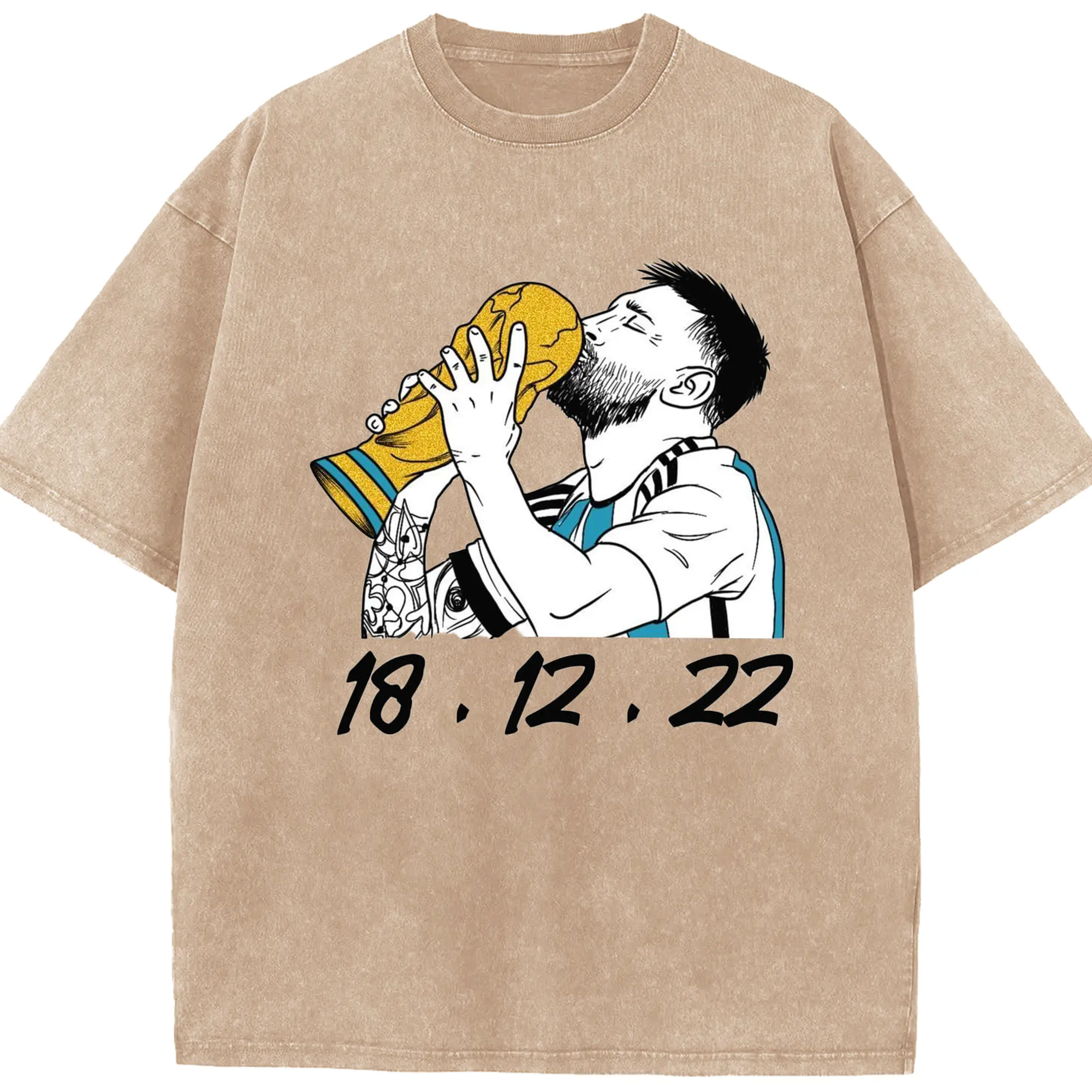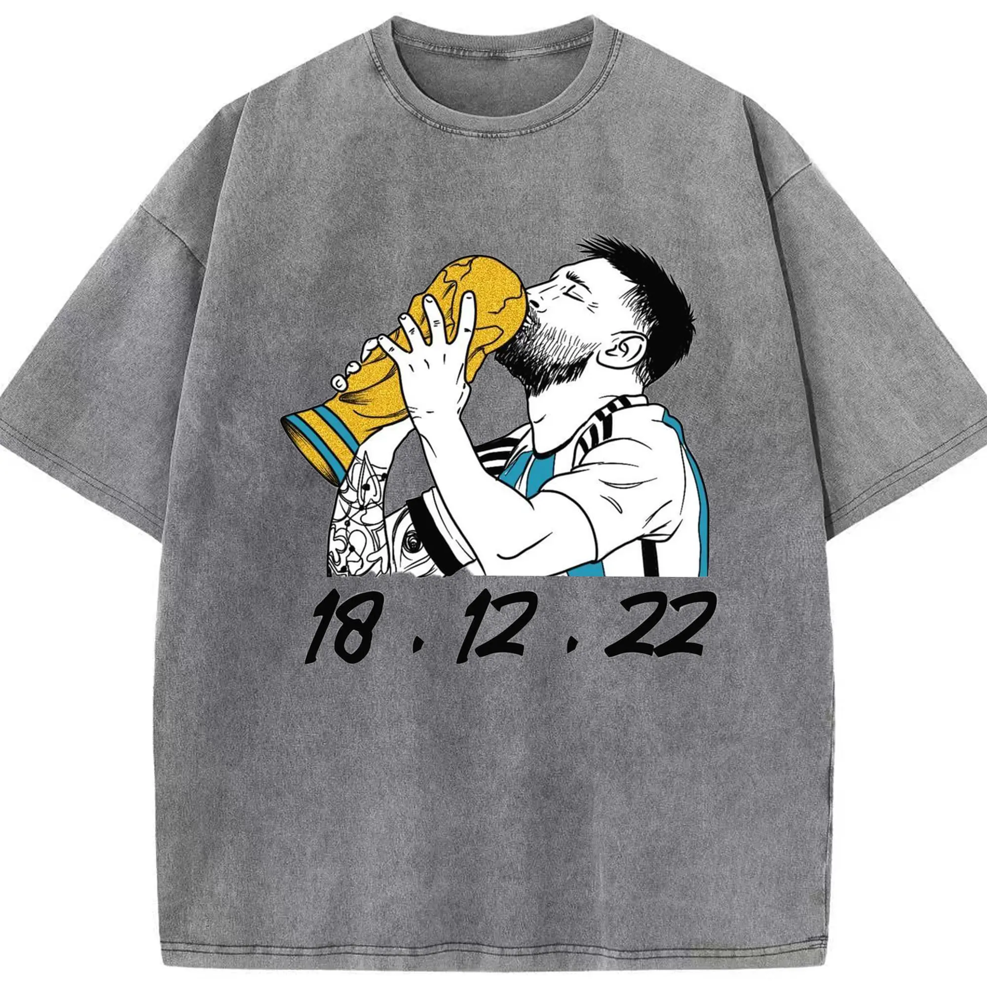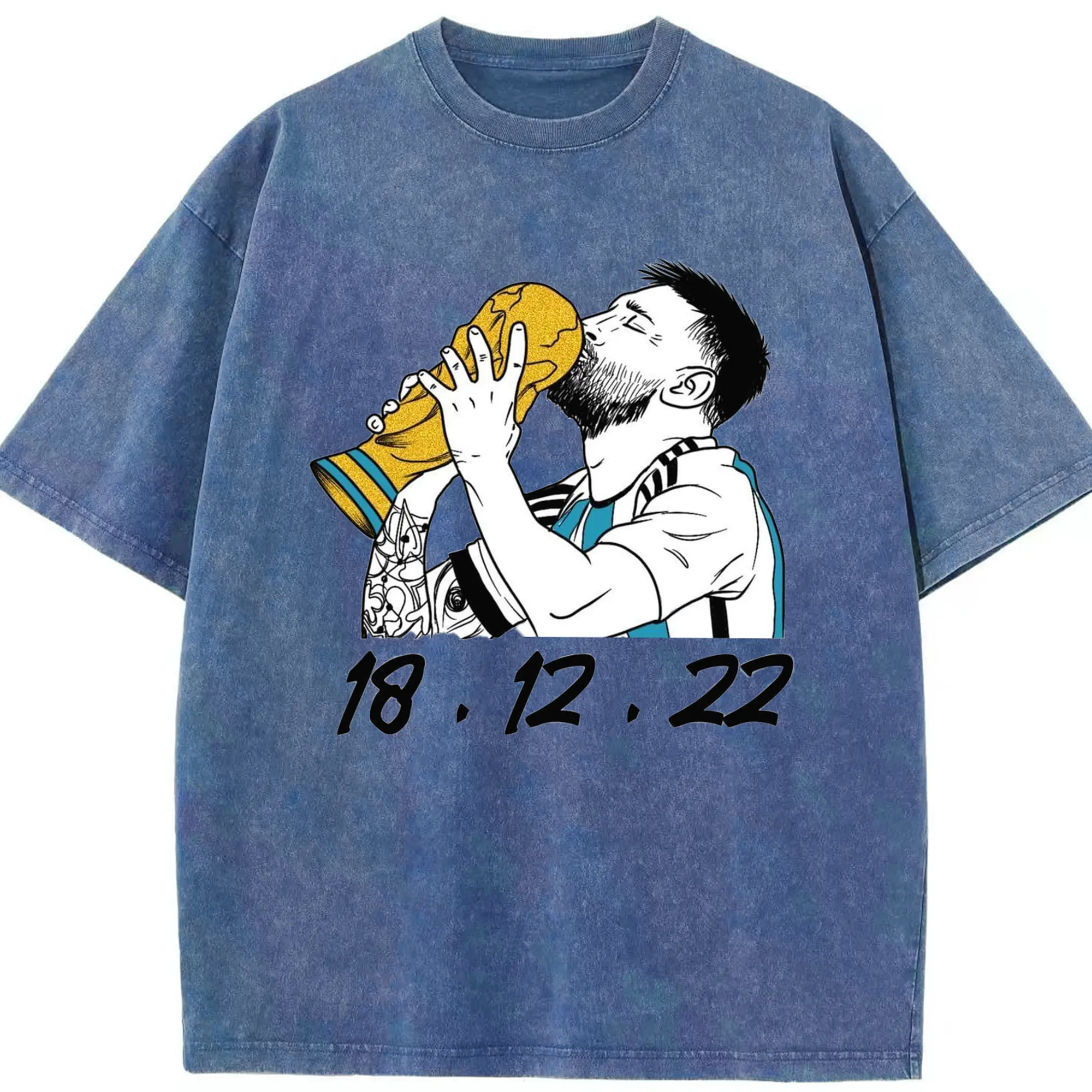 Lionel Messi 2022 World Cup Champion Kiss Trophy DIY Shirt - Washed Vintage Look 230g Cotton Oversized T-Shirt With Front Heat Transfer Print – Soft, Lightweight, Stylish Fit – Comfortable Casual Wear For Sports & Everyday Use