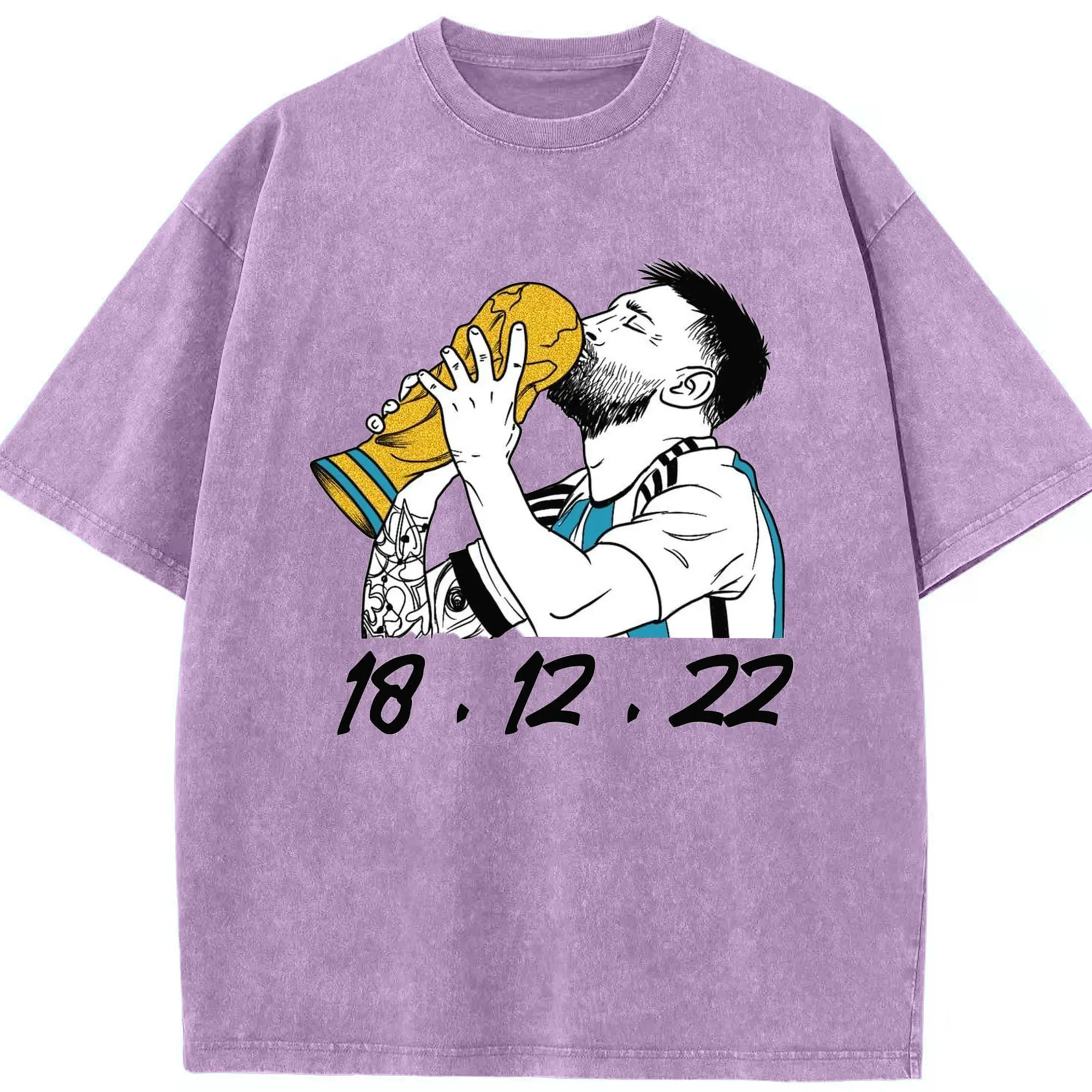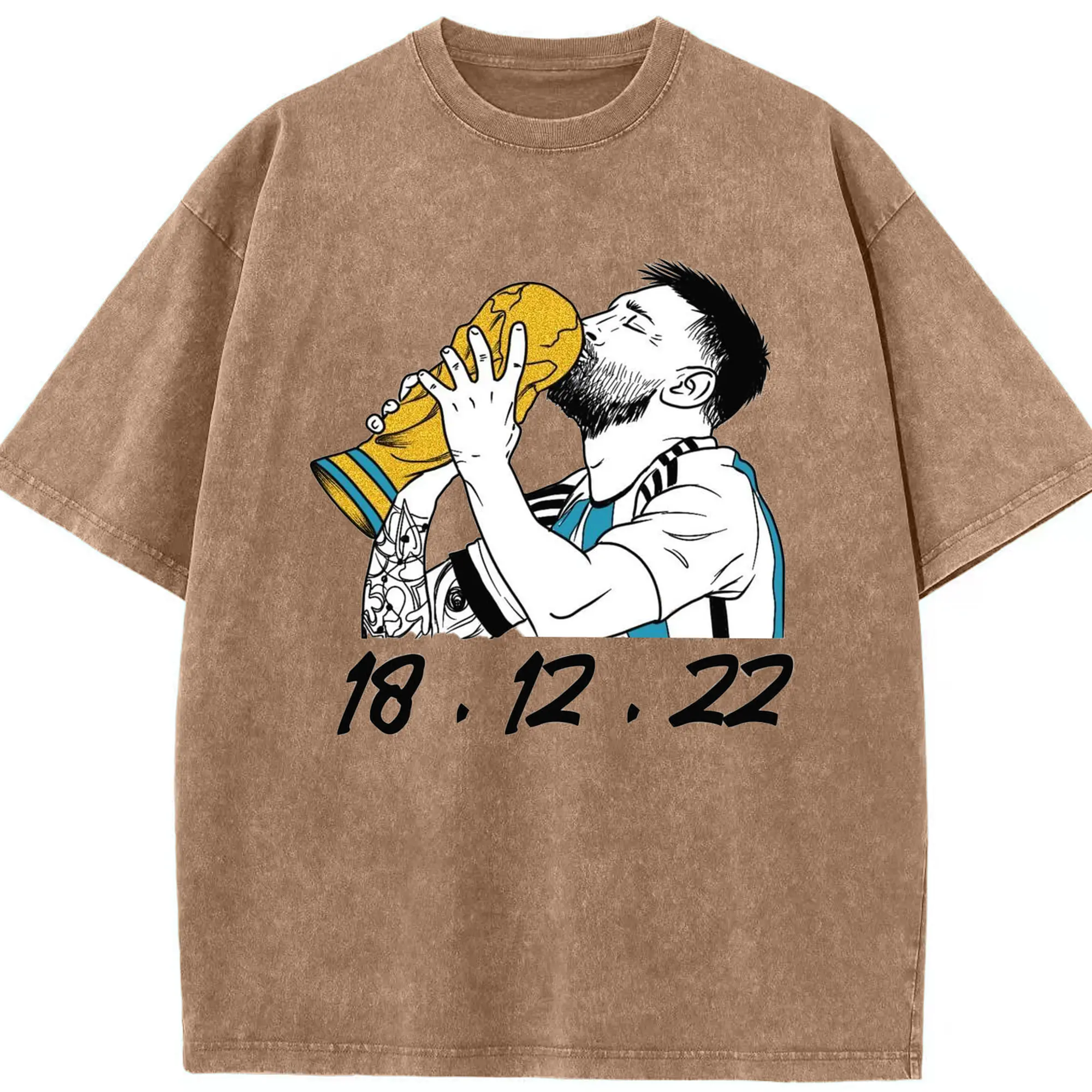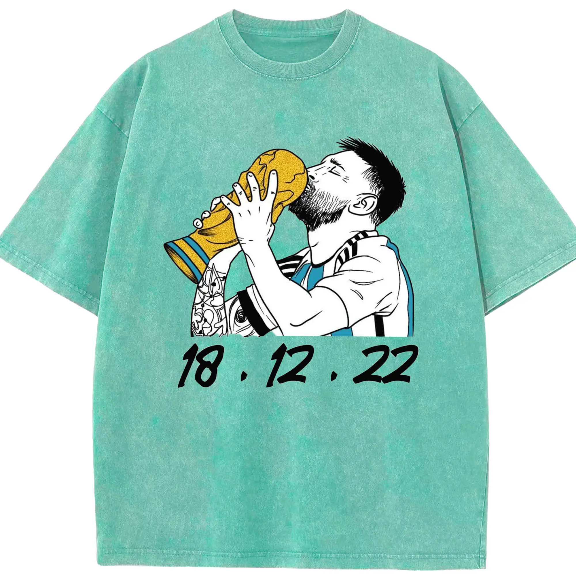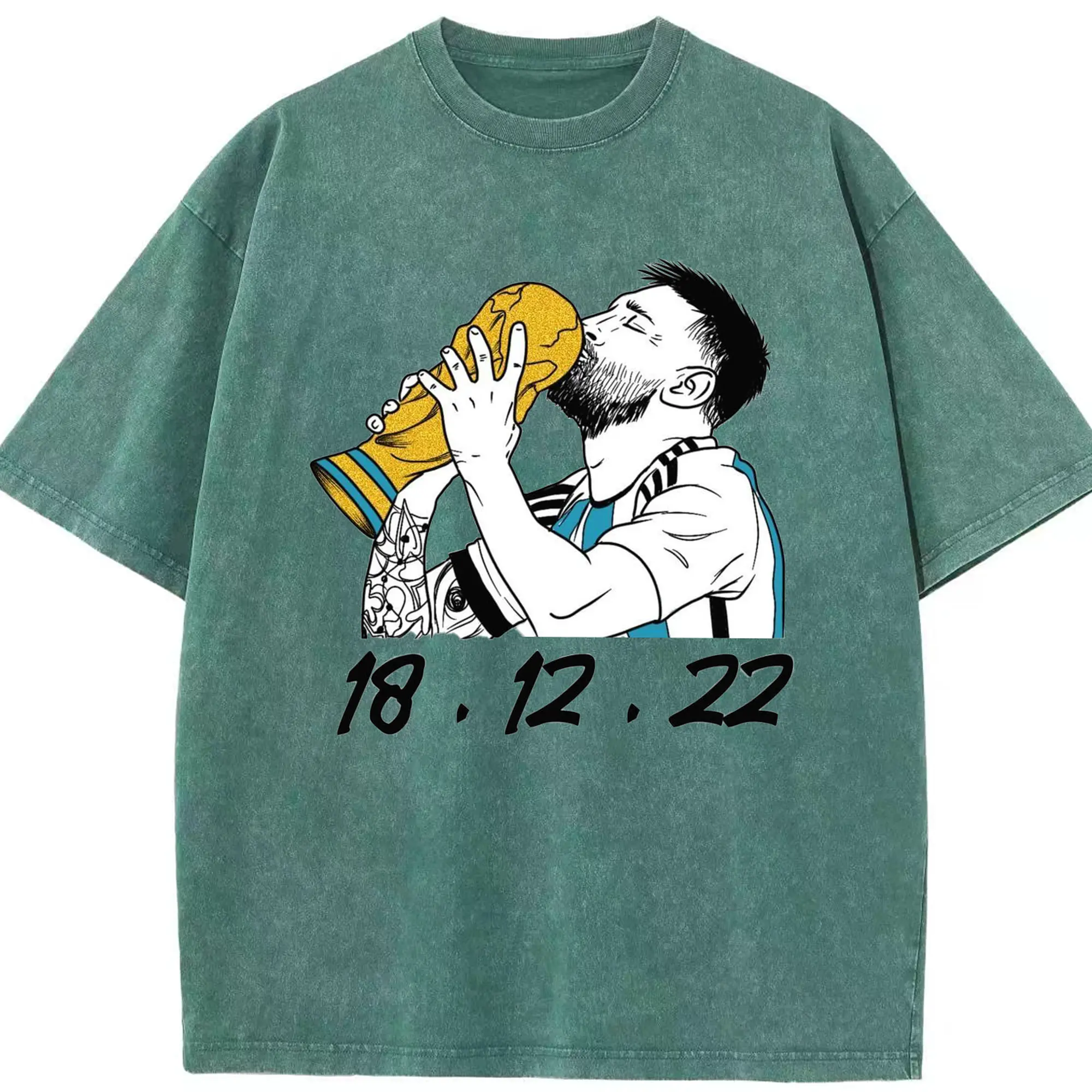 Lionel Messi 2022 World Cup Champion Kiss Trophy DIY Shirt - Washed Vintage Look 230g Cotton Oversized T-Shirt With Front Heat Transfer Print – Soft, Lightweight, Stylish Fit – Comfortable Casual Wear For Sports & Everyday Use