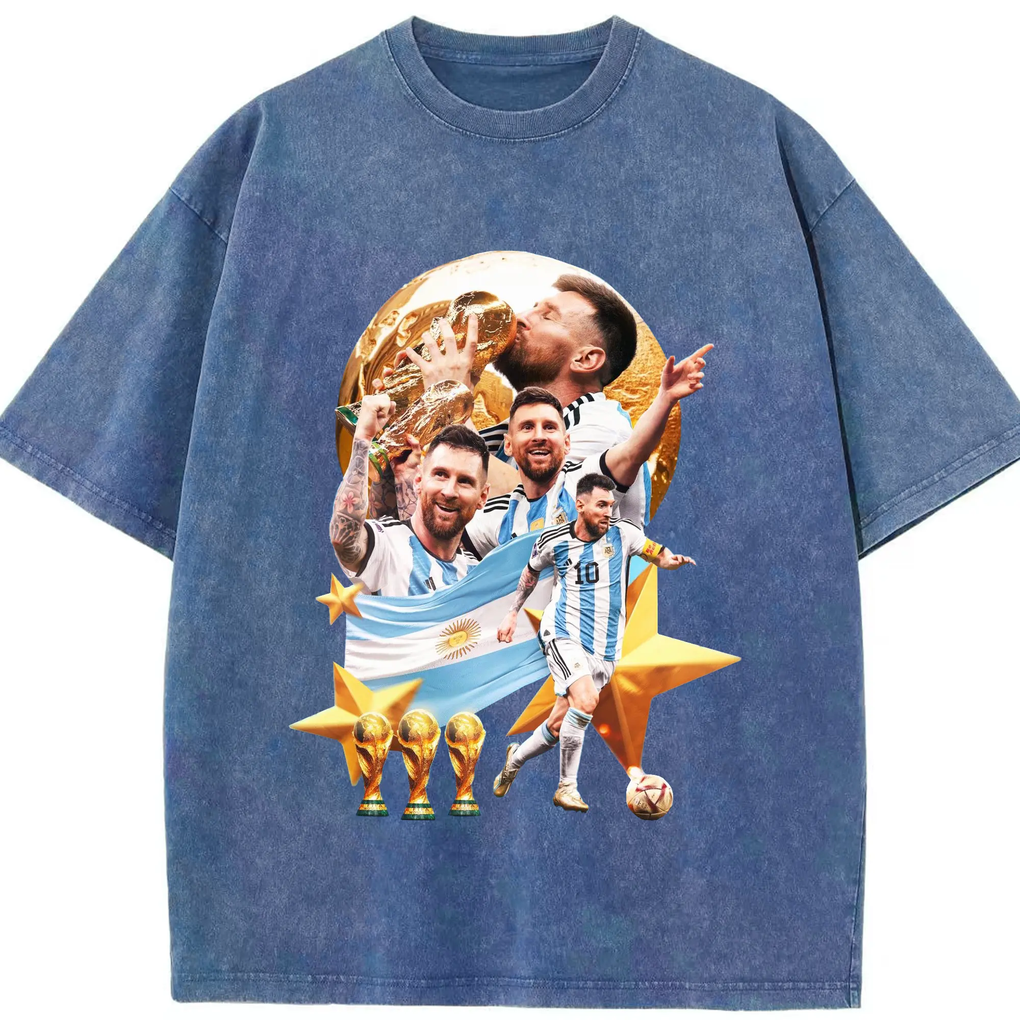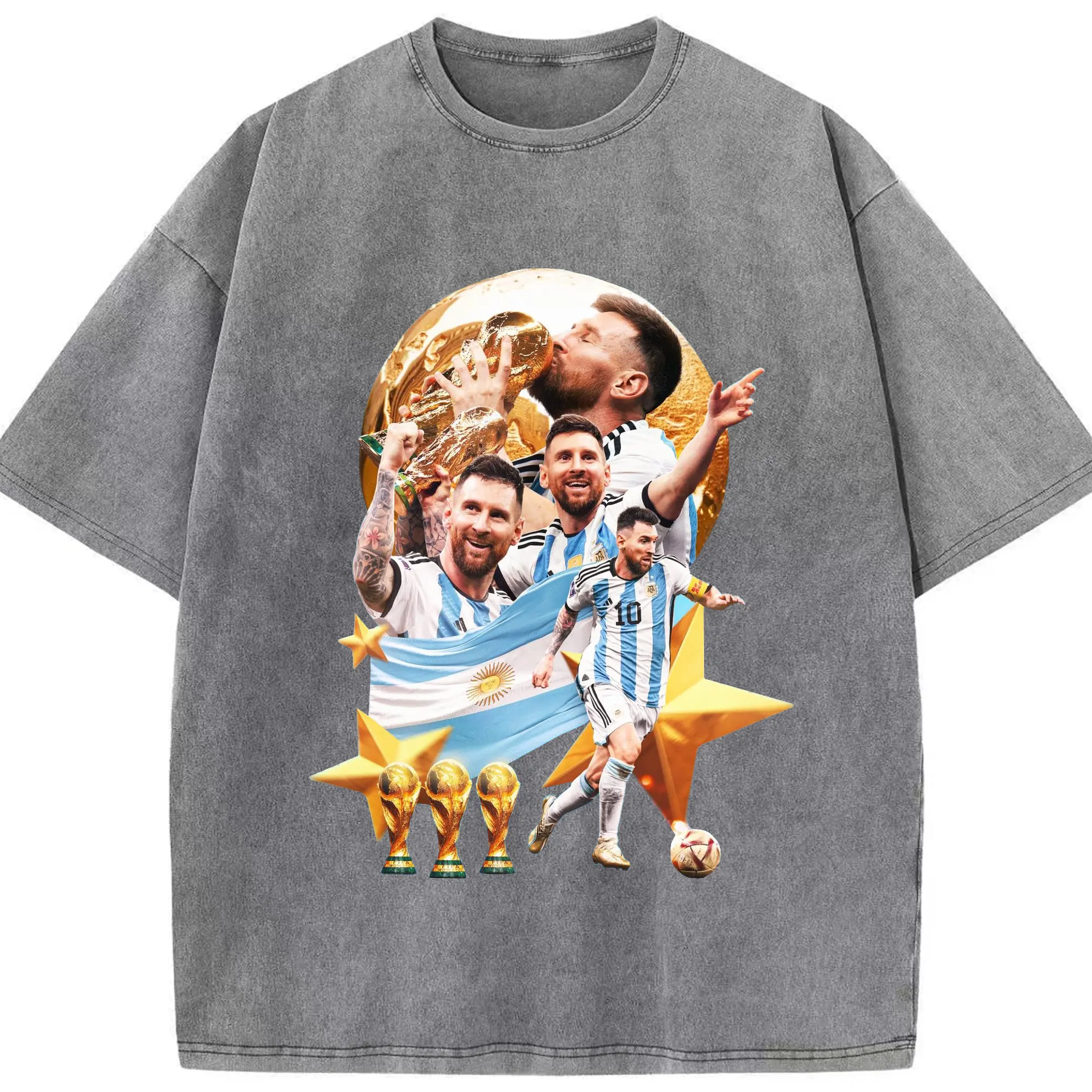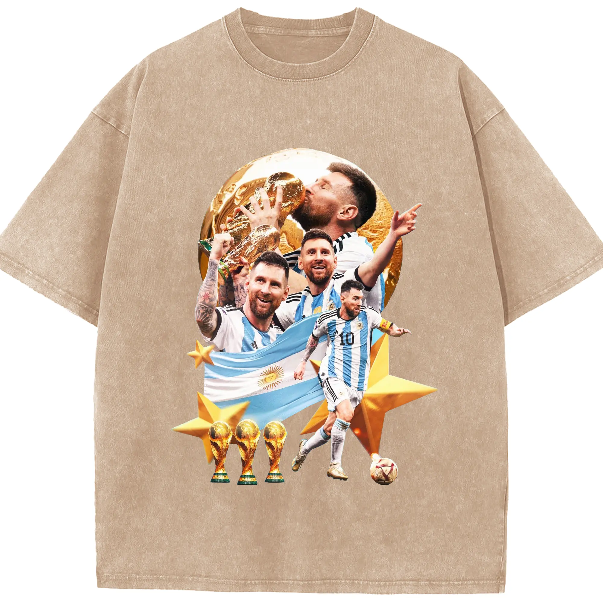 Lionel Messi Argentina World Cup Champion Collage DIY Shirt - Washed Vintage Look 230g Cotton Oversized T-Shirt With Front Heat Transfer Print – Soft, Lightweight, Stylish Fit – Comfortable Casual Wear For Sports & Everyday Use