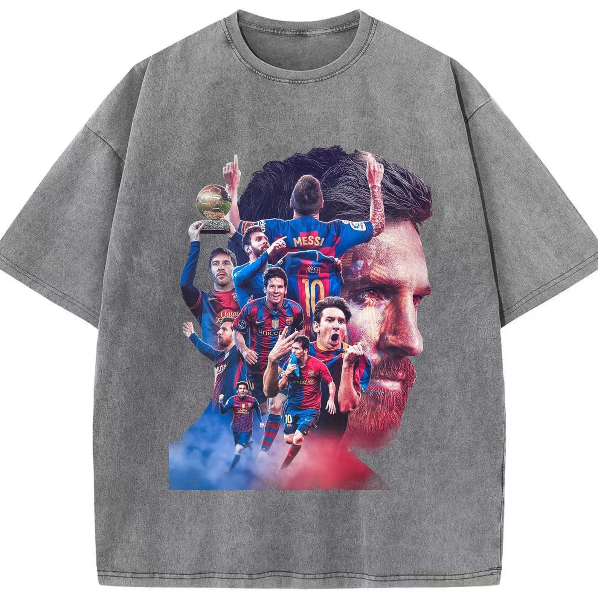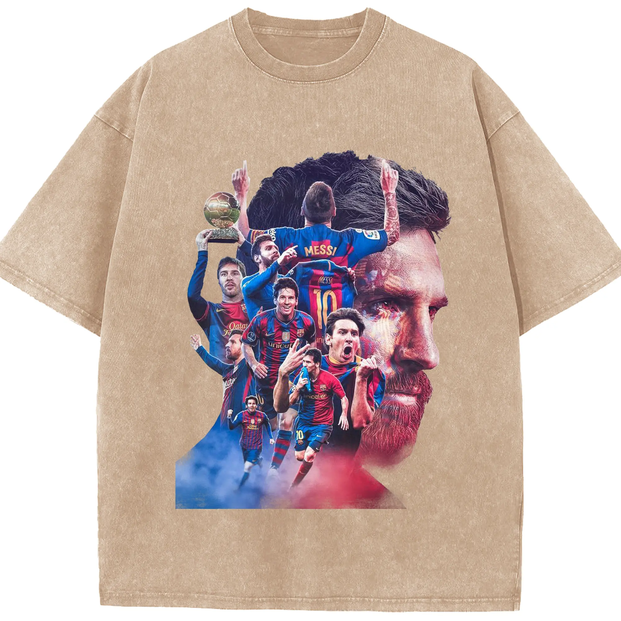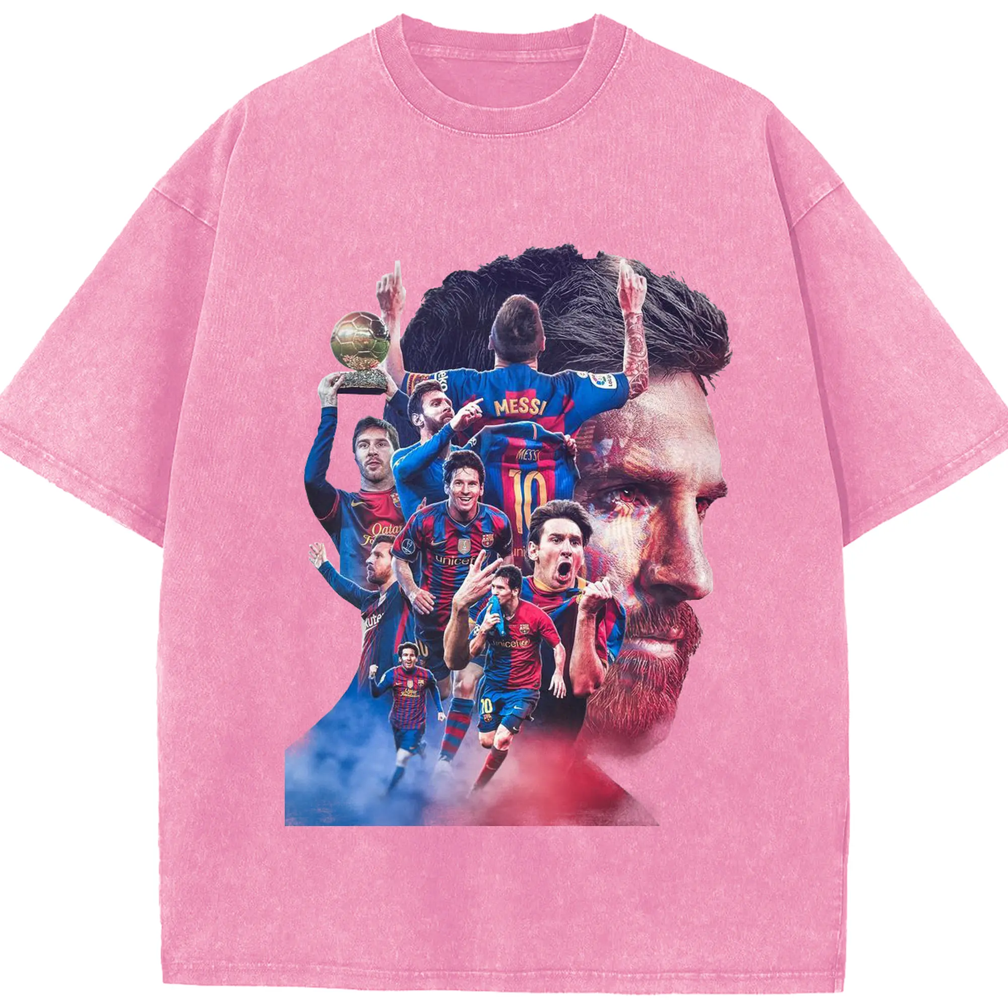 Lionel Messi Barcelona Career Highlights DIY Shirt - Washed Vintage Look 230g Cotton Oversized T-Shirt With Front Heat Transfer Print – Soft, Lightweight, Stylish Fit – Comfortable Casual Wear For Sports & Everyday Use