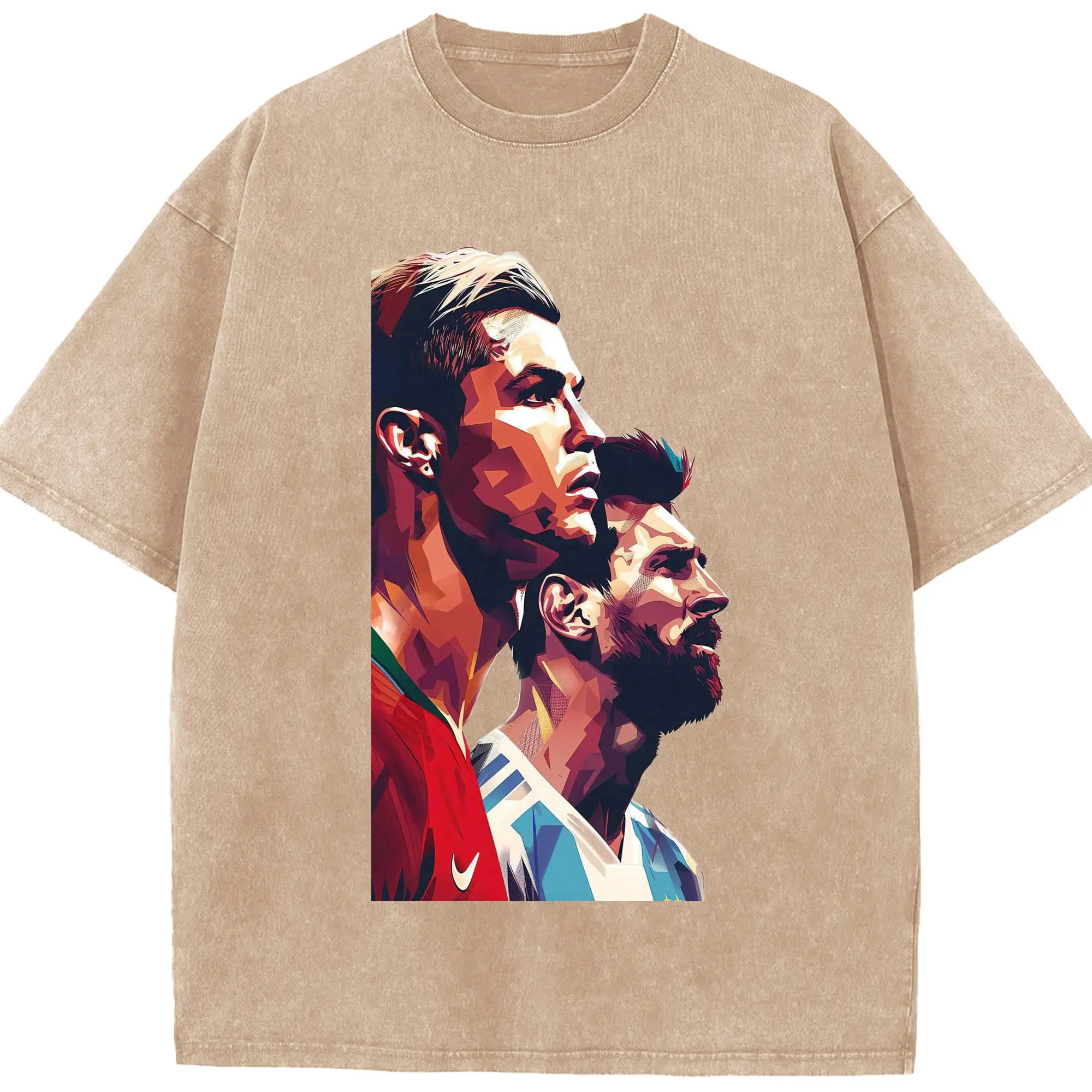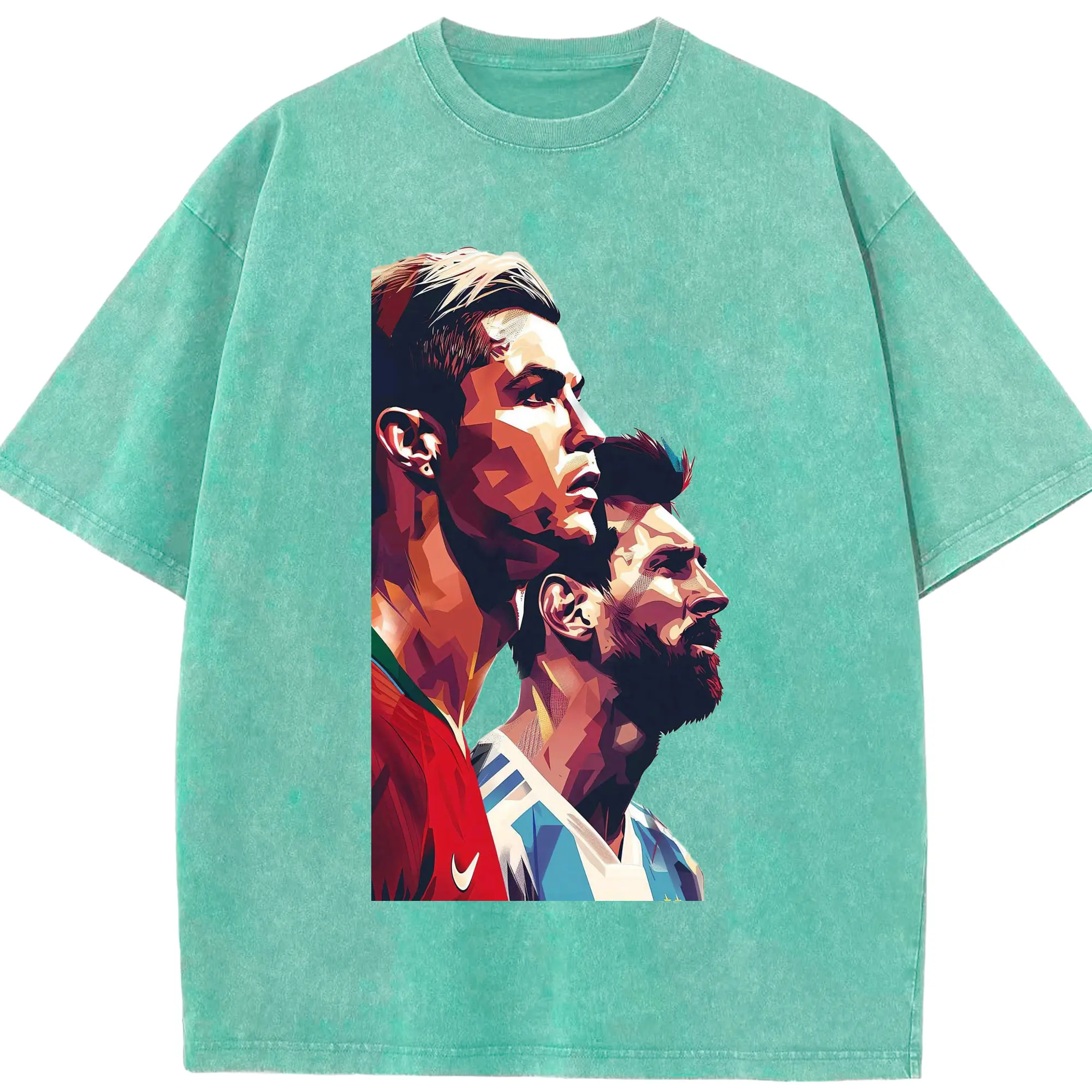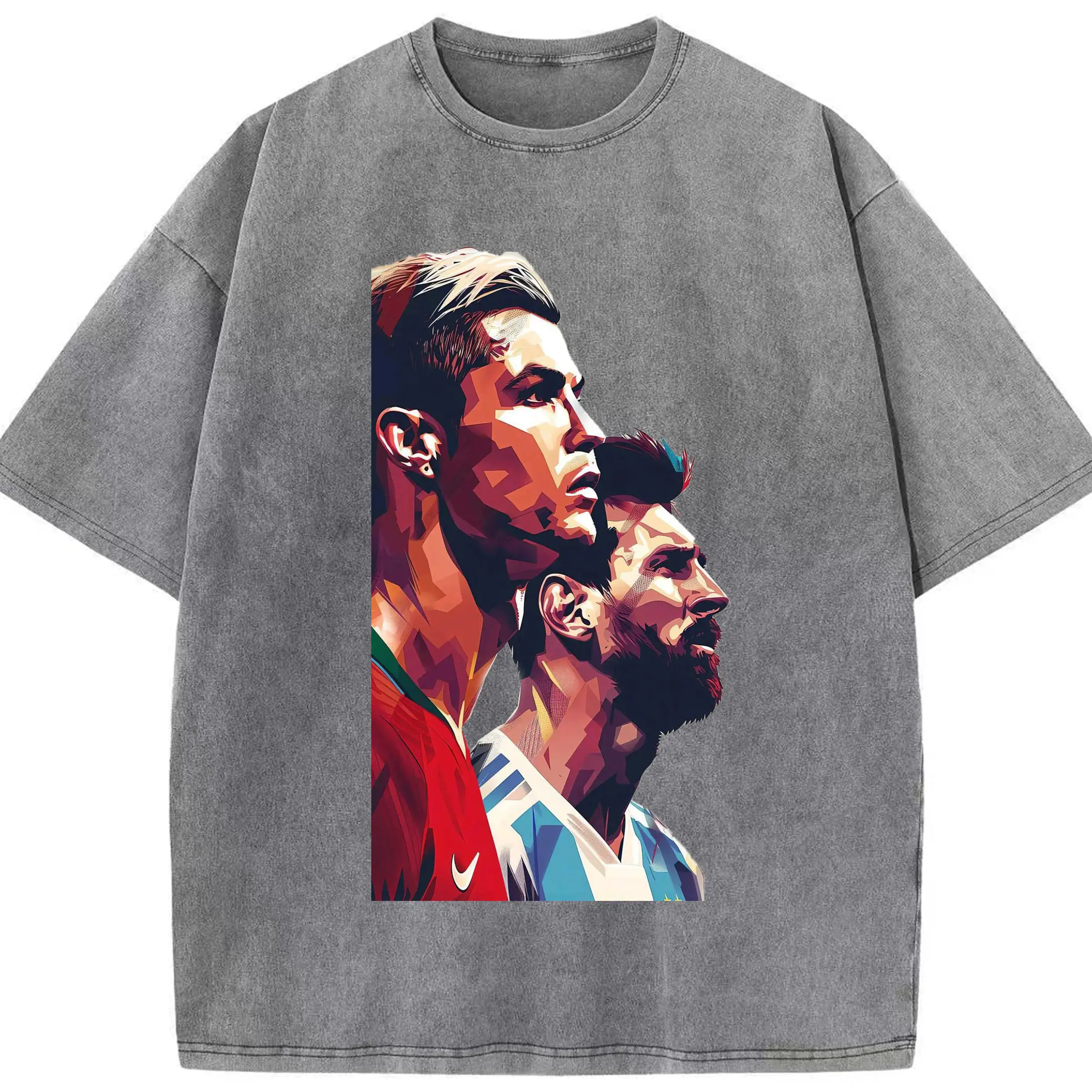 Lionel Messi & Cristiano Ronaldo Soccer Legends Art DIY Shirt - Washed Vintage Look 230g Cotton Oversized T-Shirt With Front Heat Transfer Print – Soft, Lightweight, Stylish Fit – Comfortable Casual Wear For Sports & Everyday Use