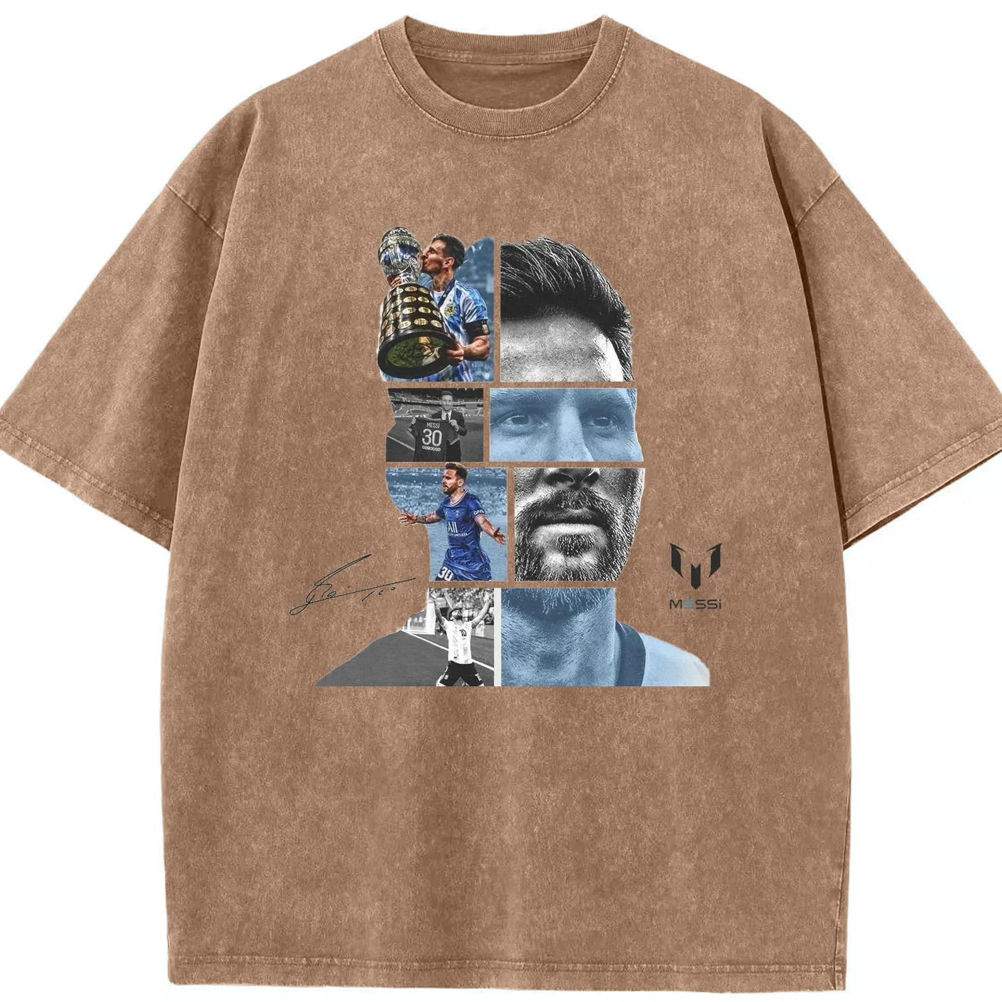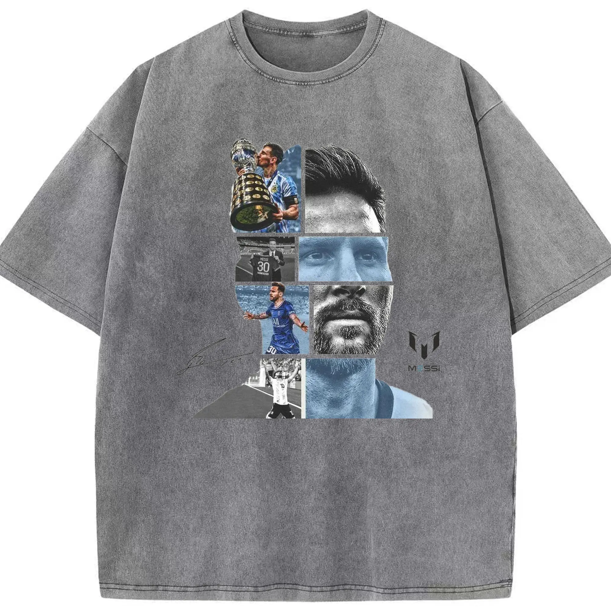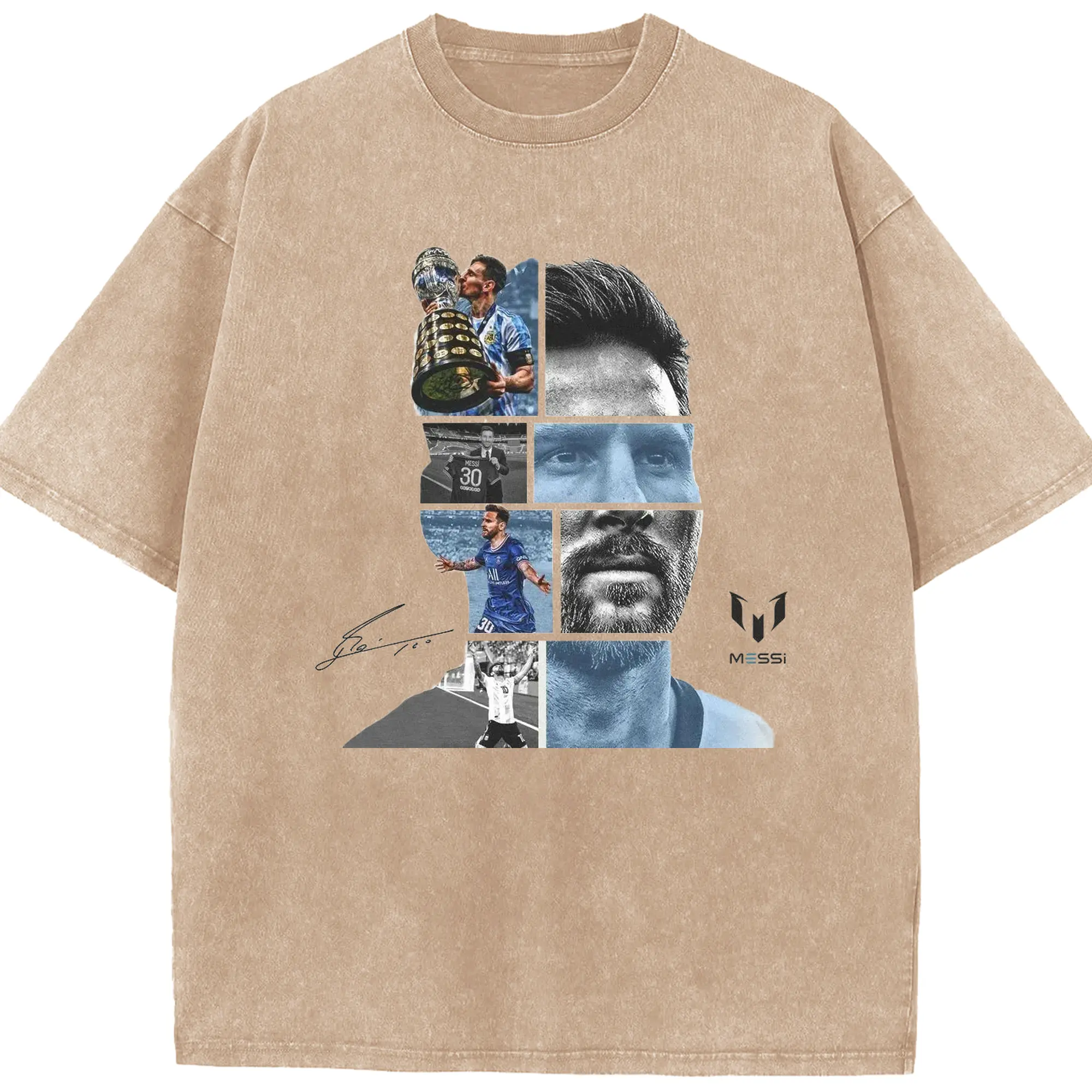 Lionel Messi Soccer Legend Collage DIY Shirt - Washed Vintage Look 230g Cotton Oversized T-Shirt With Front Heat Transfer Print – Soft, Lightweight, Stylish Fit – Comfortable Casual Wear For Sports & Everyday Use