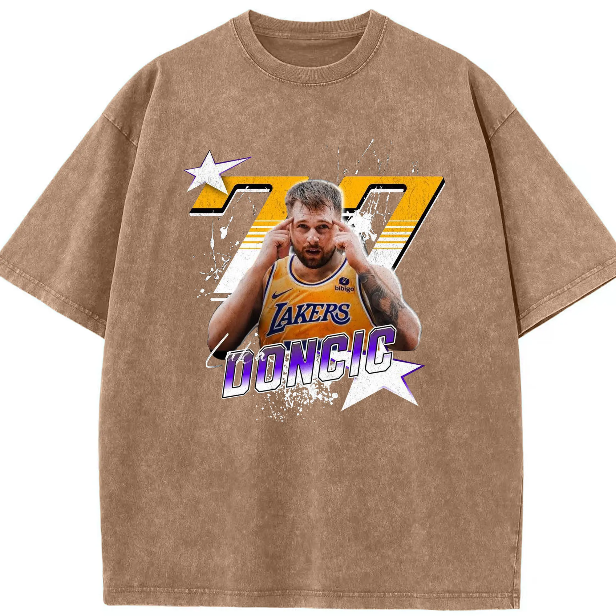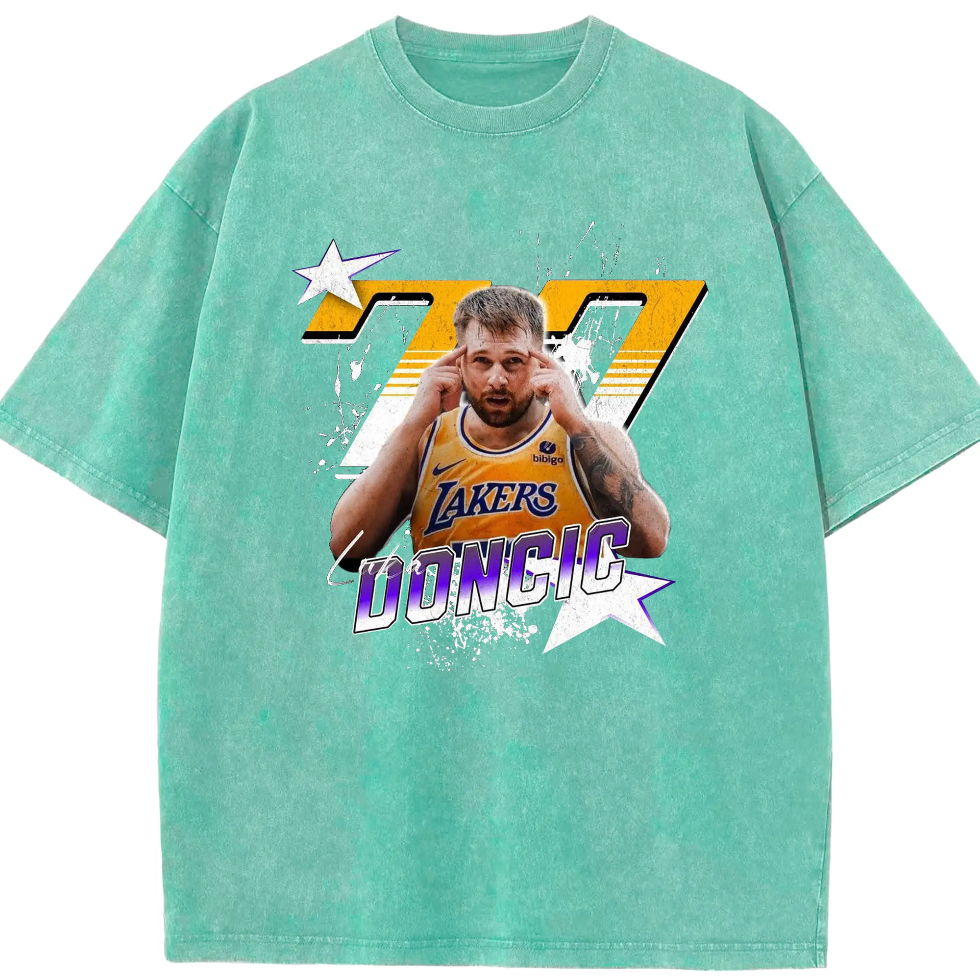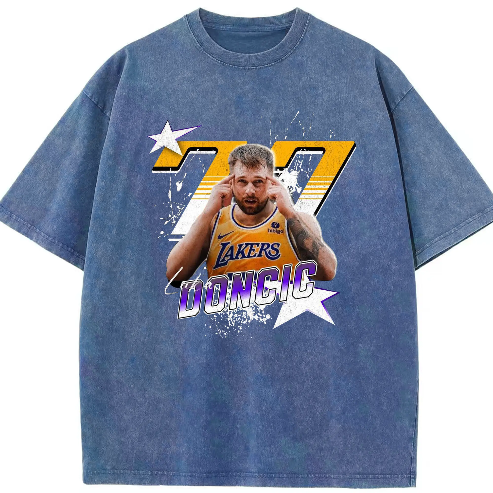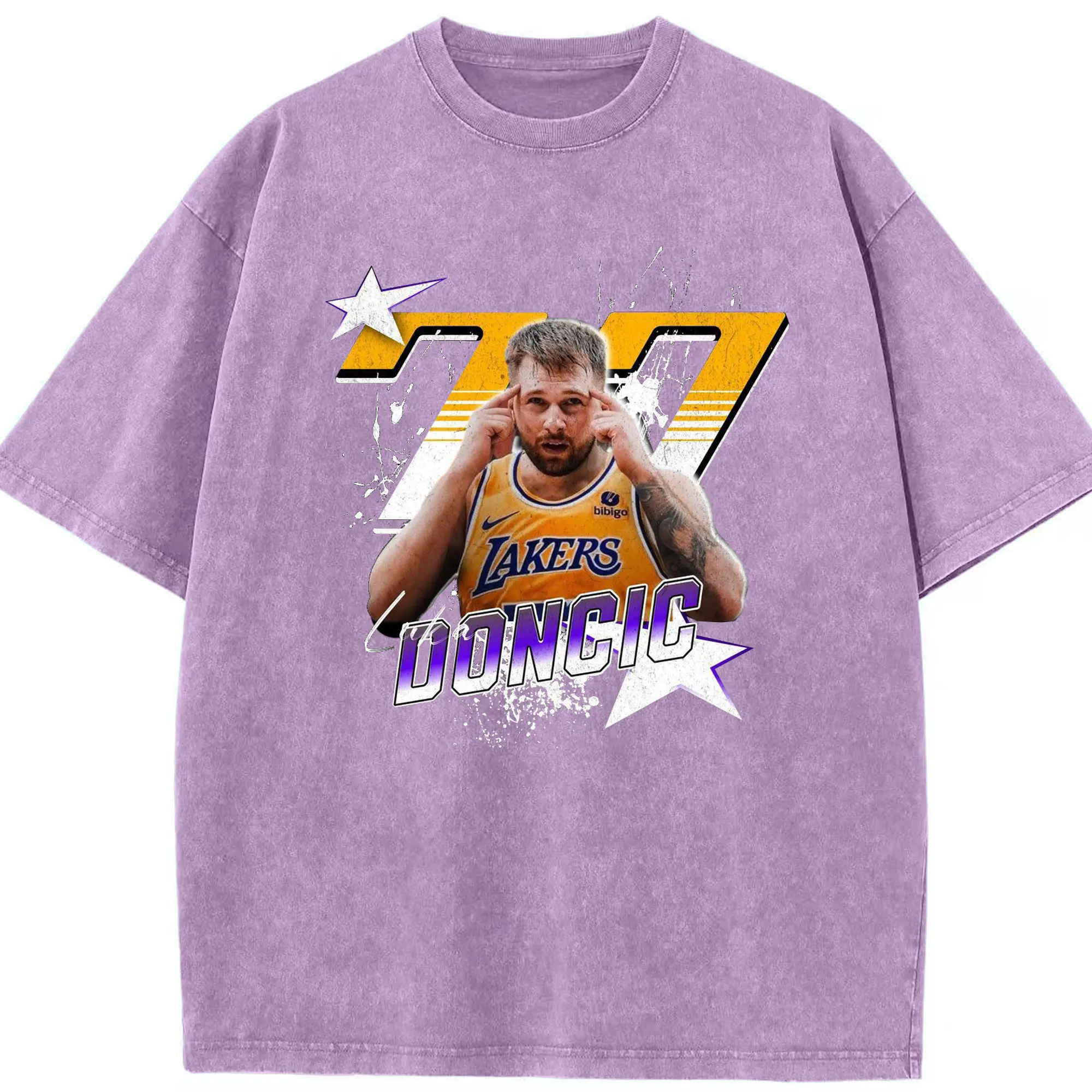 Luka Dončić 77 Uniting Luka’s Magic with LA Lakers Shirt - Washed Vintage Look 230g Cotton Oversized T-Shirt With Front Heat Transfer Print – Soft, Lightweight, Stylish Fit – Comfortable Casual Wear For Sports & Everyday Use