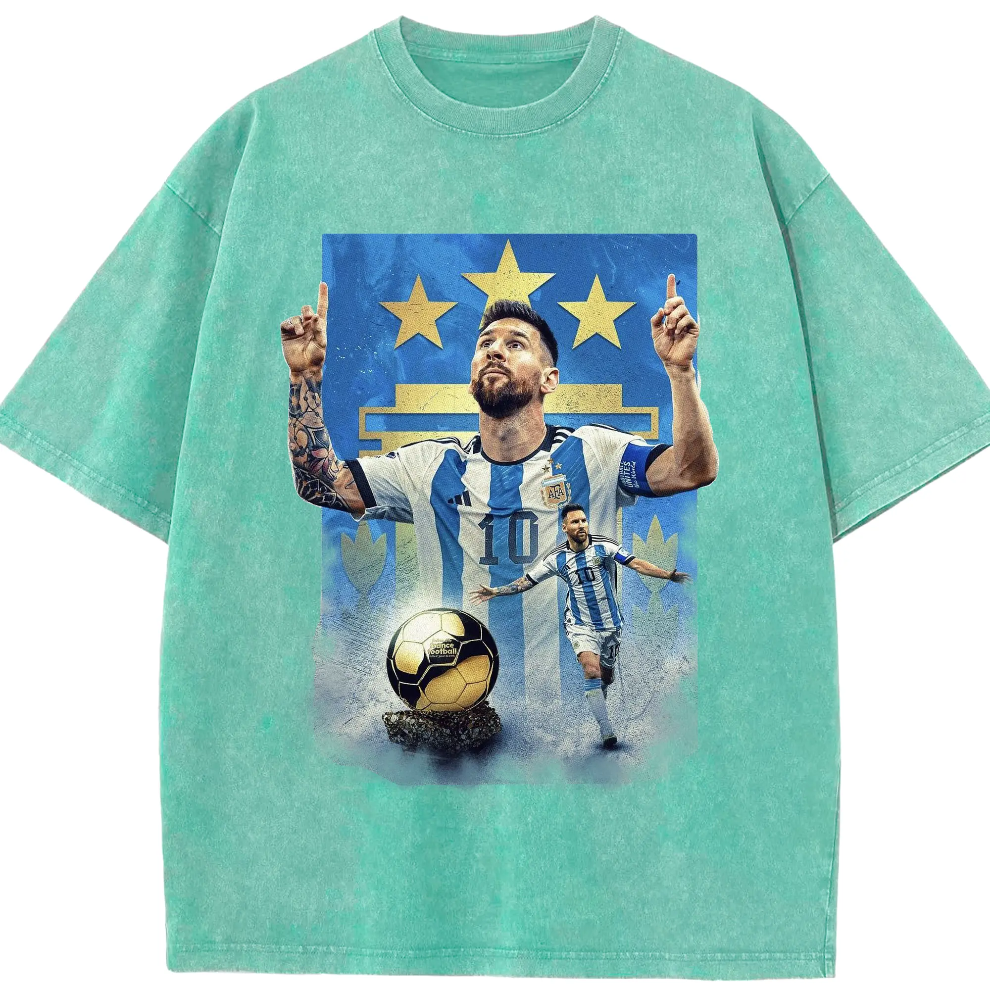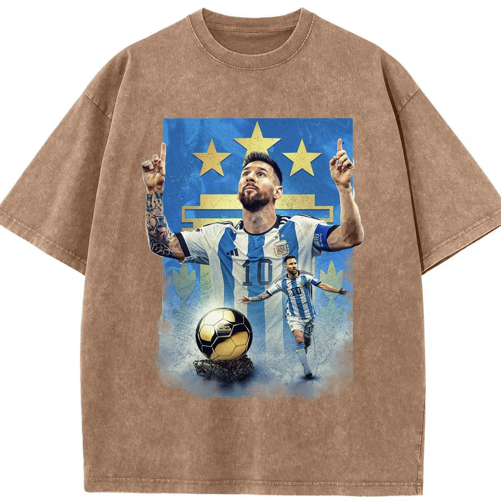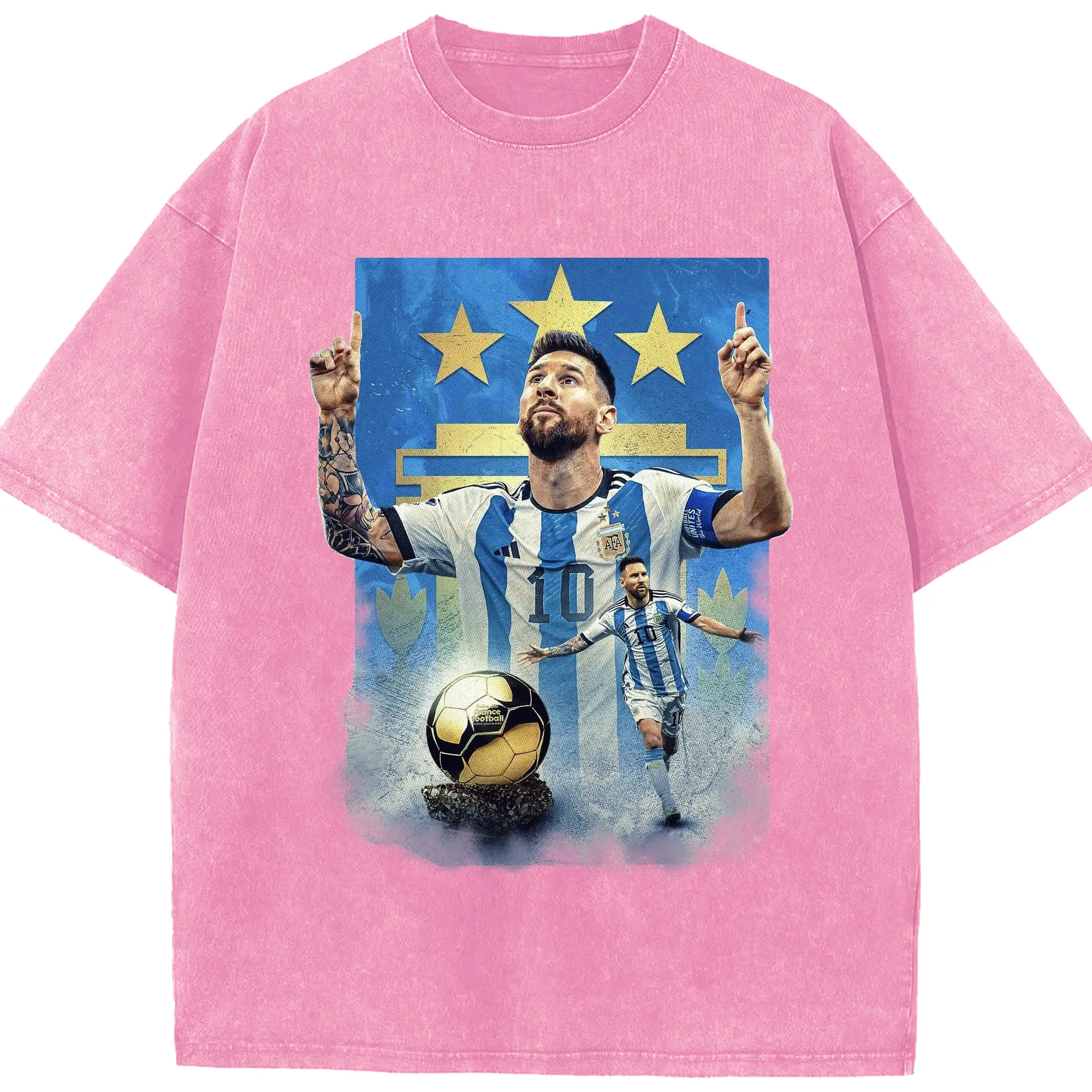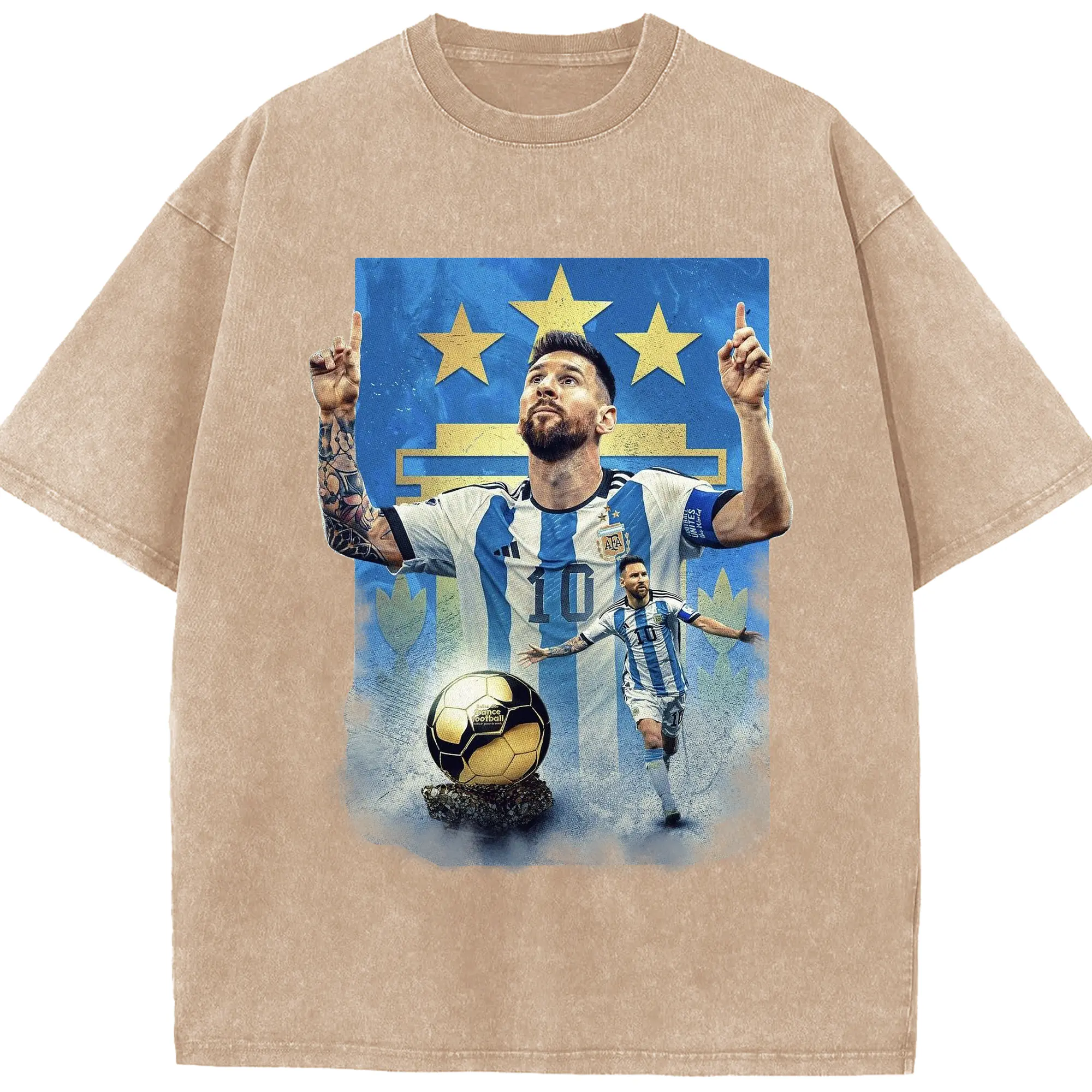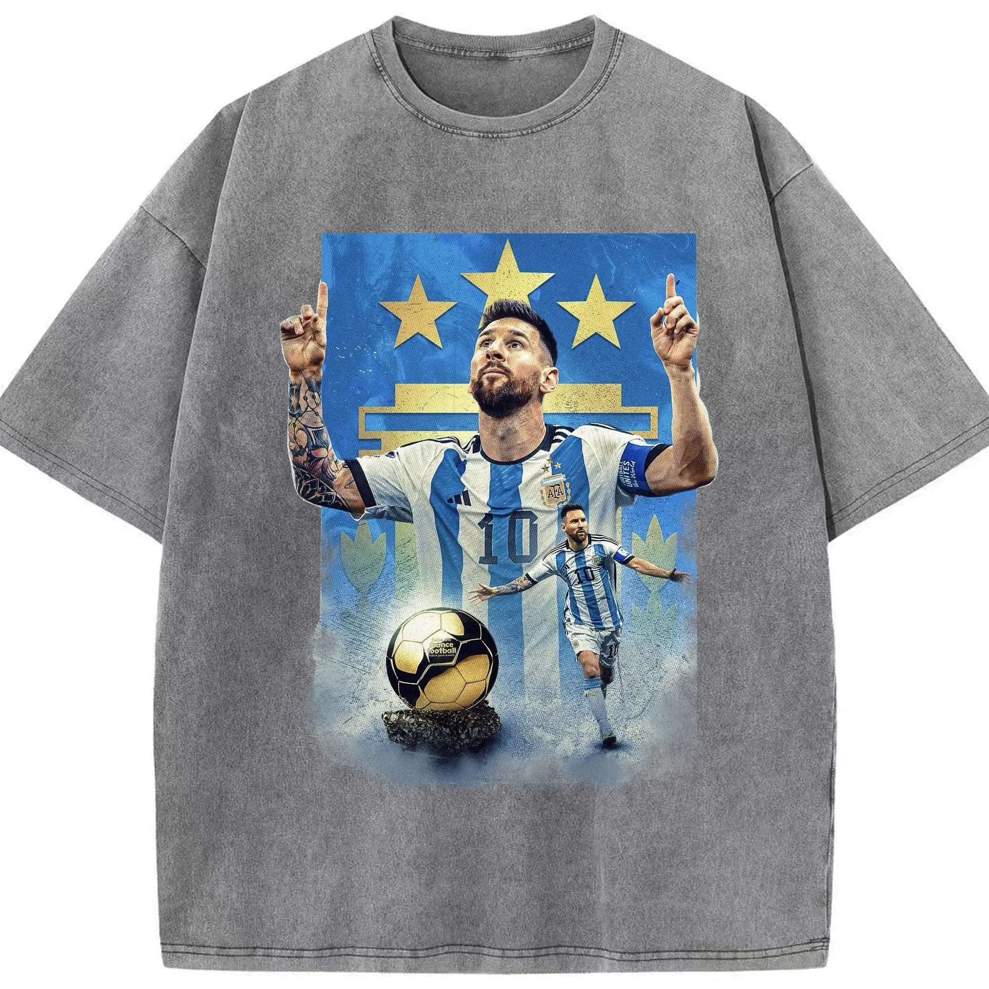 Messi Argentina #10 Golden Ball Champion DIY Shirt - Washed Vintage Look 230g Cotton Oversized T-Shirt With Front Heat Transfer Print – Soft, Lightweight, Stylish Fit – Comfortable Casual Wear For Sports & Everyday Use