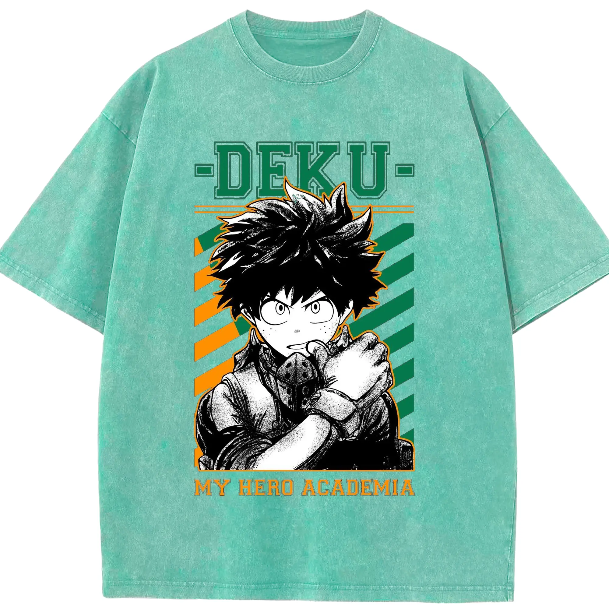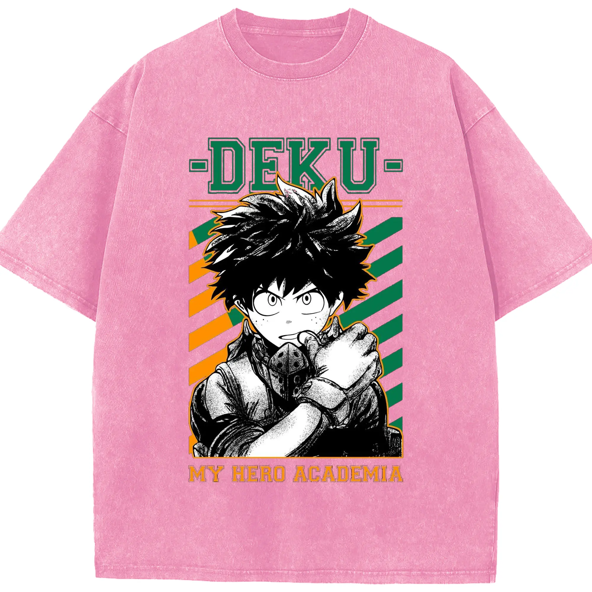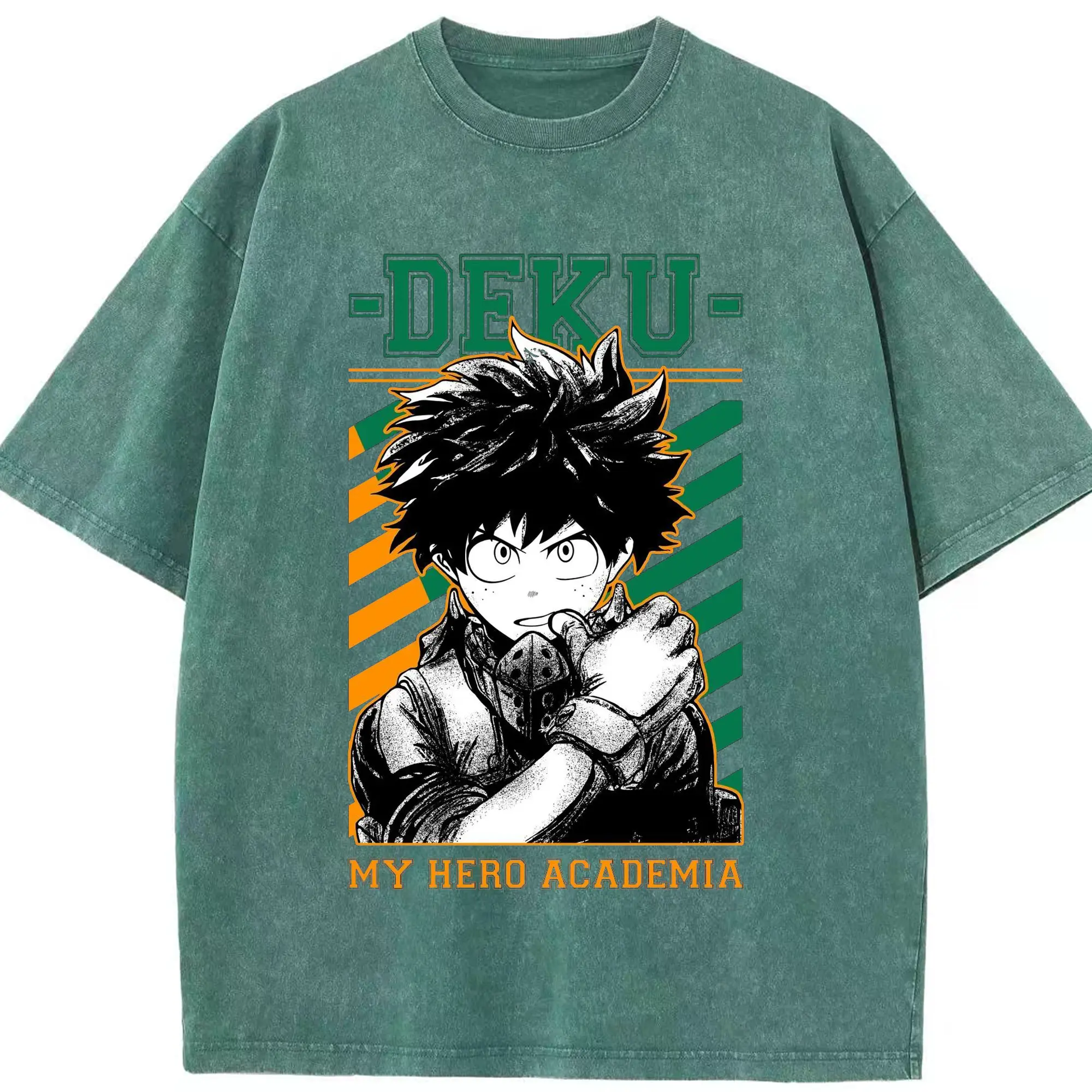 My Hero Academia Deku Retro Campus Style DIY - Washed Vintage Look 230g Cotton Oversized T-Shirt With Front Heat Transfer Print – Soft, Lightweight, Stylish Fit – Comfortable Casual Wear For Sports & Everyday Use