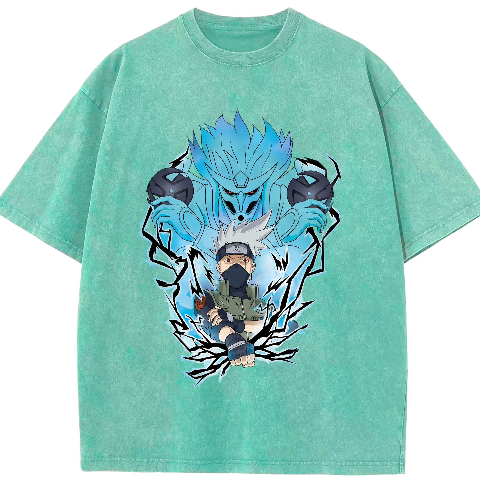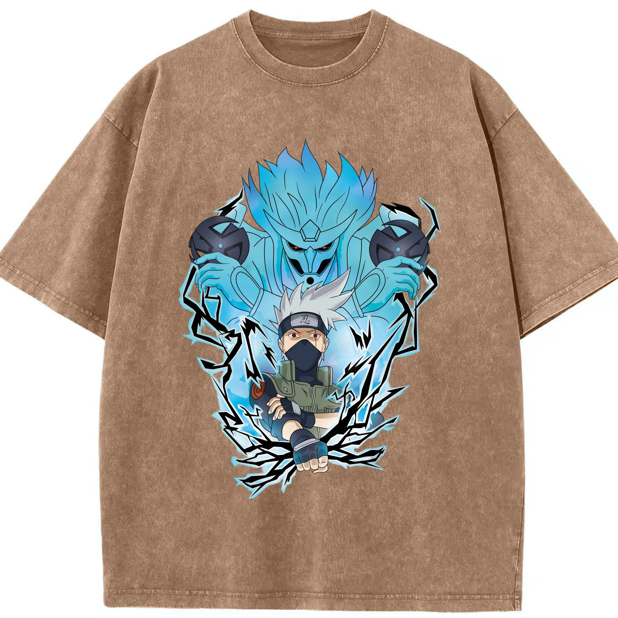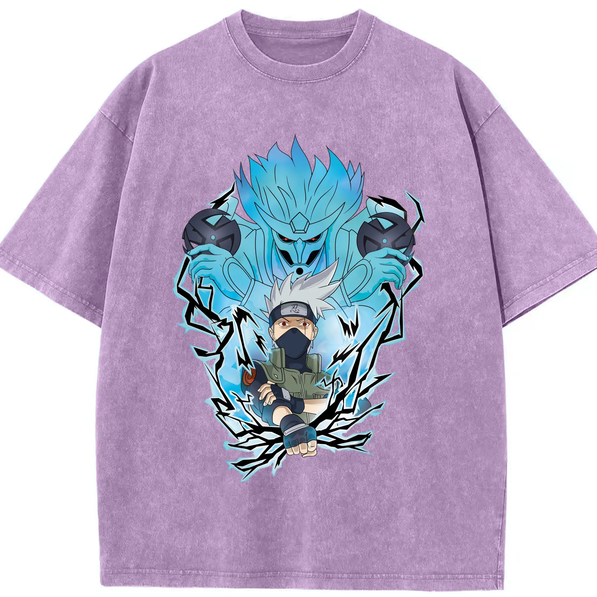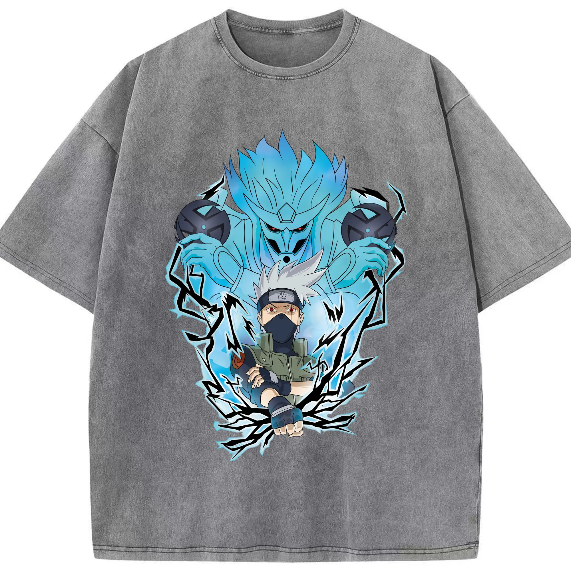 Naruto Kakashi Susanoo & Raikiri Anime DIY Shirt - Washed Vintage Look 230g Cotton Oversized T-Shirt With Front Heat Transfer Print – Soft, Lightweight, Stylish Fit – Comfortable Casual Wear For Sports & Everyday Use