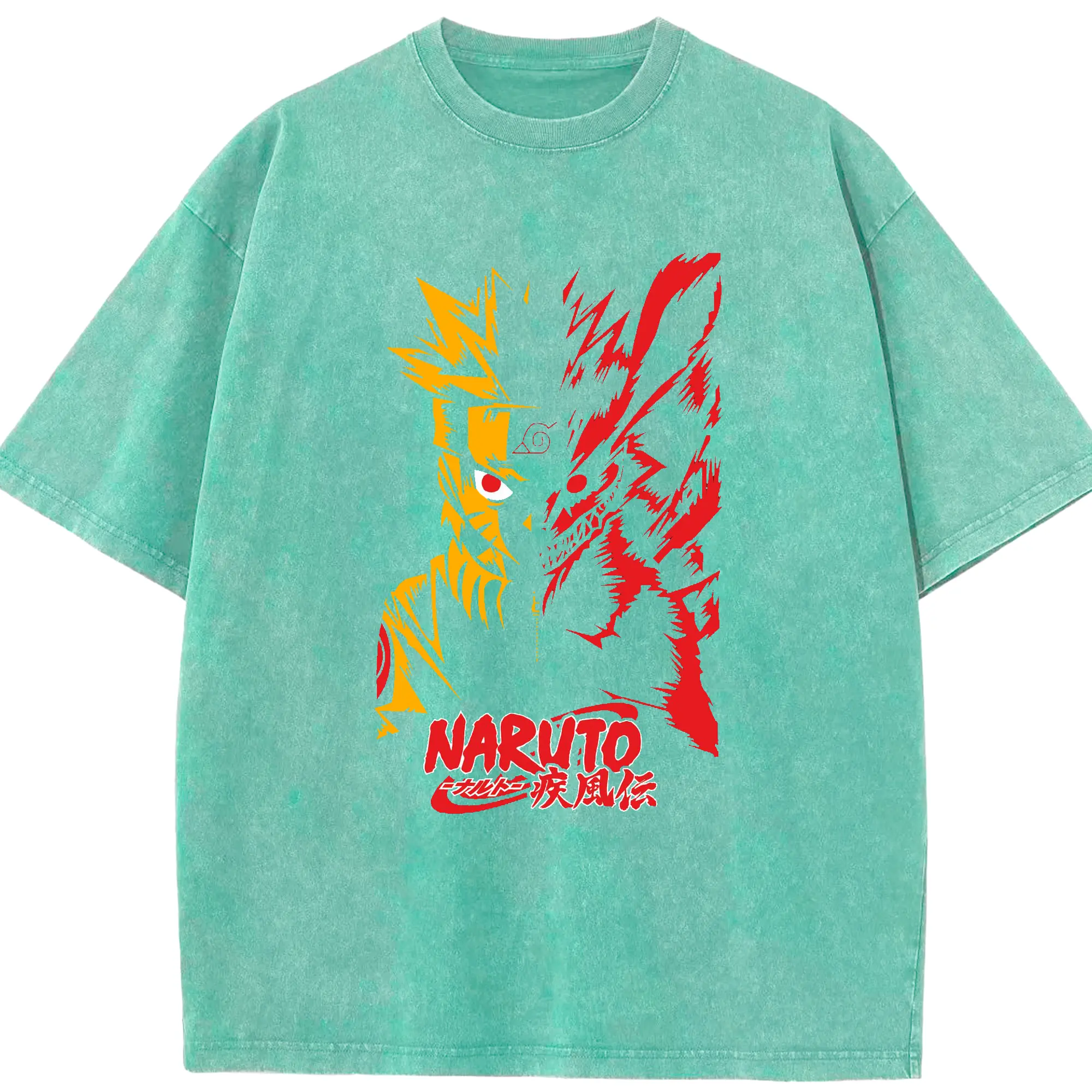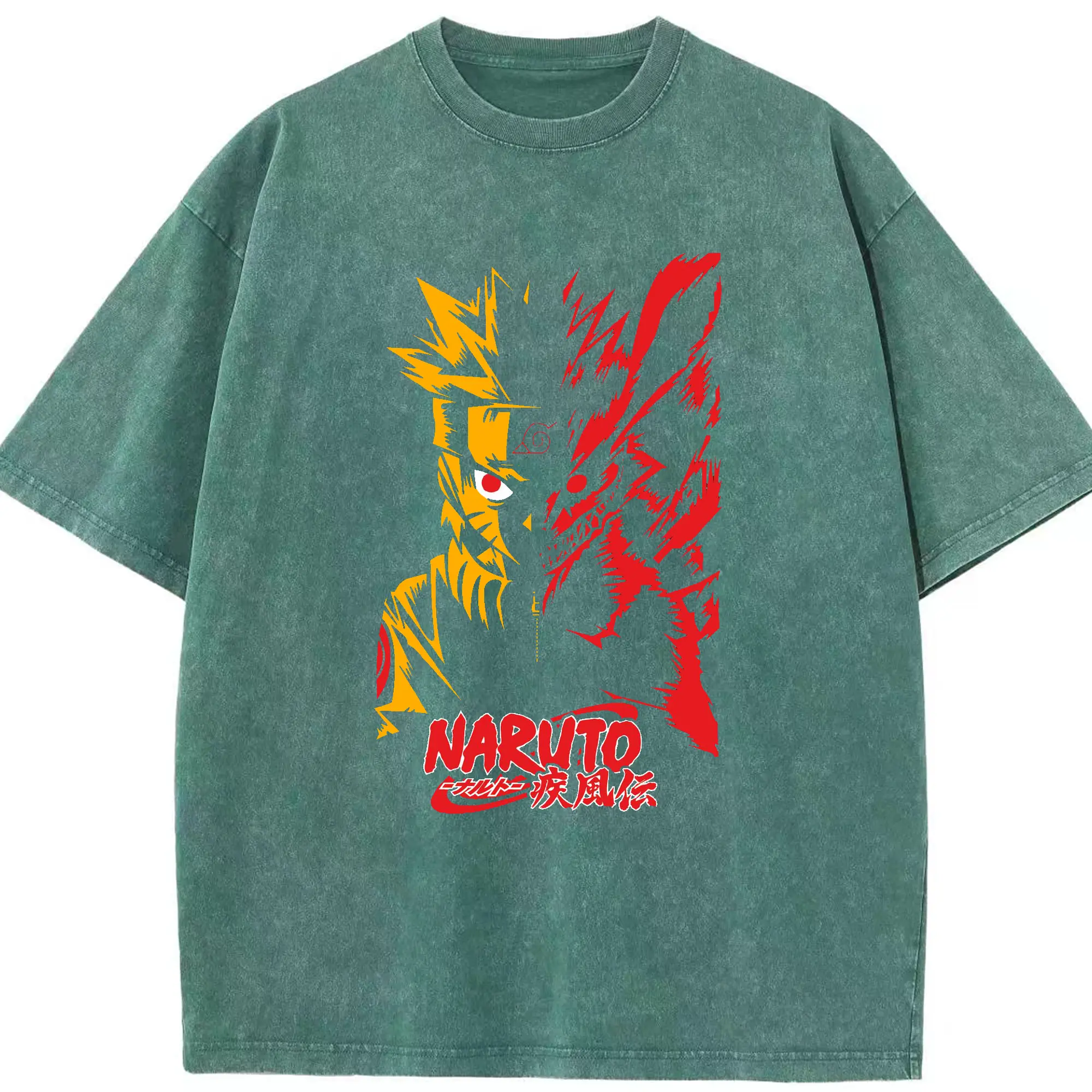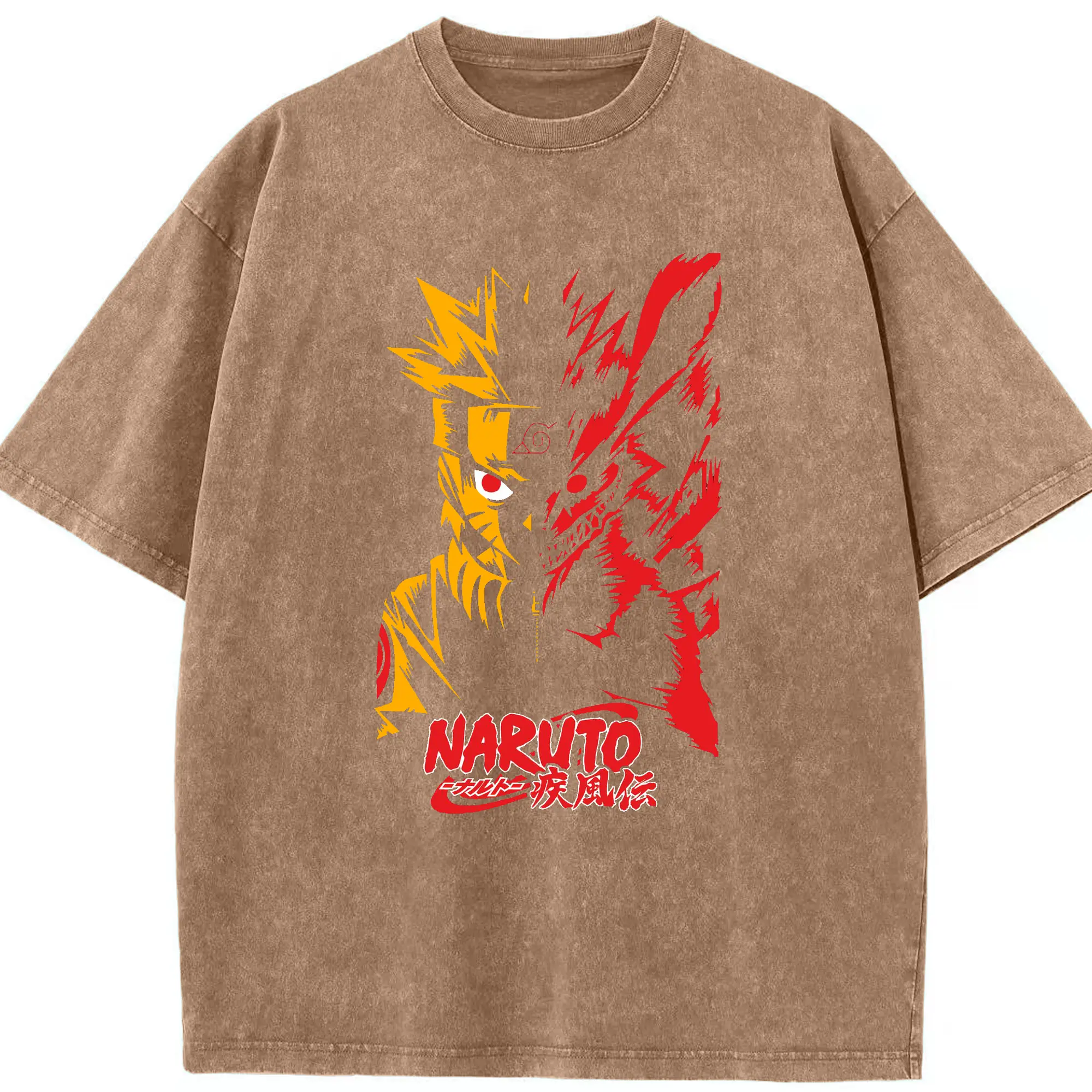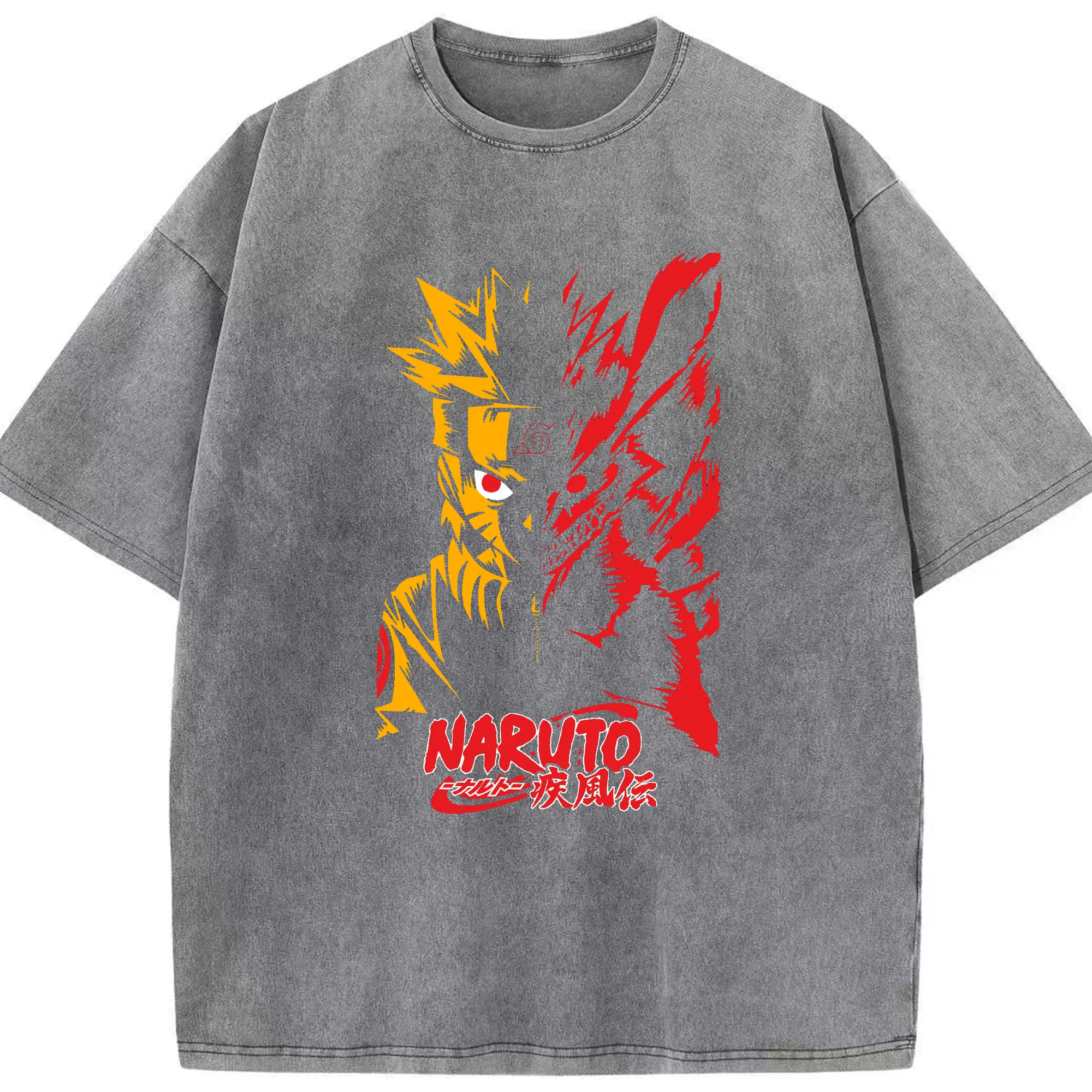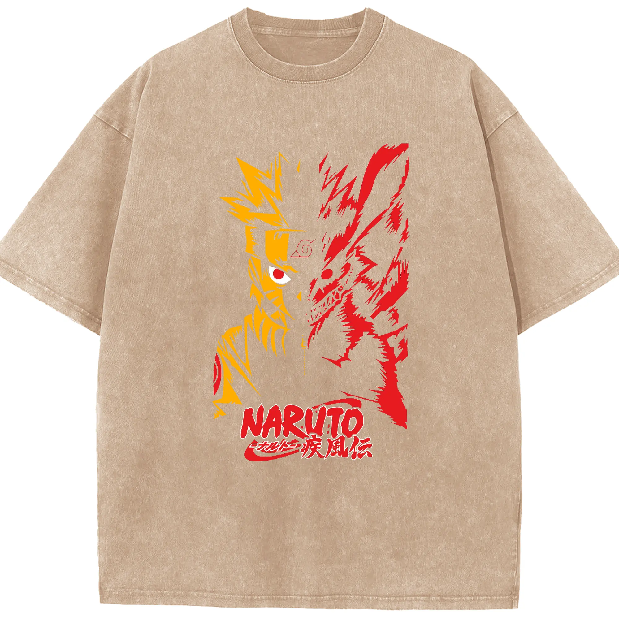 Naruto & Kurama Fusion Anime DIY Shirt - Washed Vintage Look 230g Cotton Oversized T-Shirt With Front Heat Transfer Print – Soft, Lightweight, Stylish Fit – Comfortable Casual Wear For Sports & Everyday Use