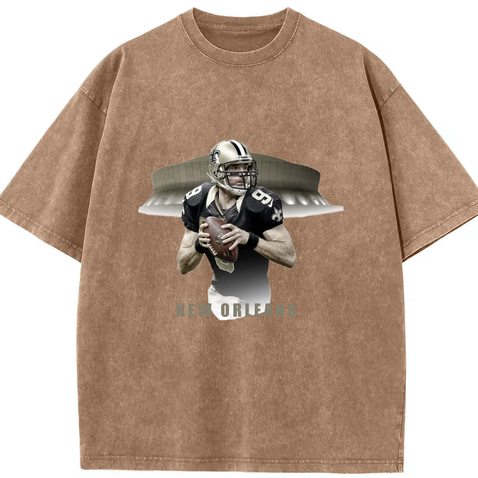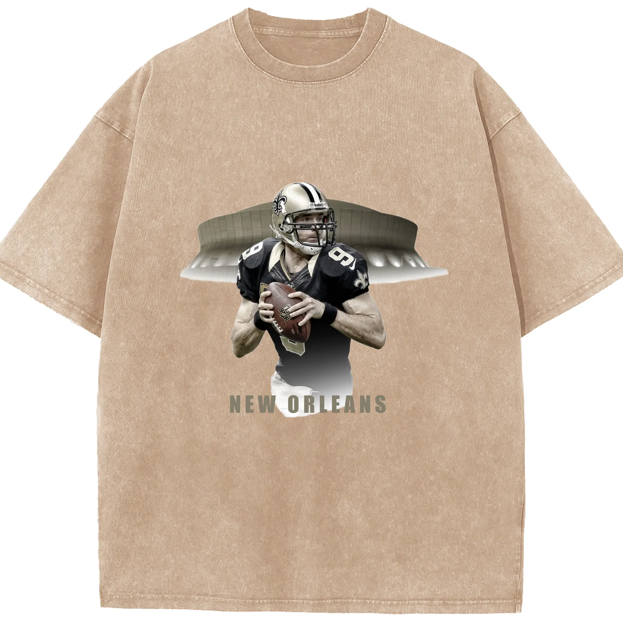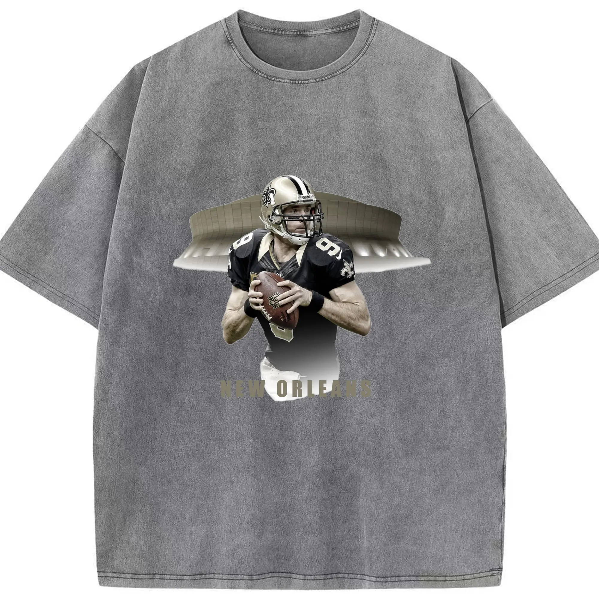 New Orleans Saints Drew Brees #9 NFL Star with Stadium DIY Shirt - Washed Vintage Look 230g Cotton Oversized T-Shirt With Front Heat Transfer Print – Soft, Lightweight, Stylish Fit – Comfortable Casual Wear For Sports & Everyday Use