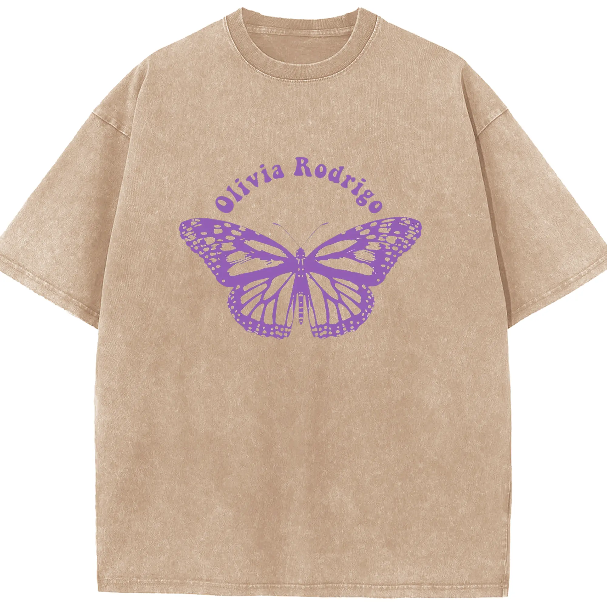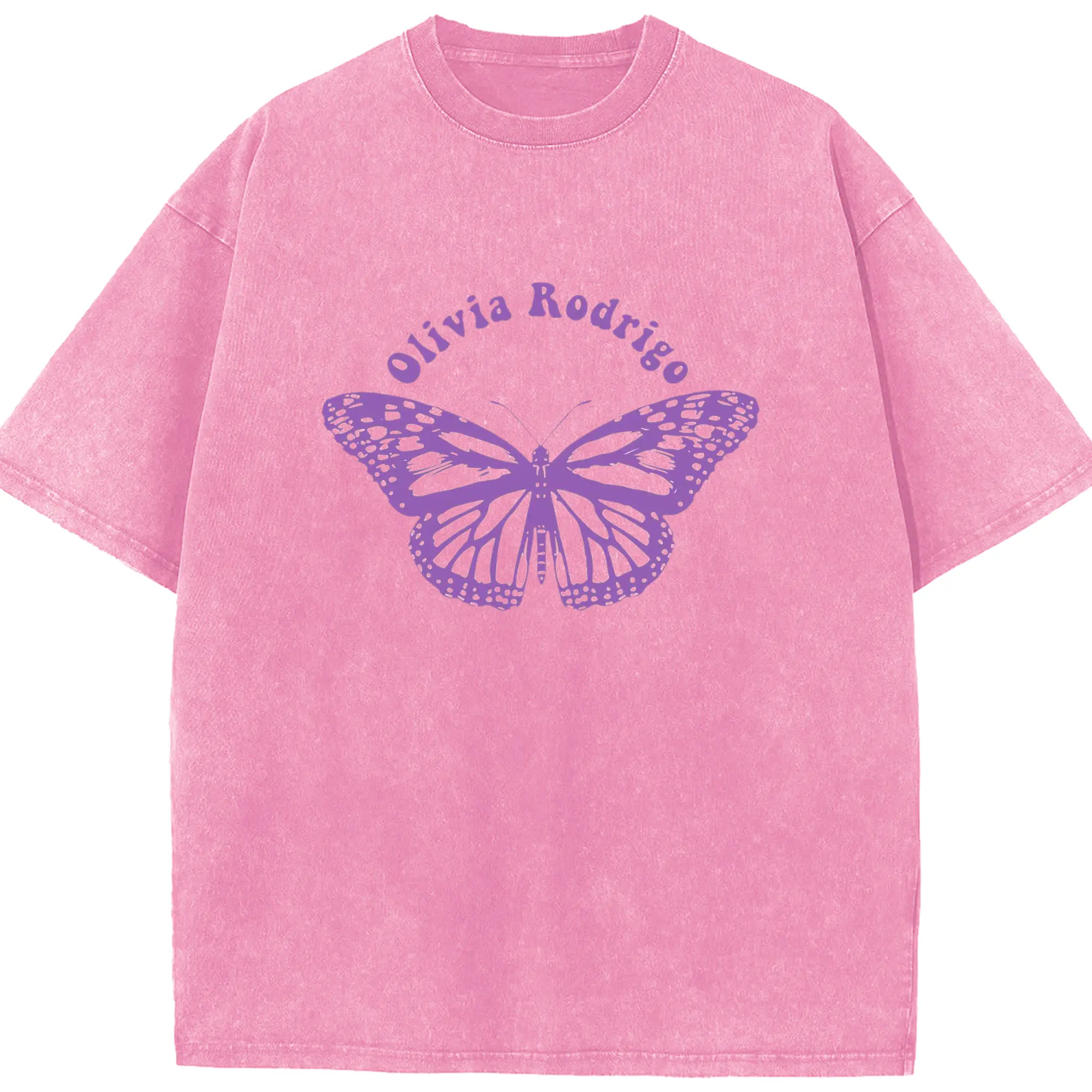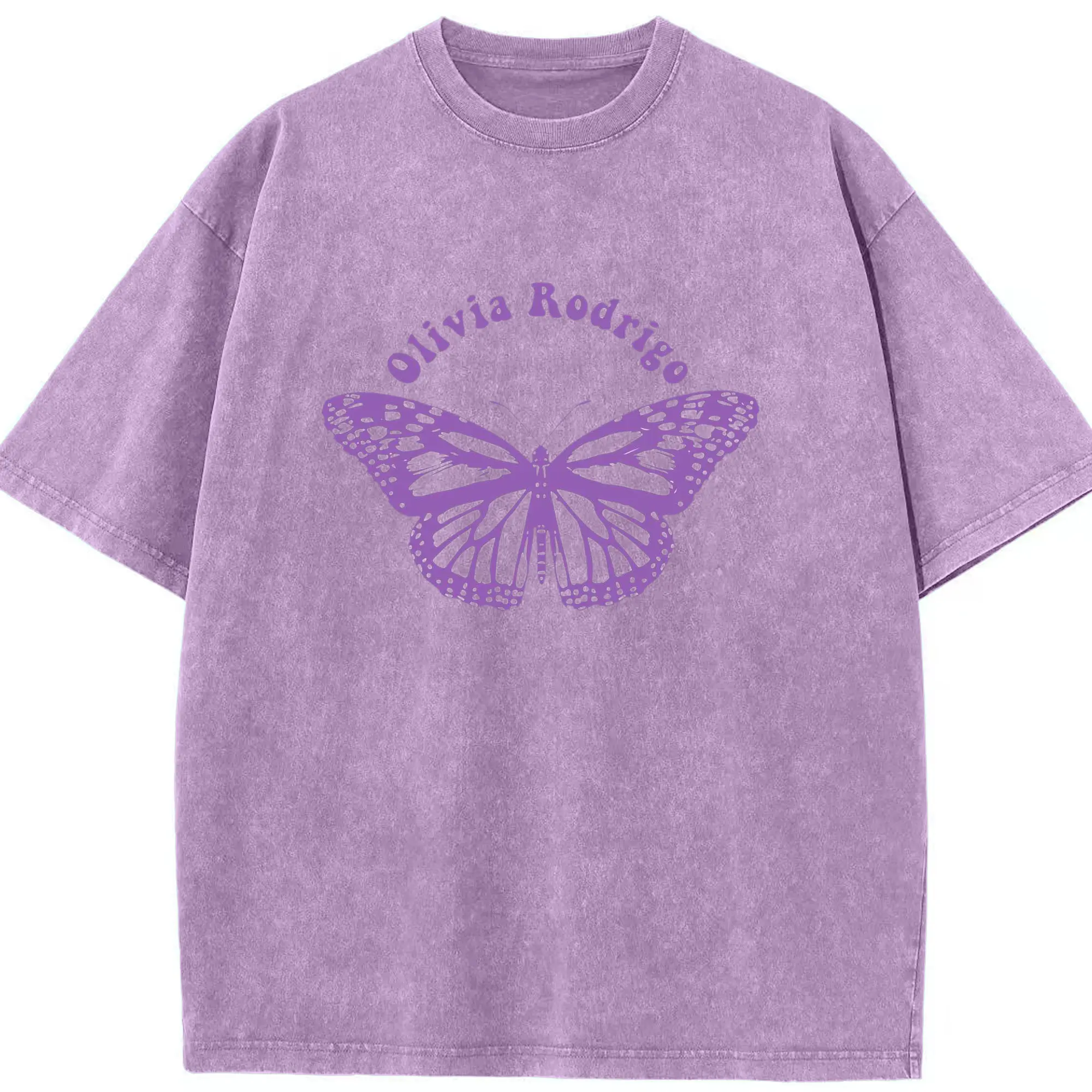 Olivia Rodrigo Purple Butterfly DIY - Washed Vintage Look 230g Cotton Oversized T-Shirt With Front Heat Transfer Print – Soft, Lightweight, Stylish Fit – Comfortable Casual Wear For Sports & Everyday Use