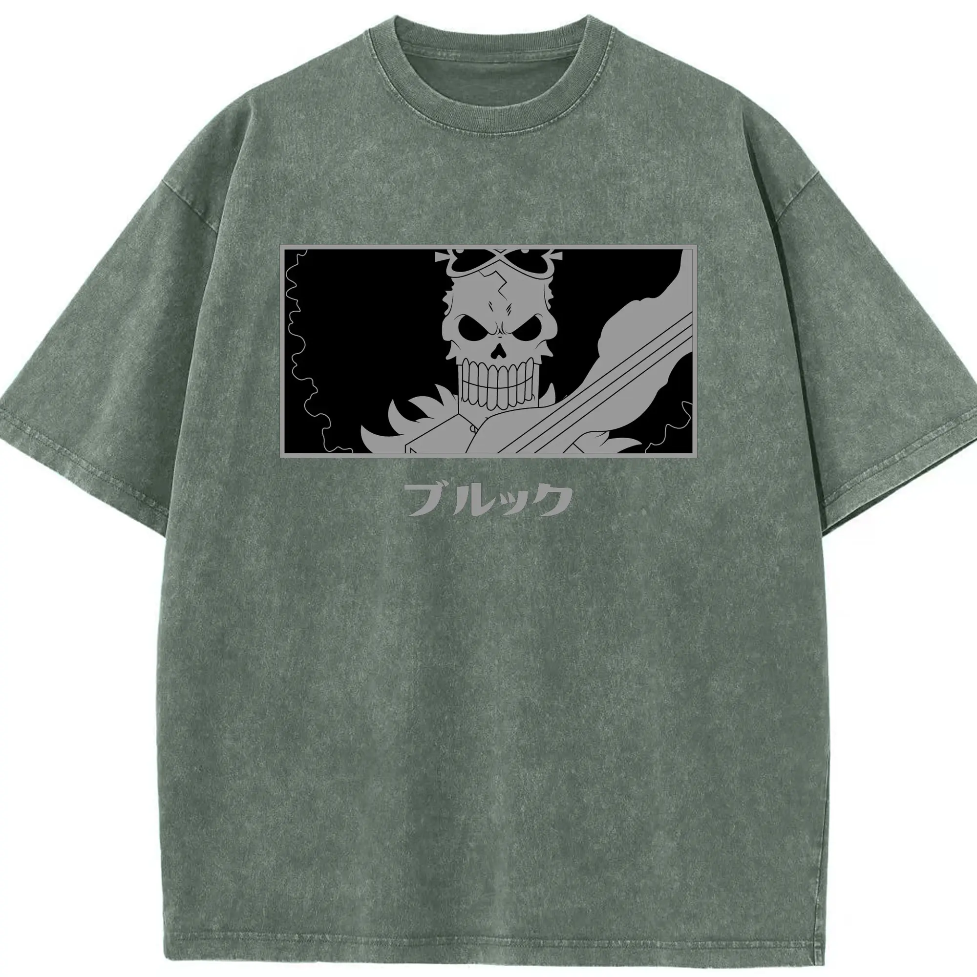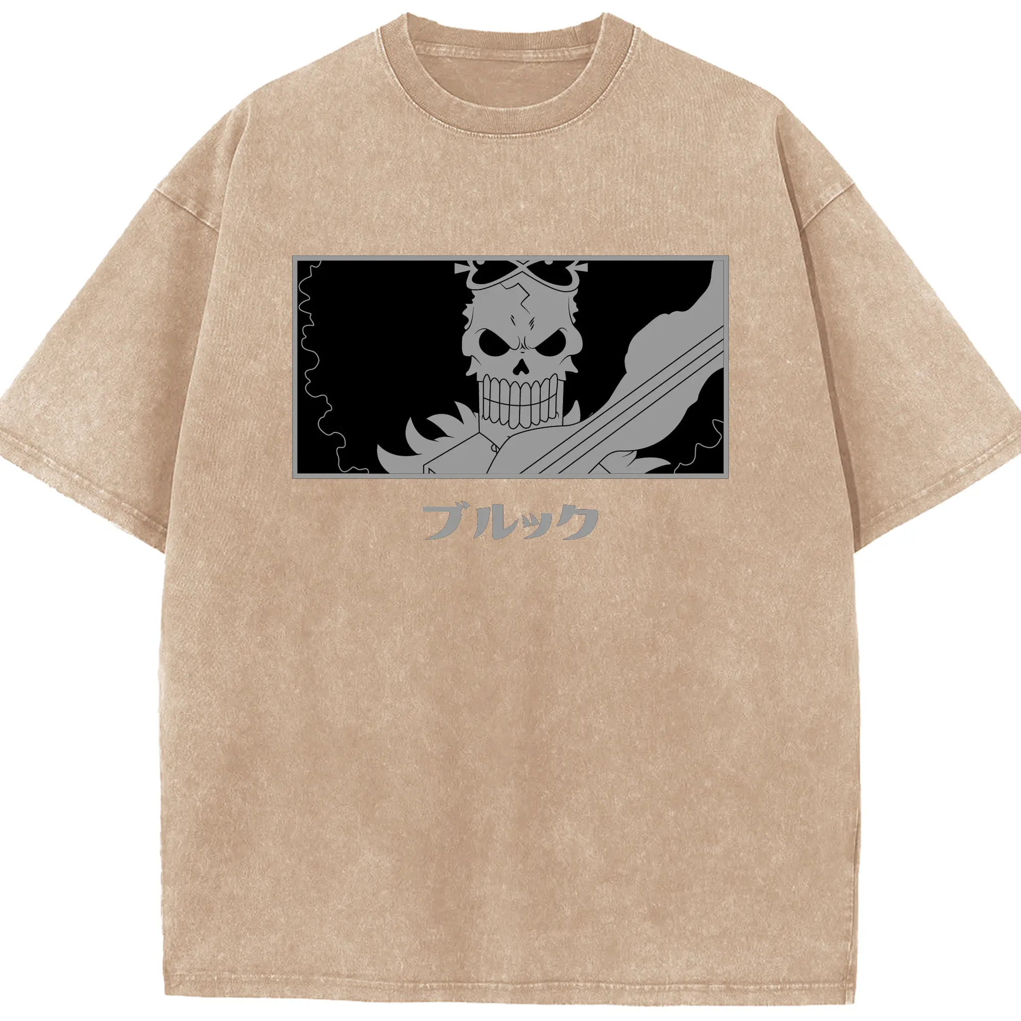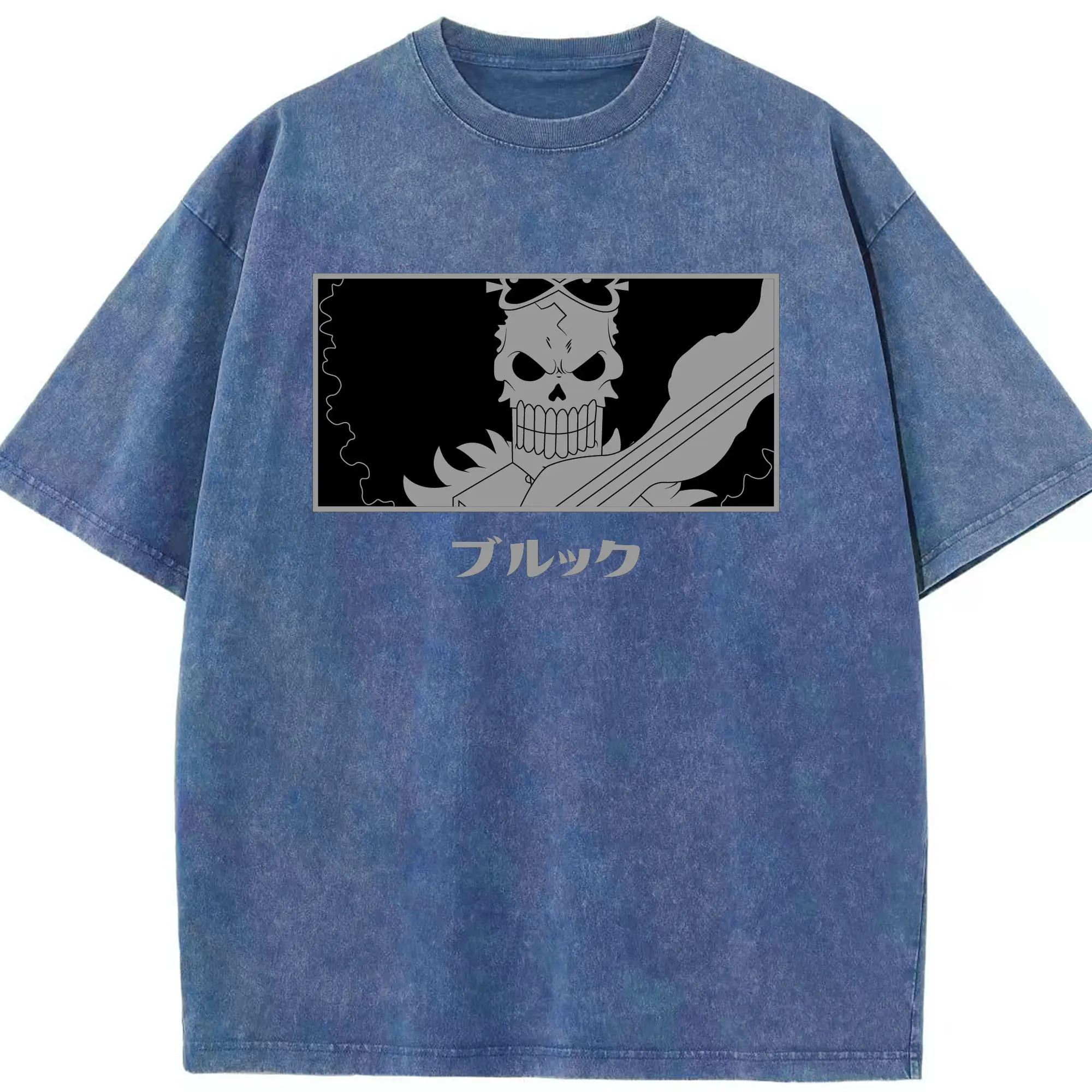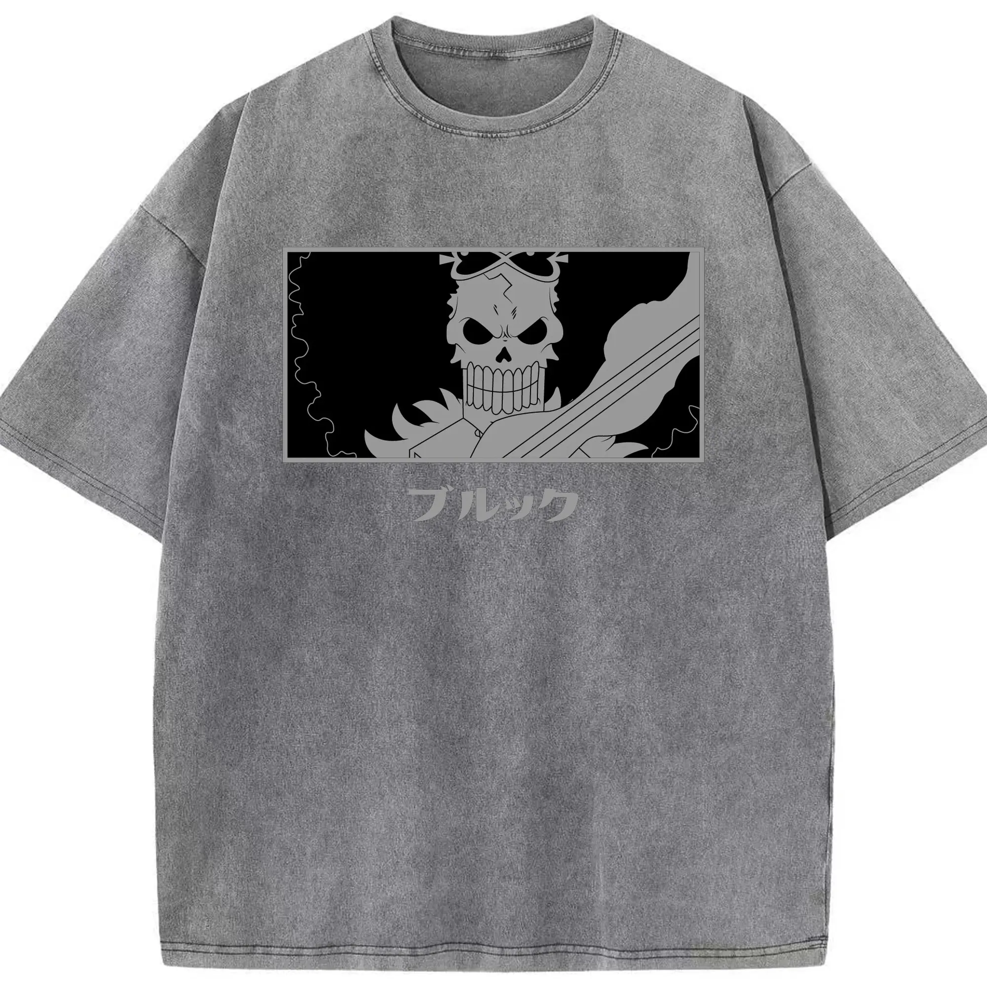 One Piece Brook Monochrome Skull Anime DIY Shirt - Washed Vintage Look 230g Cotton Oversized T-Shirt With Front Heat Transfer Print – Soft, Lightweight, Stylish Fit – Comfortable Casual Wear For Sports & Everyday Use