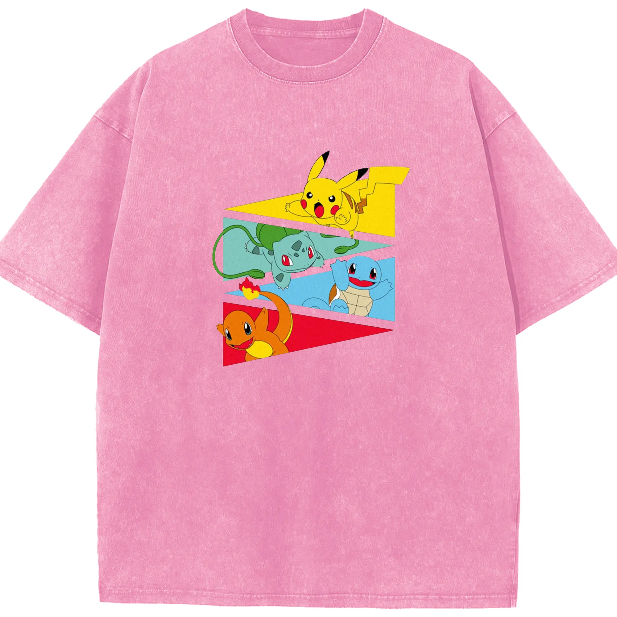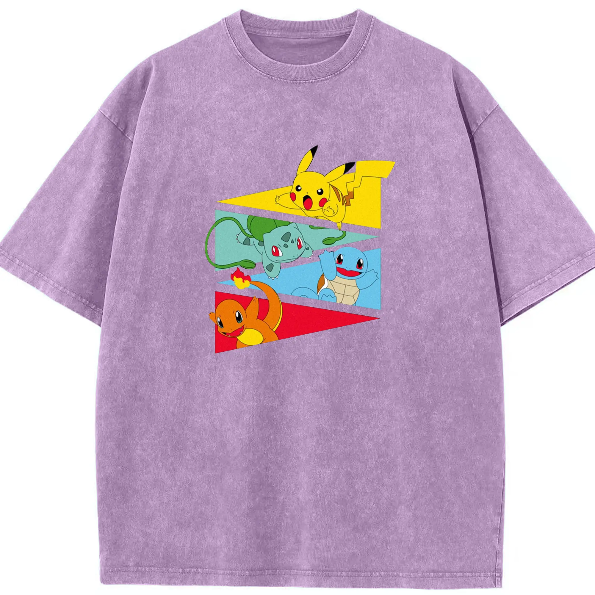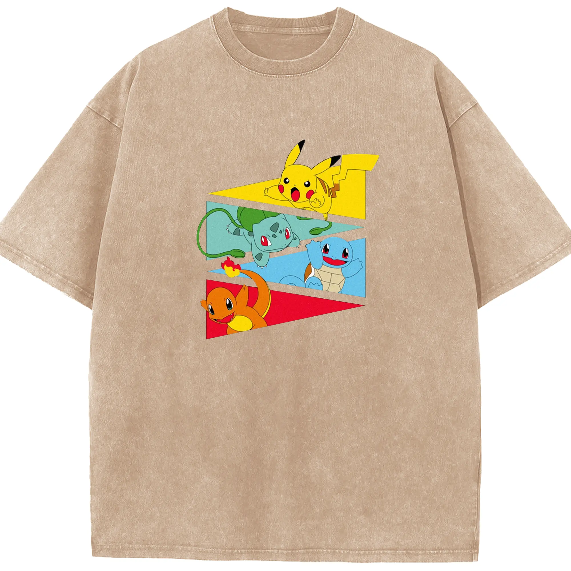 Pokémon Pikachu & Starters Color Block DIY - Washed Vintage Look 230g Cotton Oversized T-Shirt With Front Heat Transfer Print – Soft, Lightweight, Stylish Fit – Comfortable Casual Wear For Sports & Everyday Use