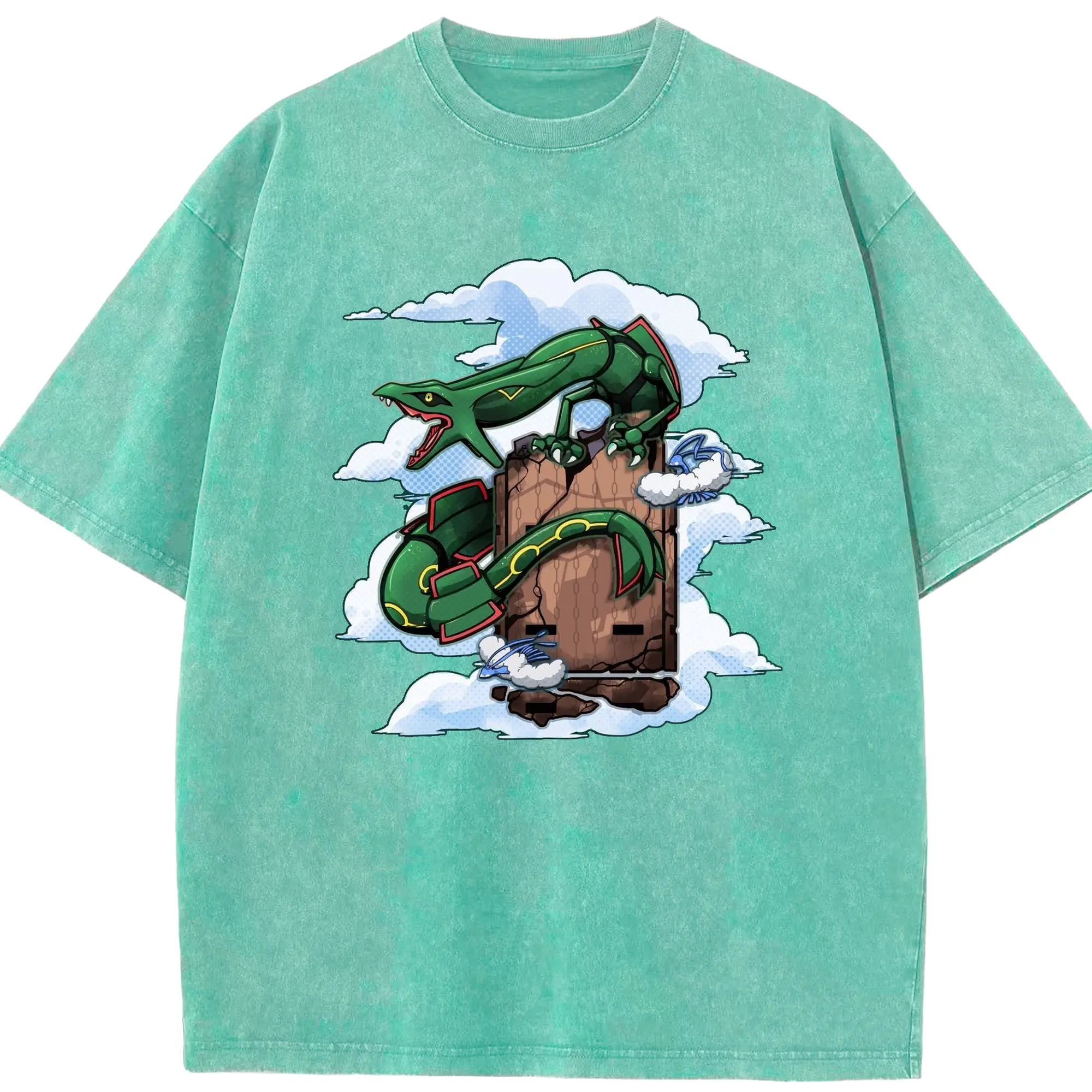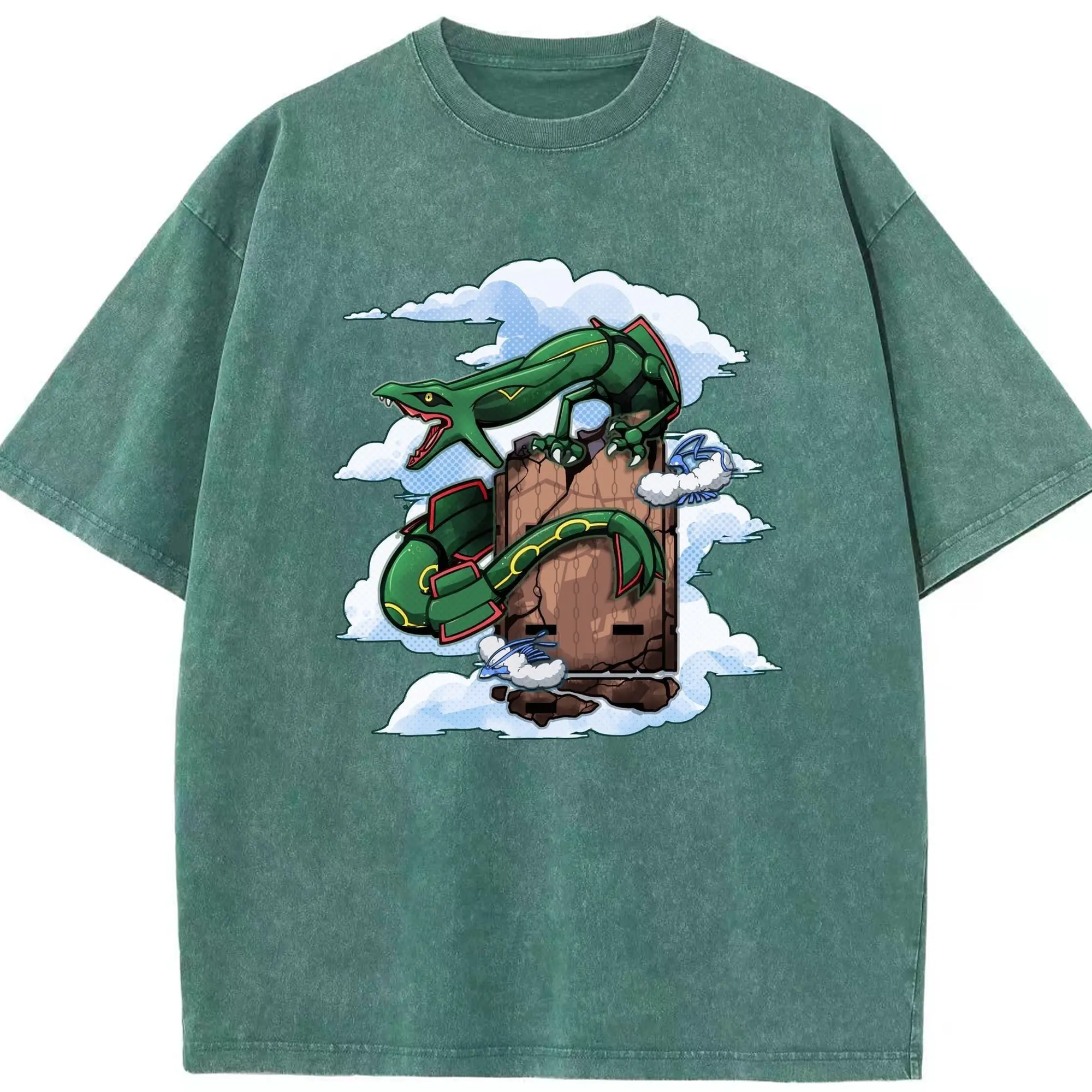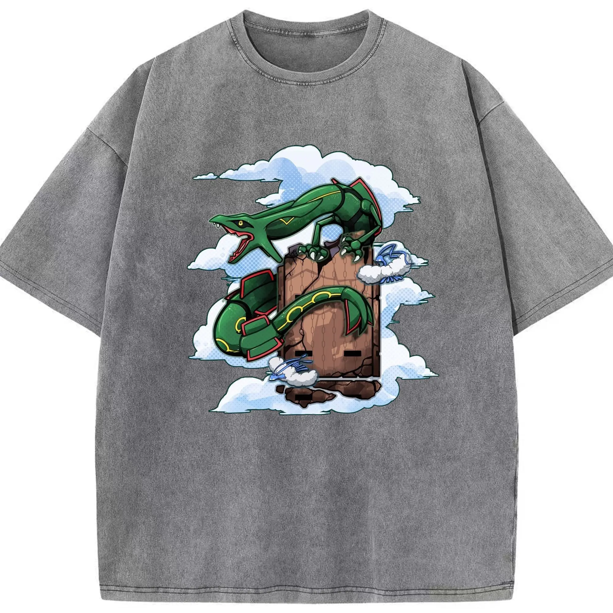 Pokémon Rayquaza Legendary Sky Dragon DIY - Washed Vintage Look 230g Cotton Oversized T-Shirt With Front Heat Transfer Print – Soft, Lightweight, Stylish Fit – Comfortable Casual Wear For Sports & Everyday Use