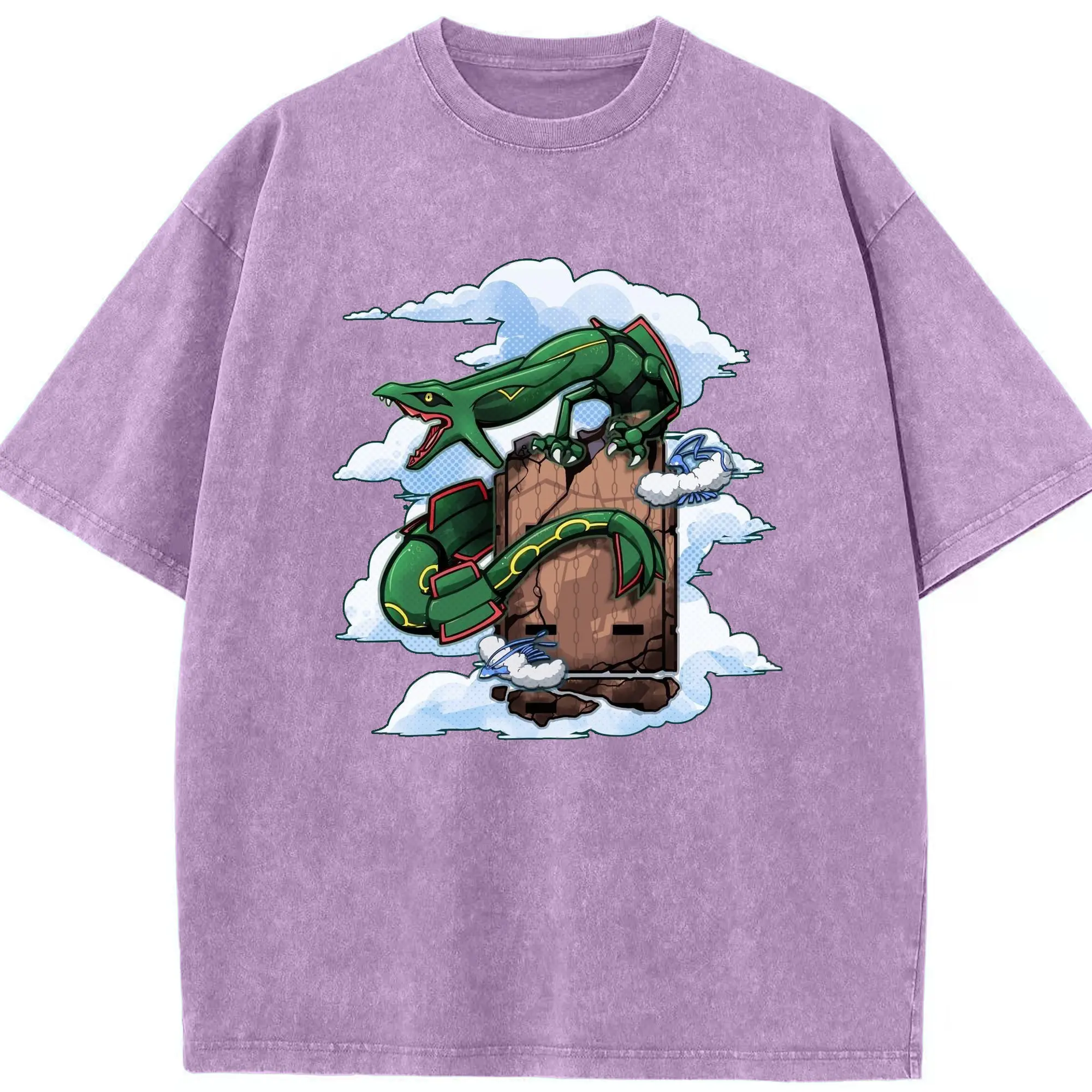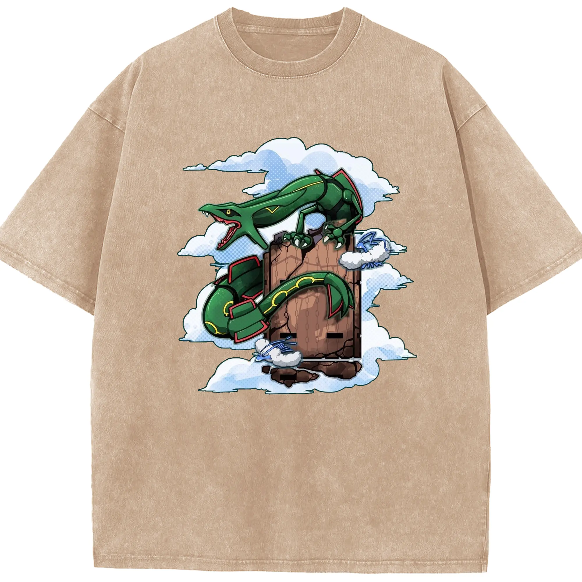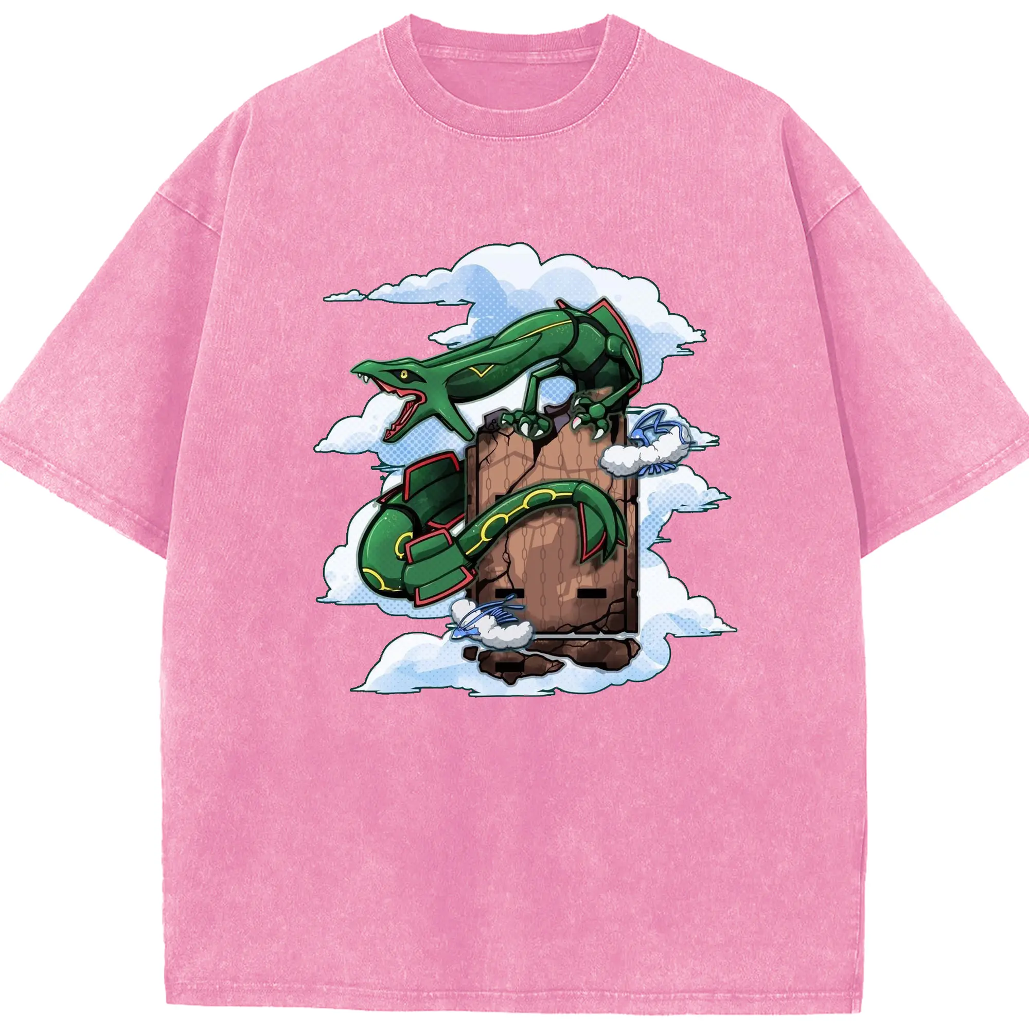 Pokémon Rayquaza Legendary Sky Dragon DIY - Washed Vintage Look 230g Cotton Oversized T-Shirt With Front Heat Transfer Print – Soft, Lightweight, Stylish Fit – Comfortable Casual Wear For Sports & Everyday Use