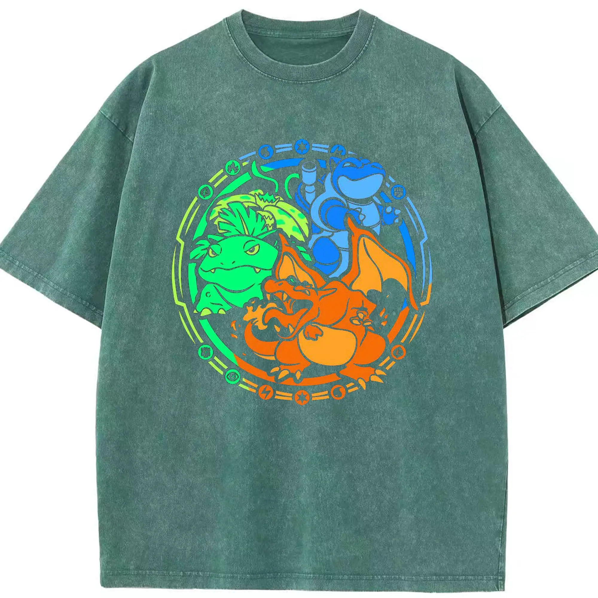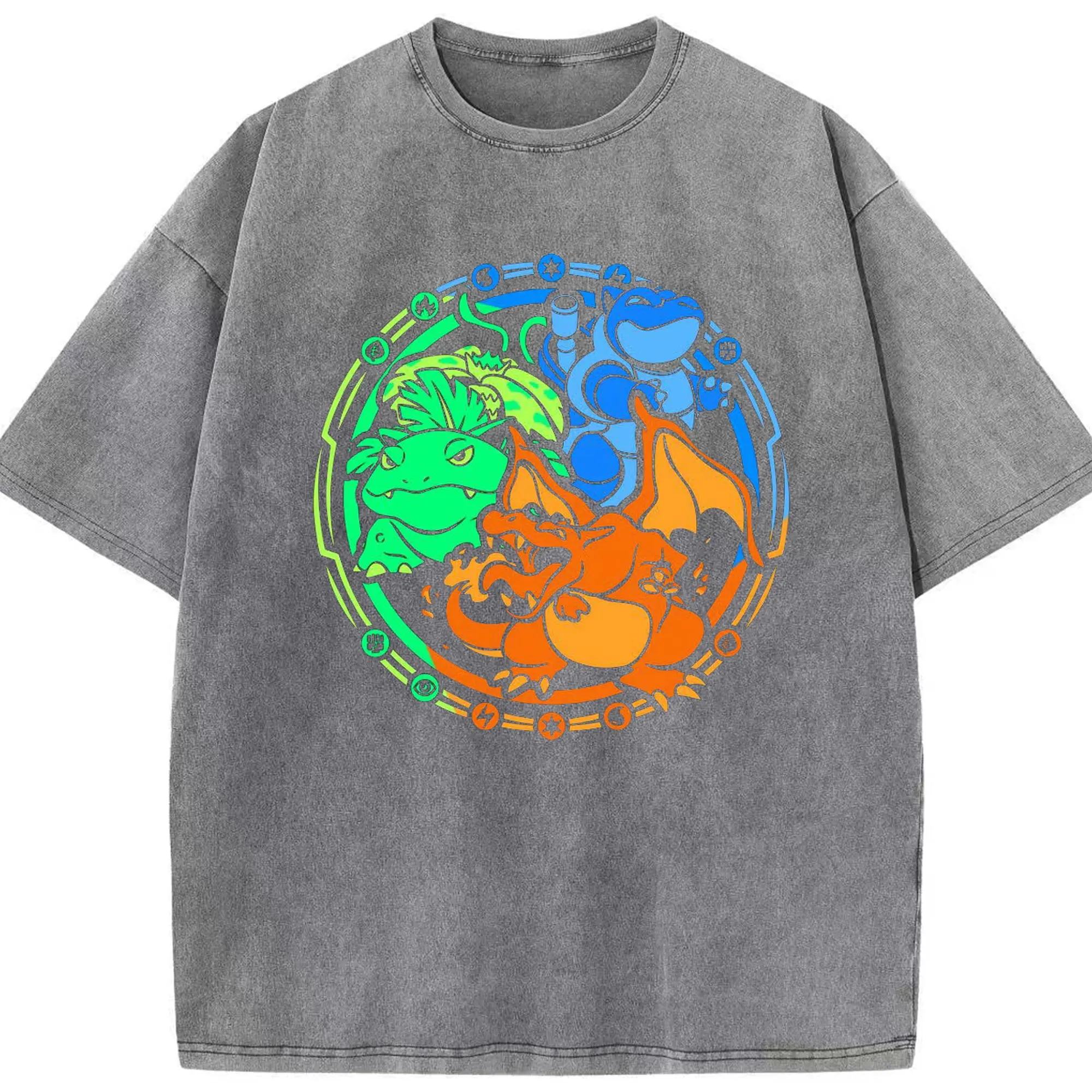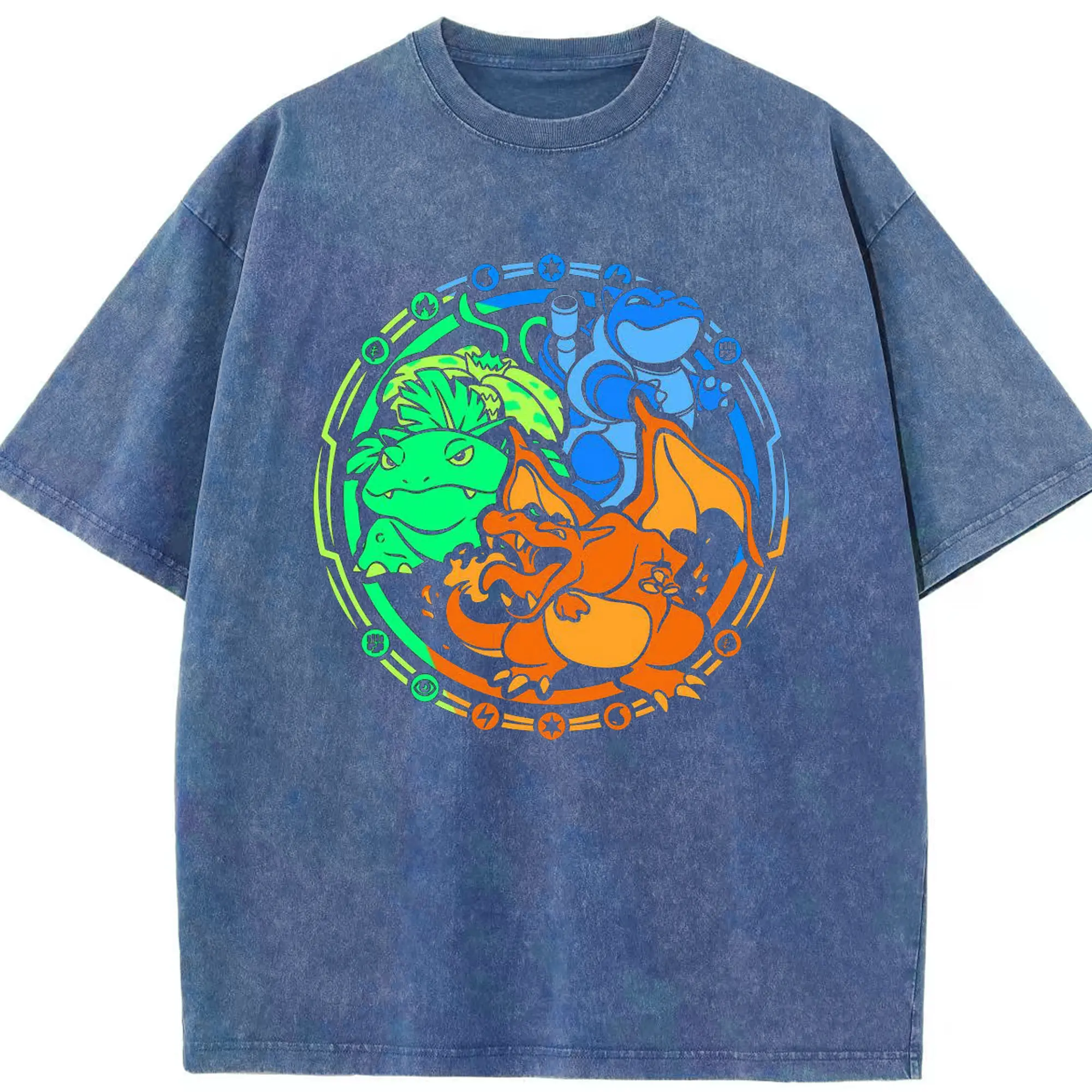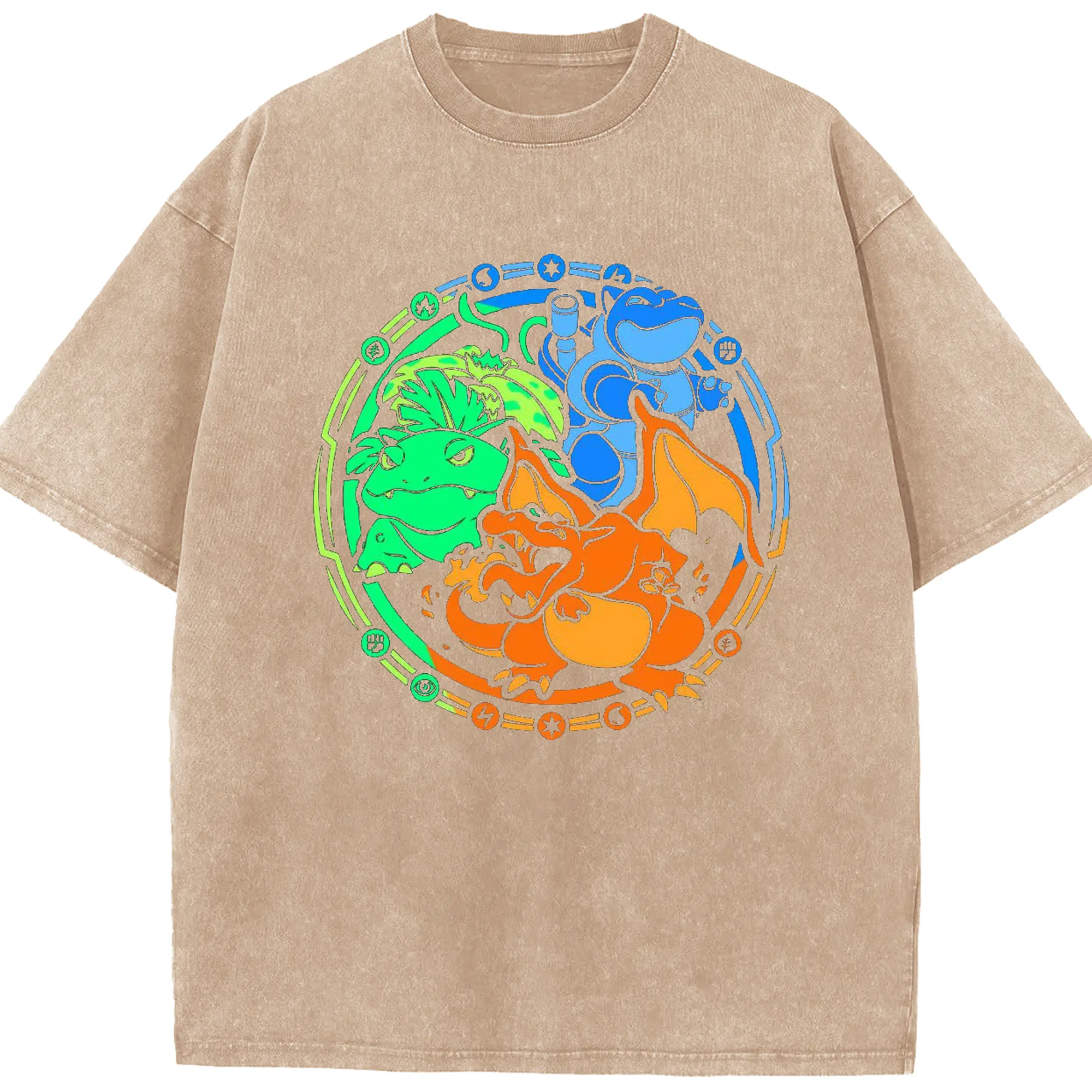Pokémon Starter Final Evolutions DIY - Washed Vintage Look 230g Cotton Oversized T-Shirt With Front Heat Transfer Print – Soft, Lightweight, Stylish Fit – Comfortable Casual Wear For Sports & Everyday Use