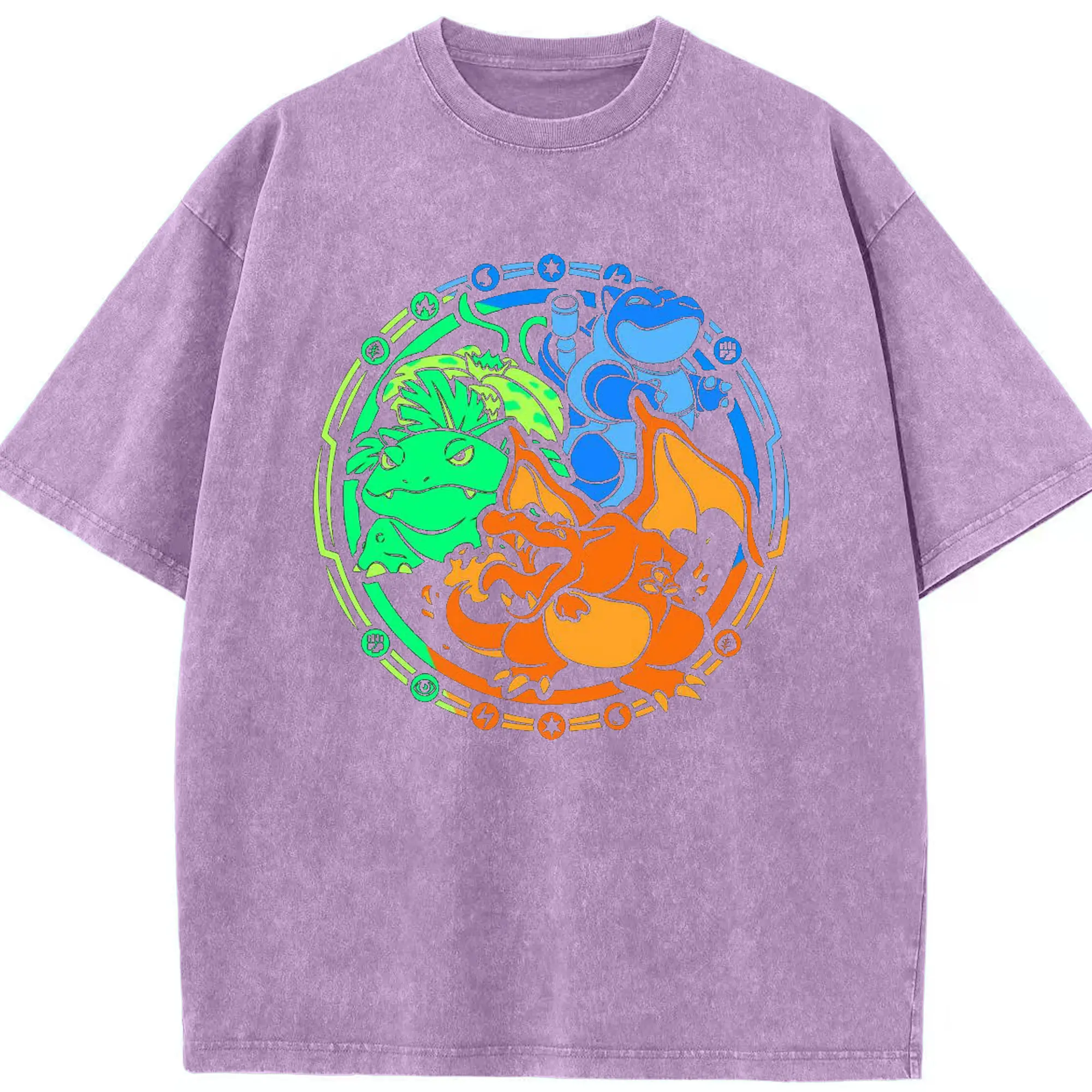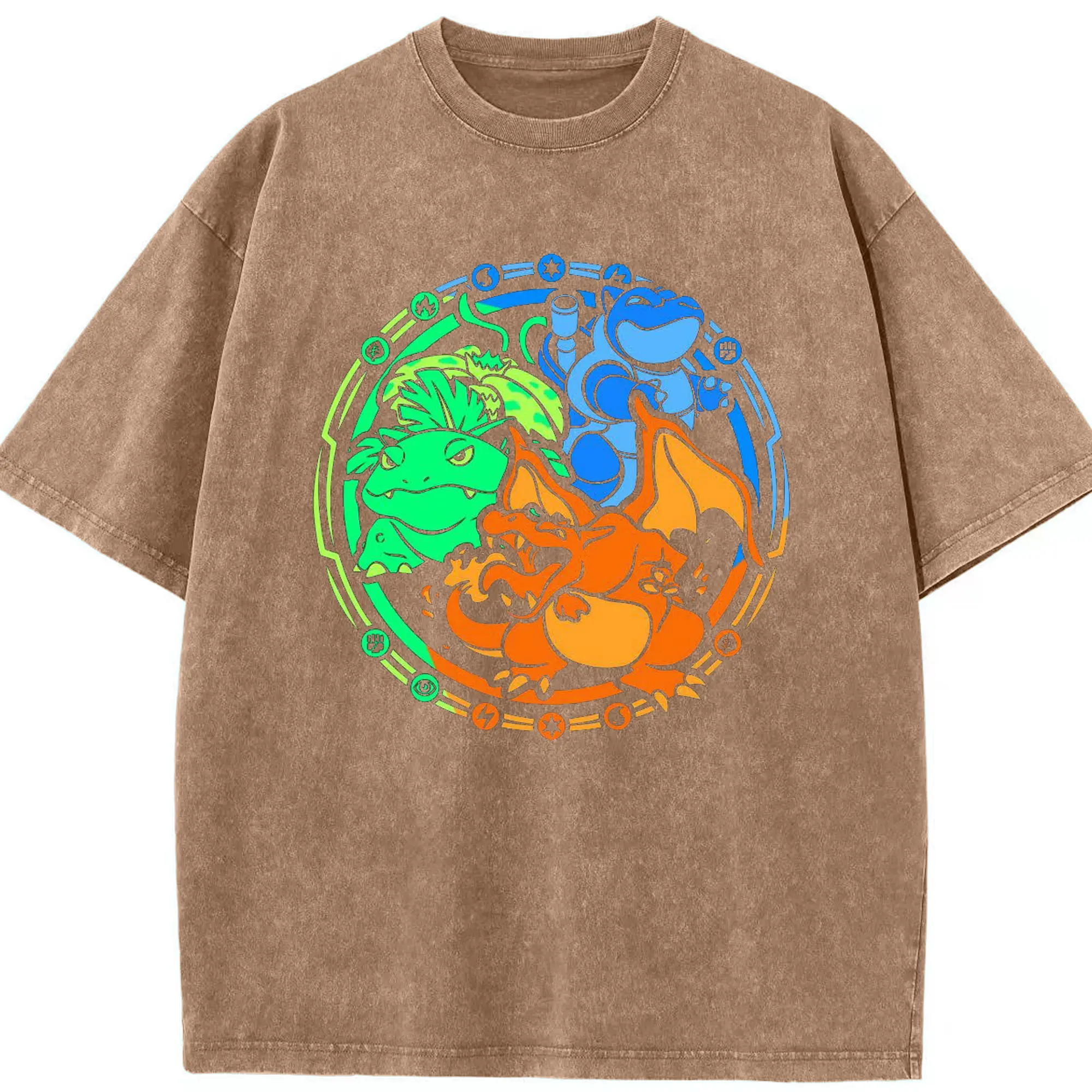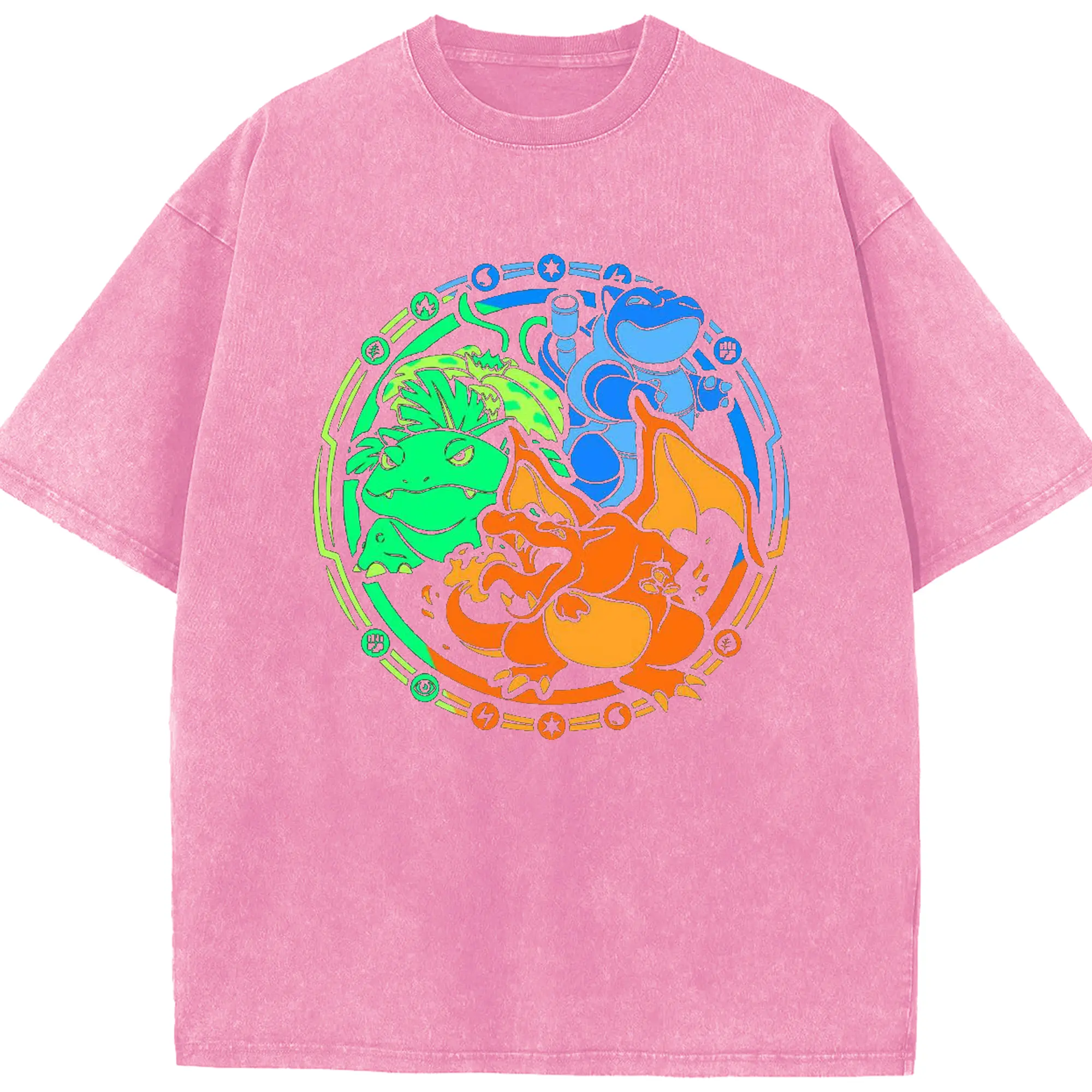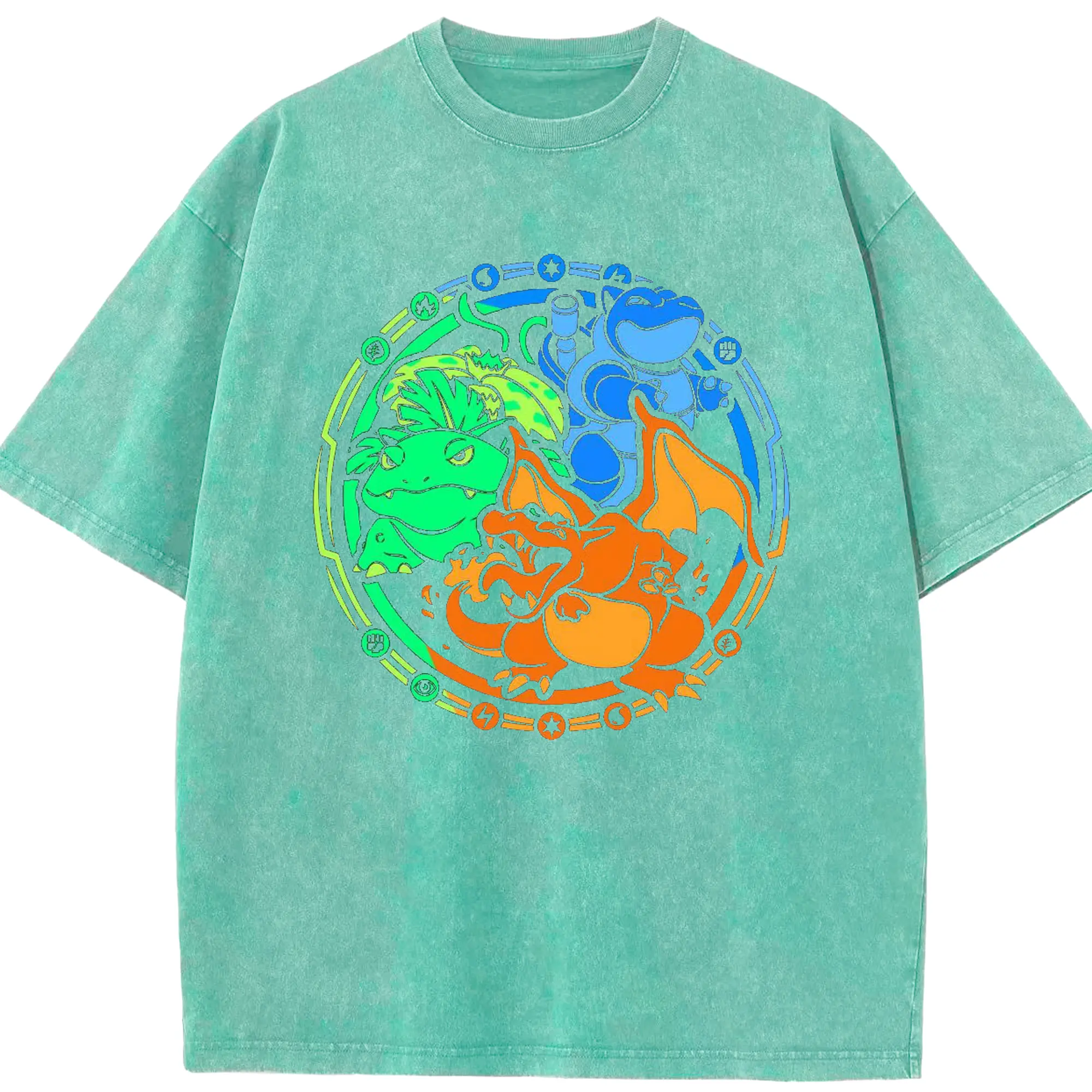 Pokémon Starter Final Evolutions DIY - Washed Vintage Look 230g Cotton Oversized T-Shirt With Front Heat Transfer Print – Soft, Lightweight, Stylish Fit – Comfortable Casual Wear For Sports & Everyday Use