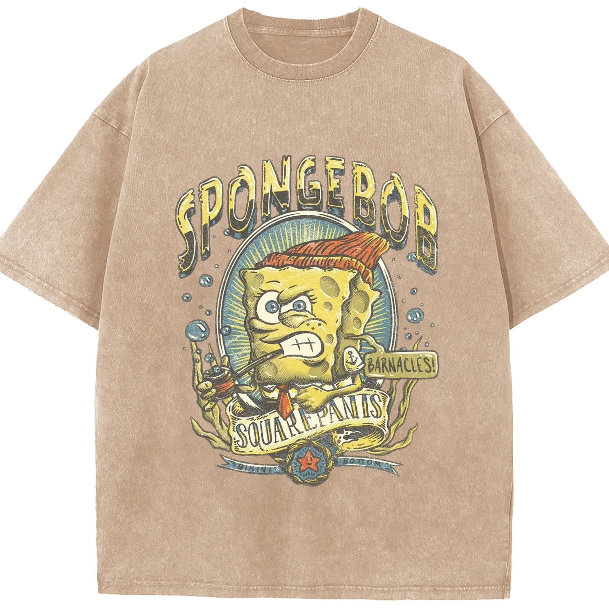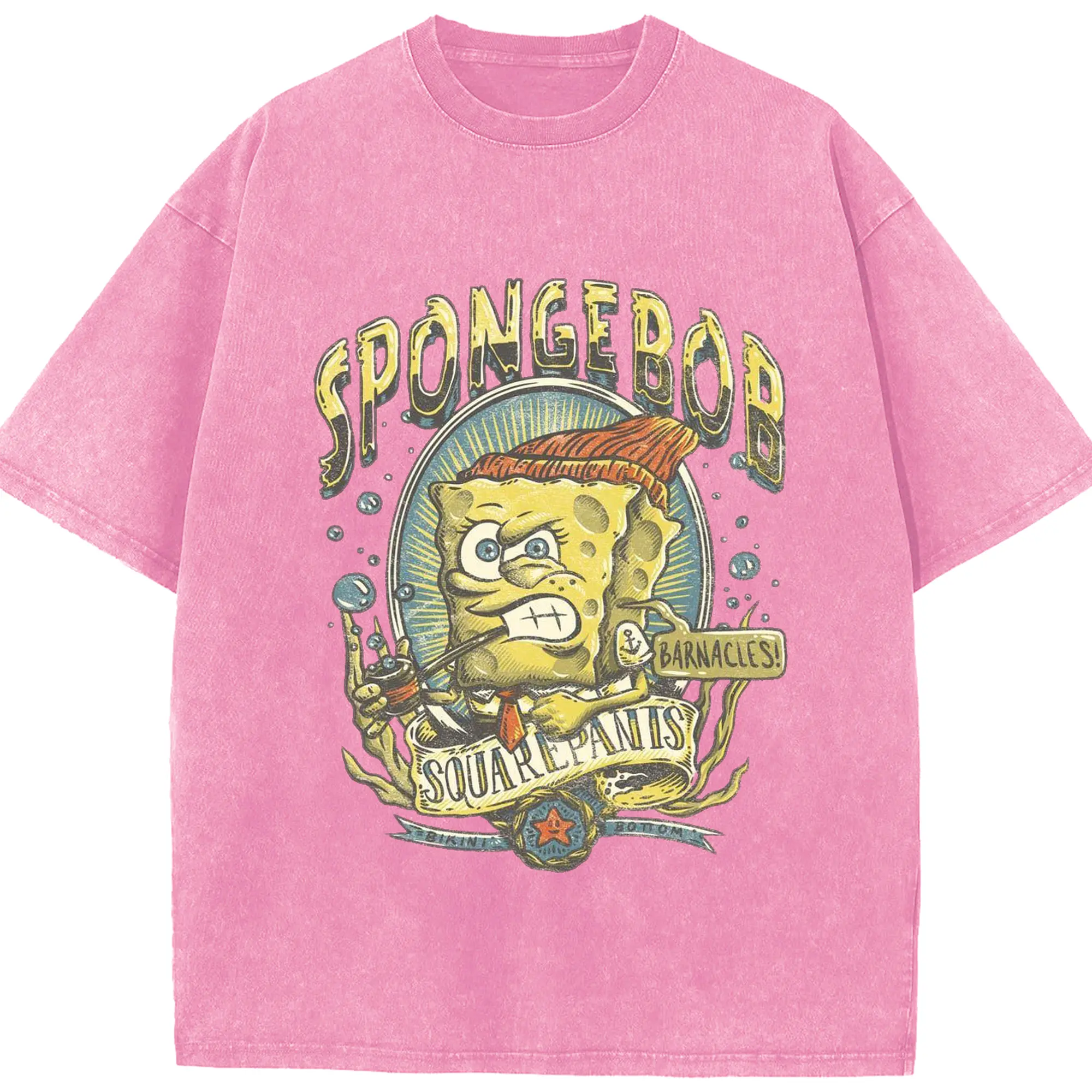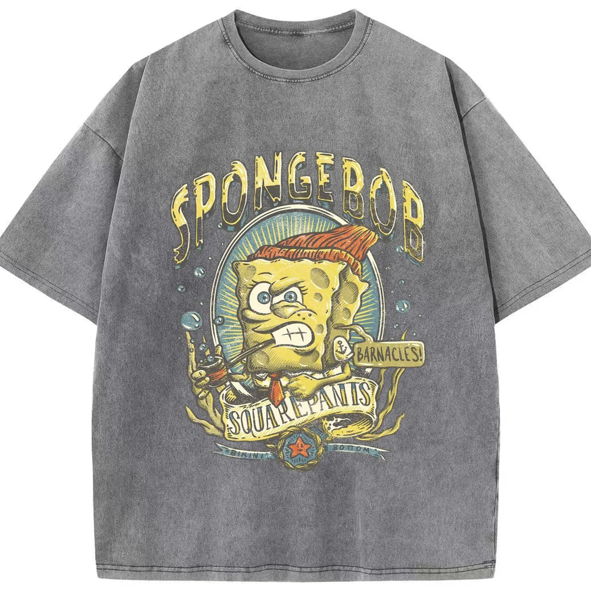 Retro Funny SpongeBob Barnacles! DIY - Washed Vintage Look 230g Cotton Oversized T-Shirt With Front Heat Transfer Print – Soft, Lightweight, Stylish Fit – Comfortable Casual Wear For Sports & Everyday Use