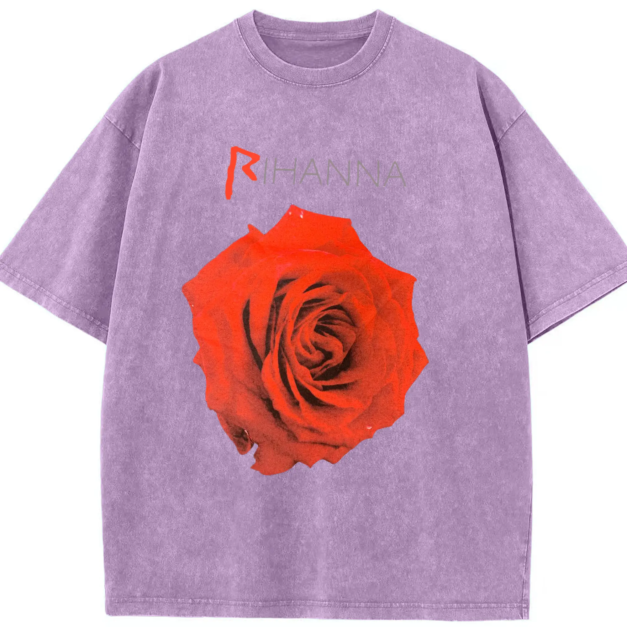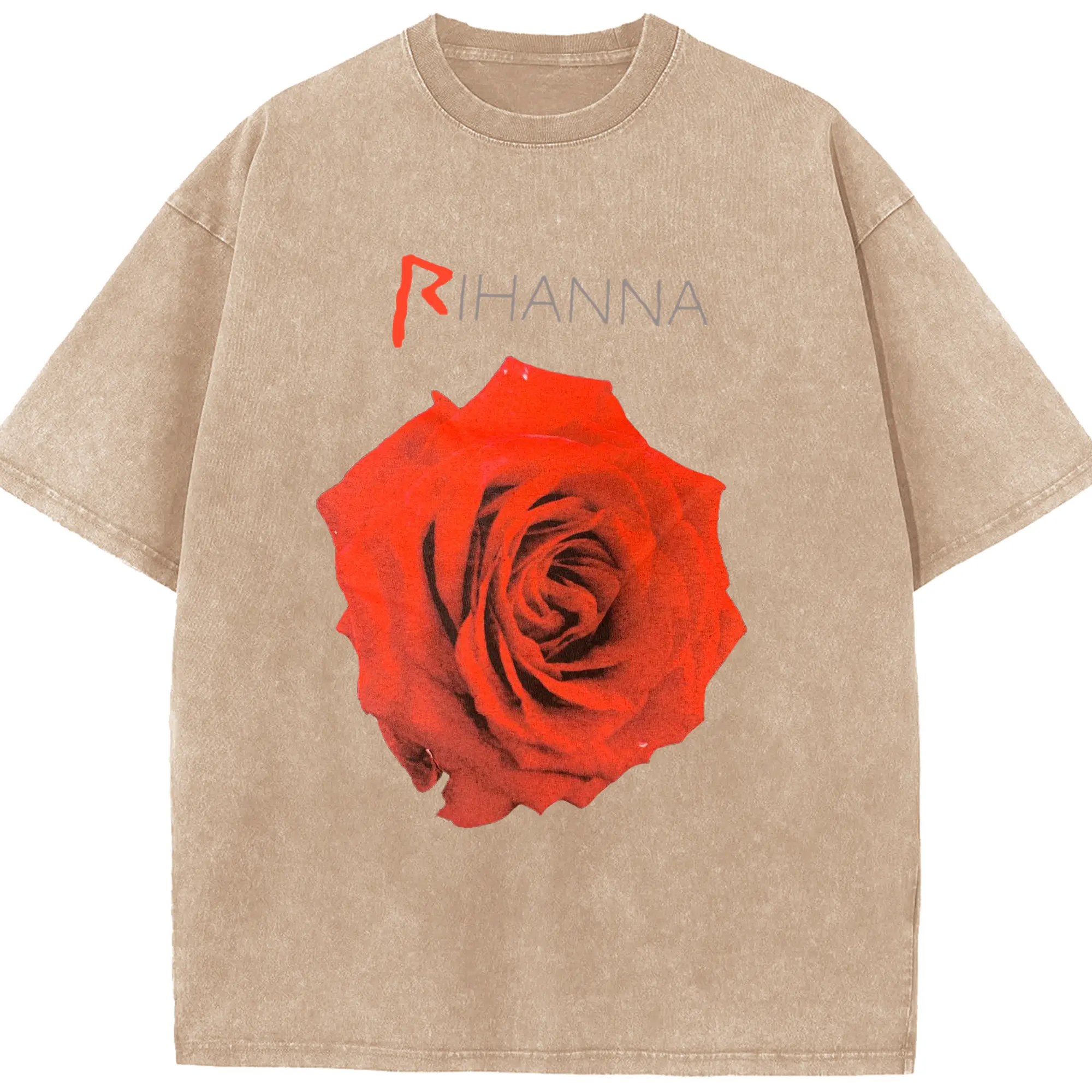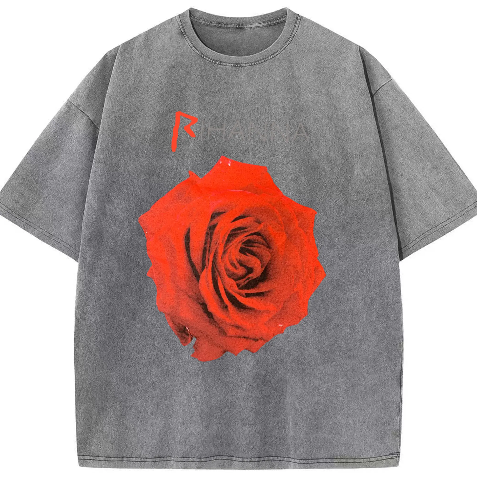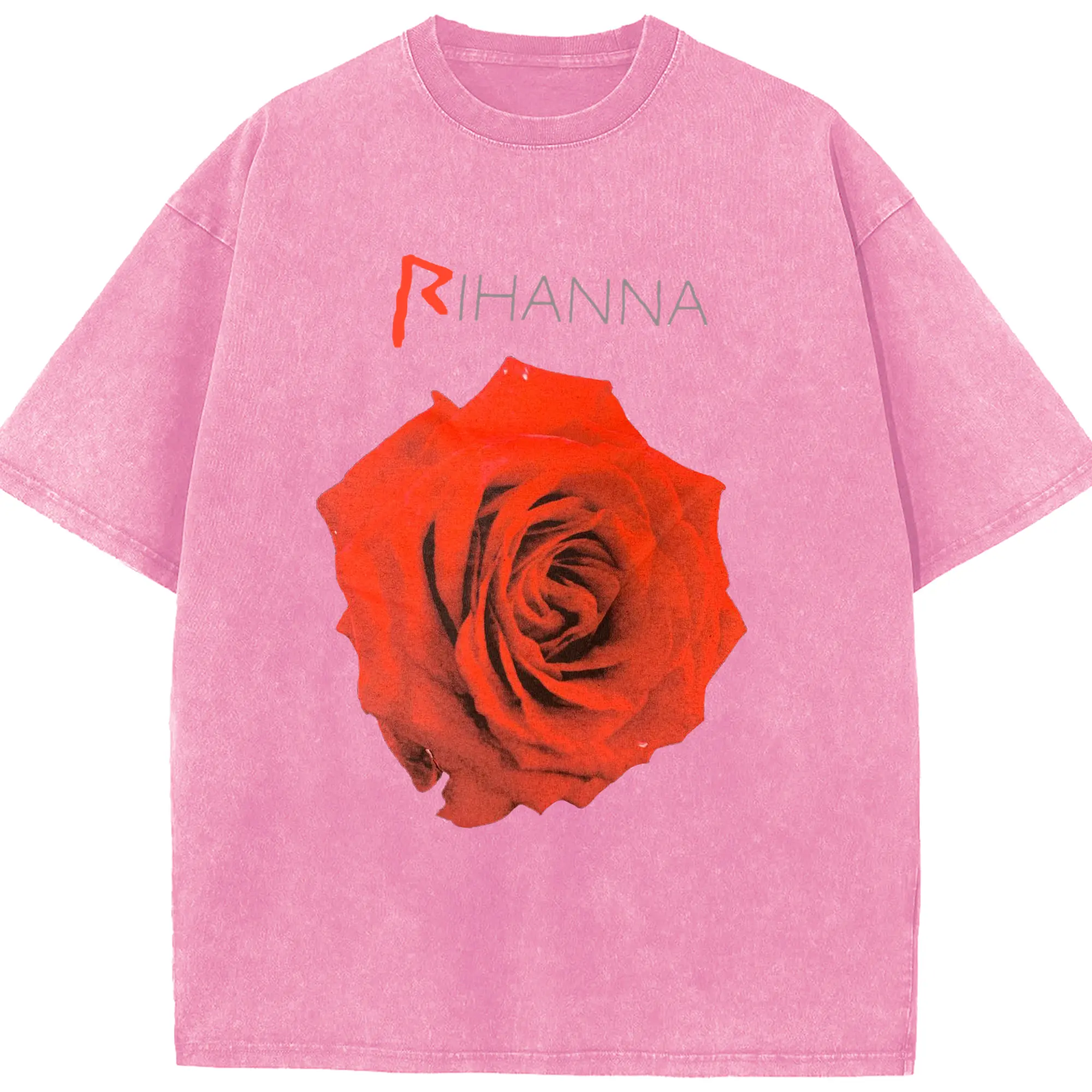 Rihanna Red Rose Romantic DIY - Washed Vintage Look 230g Cotton Oversized T-Shirt With Front Heat Transfer Print – Soft, Lightweight, Stylish Fit – Comfortable Casual Wear For Sports & Everyday Use
