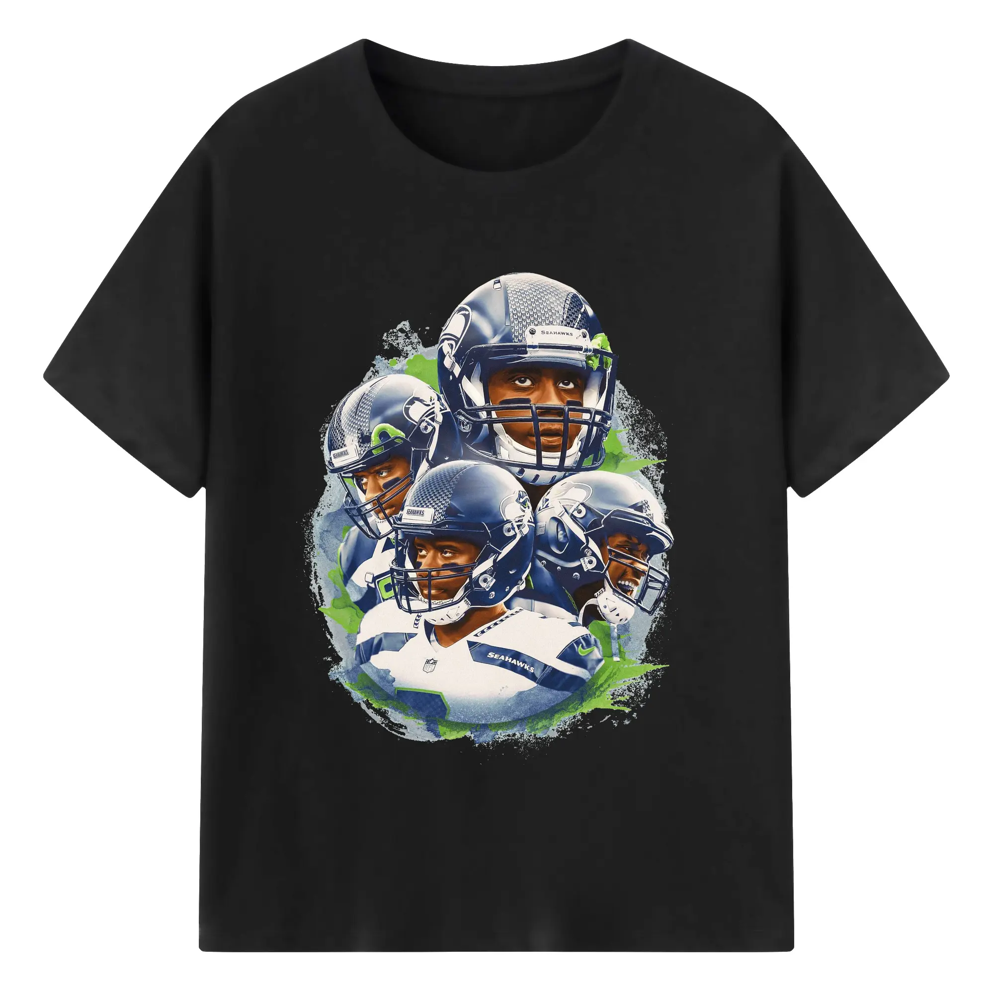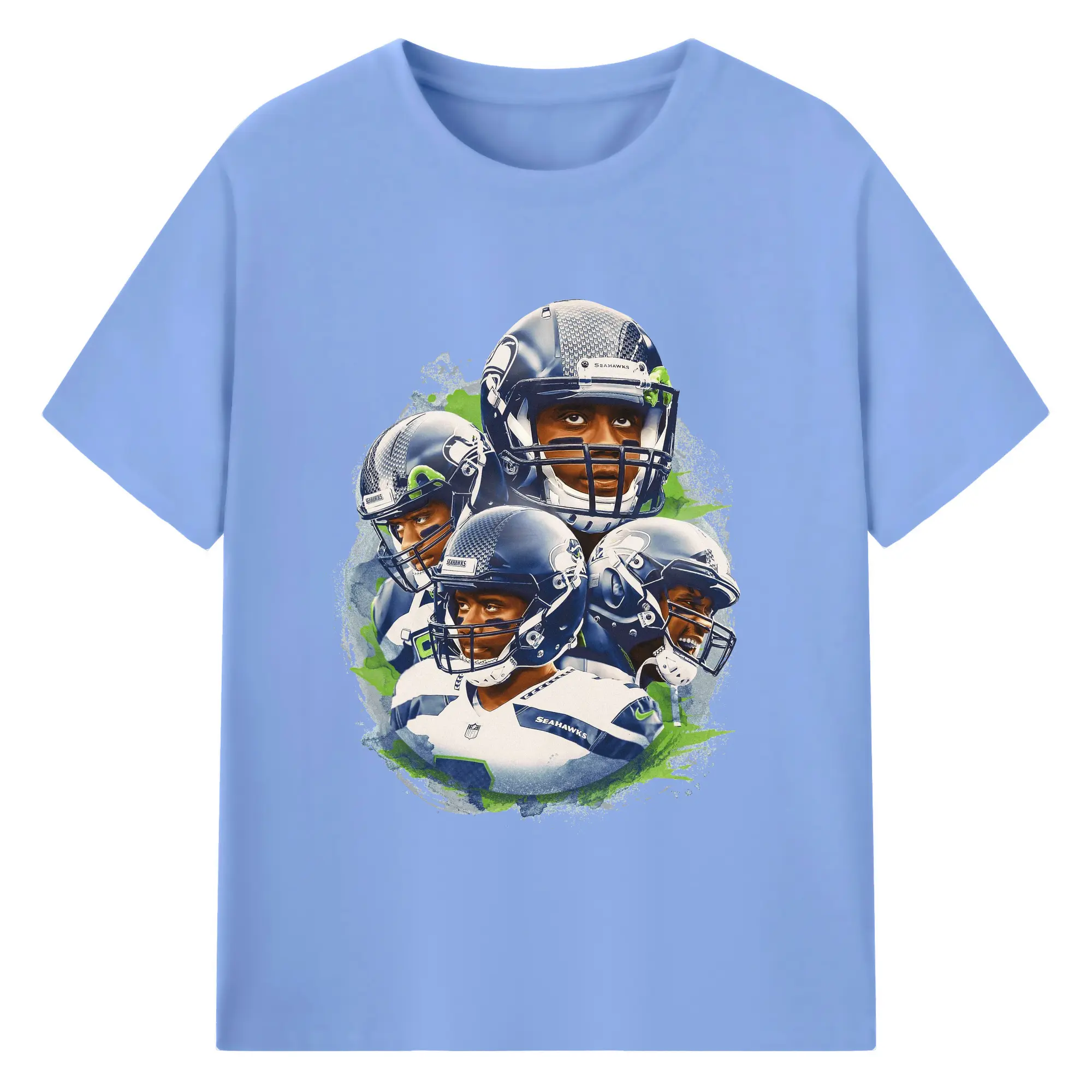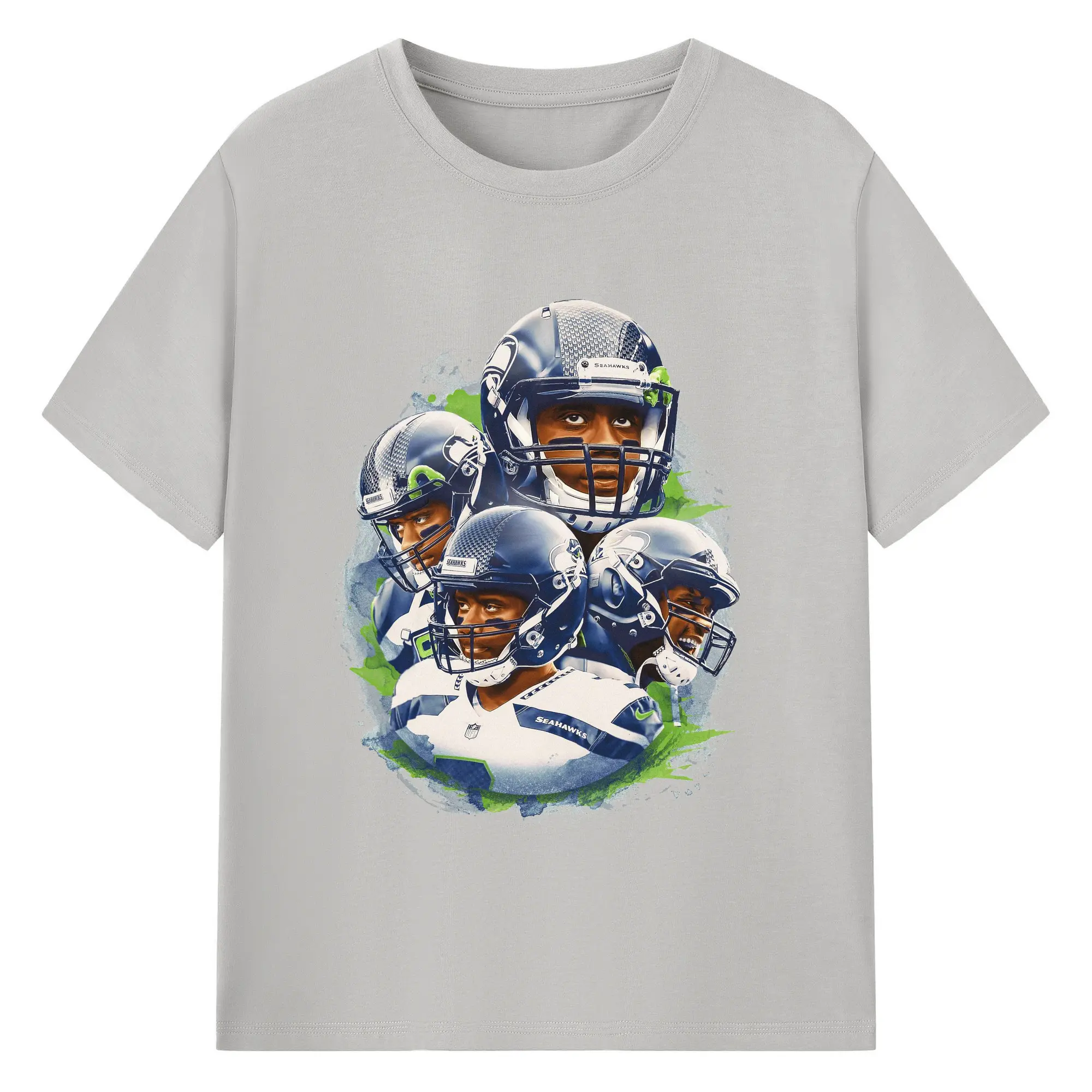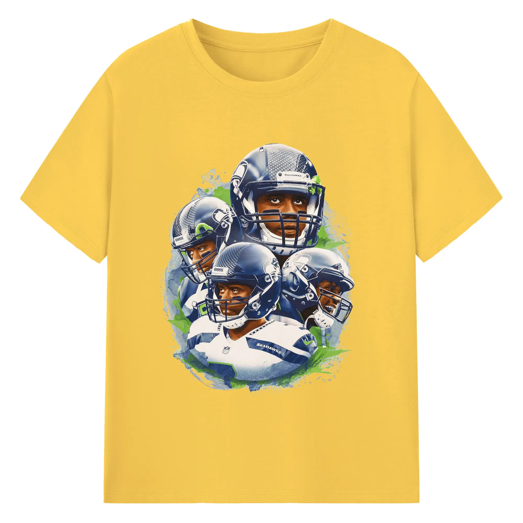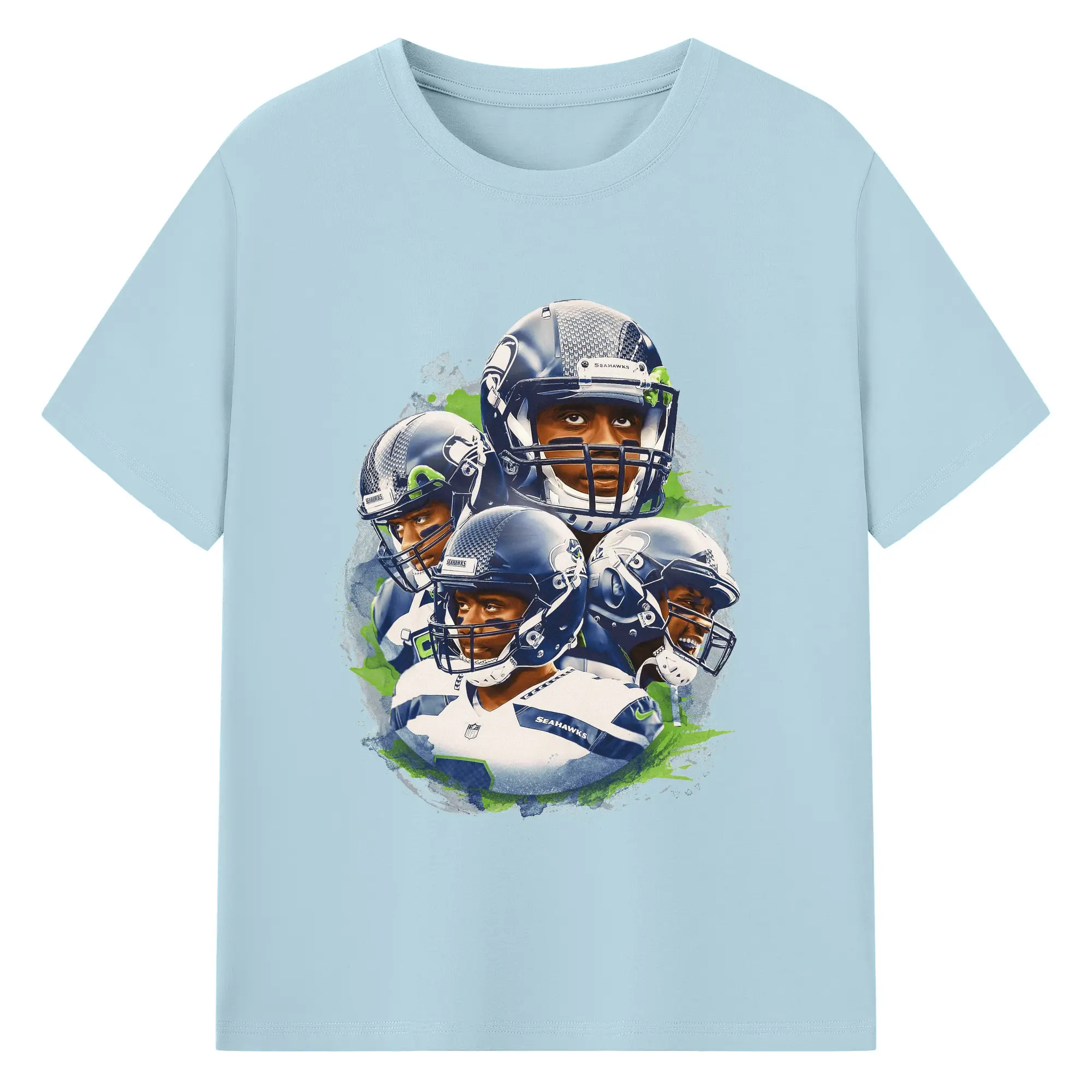 Russell Wilson Seattle Seahawks Watercolor Team Collage DIY Shirt - 180g Cotton T-Shirt With Front Heat Transfer Print – Soft, Lightweight, Fitted Design – Comfortable Casual Wear For Sports & Everyday Use
