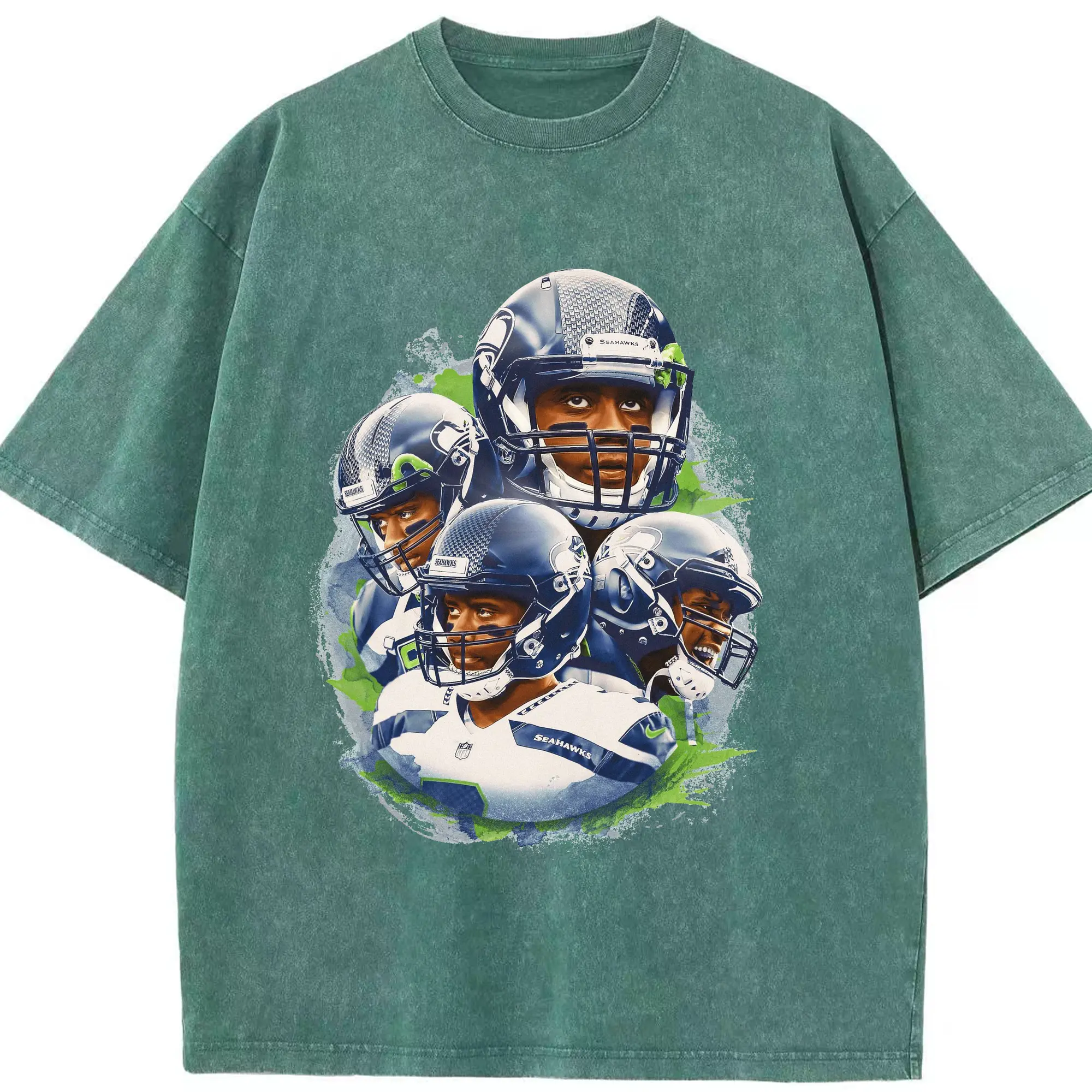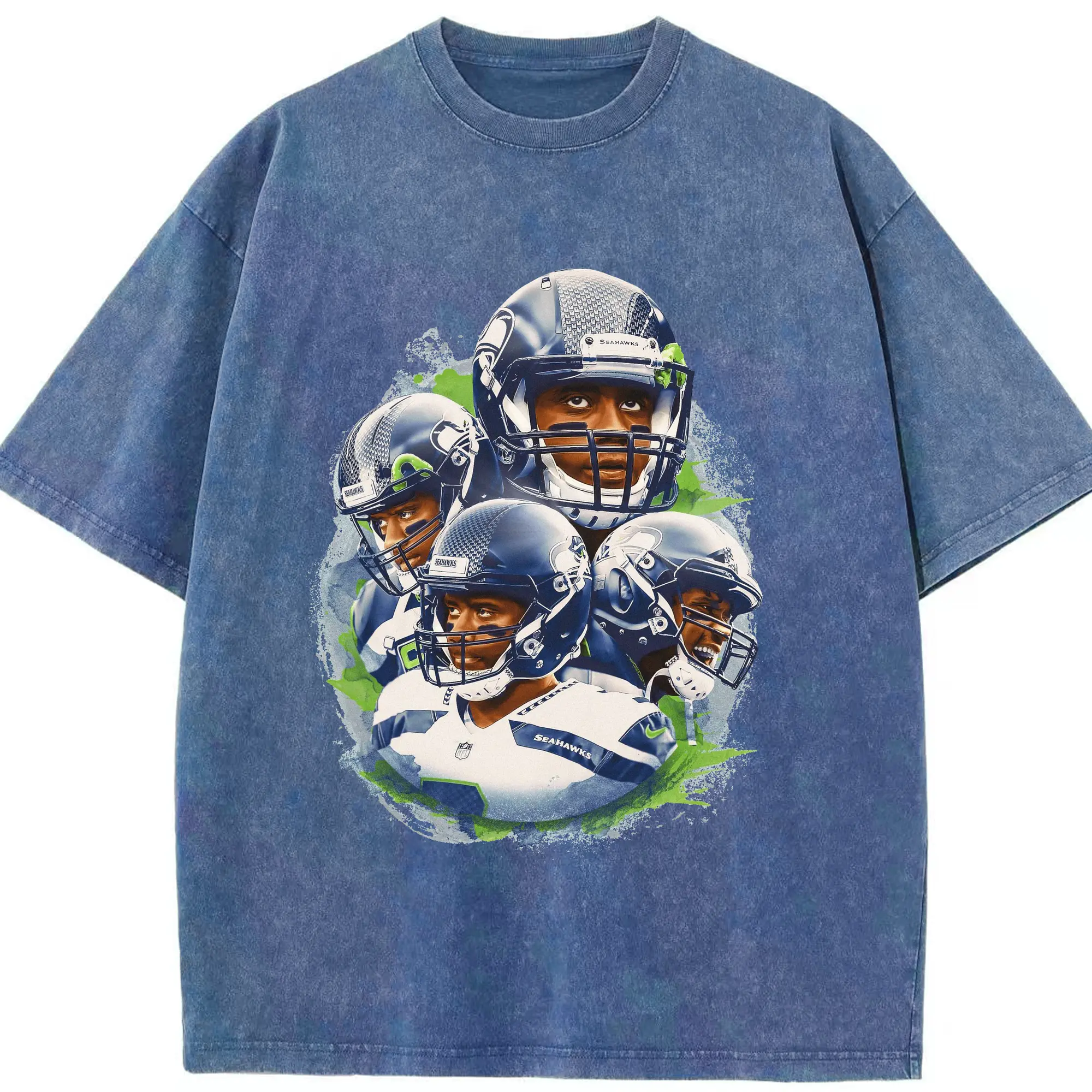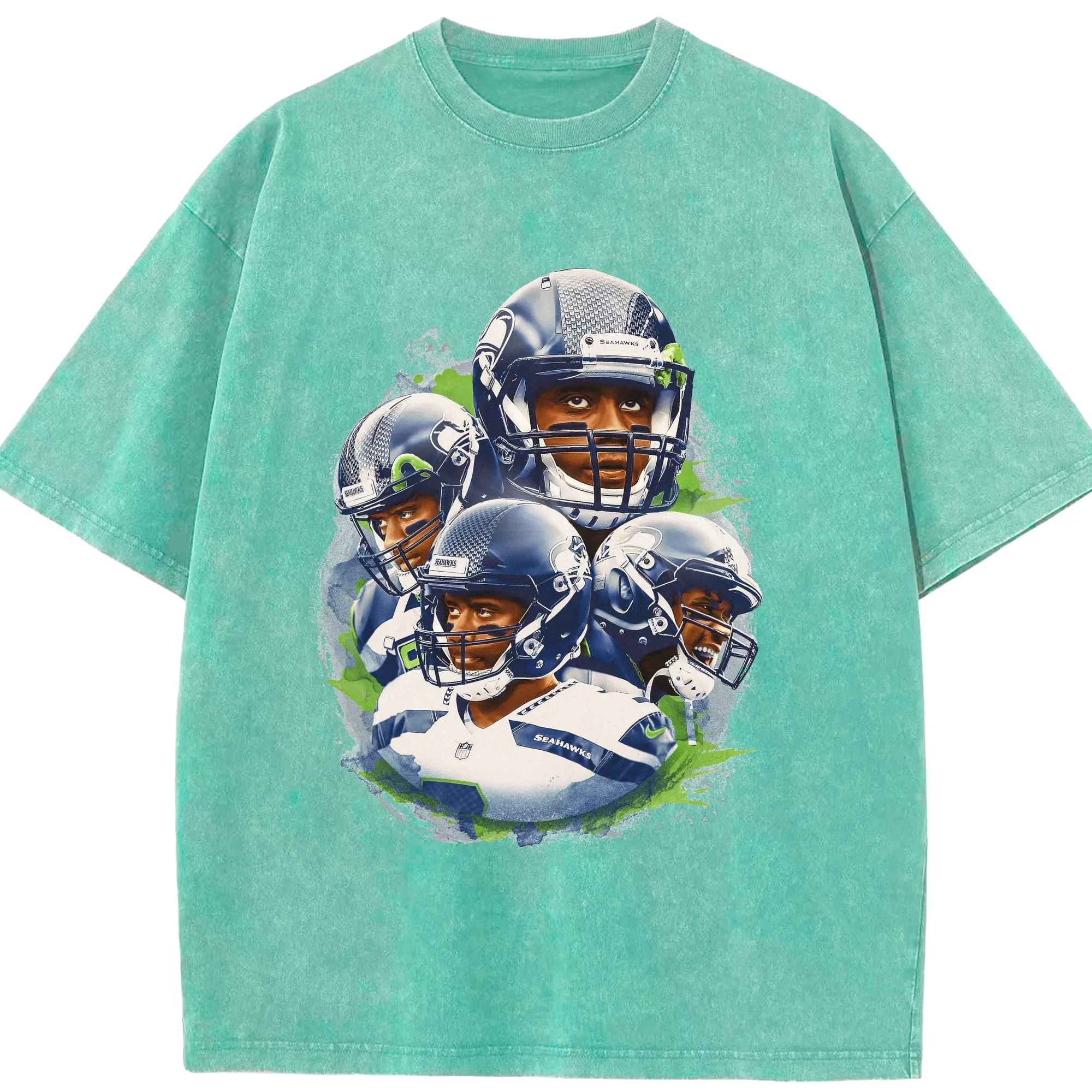 Russell Wilson Seattle Seahawks Watercolor Team Collage DIY Shirt - Washed Vintage Look 230g Cotton Oversized T-Shirt With Front Heat Transfer Print – Soft, Lightweight, Stylish Fit – Comfortable Casual Wear For Sports & Everyday Use