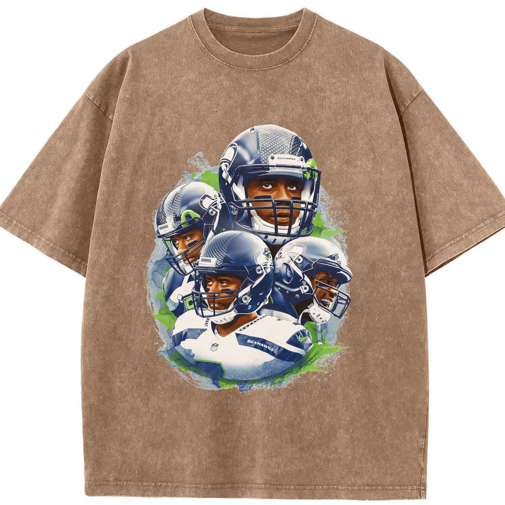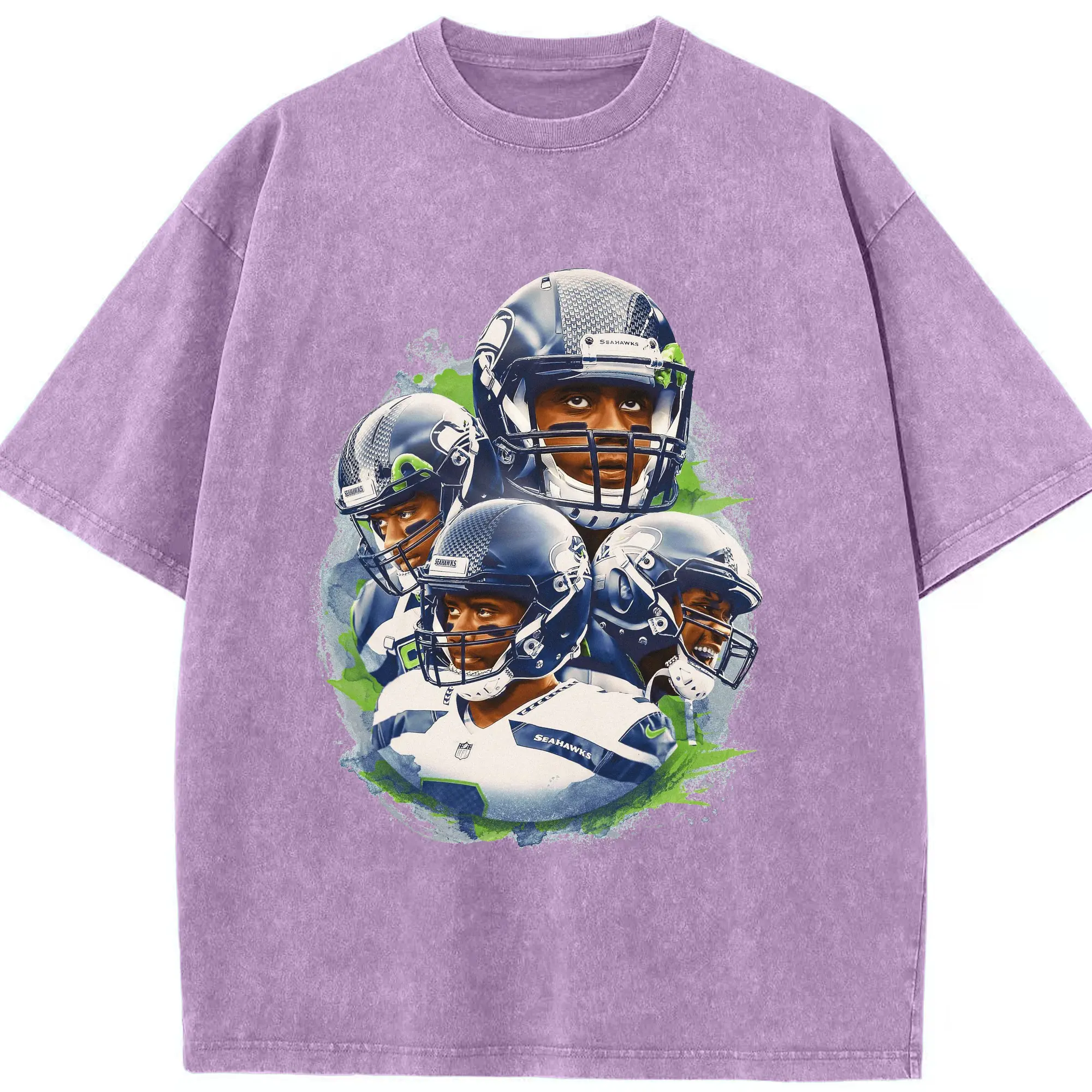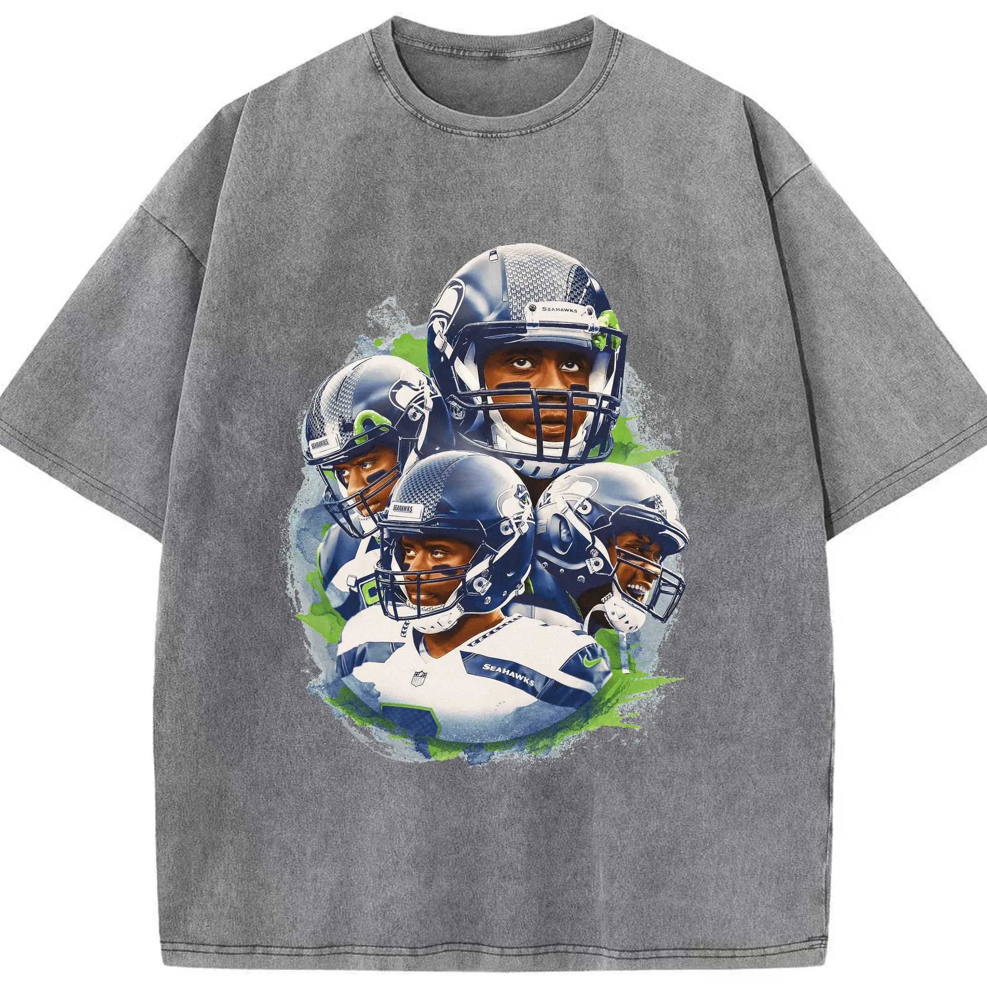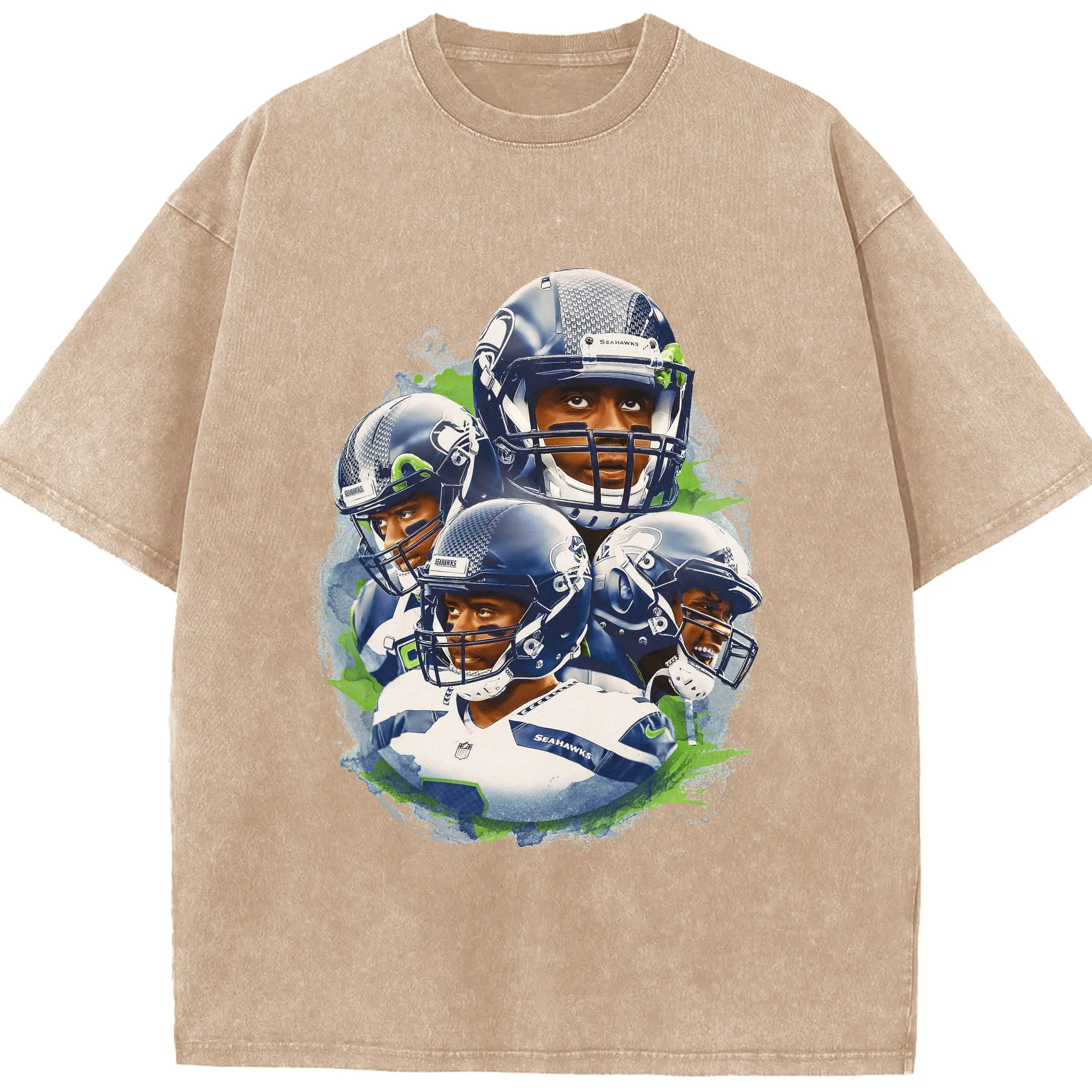 Russell Wilson Seattle Seahawks Watercolor Team Collage DIY Shirt - Washed Vintage Look 230g Cotton Oversized T-Shirt With Front Heat Transfer Print – Soft, Lightweight, Stylish Fit – Comfortable Casual Wear For Sports & Everyday Use