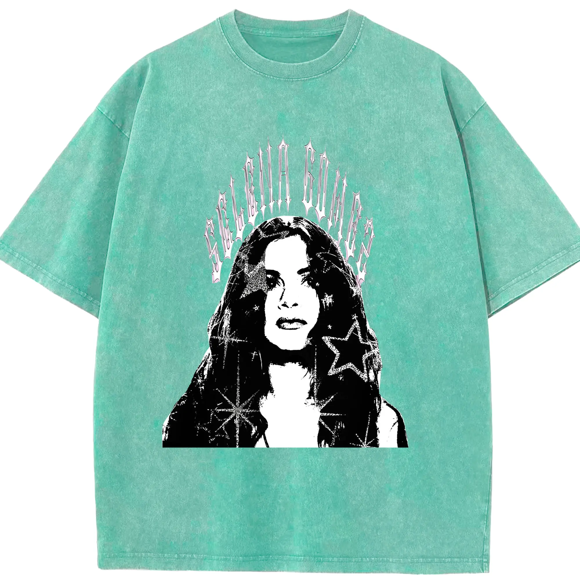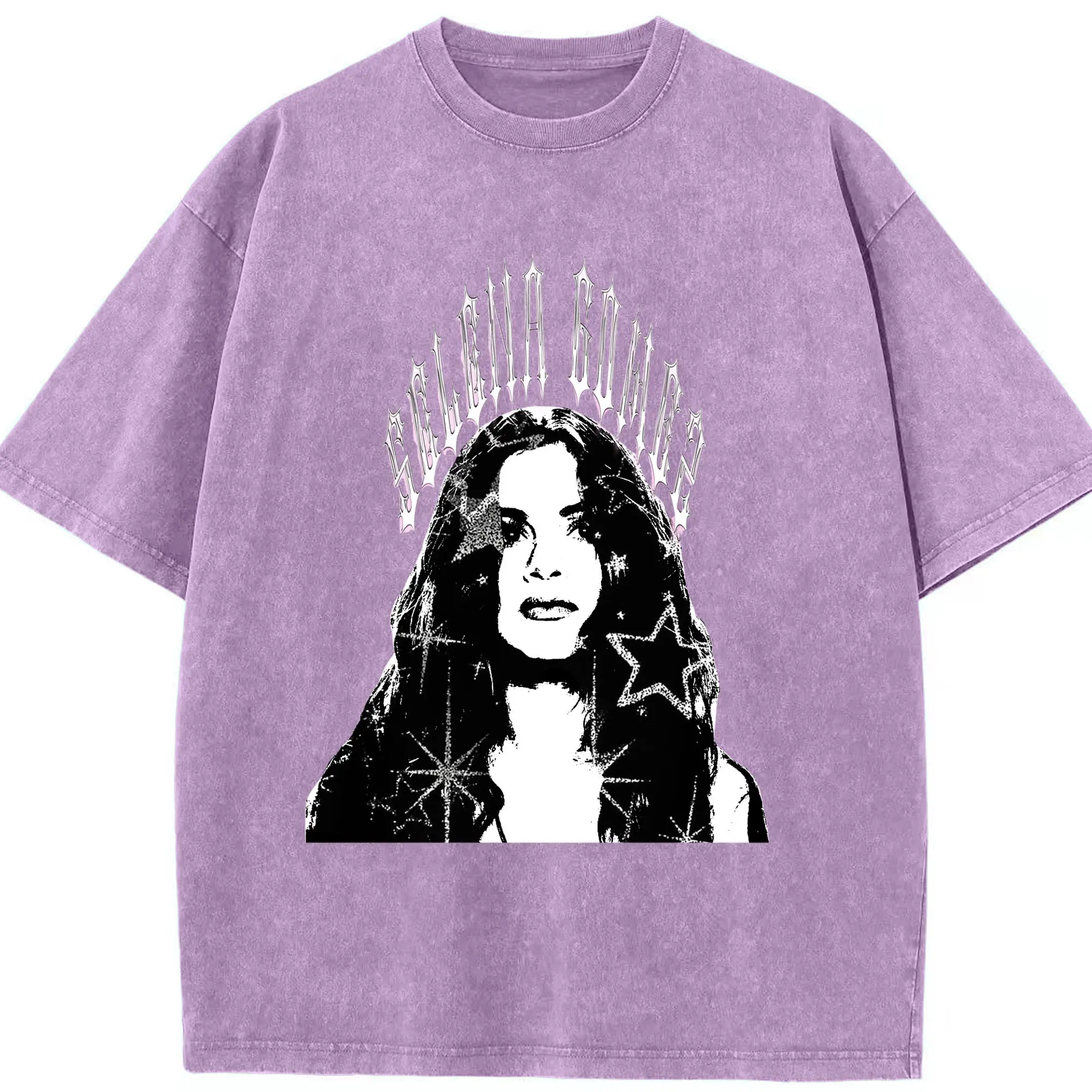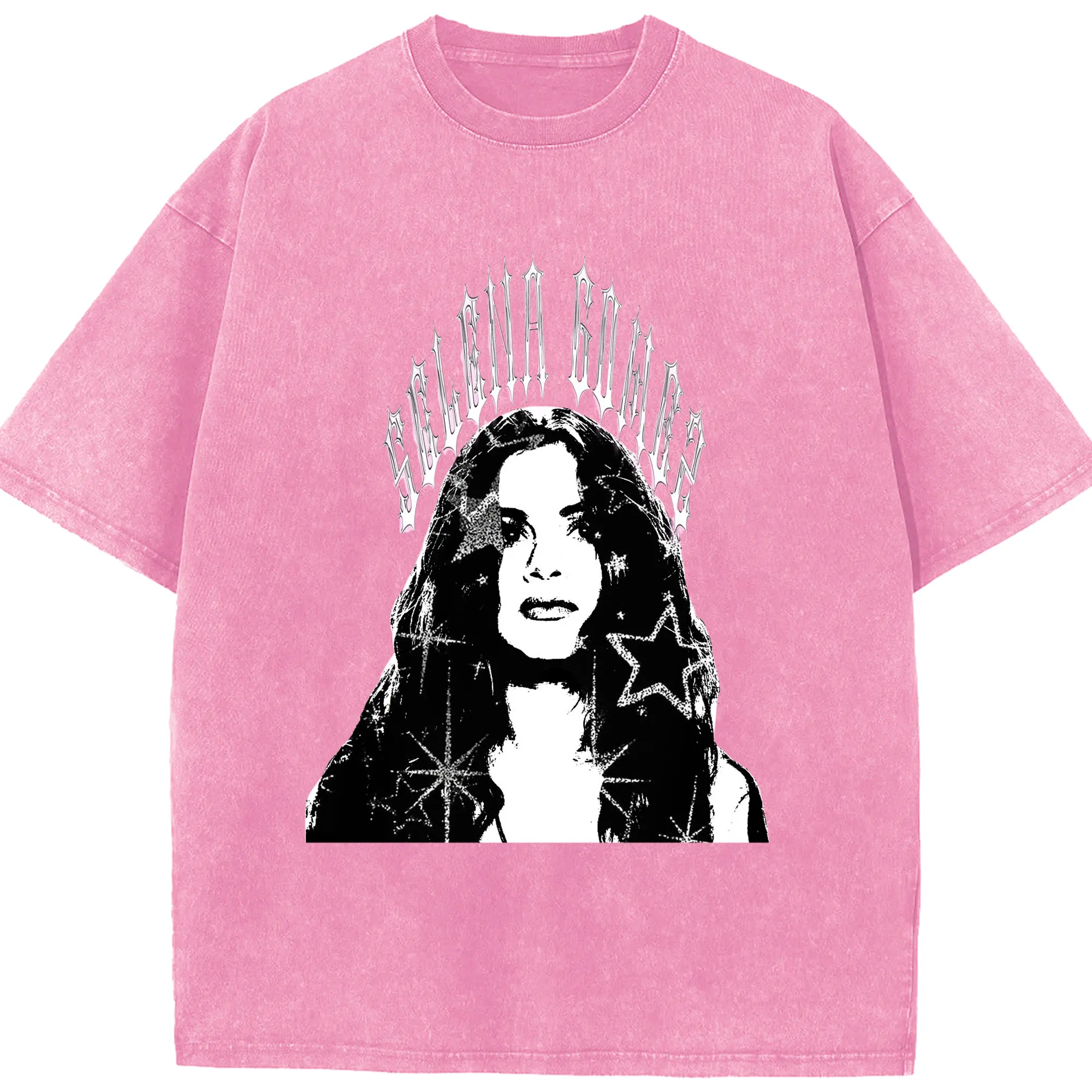 Selena Gomez Black & White Pop Art DIY - Washed Vintage Look 230g Cotton Oversized T-Shirt With Front Heat Transfer Print – Soft, Lightweight, Stylish Fit – Comfortable Casual Wear For Sports & Everyday Use