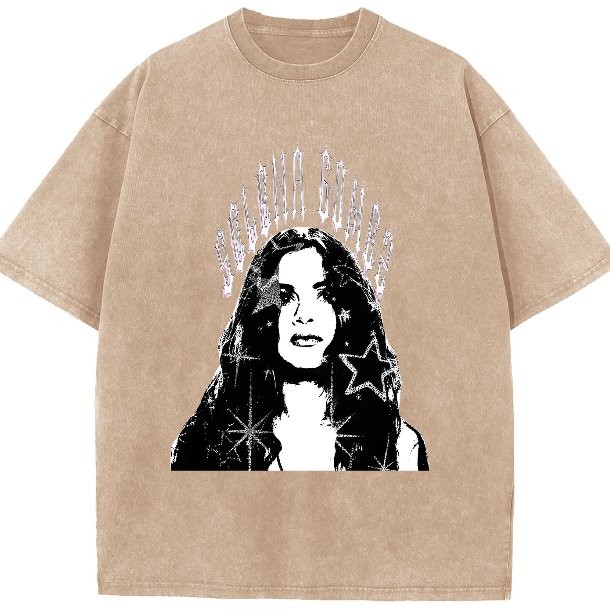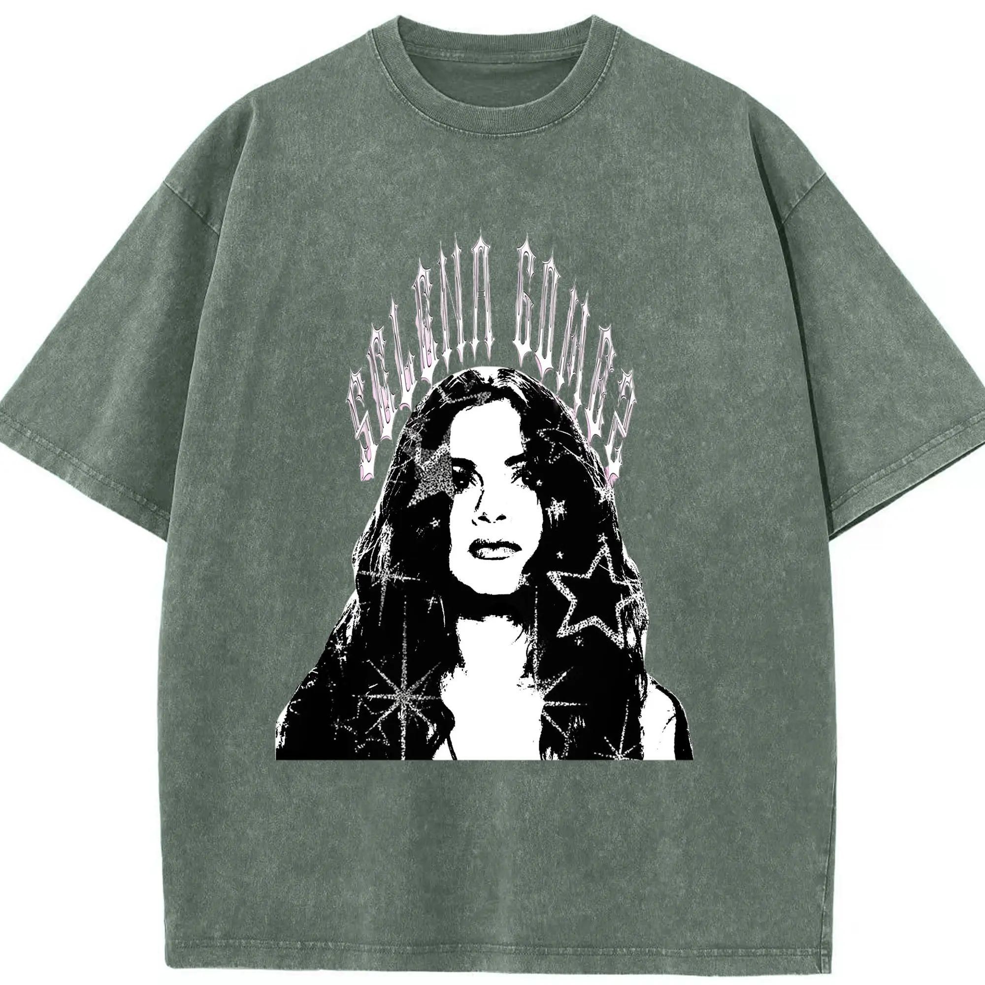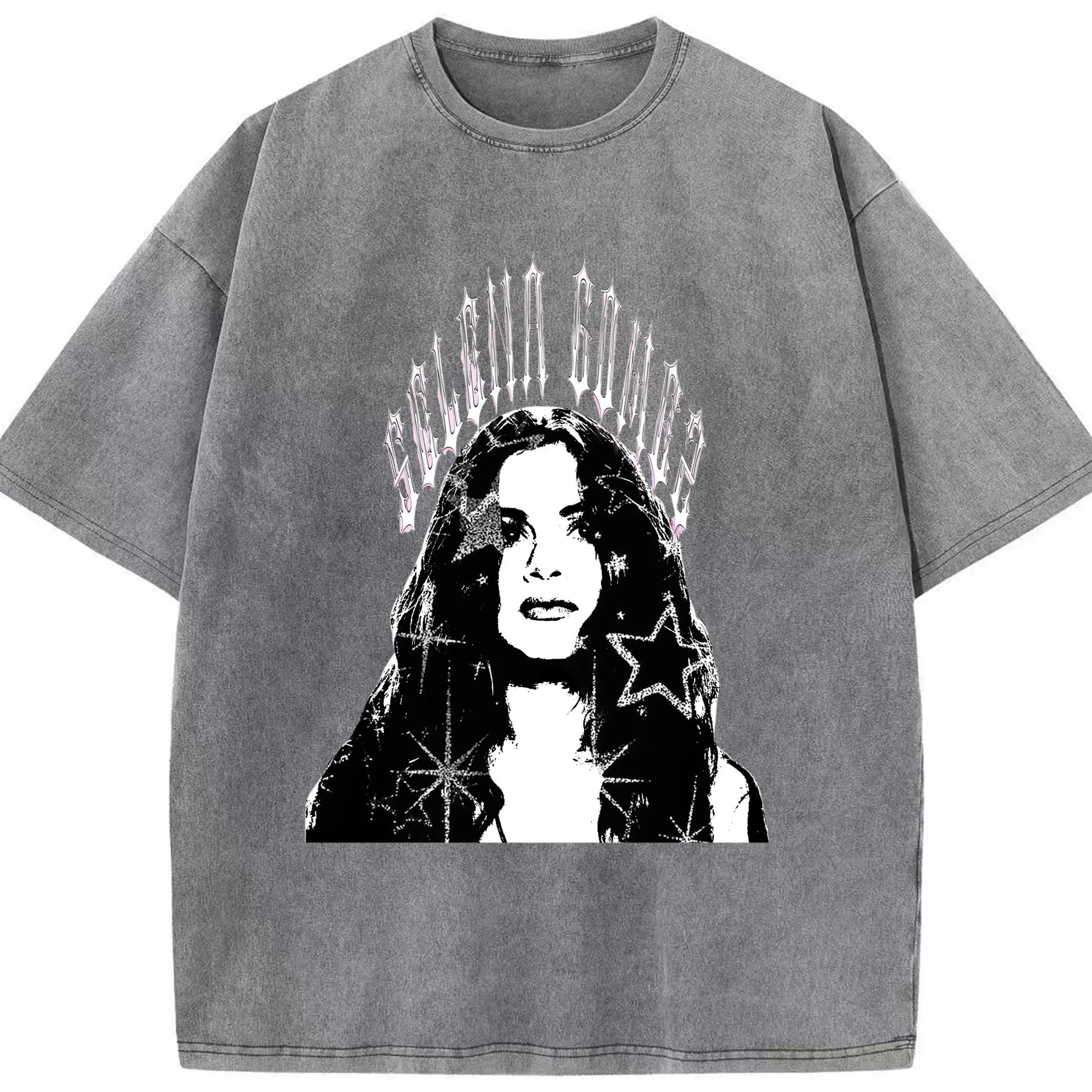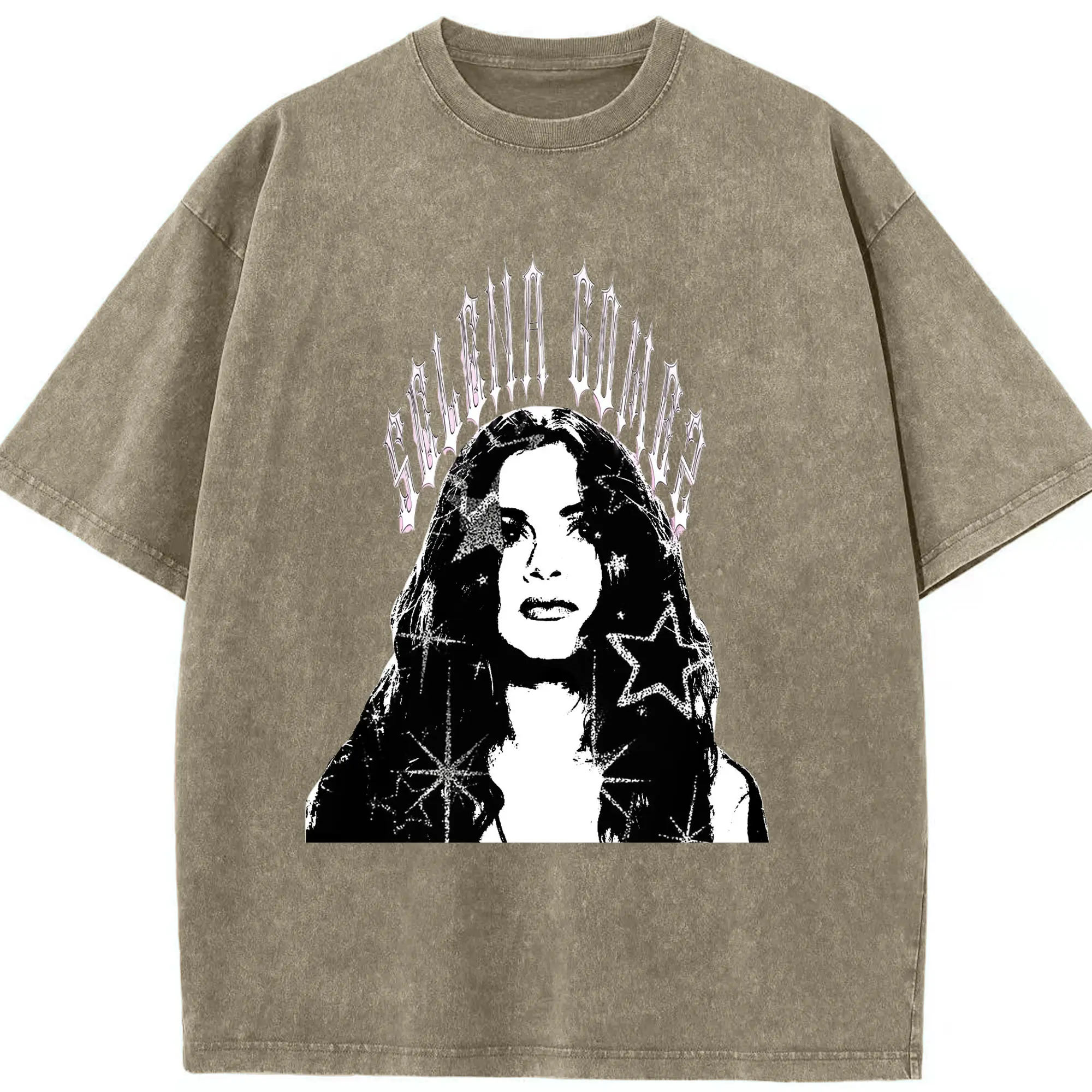 Selena Gomez Black & White Pop Art DIY - Washed Vintage Look 230g Cotton Oversized T-Shirt With Front Heat Transfer Print – Soft, Lightweight, Stylish Fit – Comfortable Casual Wear For Sports & Everyday Use