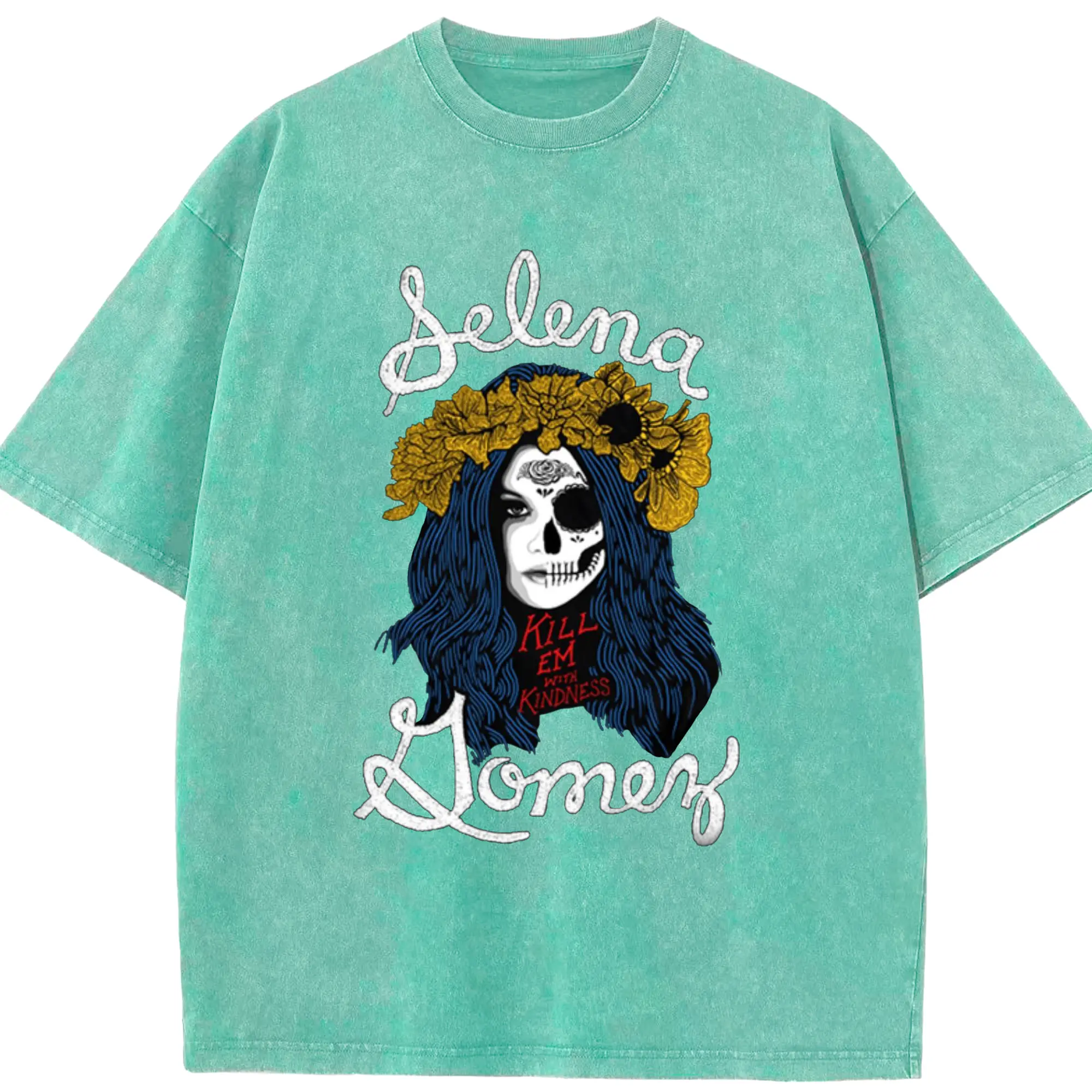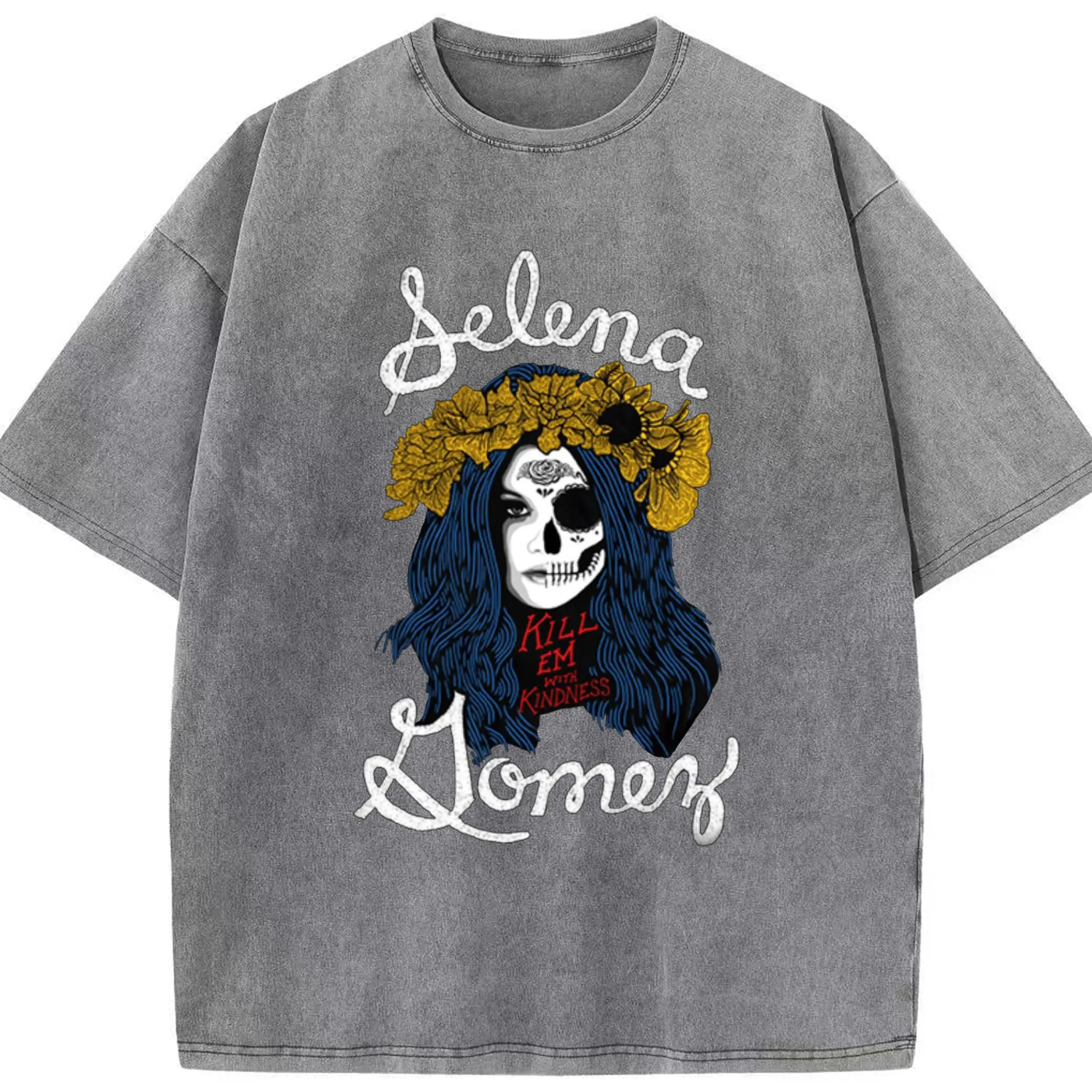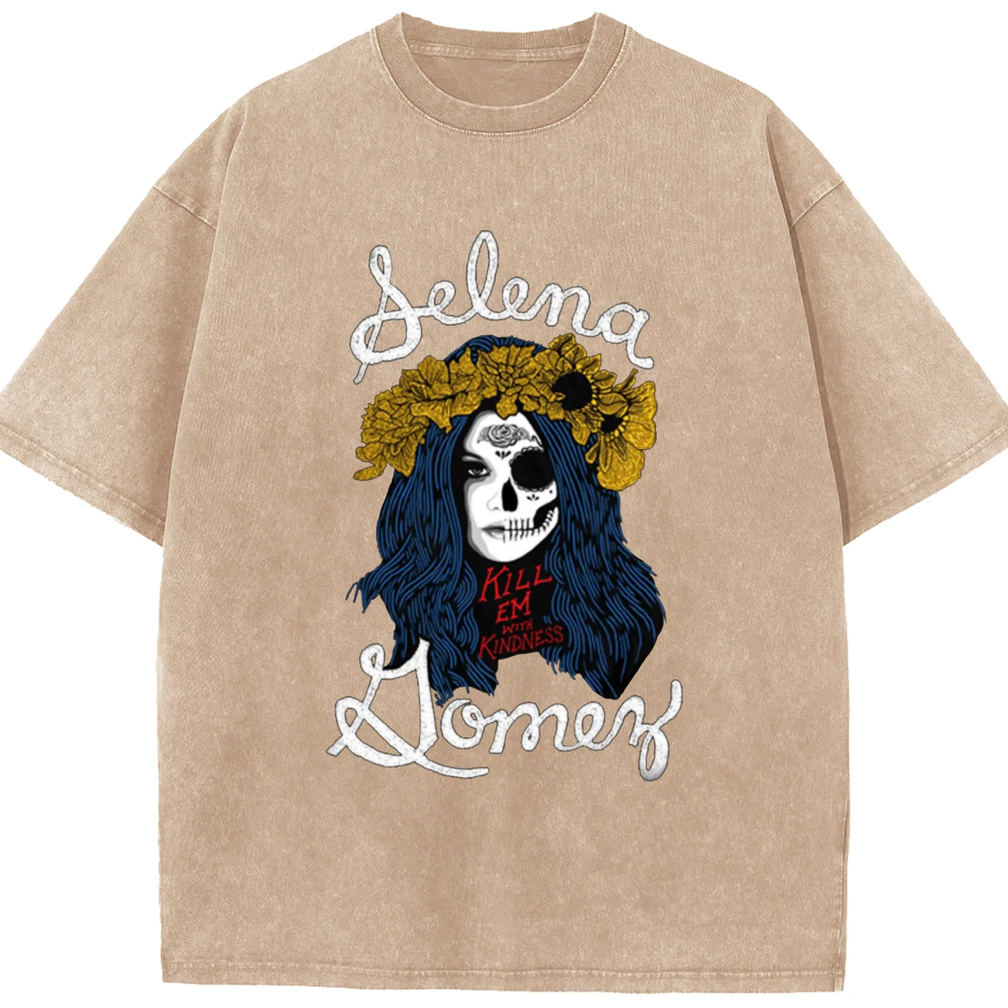Selena Gomez Dia de los Muertos DIY - Washed Vintage Look 230g Cotton Oversized T-Shirt With Front Heat Transfer Print – Soft, Lightweight, Stylish Fit – Comfortable Casual Wear For Sports & Everyday Use