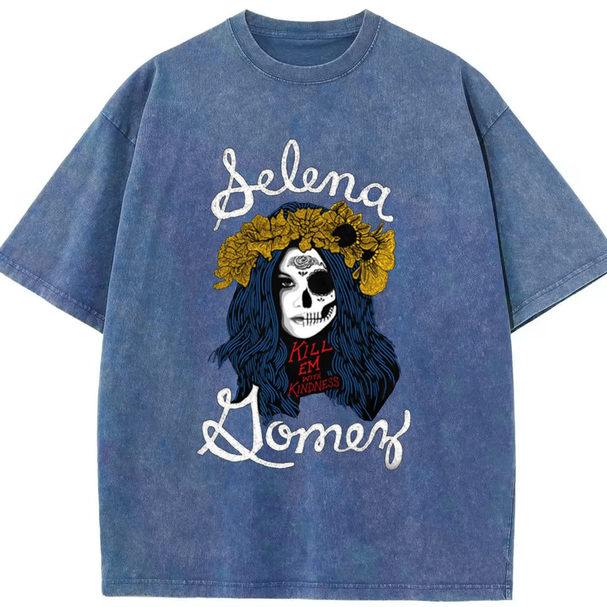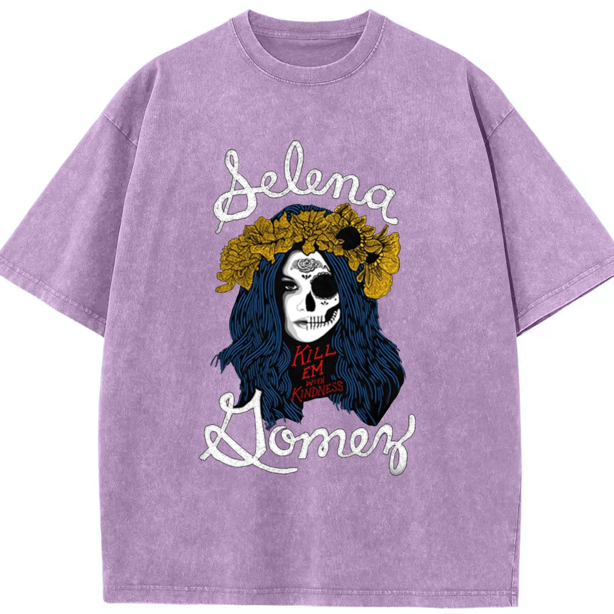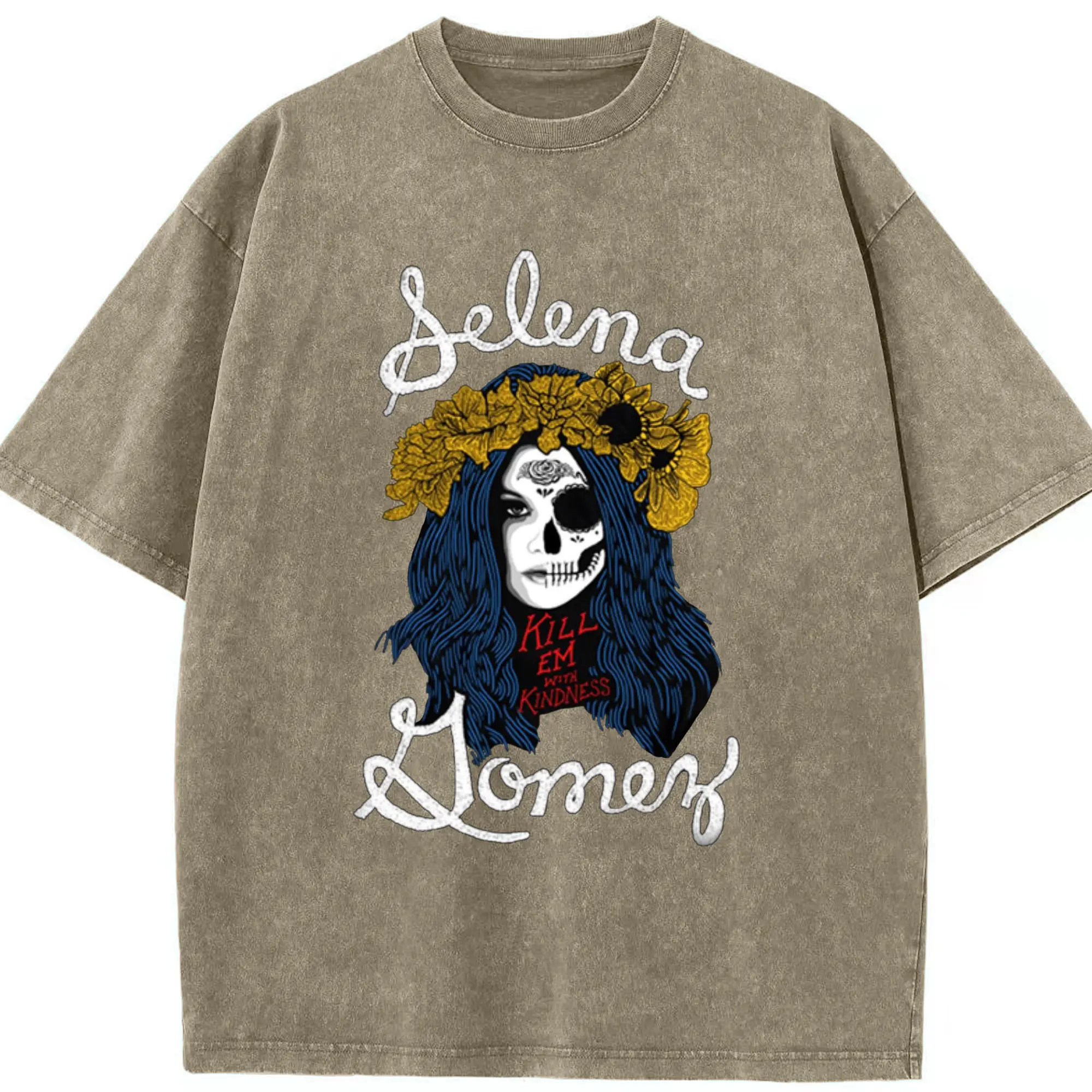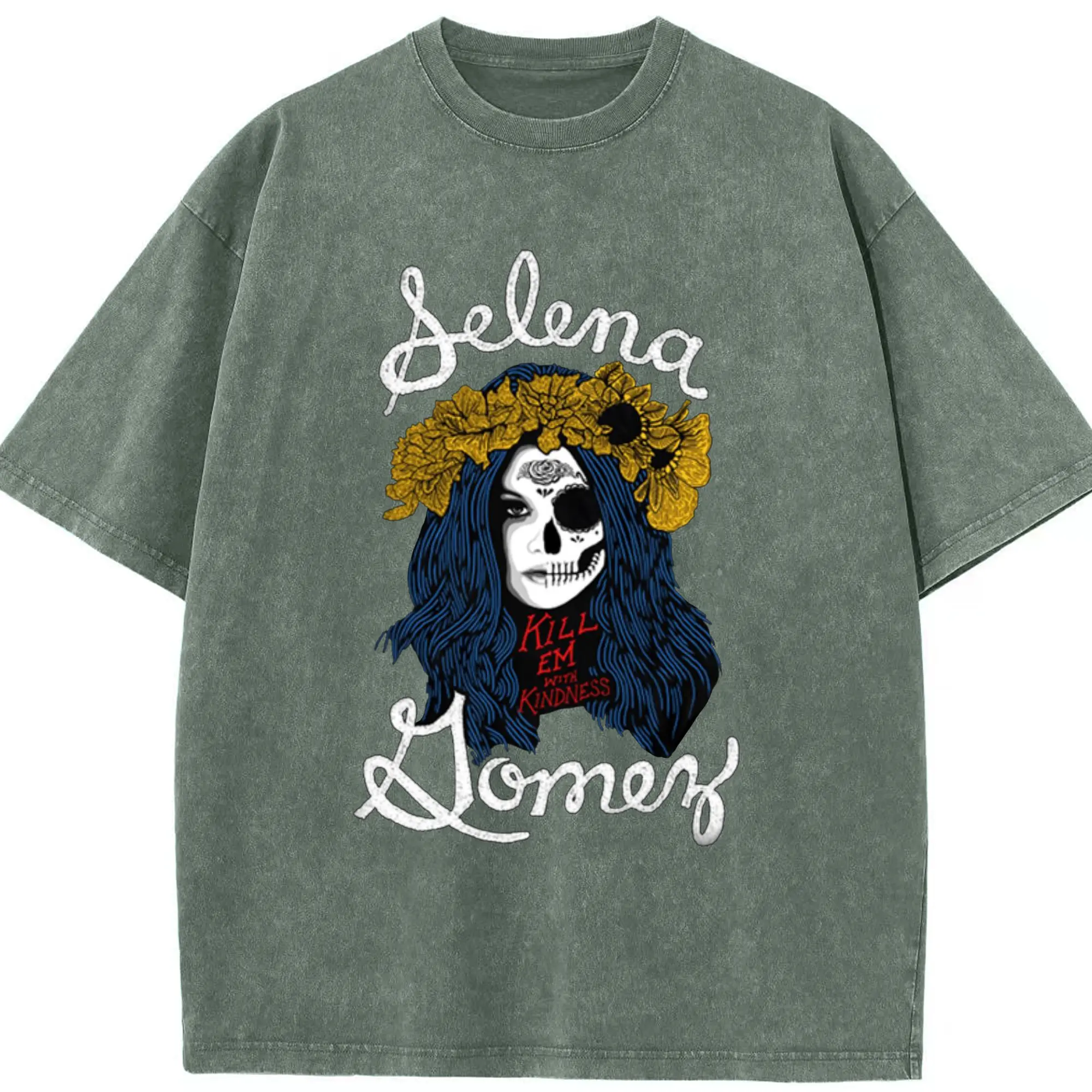 Selena Gomez Dia de los Muertos DIY - Washed Vintage Look 230g Cotton Oversized T-Shirt With Front Heat Transfer Print – Soft, Lightweight, Stylish Fit – Comfortable Casual Wear For Sports & Everyday Use