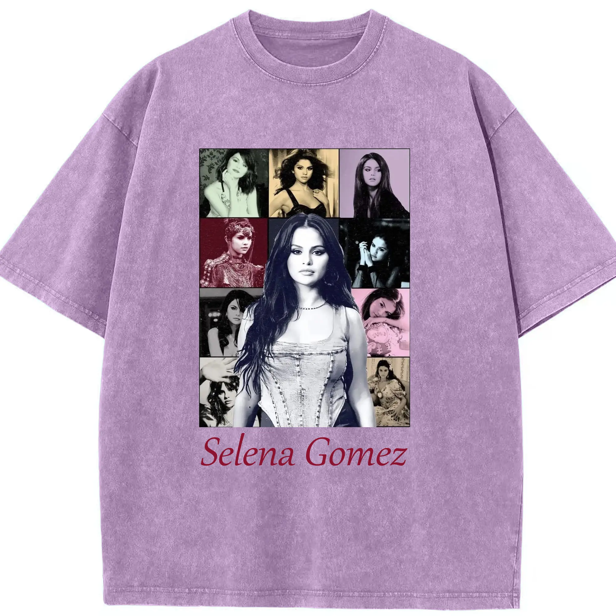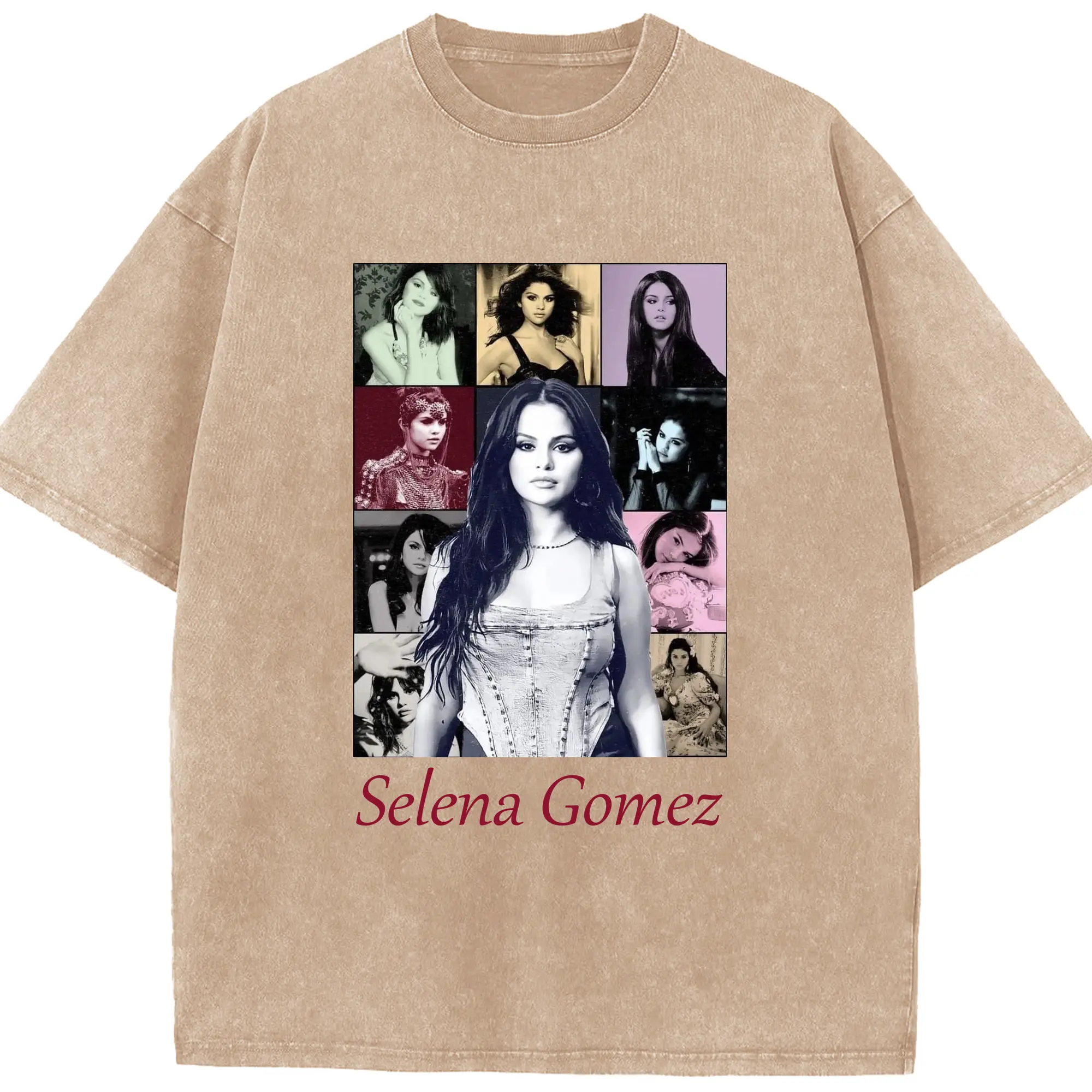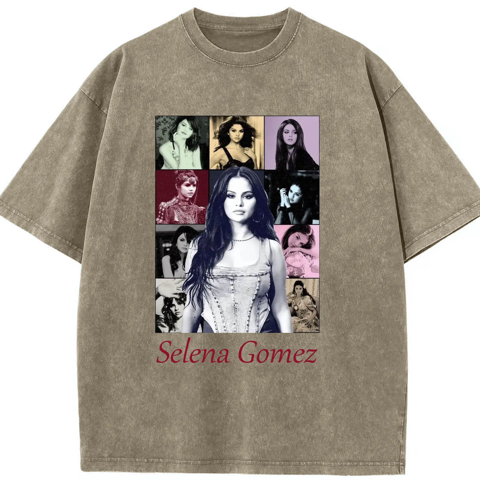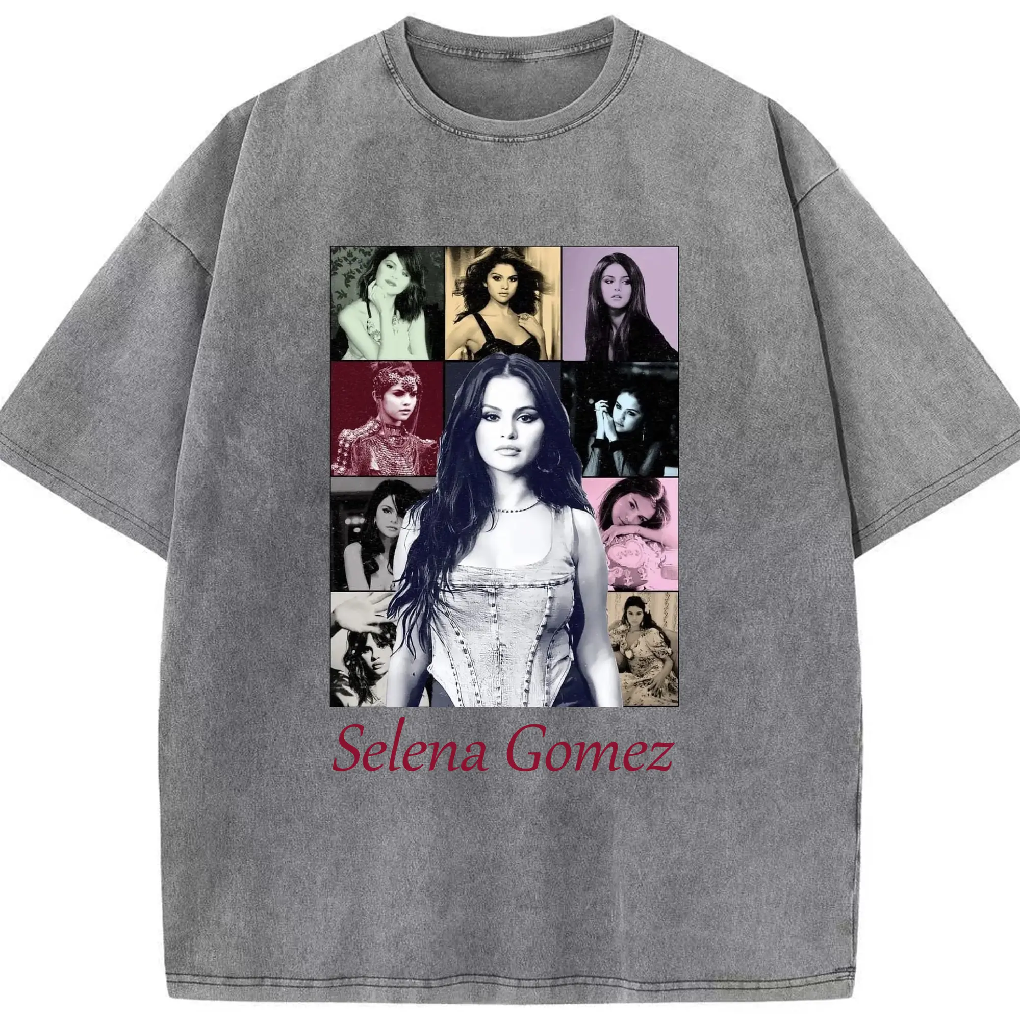Selena Gomez Retro Collage DIY - Washed Vintage Look 230g Cotton Oversized T-Shirt With Front Heat Transfer Print – Soft, Lightweight, Stylish Fit – Comfortable Casual Wear For Sports & Everyday Use