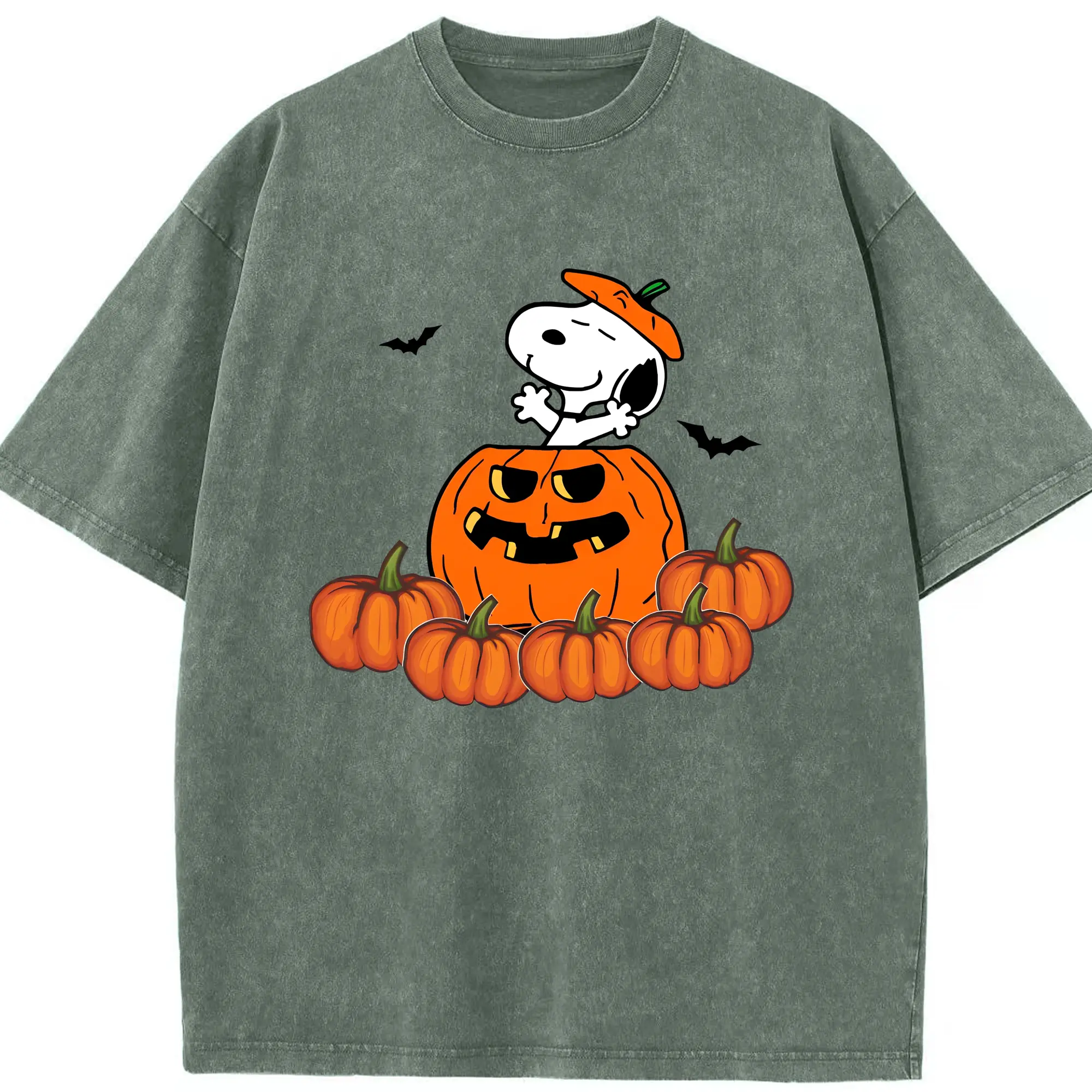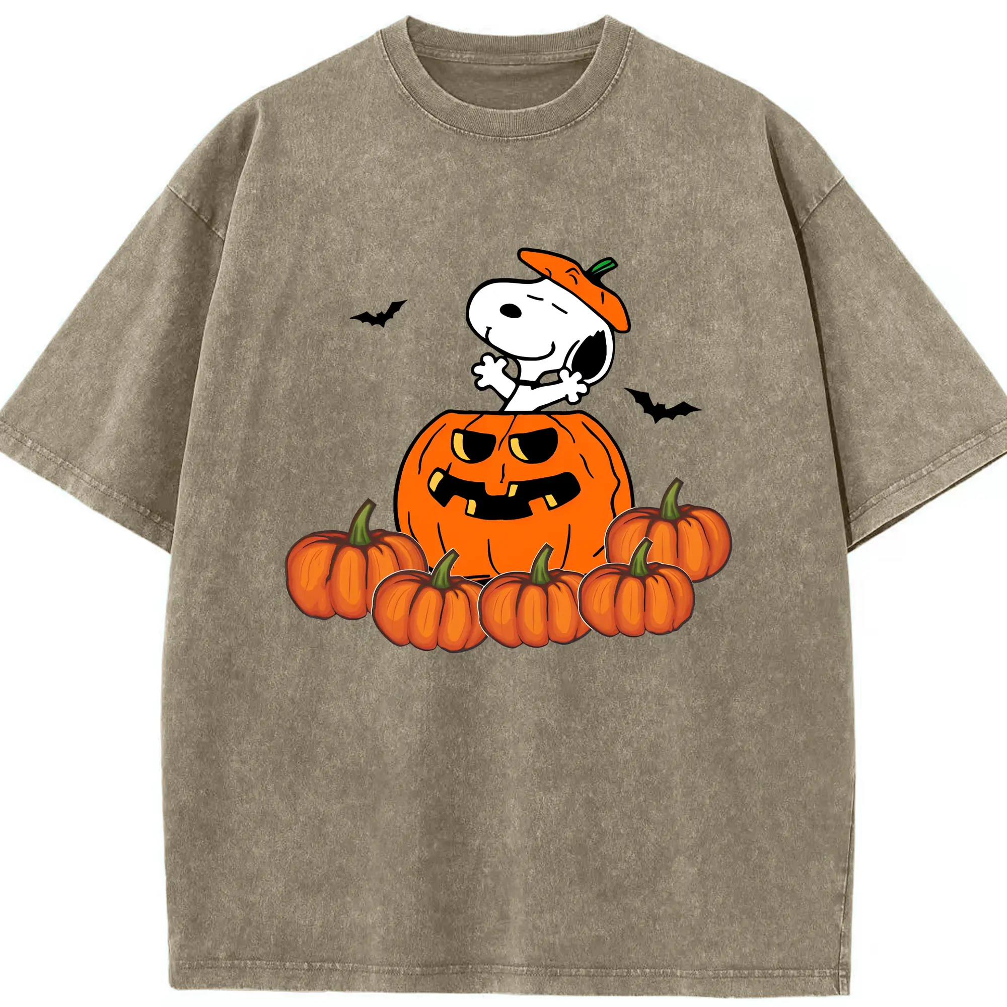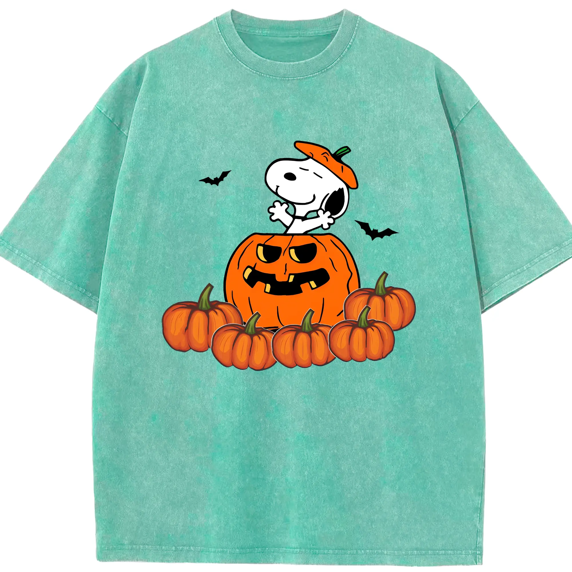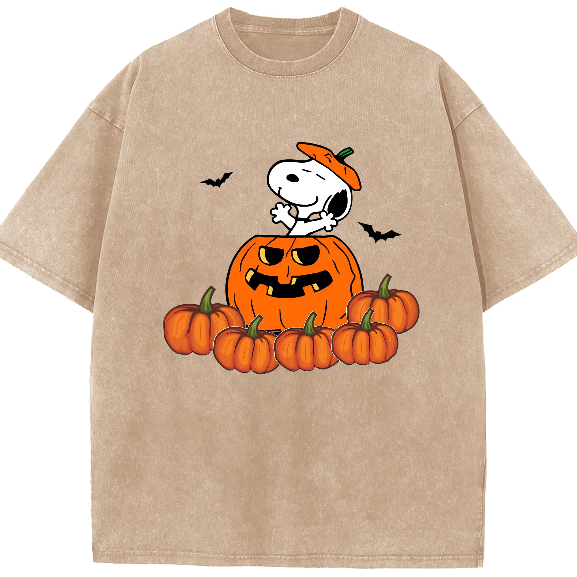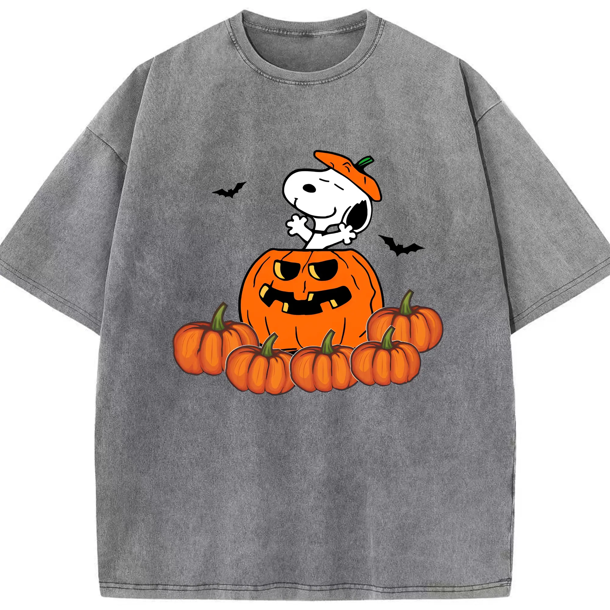 Snoopy Halloween Pumpkin Party - Washed Vintage Look 230g Cotton Oversized T-Shirt With Front Heat Transfer Print – Soft, Lightweight, Stylish Fit – Comfortable Casual Wear For Sports & Everyday Use