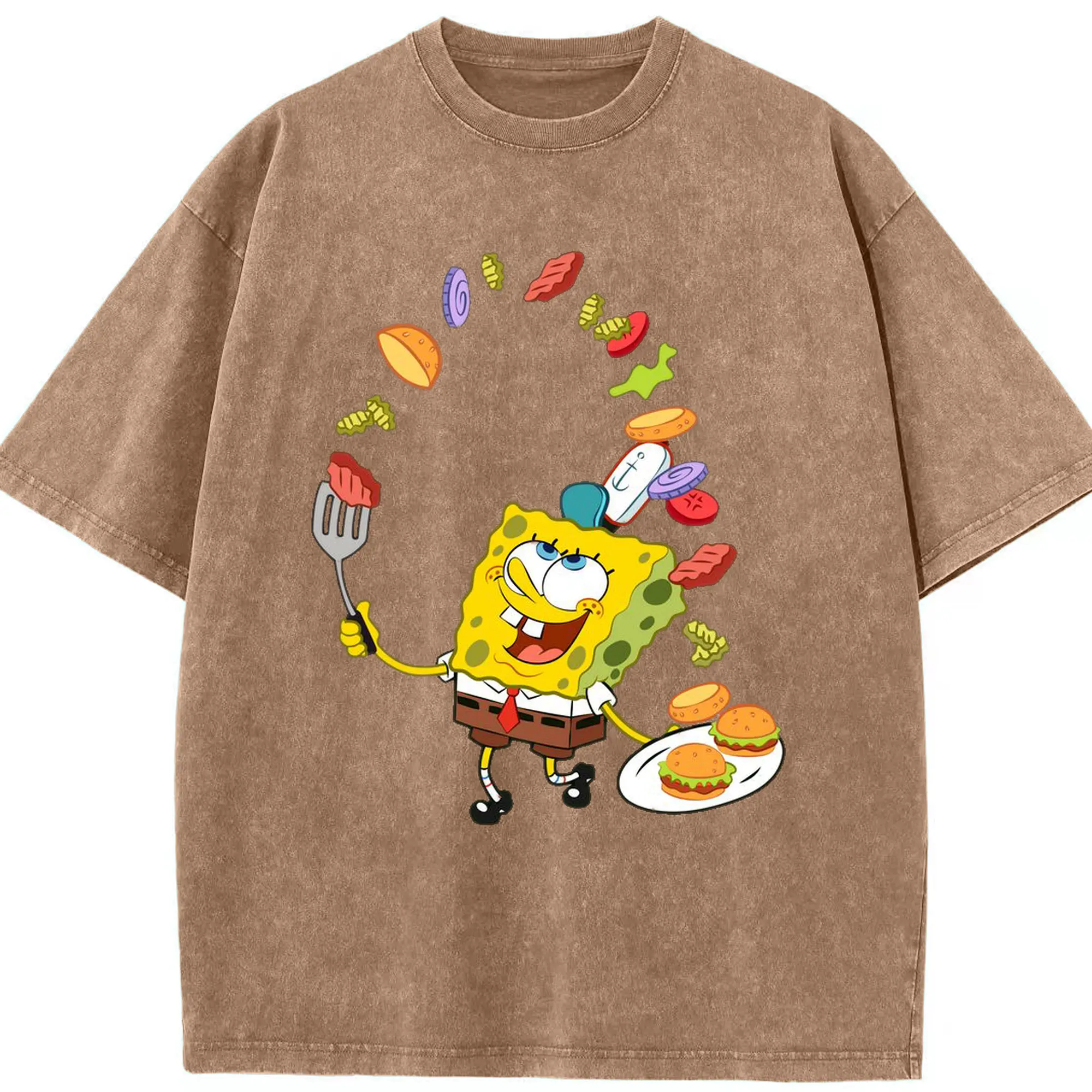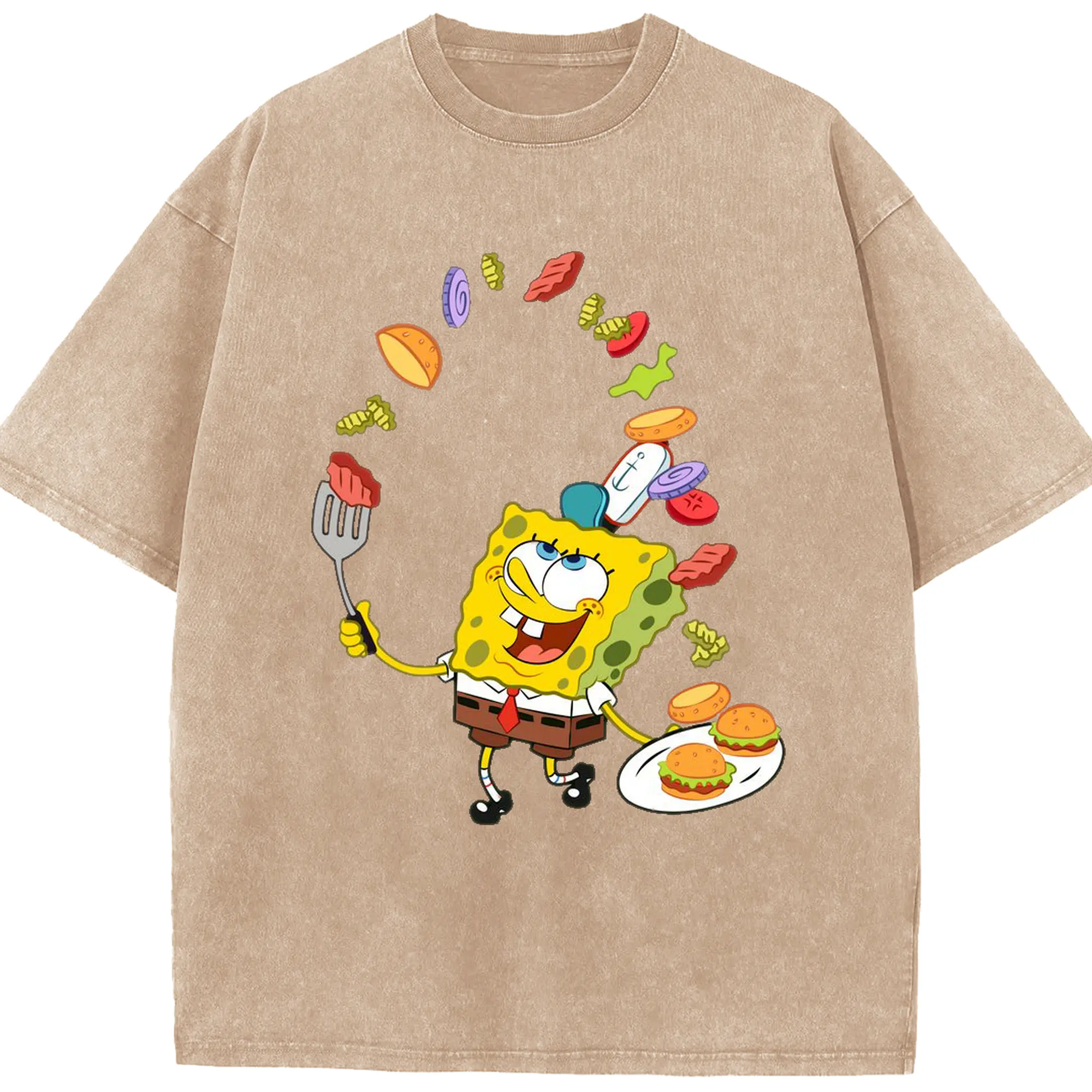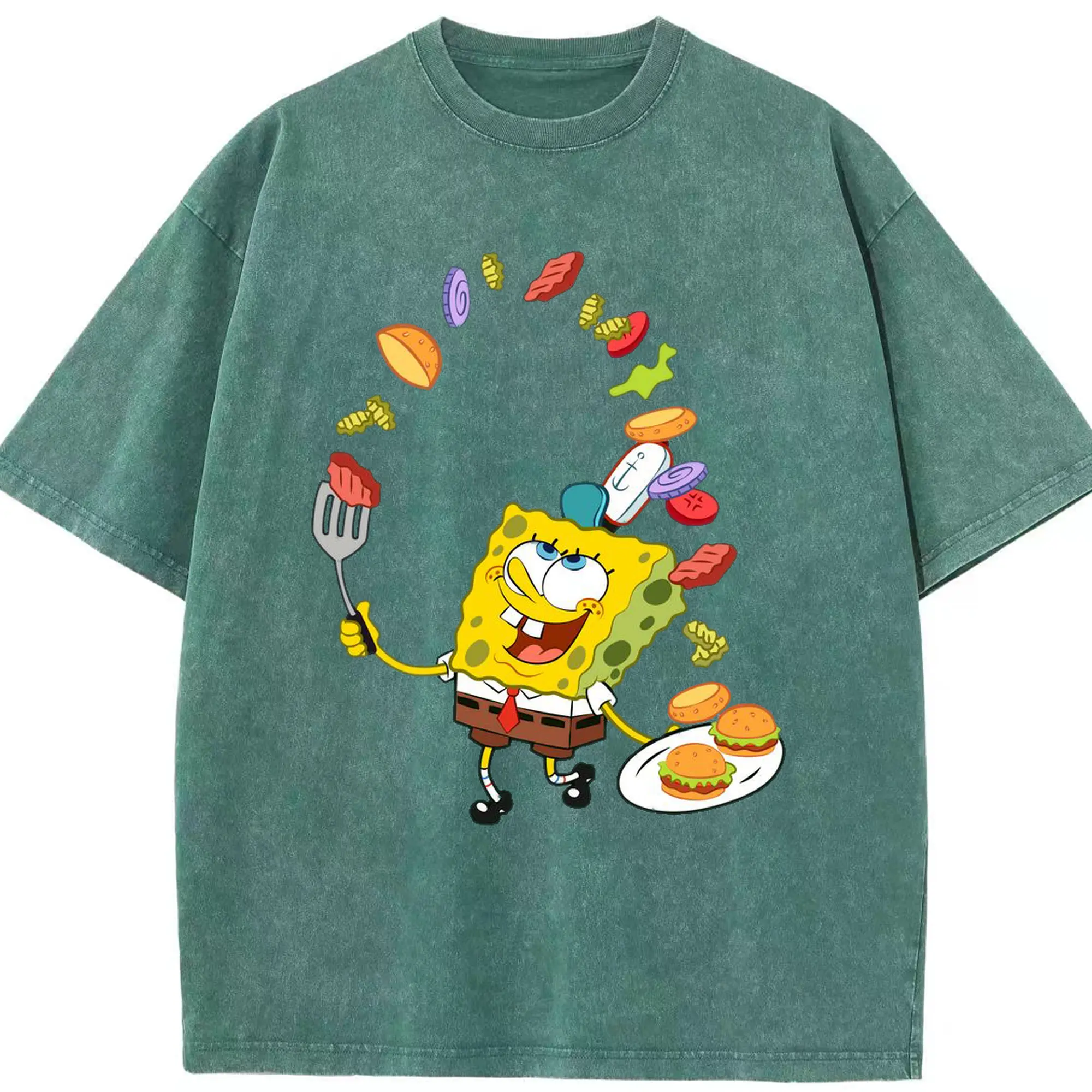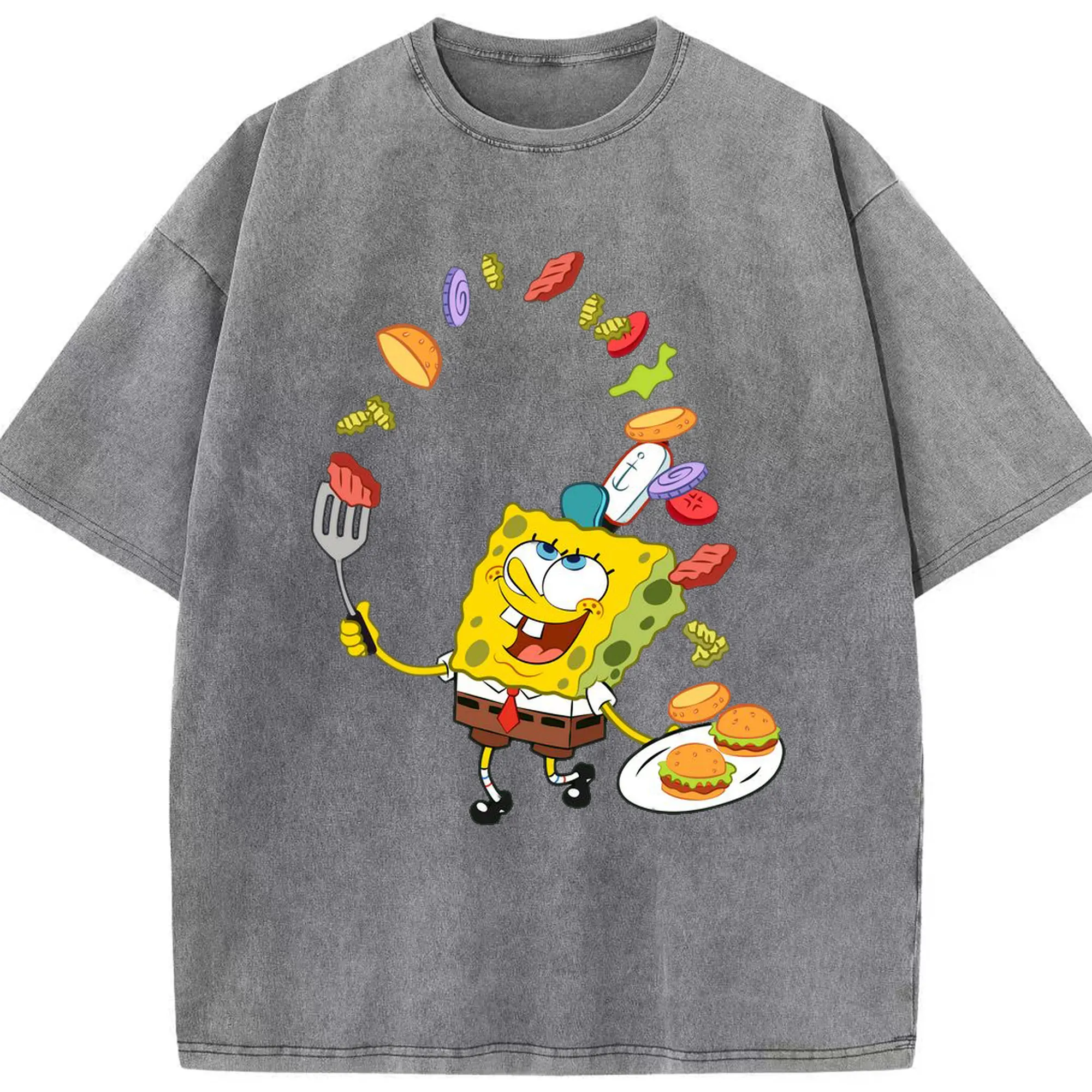 SpongeBob Cooking Krusty Krab Burgers DIY - Washed Vintage Look 230g Cotton Oversized T-Shirt With Front Heat Transfer Print – Soft, Lightweight, Stylish Fit – Comfortable Casual Wear For Sports & Everyday Use