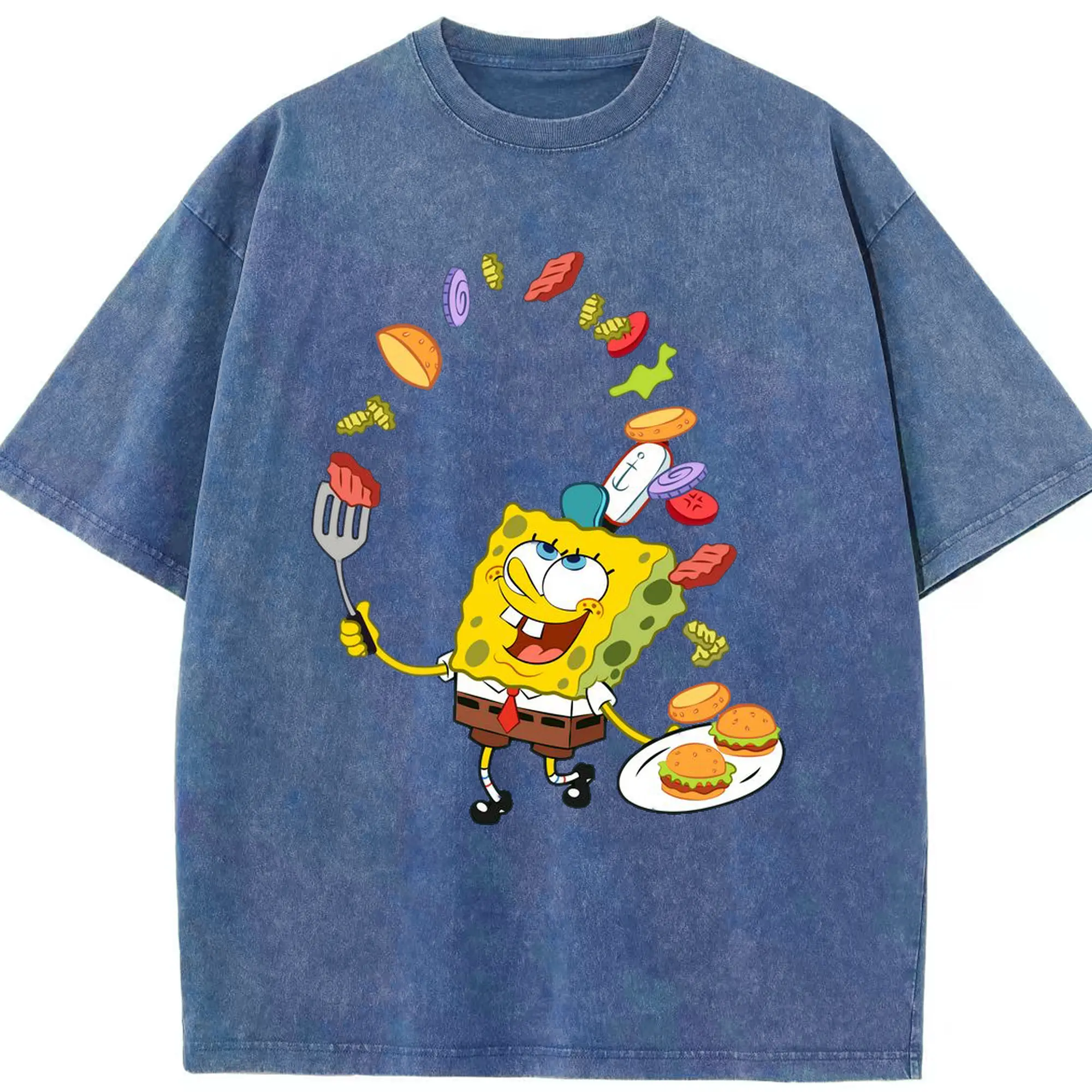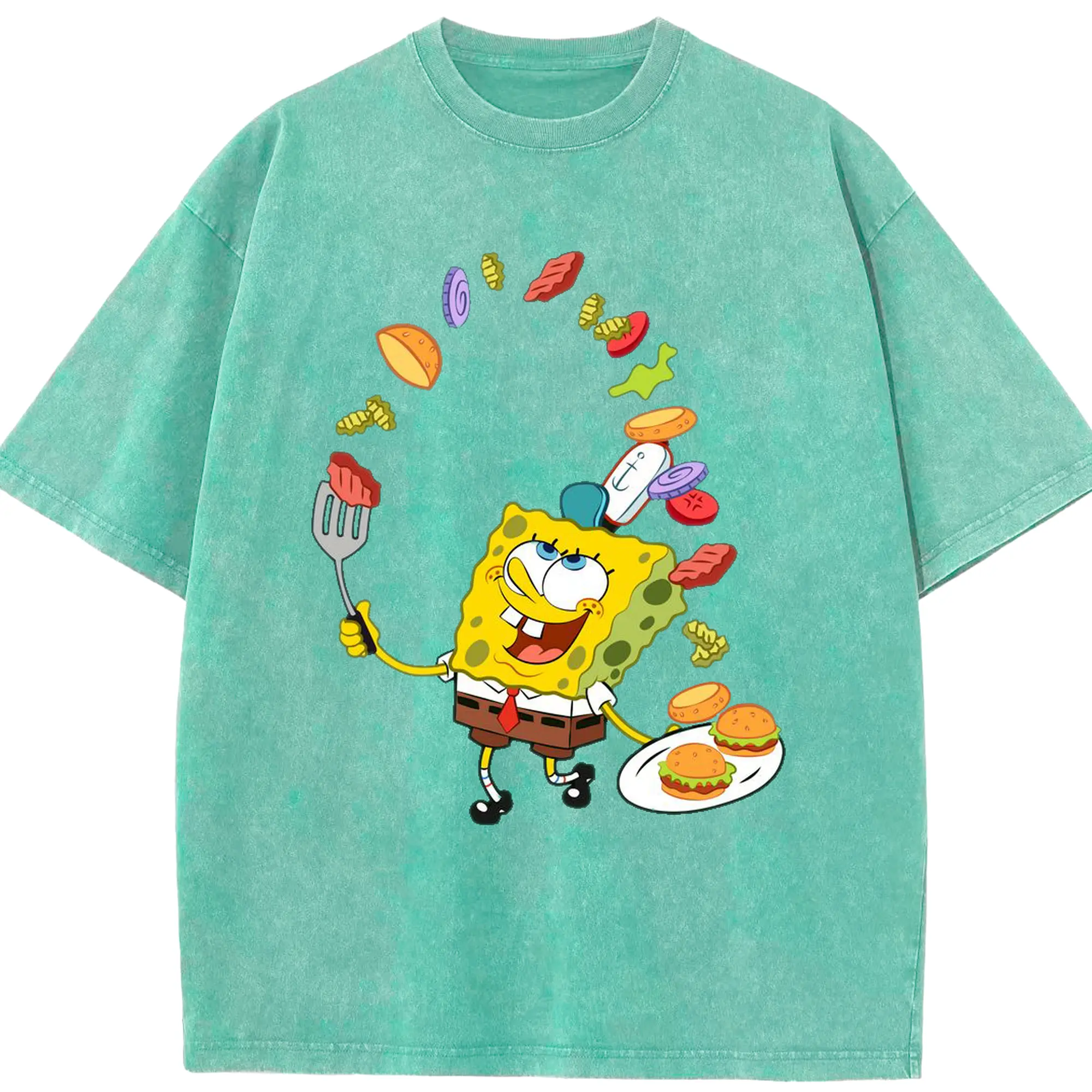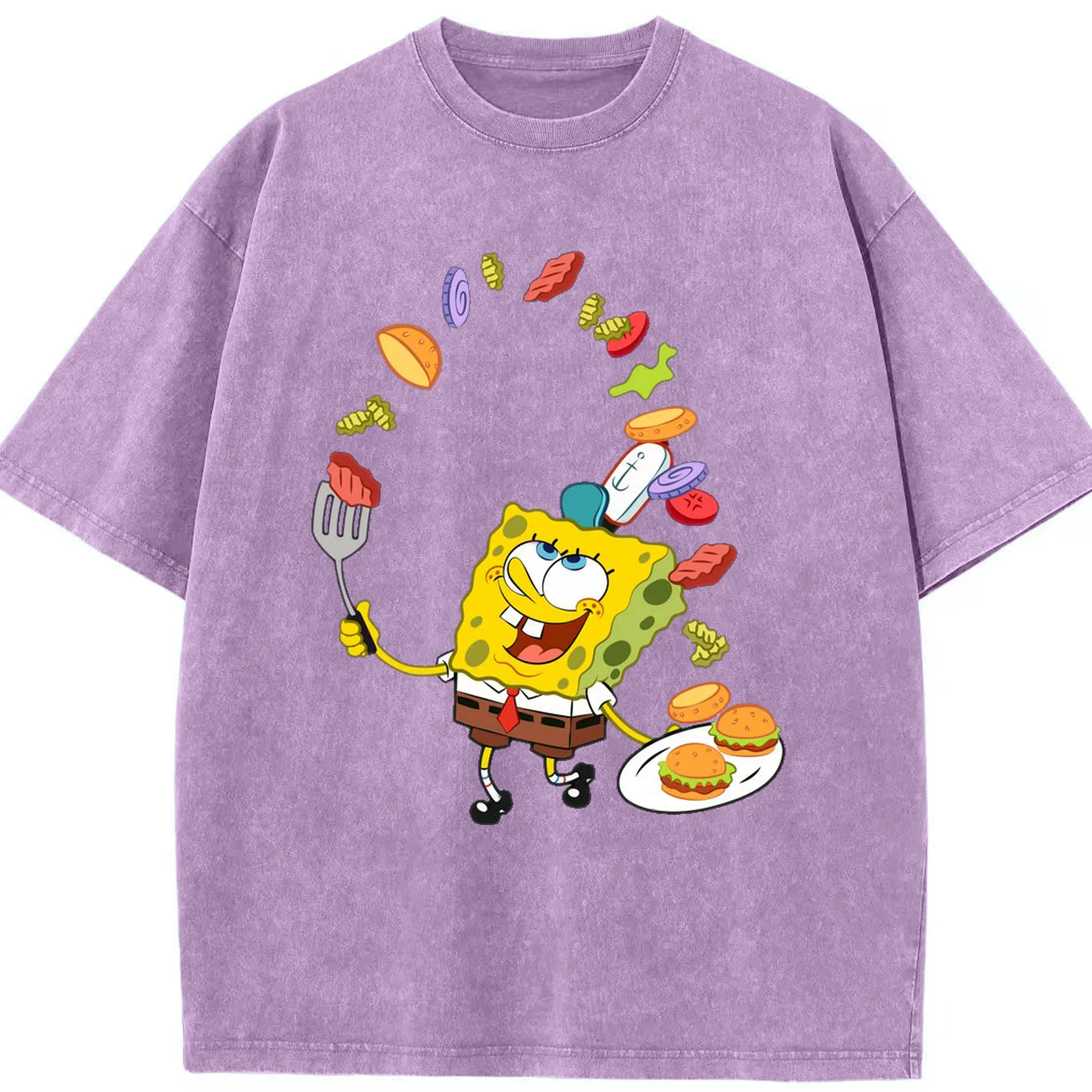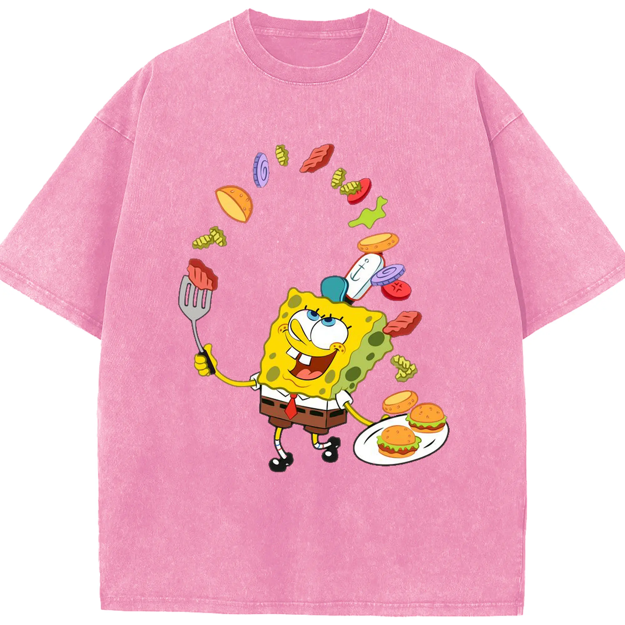 SpongeBob Cooking Krusty Krab Burgers DIY - Washed Vintage Look 230g Cotton Oversized T-Shirt With Front Heat Transfer Print – Soft, Lightweight, Stylish Fit – Comfortable Casual Wear For Sports & Everyday Use