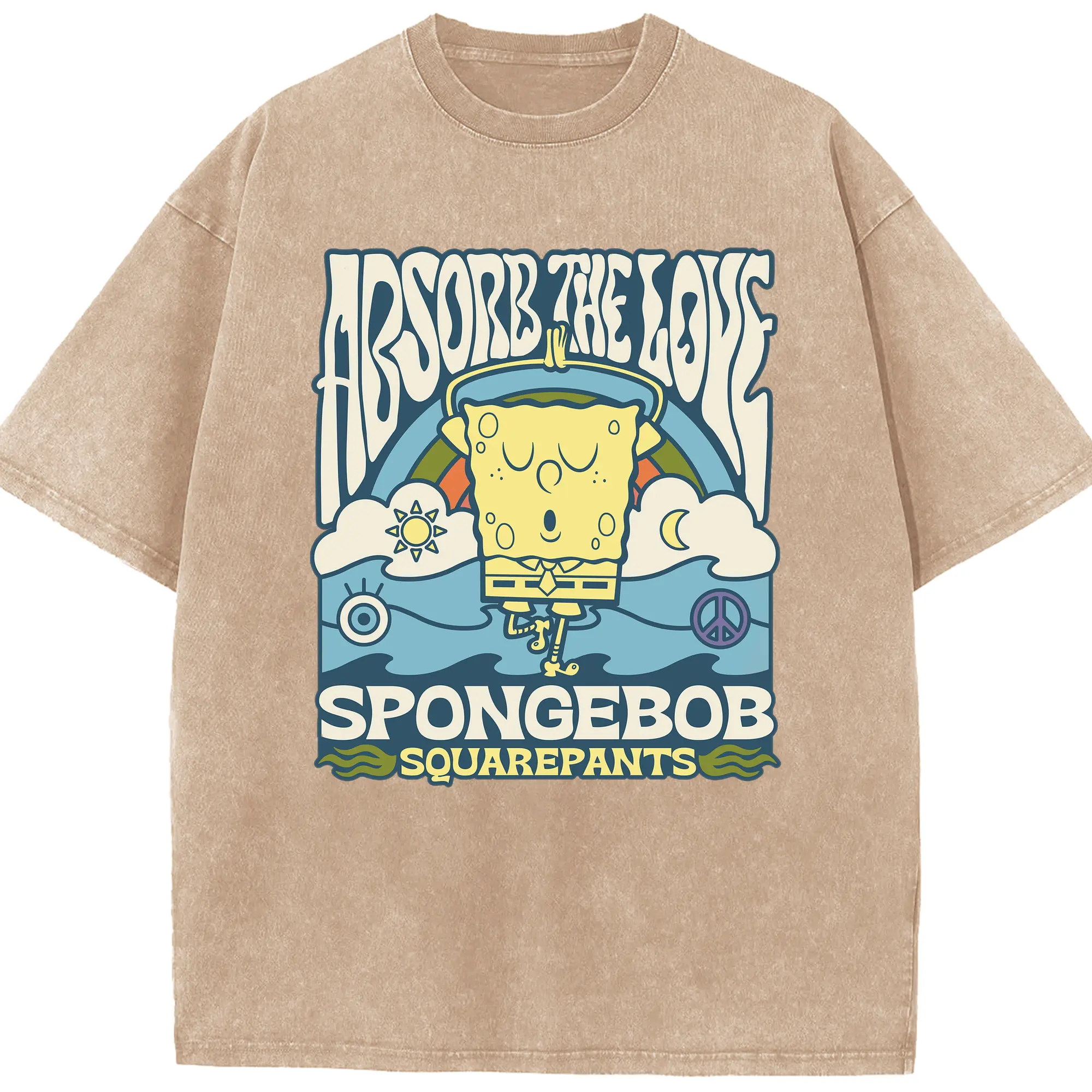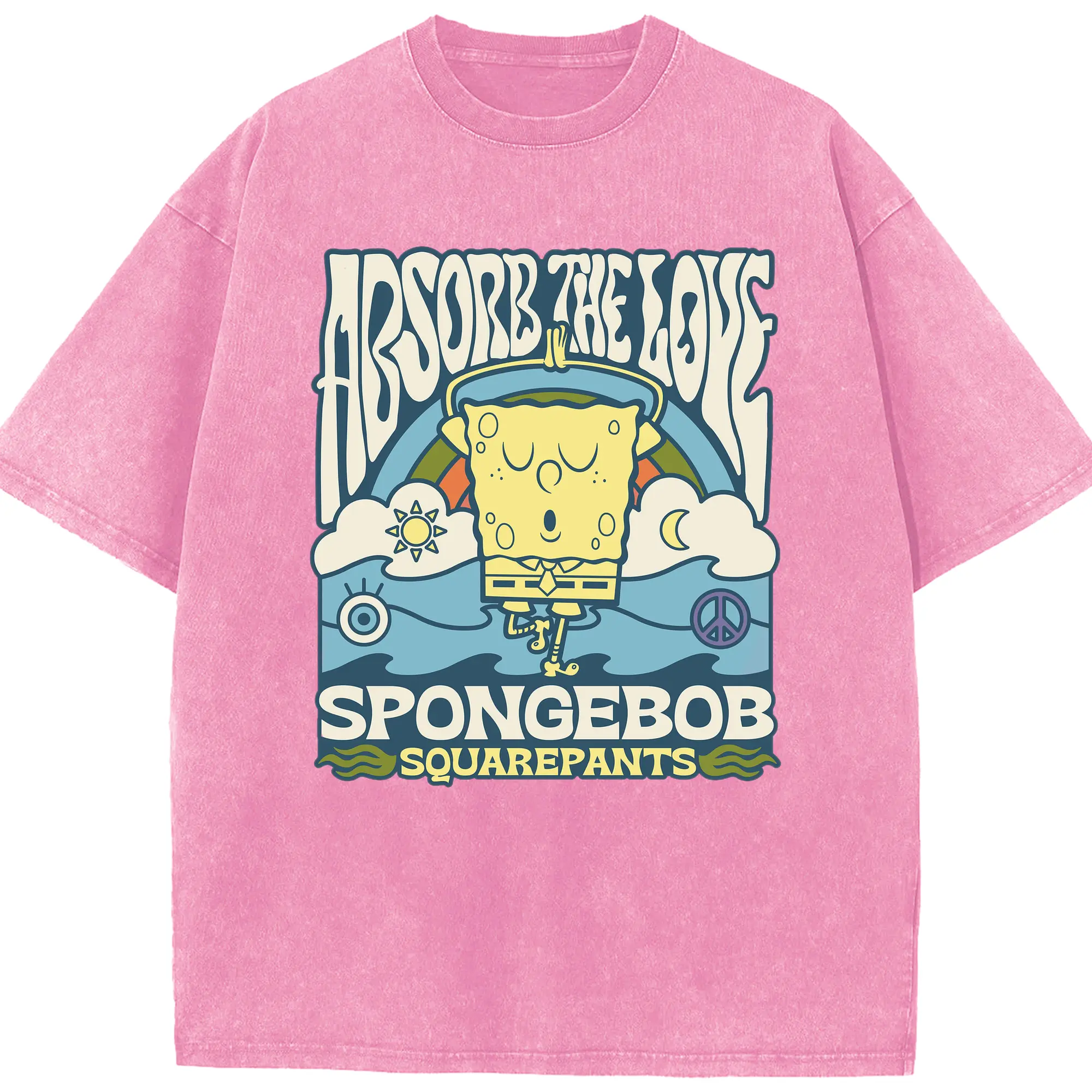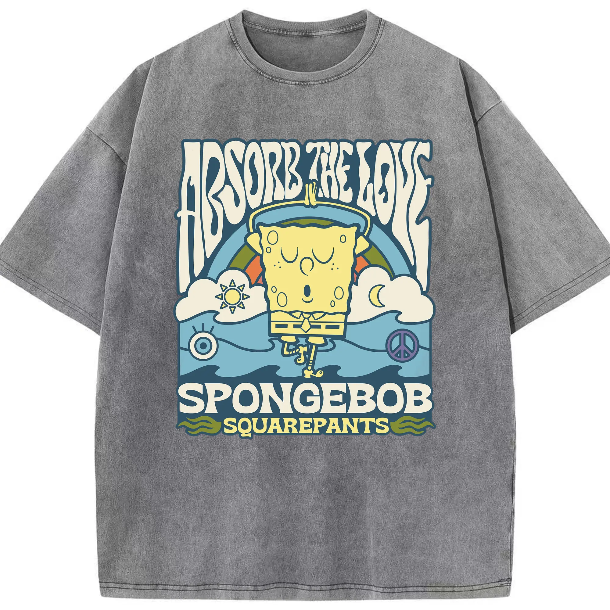 SpongeBob Retro Psychedelic Absorb The Love DIY - Washed Vintage Look 230g Cotton Oversized T-Shirt With Front Heat Transfer Print – Soft, Lightweight, Stylish Fit – Comfortable Casual Wear For Sports & Everyday Use