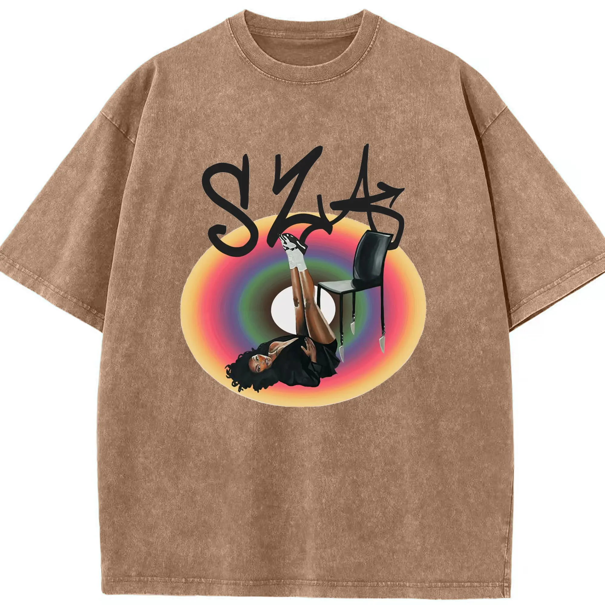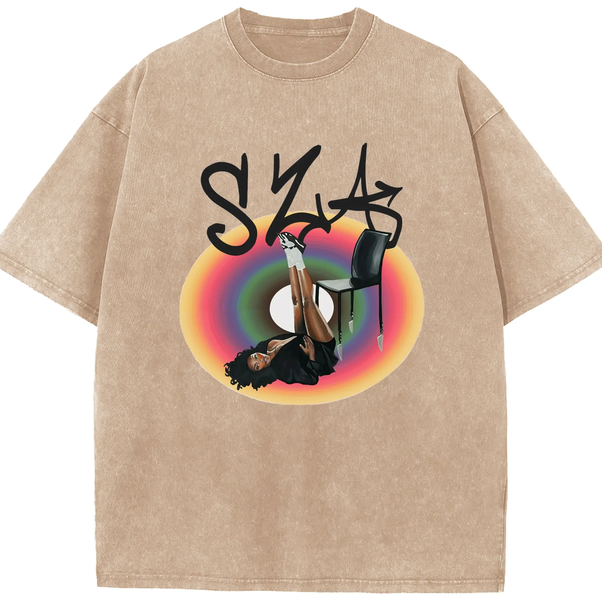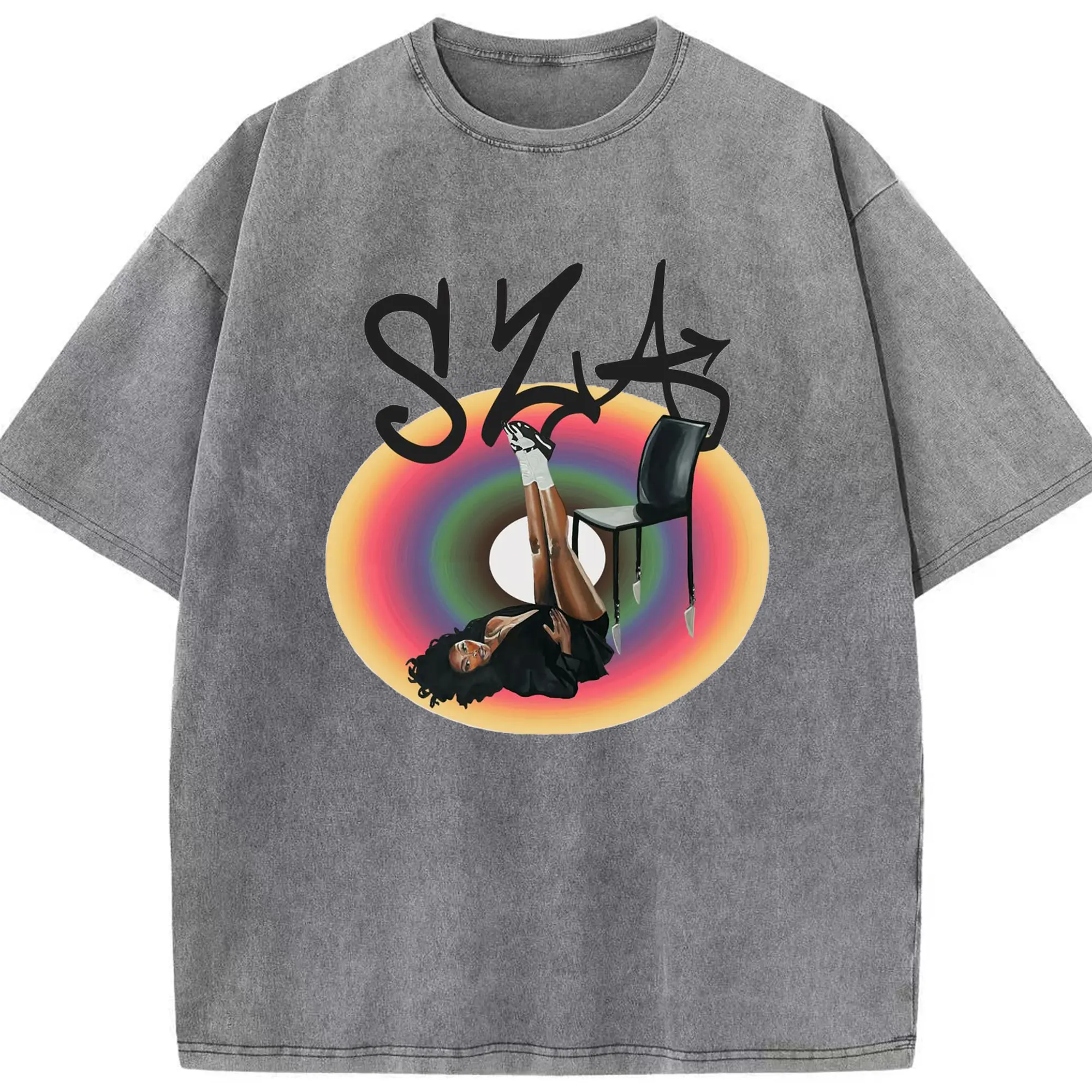 “SZA Rainbow Gradient” Music Art DIY Shirt - Washed Vintage Look 230g Cotton Oversized T-Shirt With Front Heat Transfer Print – Soft, Lightweight, Stylish Fit – Comfortable Casual Wear For Sports & Everyday Use