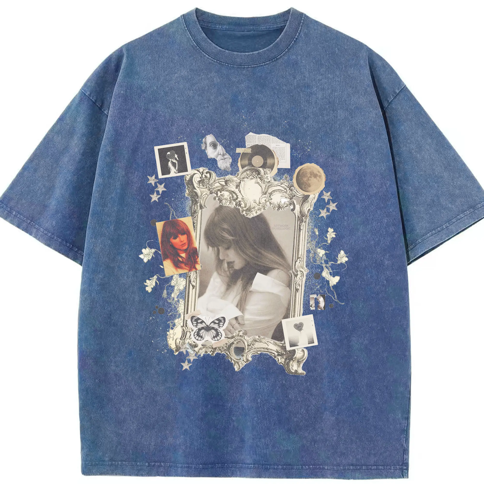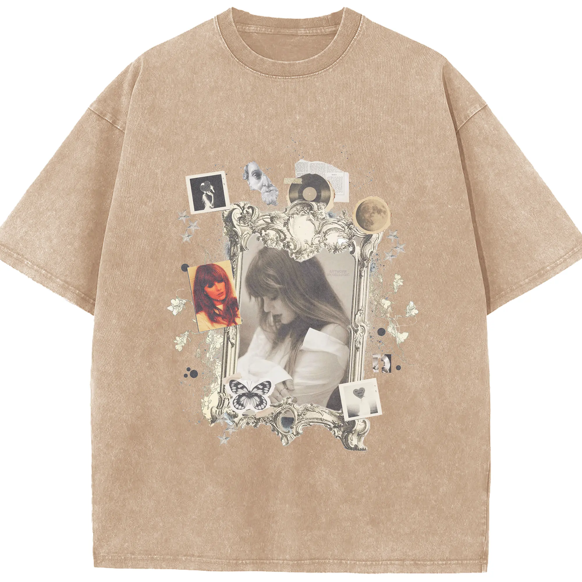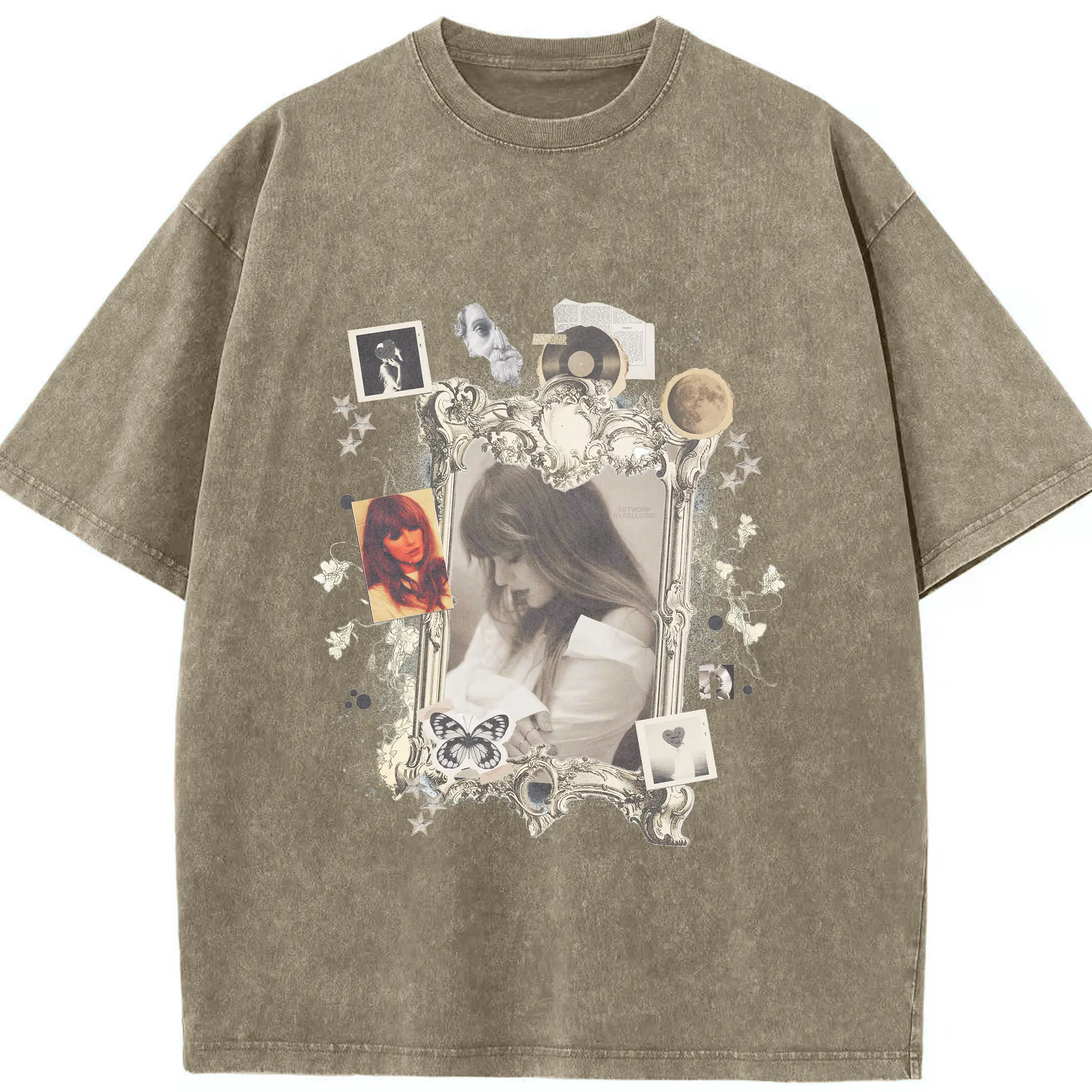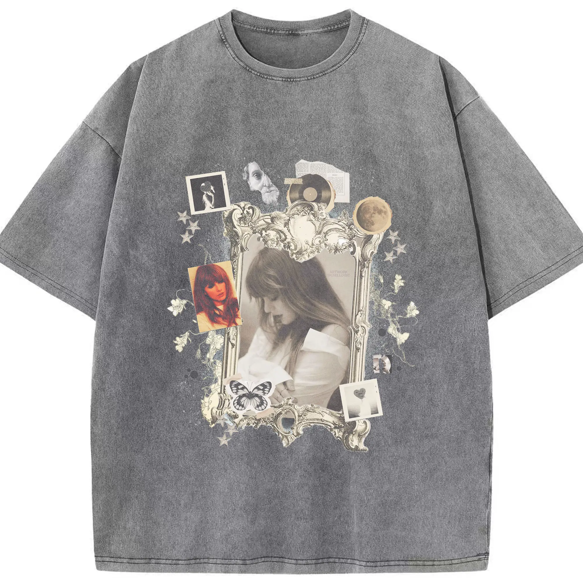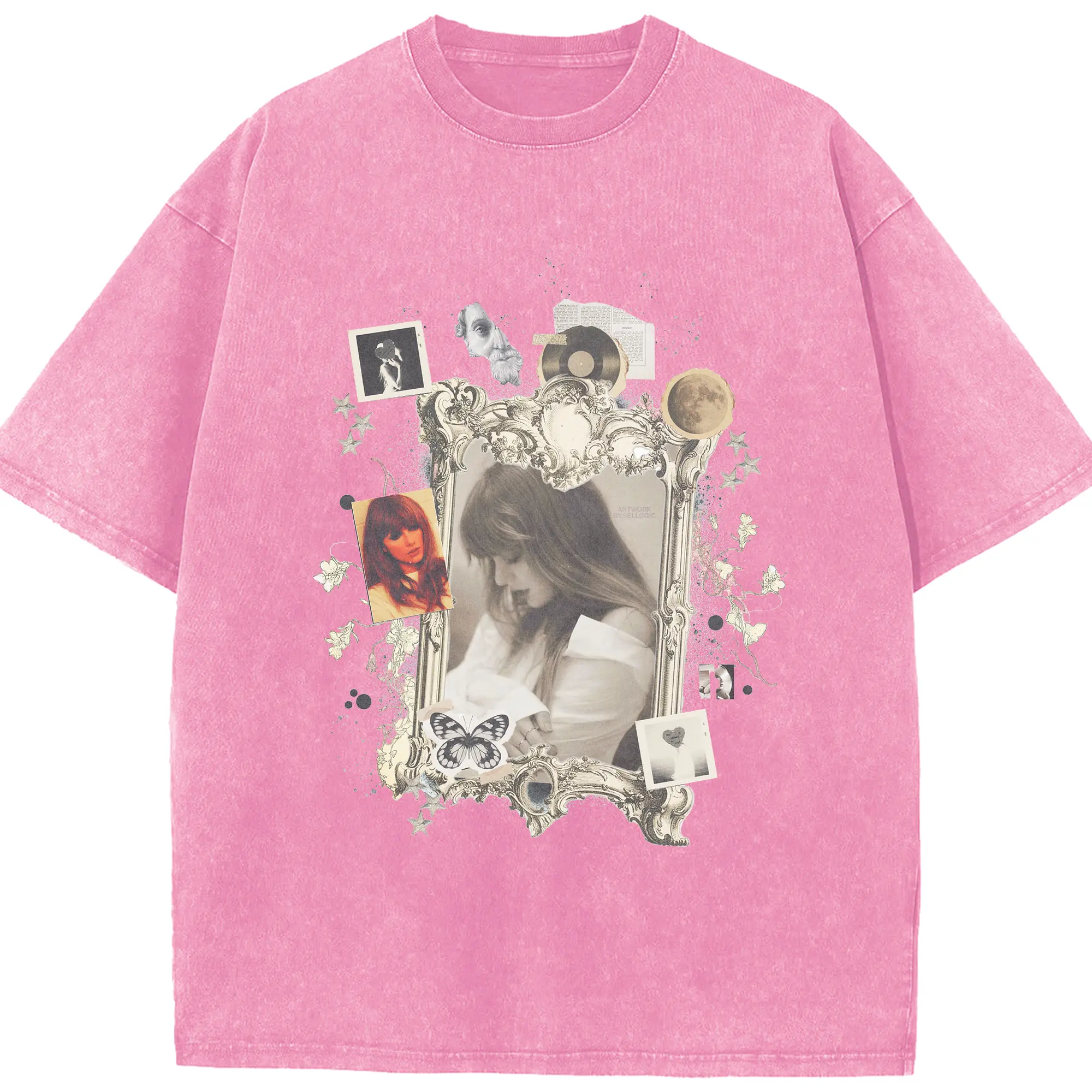 Taylor Swift Dreamy Romantic Texture Ornate Frame Collage DIY - Washed Vintage Look 230g Cotton Oversized T-Shirt With Front Heat Transfer Print – Soft, Lightweight, Stylish Fit – Comfortable Casual Wear For Sports & Everyday Use