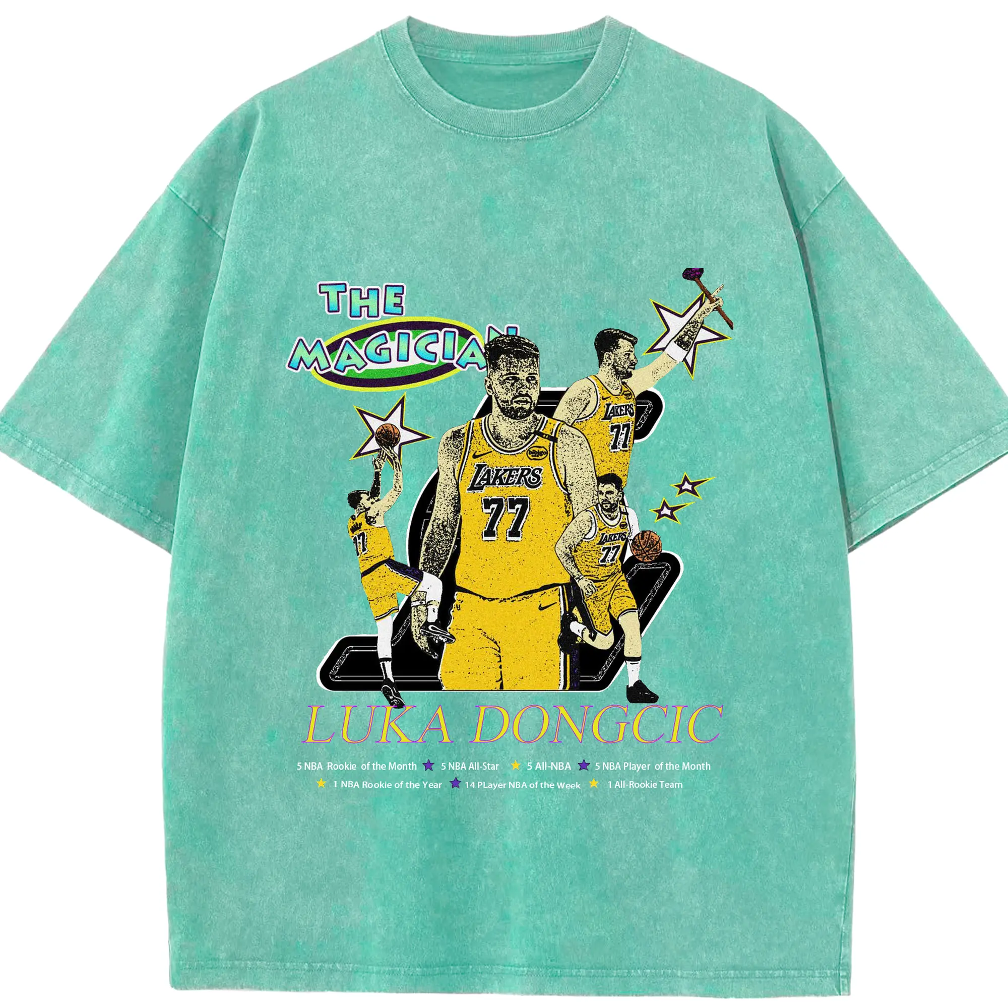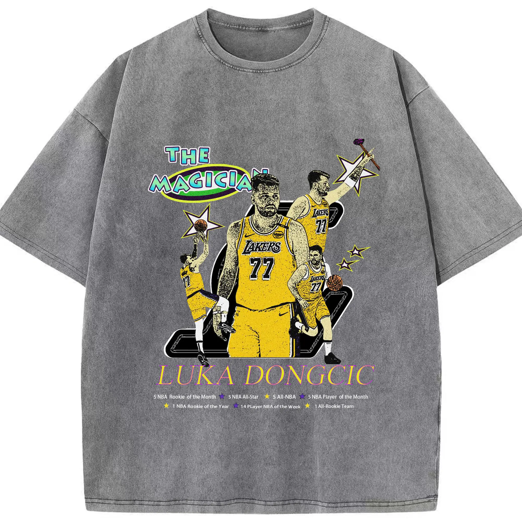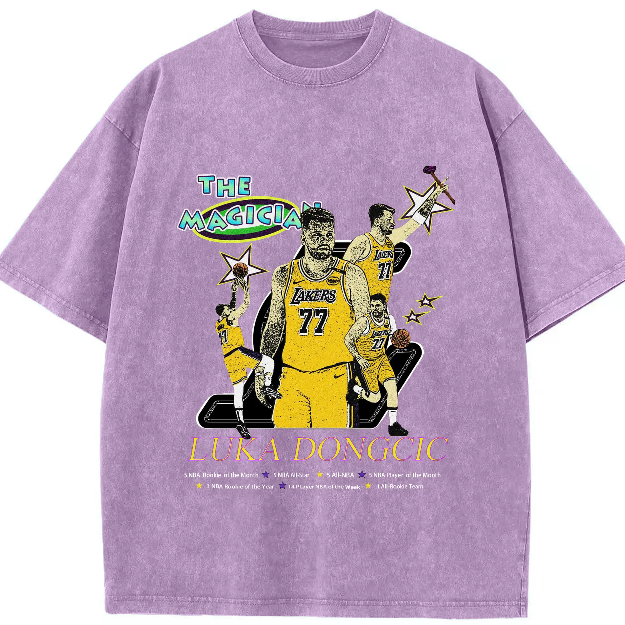 The Magician Luka Dončić Lakers 77 Jersey Shirt - Washed Vintage Look 230g Cotton Oversized T-Shirt With Front Heat Transfer Print – Soft, Lightweight, Stylish Fit – Comfortable Casual Wear For Sports & Everyday Use