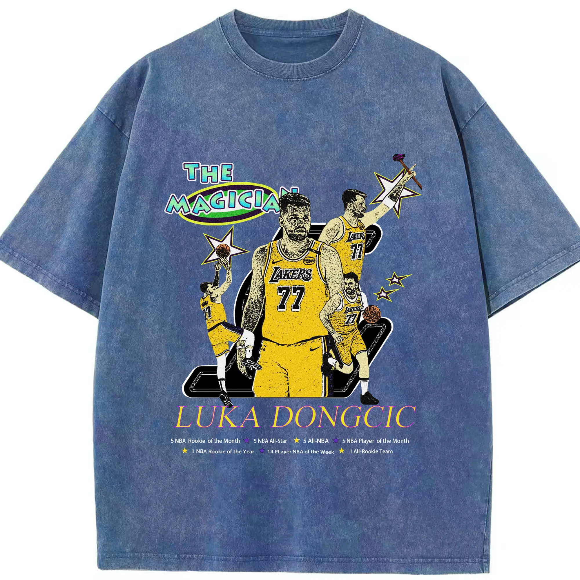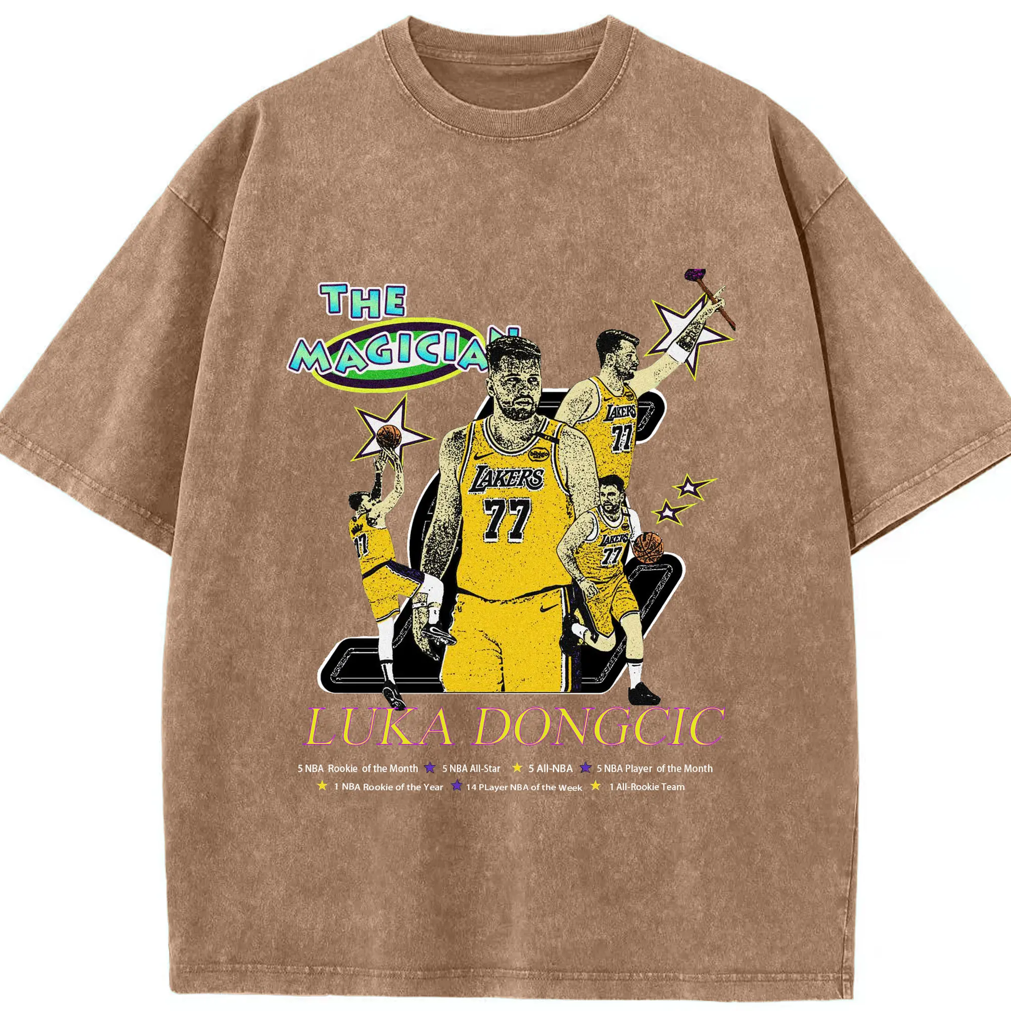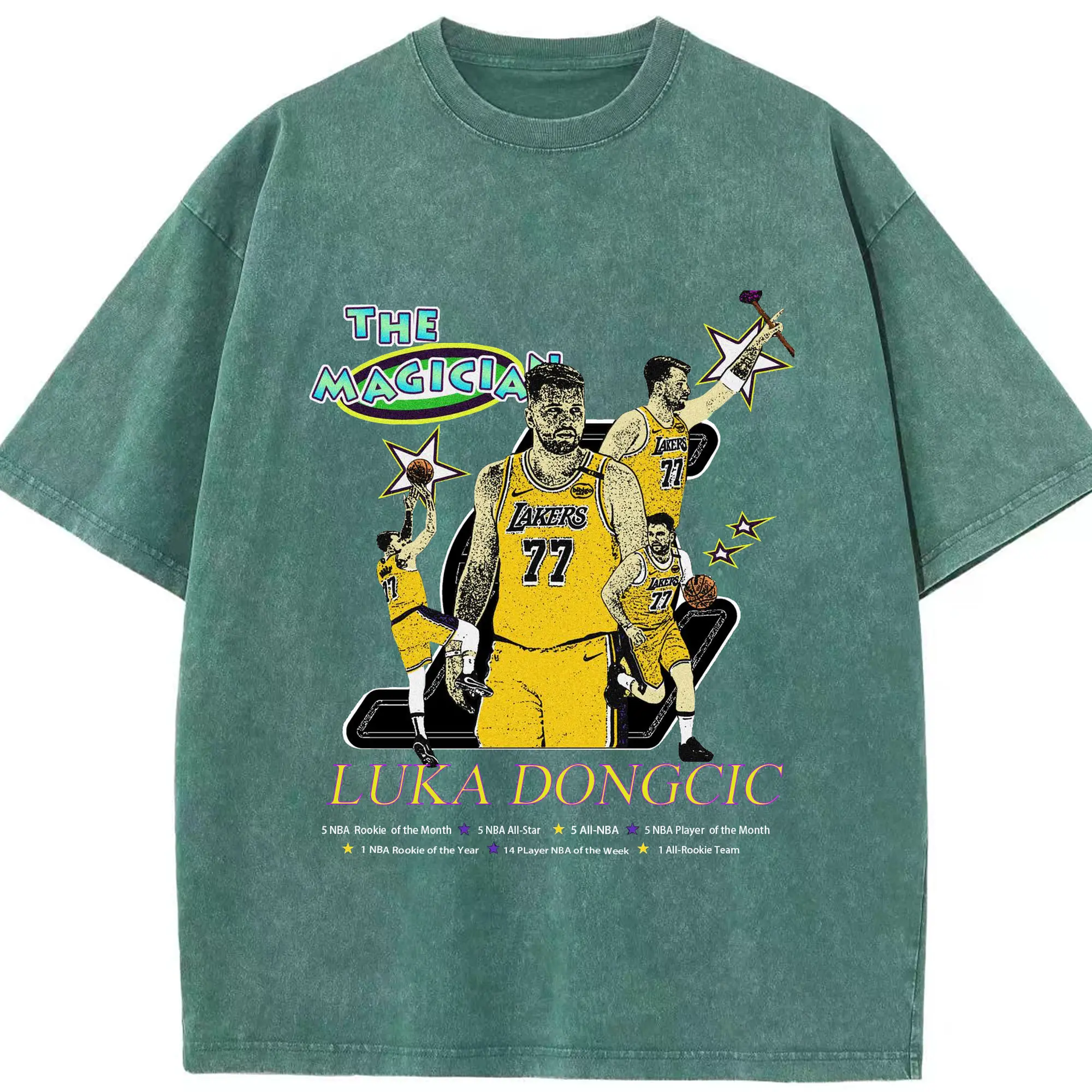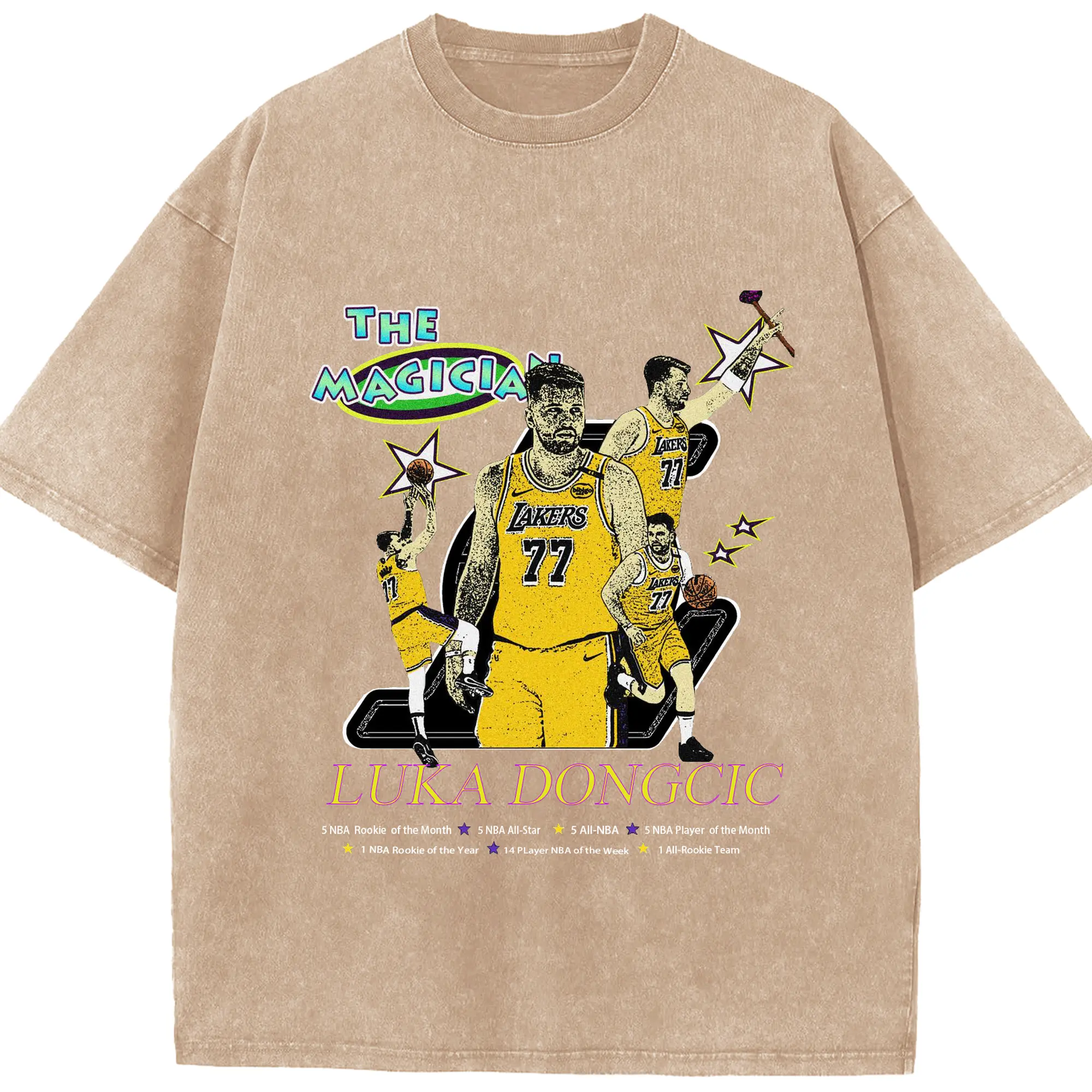 The Magician Luka Dončić Lakers 77 Jersey Shirt - Washed Vintage Look 230g Cotton Oversized T-Shirt With Front Heat Transfer Print – Soft, Lightweight, Stylish Fit – Comfortable Casual Wear For Sports & Everyday Use