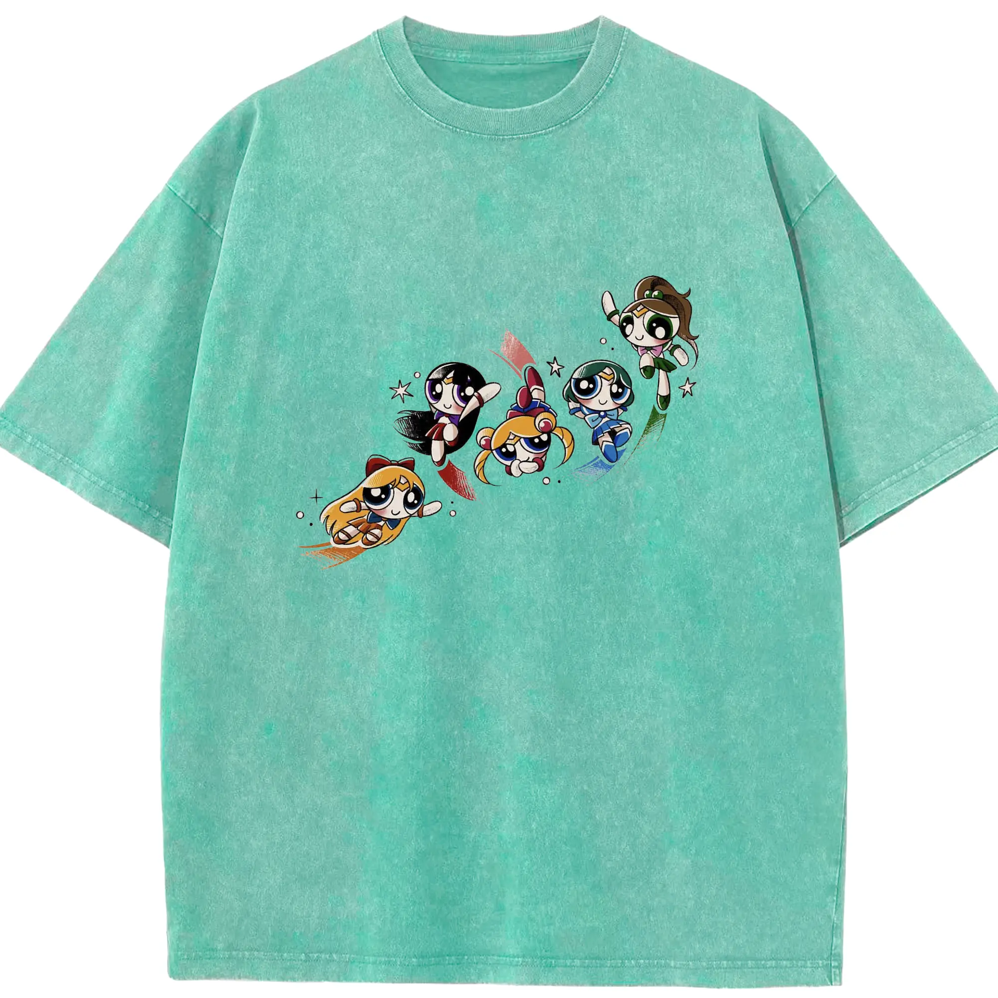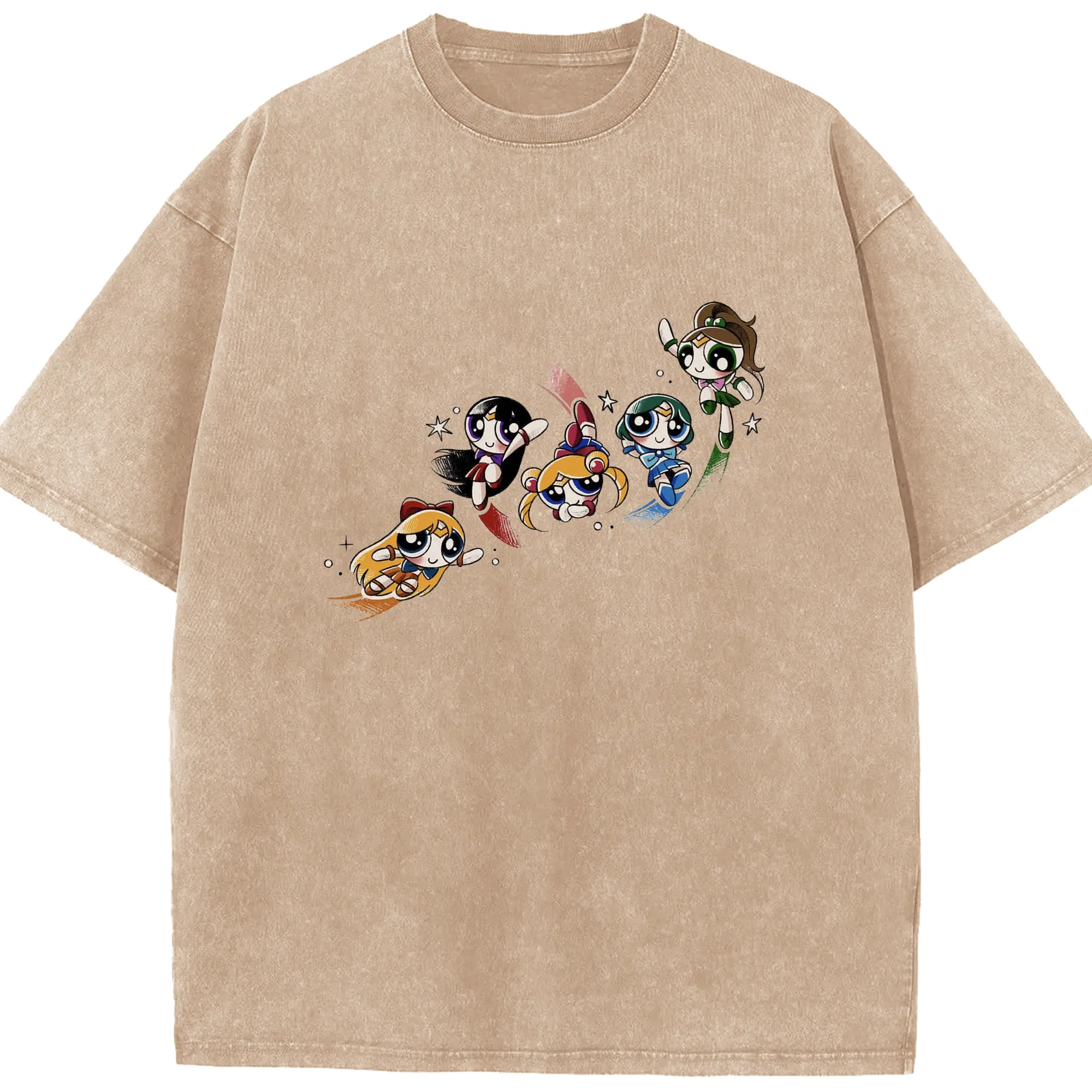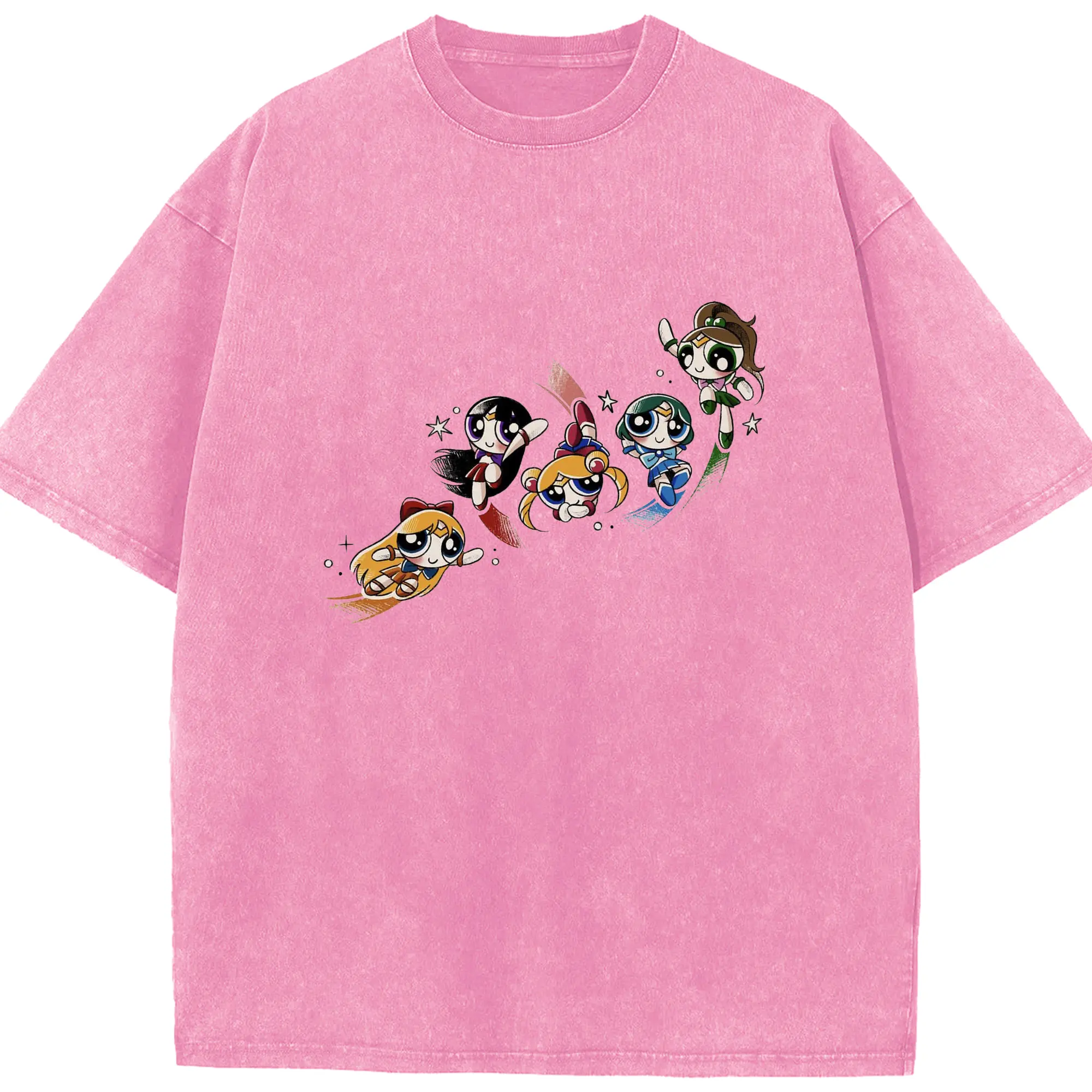 The Powerpuff Girls x Sailor Moon Crossover DIY Shirt - Washed Vintage Look 230g Cotton Oversized T-Shirt With Front Heat Transfer Print – Soft, Lightweight, Stylish Fit – Comfortable Casual Wear For Sports & Everyday Use