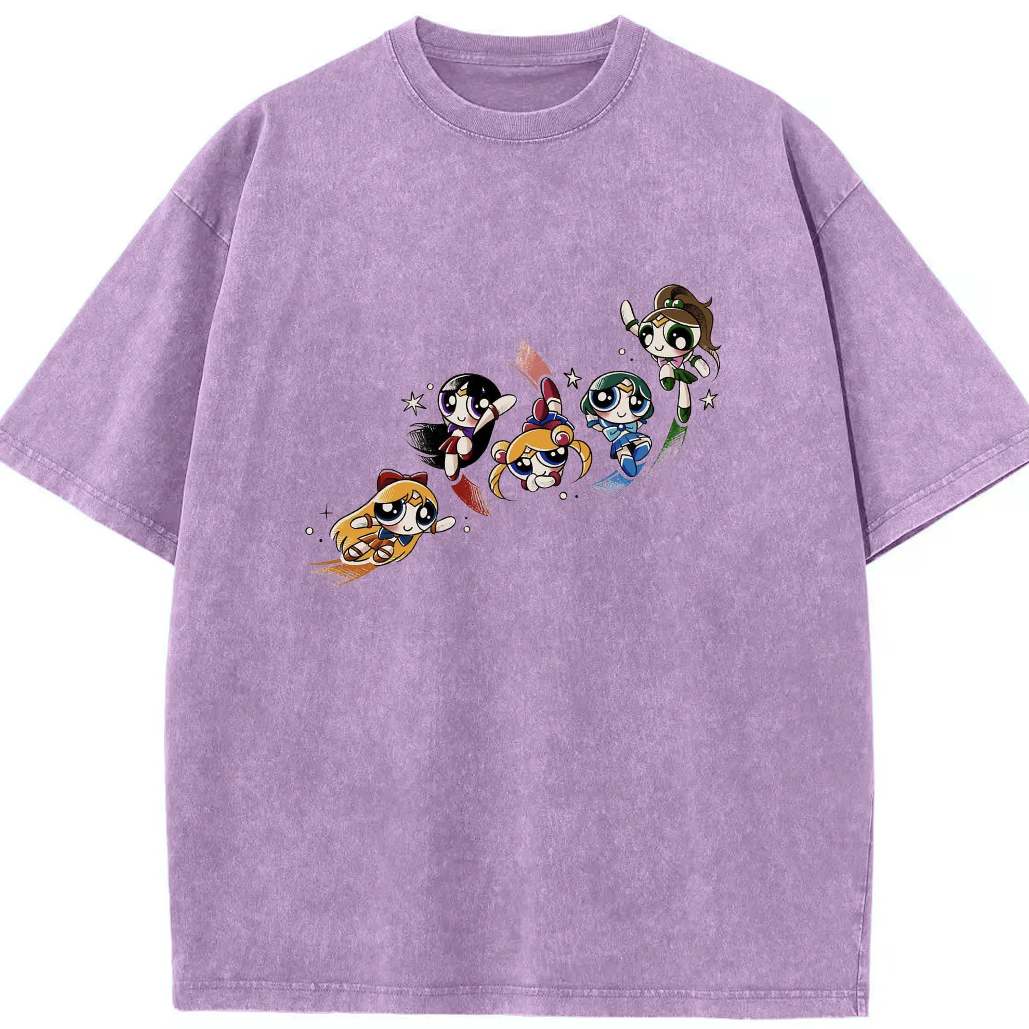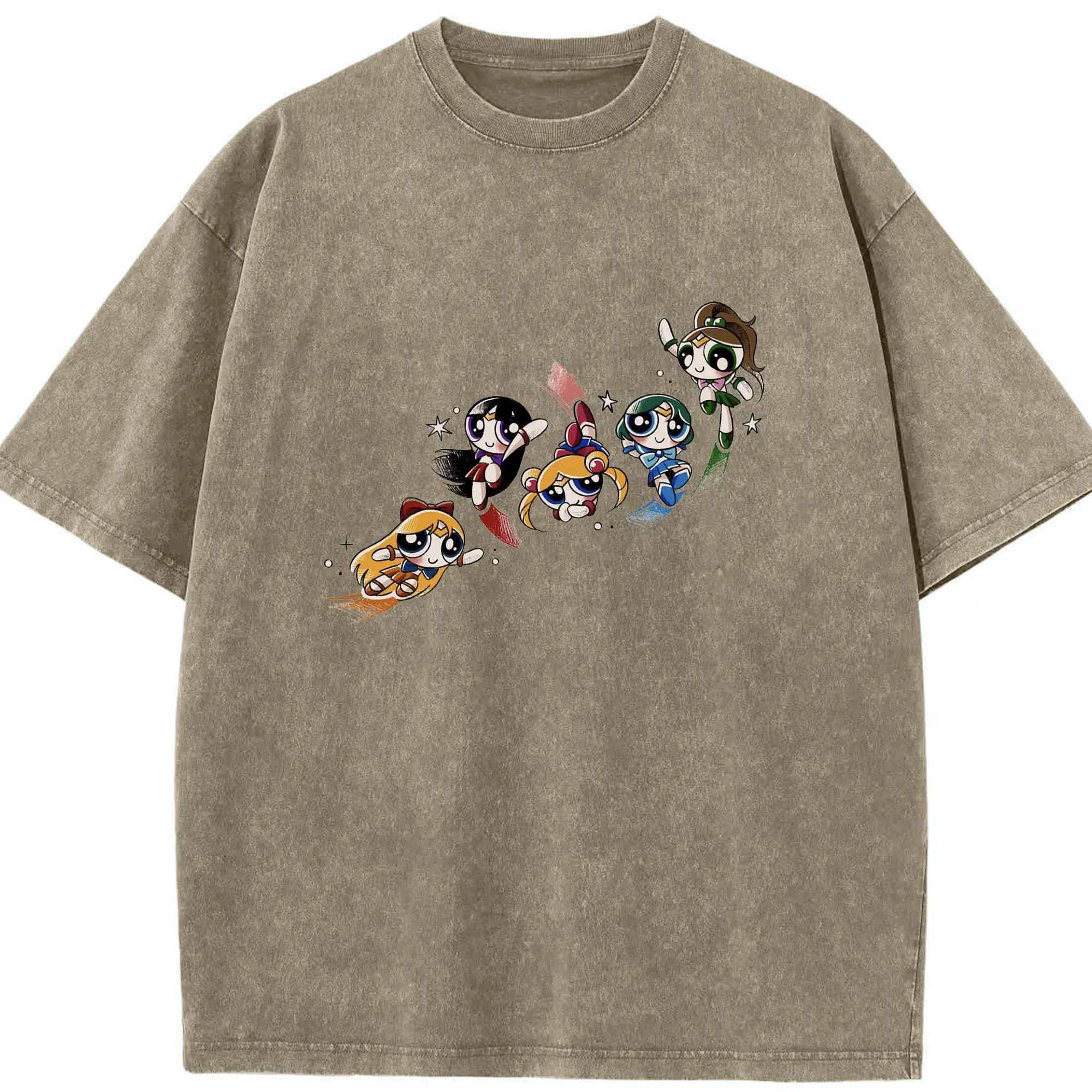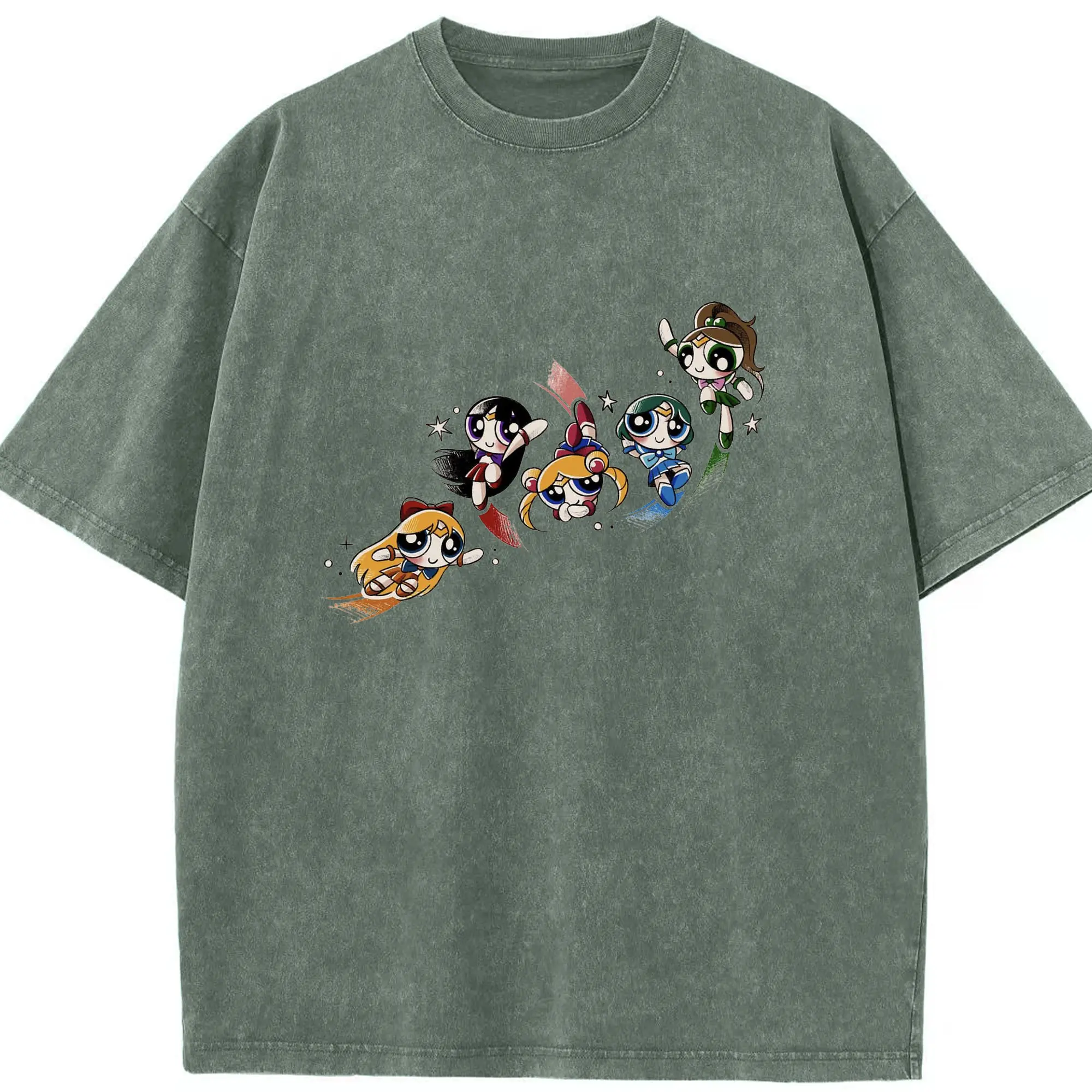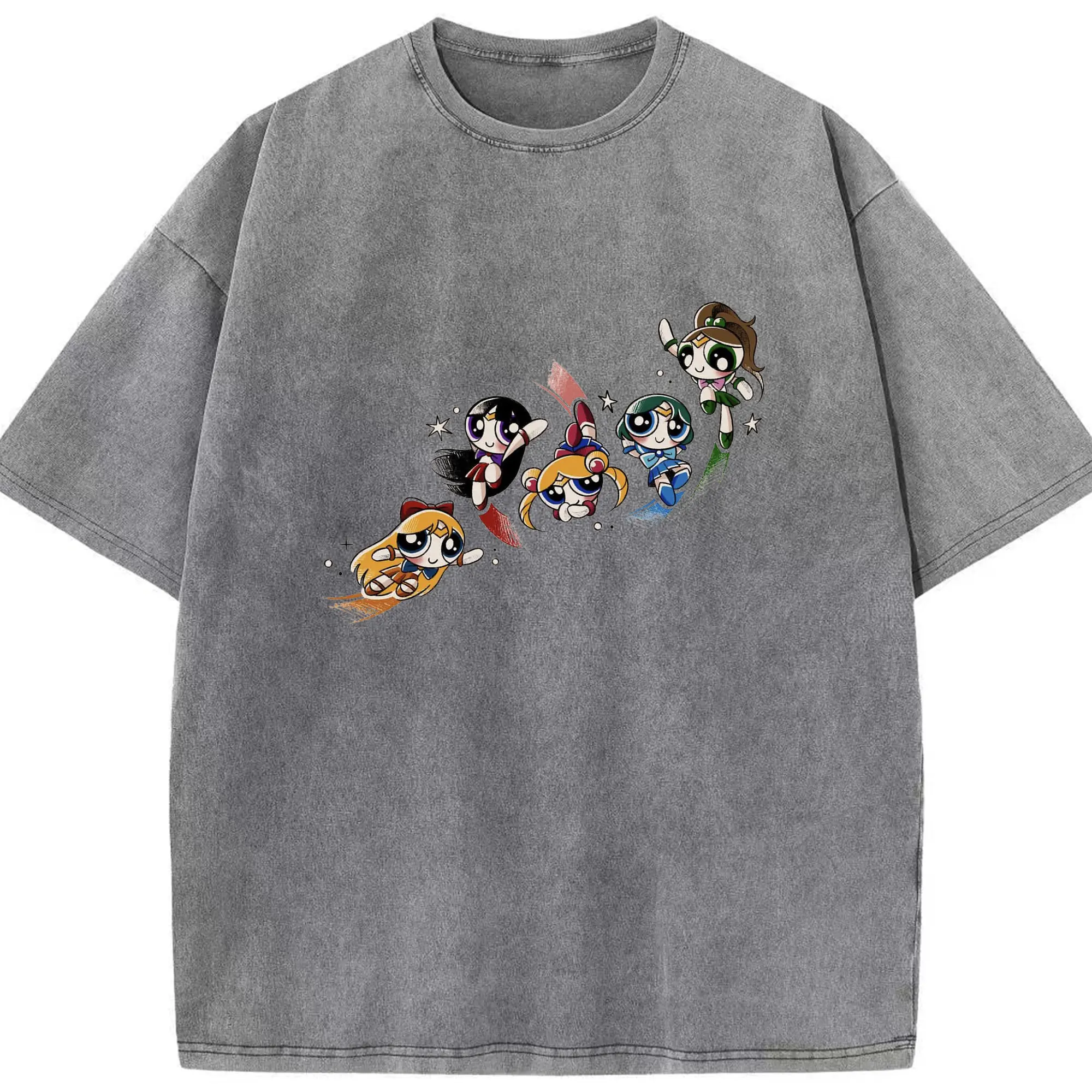 The Powerpuff Girls x Sailor Moon Crossover DIY Shirt - Washed Vintage Look 230g Cotton Oversized T-Shirt With Front Heat Transfer Print – Soft, Lightweight, Stylish Fit – Comfortable Casual Wear For Sports & Everyday Use