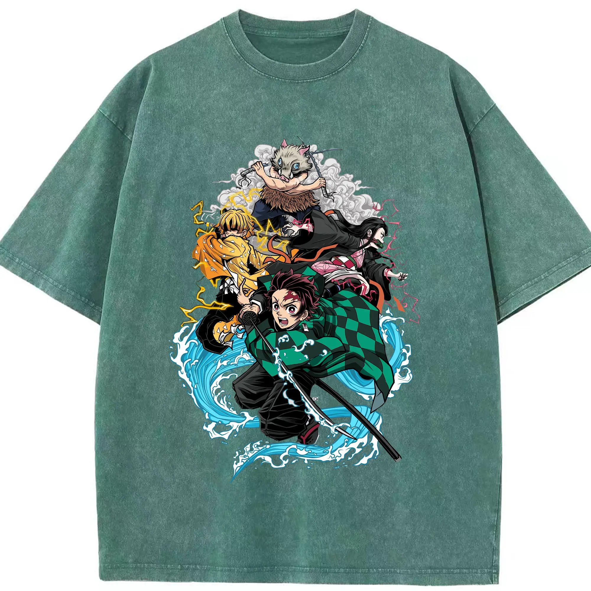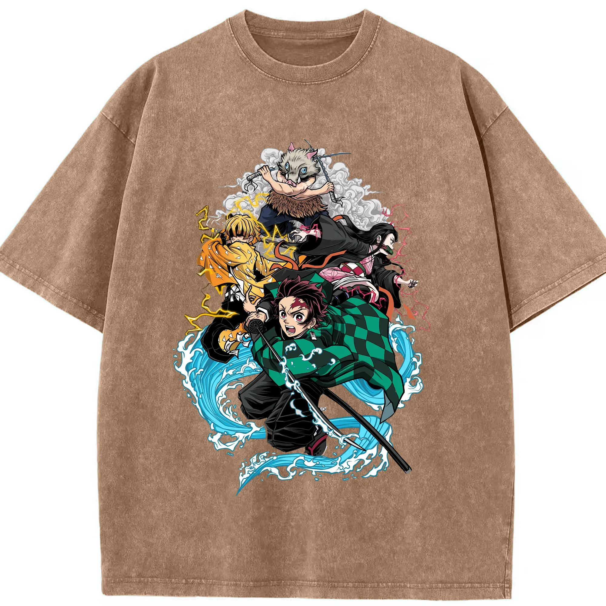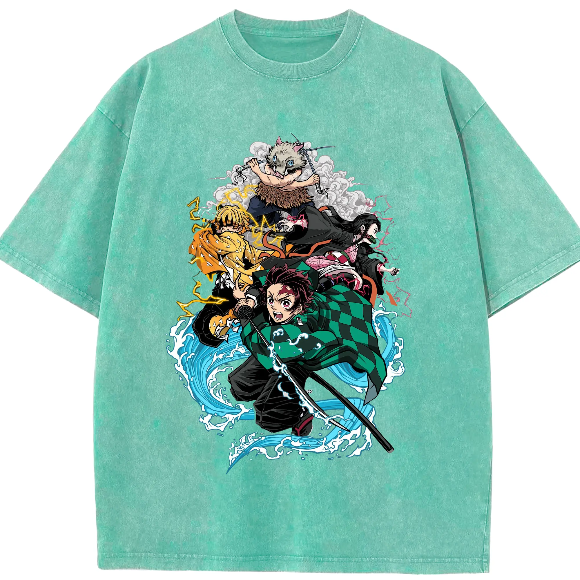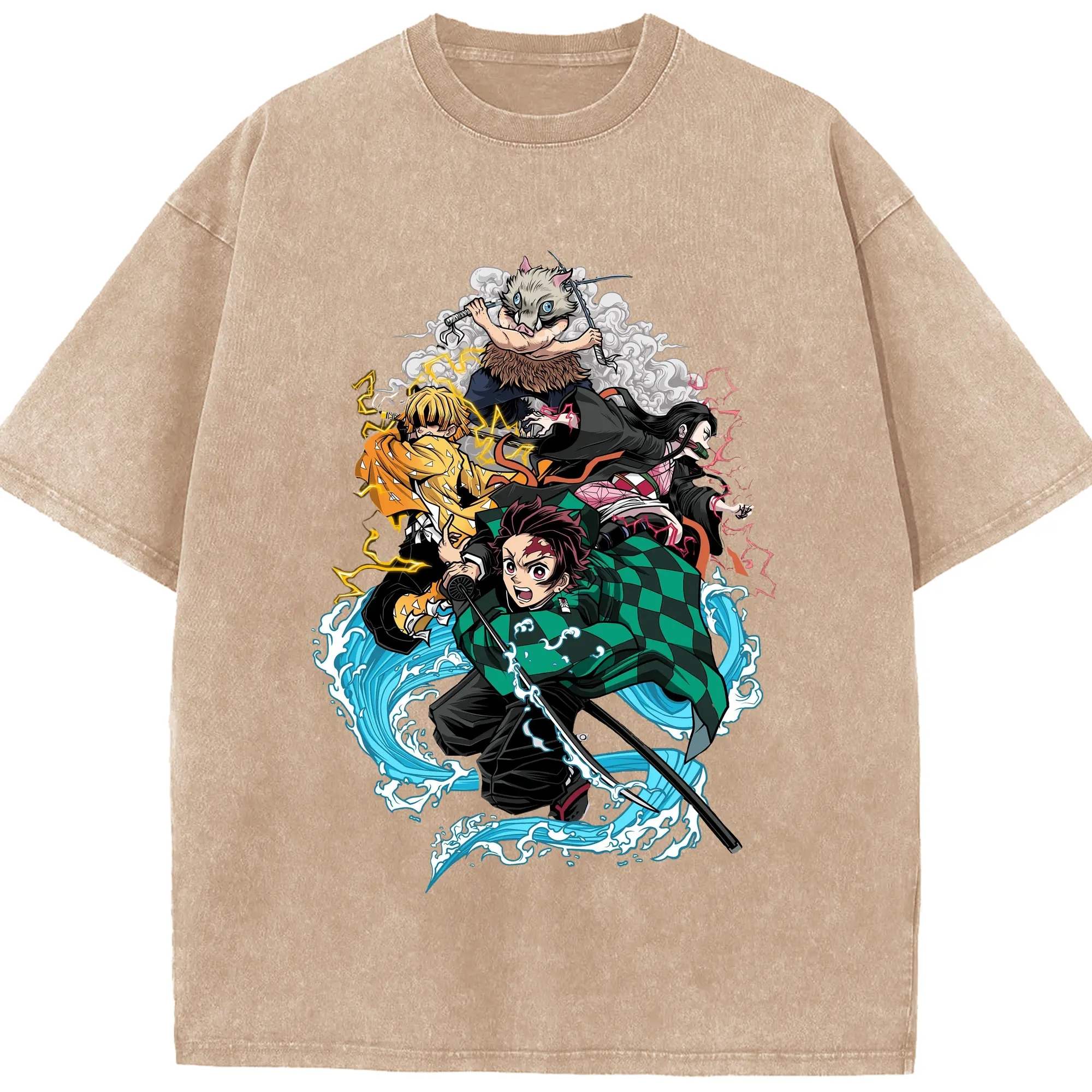 Trendy “Kimetsu no Yaiba Group Battle” DIY Shirt - Washed Vintage Look 230g Cotton Oversized T-Shirt With Front Heat Transfer Print – Soft, Lightweight, Stylish Fit – Comfortable Casual Wear For Sports & Everyday Use